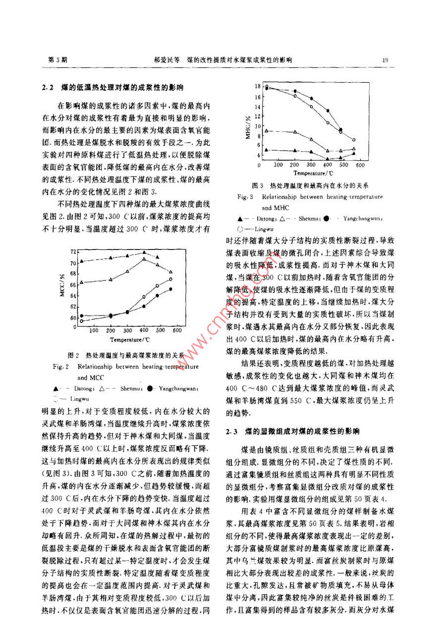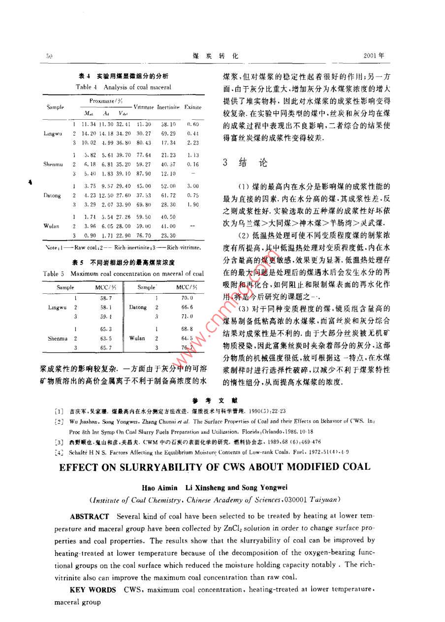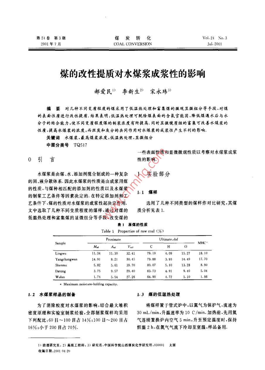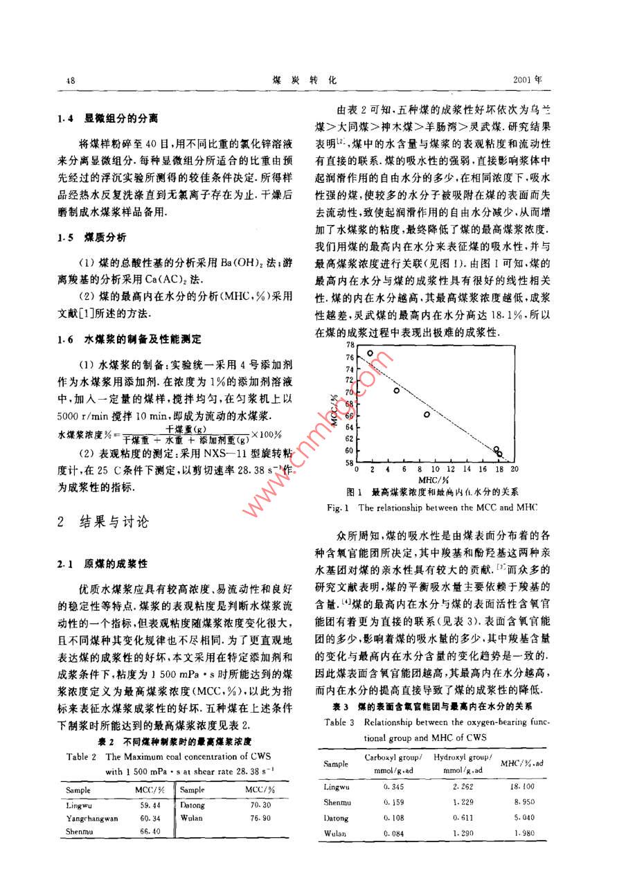 第24卷第3期煤炭轉(zhuǎn)化Vol 24 No. 32001年7月COAL CONVERSIONJul.2001煤的改性提質(zhì)對(duì)水煤漿成漿性的影響郝愛民1)李新生?)宋永瑋3摘要對(duì)幾種不同變質(zhì)程度的煤采用了低溫?zé)崽幚砗透患旱奈⒂^顯微組分等手段,對(duì)煤的表面性質(zhì)進(jìn)行改性提質(zhì).結(jié)果明:低溫?zé)崽幚砜擅摮罕砻娴暮豕倌軋F(tuán),降低煤遘水后與水分子的結(jié)合能力,使不同變質(zhì)程度煤的制漿濃度有所提高.同時(shí)顯微鏡質(zhì)組的富集可改善水煤漿的性質(zhì),提高水煤漿的濃度,而絲炭和灰分的共同作用對(duì)水煤漿的成漿性產(chǎn)生不利的影響關(guān)鍵詞水煤漿,最高煤漿濃度,低溫?zé)崽幚?顯微組分中圖分類號(hào)TQ517一些表面性質(zhì)和顯微微觀性質(zhì)以考察對(duì)水煤漿成漿0引言性的影響水煤漿是由煤、水、添加劑混合制成的一種復(fù)雜1實(shí)驗(yàn)部分的固液分散體系.因此水煤漿的性質(zhì)是由成漿用煤的性質(zhì),與煤種相匹配的添加劑的性質(zhì)以及水煤漿的制漿工藝條件等因素決定的在特定添加劑和工1媒樣藝條件下,煤的性質(zhì)對(duì)水煤漿的成漿性起決定作用選用了幾種不同類型的煤樣作對(duì)比研究,其煤文中選取了幾種不同變質(zhì)程度的煤樣,通過(guò)對(duì)煤的質(zhì)分析見表1低溫?zé)崽幚砗透患旱娘@微組分等手段,改變煤的表1原煤的性質(zhì)Table 1 Properties of raw coal (%ProximateIntimate, daSampleMHCLigw11341.303417.194.0915271.1079.883.9314.4917705.6139.7080.3.288.9083.73Wulan5.5427.26Maximum moisture-holding capacity.1.2水煤漿樣品的制備1.3煤的低溫?zé)崽幚頌榱讼6葘?duì)水煤漿的影響,結(jié)合最大堆積將煤樣置于管式爐中以氮?dú)鉃楸Wo(hù)氣,流速為密度原理和實(shí)驗(yàn)室制漿經(jīng)驗(yàn),全部制漿煤樣均采用30ml/min,升溫速率為10C/min,加熱前,先用氮下列配比:60目~100目占14%;100目~200目占?xì)膺B續(xù)置換爐內(nèi)空氣5min,升至預(yù)定溫度時(shí),保持16%;小于200目占70%恒溫2h,在氮?dú)鈿饬飨吕鋮s至室溫,樣品備用1)助理研究員;2)高級(jí)工程師;3)研究員,中國(guó)科學(xué)院山西煤炭化學(xué)研究所030001太原收稿日期:200104201.4顯微組分的分離由表2可知,五種煤的成漿性好壞依次為鳥蘭煤>大同煤>神木煤>羊腸灣>靈武煤.研究結(jié)果將煤樣粉碎至40目,用不同比重的氯化鋅溶液表明2…,煤中的水含量與煤漿的表觀粘度和流動(dòng)性來(lái)分離顯微組分每種顯微組分所適合的比重由預(yù)有直接的聯(lián)系.煤的吸水性的強(qiáng)弱,直接影響漿體中先經(jīng)過(guò)的浮沉實(shí)驗(yàn)所測(cè)得的較佳條件決定,所得樣起潤(rùn)滑作用的自由水分的多少,在相同濃度下,吸水品經(jīng)熱水反復(fù)洗滌直到無(wú)氯離子存在為止干燥后性強(qiáng)的煤,使較多的水分子被吸附在煤的表面而失磨制成水煤漿樣品備用去流動(dòng)性,致使起潤(rùn)滑作用的自由水分減少,從而增1.5煤質(zhì)分析加了水煤漿的粘度,最終降低了煤的最高煤漿濃度我們用煤的最高內(nèi)在水分來(lái)表征煤的吸水性,并與(1)煤的總酸性基的分析采用Ba(OH)2法;游最高煤漿濃度進(jìn)行關(guān)聯(lián)(見圖1).由圖1可知煤的離羧基的分析采用Ca(AC)2法最高內(nèi)在水分與煤的成漿性具有很好的線性相關(guān)(2)煤的最高內(nèi)在水分的分析(MHC,%)采用性煤的內(nèi)在水分越高其最高煤漿濃度越低,成漿文獻(xiàn)[所述的方法性越差,靈武煤的最高內(nèi)在水分高達(dá)18.1%,所以1.6水煤漿的制備及性能測(cè)定在煤的成漿過(guò)程中表現(xiàn)出極難的成漿性(1)水煤漿的制備:實(shí)驗(yàn)統(tǒng)一采用4號(hào)添加劑作為水煤漿用添加劑.在濃度為1%的添加劑溶液72中,加入一定量的煤樣,攪拌均勻,在勻漿機(jī)上以5000r/min攪拌10min,即成為流動(dòng)的水煤漿水煤漿濃度%干煤重(g)干煤重+添加劑重(g)×100%(2)表觀粘度的測(cè)定:采用NXS-11型旋轉(zhuǎn)粘度計(jì),在25C條件下測(cè)定,以剪切速率28.38s-作s24。121163為成漿性的指標(biāo)MHC/M圖1最高煤漿濃度和最嗎內(nèi)在水分的關(guān)系ig. 1 The relationship bet ween the mcC and MHC2結(jié)果與討論眾所周知,煤的吸水性是由煤表面分布著的各種含氧官能團(tuán)所決定,其中羧基和酚羥基這兩種親2.1原煤的成漿性水基團(tuán)對(duì)煤的親水性具有較大的貢獻(xiàn).而眾多的優(yōu)質(zhì)水煤漿應(yīng)具有較高濃度、易流動(dòng)性和良好研究文獻(xiàn)表明煤的平衡吸水量主要依賴于羧基的的穩(wěn)定性等特點(diǎn)煤漿的表觀粘度是判斷水煤漿流含量.“煤的最高內(nèi)在水分與煤的表面活性含氧官動(dòng)性的一個(gè)指標(biāo),但表觀粘度隨煤漿濃度變化很大,能團(tuán)有著更為直接的聯(lián)系(見表3).表面含氧官能且不同煤種其變化規(guī)律也不盡相同.為了更直觀地團(tuán)的多少影響著煤的吸水量的多少,其中羧基含量表達(dá)煤的成漿性的好壞,本文采用在特定添加劑和的變化與最高內(nèi)在水分含量的變化趨勢(shì)是一致的成漿條件下,粘度為1500mPa·s時(shí)所能達(dá)到的煤因此煤表面含氧官能團(tuán)越高其最高內(nèi)在水分越高,漿濃度定義為最高煤漿濃度(MCC,%),以此為指而內(nèi)在水分的提高直接導(dǎo)致了煤的成漿性的降低標(biāo)來(lái)表征水煤漿成漿性的好壞.五種煤在上述條件裹3煤的表面含氧官能團(tu