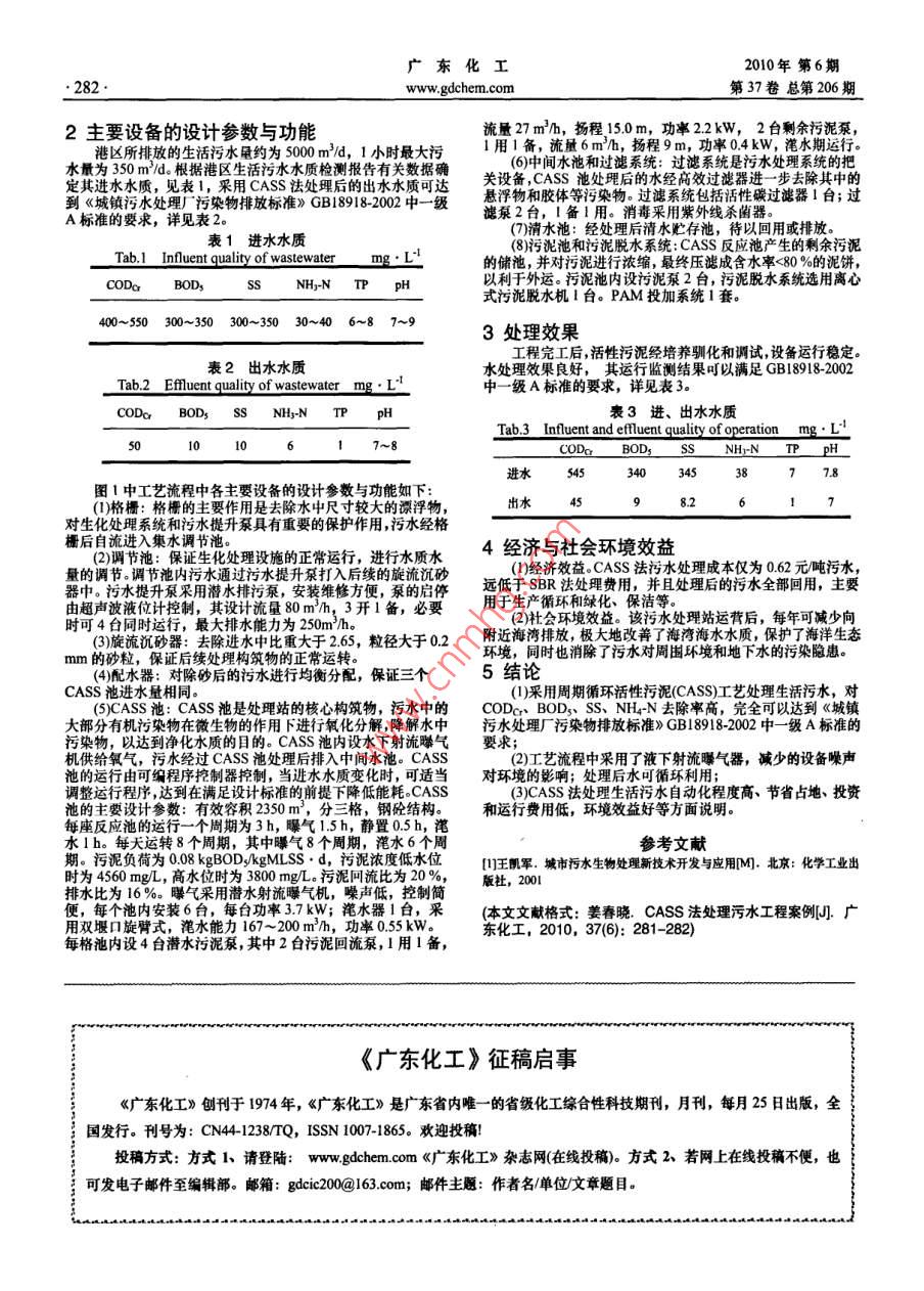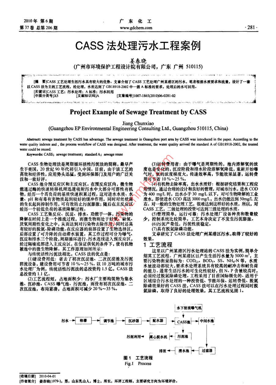 2010年第6期東化工第37卷總第206期www.gdchem.com81CASs法處理污水工程案例姜春曉(廣州市環(huán)境保護工程設(shè)計院有限公司,廣東廣州510115)摘要]CASS工藝處理生活污水具有較大的優(yōu)勢。文章介紹了CASS工藝處理廣州某港區(qū)的污水,筆者根據(jù)水質(zhì)要求和流量,設(shè)計了一套以CASS法為主的工藝流程,經(jīng)處理,水質(zhì)達到了GB189182002中一級A標準的要求,處理后的水可回用[關(guān)鍵詞」CASS工藝;污水處理;A標準;污水回用中圖分類號]X5文章編號]1007-1865(2010)060此心中A(2噸出,如…“出一灬E:,小,和,,1Project Example of Sewage Treatment by CASSChunxiao( Guangzhou EP Environmental Engineering Consulting Ltd, Guangzhou 510115, China)Abstract: sewage treatment by CASS has advantage. The sewage treatmeat in Guangzhou port area by CAsS was introduced in the paper. According to thewater quality indexes and, the process workflow of CASS was designed. After treatment, the water quality arrived the standard A of GB18918-2002, the treatedwater could be reused.Keywords: CASS; sewage treatment; standard A; sewage reusCASS生物處理法是周期循環(huán)活性污泥法的簡稱,最早產(chǎn)(3)運轉(zhuǎn)費用省:由于曝氣是周期性的,池內(nèi)溶解氧的濃生于美國,20世紀90年代初引入中國。目前,由于該工藝的度也是變化的,沉淀階段和排水階段溶解氧降低,重新開始曝高效和經(jīng)濟性,應(yīng)用勢頭迅猛,受到環(huán)保部門及用戶的廣泛關(guān)氣時,氧的濃度梯度大,傳遞效率高,節(jié)能效果顯著,運轉(zhuǎn)費注和一致好評用可節(jié)省10%~25CASS池分預(yù)反應(yīng)區(qū)和主反應(yīng)區(qū)。在預(yù)反應(yīng)區(qū)內(nèi),微生物(4)有機物去除率高,出水水質(zhì)好:根據(jù)研究結(jié)果和工程應(yīng)能通過酶的快速轉(zhuǎn)移機理迅速吸附污水中大部分可溶性有機用情況,通過合理的設(shè)計和良好的管理,對城市污水,進水COD物,經(jīng)歷一個高負荷的基質(zhì)快速積累過程,這對進水水質(zhì)、水為400mg時,出水小于30mgL以下,對可生物降解的工業(yè)量、pH和有毒有害物質(zhì)起到較好的緩沖作用,同時對絲狀菌廢水,即使進水COD高達3000mgL,出水仍能達到50mg左的生長起到抑制作用,可有效防止污泥膨脹;隨后在主反應(yīng)區(qū)右。對般的生物處理工藝,很難達到這樣好的水質(zhì),所以,對經(jīng)歷一個較低負荷的基質(zhì)降解過程CAsS工級處理的投資可達到三級處理的水質(zhì)。CASS工藝集反應(yīng)、沉淀、排水、功能于一體,污染物的(5)管理簡單,運行可靠:污水處理廠設(shè)備種類和數(shù)量較降解在時間上是一個推流過程,而微生物則處于好氧、觖氧少,控制系統(tǒng)比較簡單,工藝本身決定了不發(fā)生污泥膨脹厭氧周期性變化之中,從而達到對污染物去除作用,同時還具(6)污泥產(chǎn)量低,污泥性質(zhì)穩(wěn)定。有較好的脫氮、除磷功能。在反應(yīng)器的前部設(shè)置了生物選擇區(qū)(7)具有脫氮除磷功能后部設(shè)置了可升降的自動滯水裝置。其工作過程可分為曝氣文章研究了CASS法處理廣州某港區(qū)污水,取得了較好的沉淀和排水三個階段,周期循環(huán)進行污水連續(xù)進入預(yù)反應(yīng)區(qū)效果。經(jīng)過隔墻底部進入主反應(yīng)區(qū),在保證供氧的條件下,使有機物1工藝流程傳統(tǒng)活性污泥CASS法的優(yōu)點是:這里以廣州某港區(qū)污水處理站的CASS法為實例簡單介(建沒費用低:省去了初次沉淀池、二次沉淀池及污泥要污染物衡量指標為: CODC, bOd、sNH4N等,水質(zhì)回流設(shè)備,建設(shè)費用可節(jié)省10%~25%以10萬噸的城市污水量波動都較大,要求水處理系統(tǒng)具有較高的耐沖擊和耐負荷水處理廠為例,傳統(tǒng)活性污泥法的總投資約1.5億,CASS法總投資約1.1億的能力。通常生活污水的可生化性較好,但N、P含量較高時,(2)工藝流程短,占地面積少:污水廠主要構(gòu)筑物為集水必須經(jīng)過脫氮除磷處理。工程采用了目前國際領(lǐng)先的、適用于池、沉砂池CAS曝氣池、污泥池,而沒有初次沉淀池、二除磷效果好的CAs法,CAS法可以在污水處理過程同時脫氮除磷,取得了良好的處理效果,其工藝流程見圖1水下射流氣機水““W節(jié)}“這“、N,中水污泥利用離心脫水機污泥池「過濾器工藝流程收稿日期]2010040[作者簡介姜春曉(1979),男,山東乳山人,博士,所長,環(huán)評工程師,主要研究方向為環(huán)境評價。廣東化工2010年第6期282www.gdchem.com第37卷總第206期2主要設(shè)備的設(shè)計參數(shù)與功能流量27m3/h,揚程150m,功率22kW,2臺剩余污泥泵港區(qū)所排放的生活污水量約為5000m3/d,1小時最大污1用1備,流量6m}/h,揚程9m,功率04kW,潷水期運行水量為350m/d。根據(jù)港區(qū)生活污水水質(zhì)檢測報告有關(guān)數(shù)據(jù)確(6)中間水池和過濾系統(tǒng):過濾系統(tǒng)是污水處理系統(tǒng)的把定其進水水質(zhì),見表1,采用CASS法處理后的出水水質(zhì)可達關(guān)設(shè)備,CASS池處理后的水經(jīng)高效過濾器進一步去除其中的到《城鎮(zhèn)污水處理廠污染物排放標準》GB8918-20中一級懸浮物和膠體等污染物。過濾系統(tǒng)包括活性碳過濾器1臺;過表1進水水質(zhì)(7)清水池:經(jīng)處理后清水貯存池,待以回用或排放。(8污泥池和污泥脫水系統(tǒng):CASS反應(yīng)池產(chǎn)生的剩余污泥Tab.I Influent quality of wastewater的儲池,并對污泥進行濃縮,最終壓濾成含水