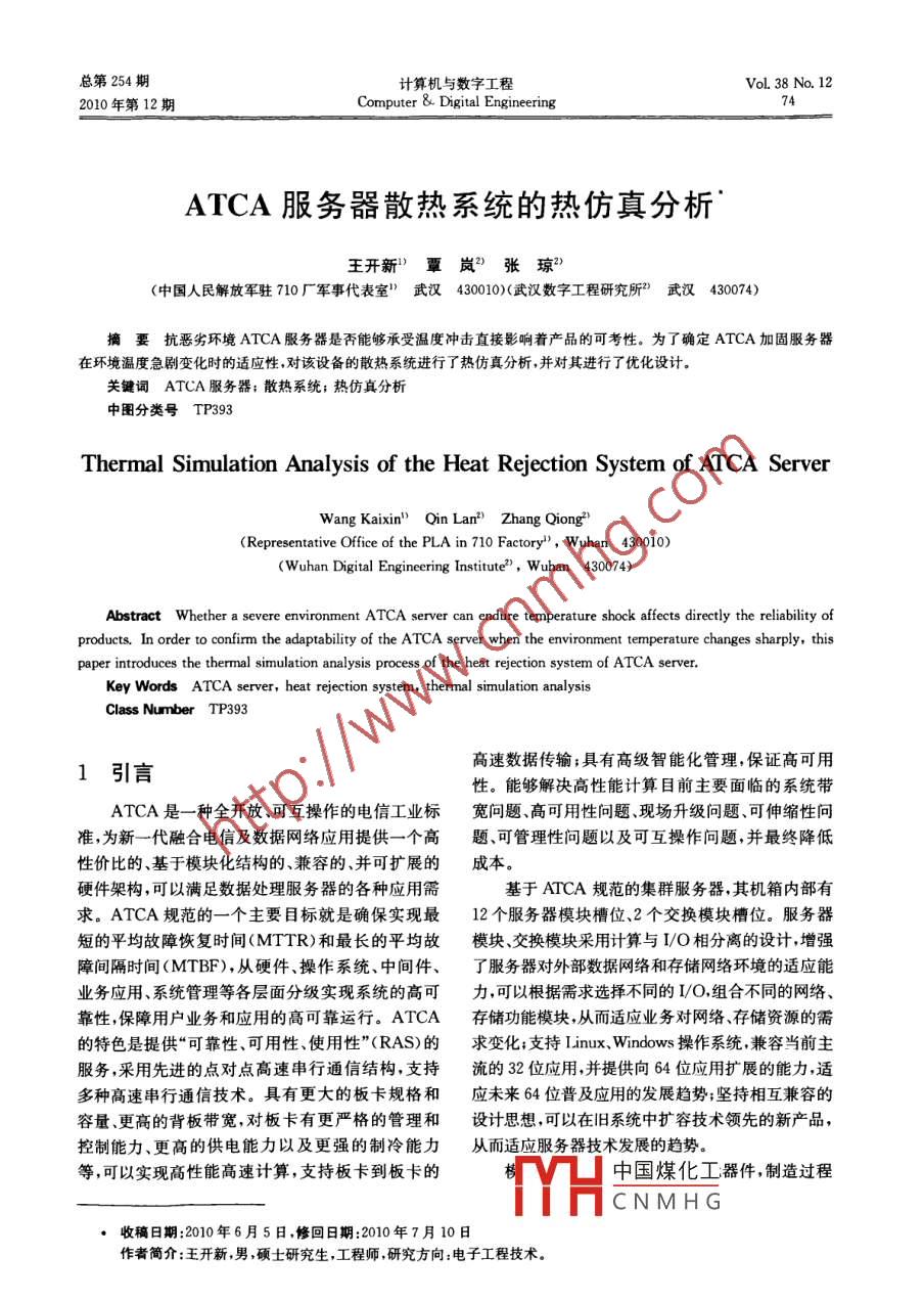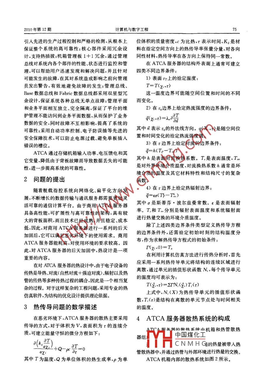 總第254期計(jì)算機(jī)與數(shù)字工程VoL 38 No. 122010年第12期Computer& Digital EngineeringATCA服務(wù)器散熱系統(tǒng)的熱仿真分析王開(kāi)新嵐?)張瓊2(中國(guó)人民解放軍駐710廠軍事代表室)武漢430010)(武漢數(shù)字工程研究所武漢430074)摘要抗惡劣環(huán)境ATCA服務(wù)器是否能夠承受溫度沖擊直接影響著產(chǎn)品的可考性。為了確定ATCA加固服務(wù)器在環(huán)境溫度急劇變化時(shí)的適應(yīng)性,對(duì)該設(shè)備的散熱系統(tǒng)進(jìn)行了熱仿真分析,并對(duì)其進(jìn)行了優(yōu)化設(shè)計(jì)。關(guān)鍵詞ATCA服務(wù)器;散熱系統(tǒng);熱仿真分析中圖分類號(hào)TP39Thermal Simulation Analysis of the Heat Rejection System of ATCA ServerWang Kaixin" Qin Lan ZharRepresentative Office of the PLA in 710 Factory, Wuhan 430010)Wuhan Digital Engineering Institute, Wuhan 430074)bstract Whether a severe environment ATCa server can endure temperature shock affects directly the reliability ofproducts. In order to confirm the adaptability of the atCa server when the environment temperature changes sharply, thispaper introduces the thermal simulation analysis process of the heat rejection system of ATCA server.Key Words ATCA server, heat rejection system, thermal simulation analysisClass Number TP3931引言高速數(shù)據(jù)傳輸;具有高級(jí)智能化管理,保證高可用性。能夠解決高性能計(jì)算目前主要面臨的系統(tǒng)帶ATCA是一種全開(kāi)放、可互操作的電信工業(yè)標(biāo)寬問(wèn)題、高可用性問(wèn)題、現(xiàn)場(chǎng)升級(jí)問(wèn)題、可伸縮性問(wèn)準(zhǔn),為新一代融合電信及數(shù)據(jù)網(wǎng)絡(luò)應(yīng)用提供一個(gè)高題、可管理性問(wèn)題以及可互操作問(wèn)題,并最終降低性價(jià)比的、基于模塊化結(jié)構(gòu)的、兼容的、并可擴(kuò)展的成本硬件架構(gòu),可以滿足數(shù)據(jù)處理服務(wù)器的各種應(yīng)用需基于ATCA規(guī)范的集群服務(wù)器,其機(jī)箱內(nèi)部有求。ATCA規(guī)范的一個(gè)主要目標(biāo)就是確保實(shí)現(xiàn)最12個(gè)服務(wù)器模塊槽位、2個(gè)交換模塊槽位。服務(wù)器短的平均故障恢復(fù)時(shí)間(MTTR)和最長(zhǎng)的平均故模塊、交換模塊采用計(jì)算與I/O相分離的設(shè)計(jì),增強(qiáng)障間隔時(shí)間(MTBF),從硬件、操作系統(tǒng)、中間件、了服務(wù)器對(duì)外部數(shù)據(jù)網(wǎng)絡(luò)和存儲(chǔ)網(wǎng)絡(luò)環(huán)境的適應(yīng)能業(yè)務(wù)應(yīng)用、系統(tǒng)管理等各層面分級(jí)實(shí)現(xiàn)系統(tǒng)的高可力,可以根據(jù)需求選擇不同的IO,組合不同的網(wǎng)絡(luò)靠性,保障用戶業(yè)務(wù)和應(yīng)用的高可靠運(yùn)行。ATCA存儲(chǔ)功能模塊,從而適應(yīng)業(yè)務(wù)對(duì)網(wǎng)絡(luò)、存儲(chǔ)資源的需的特色是提供“可靠性、可用性、使用性”(RAS)的求變化;支持 Linux、 Windows操作系統(tǒng),兼容當(dāng)前主服務(wù),采用先進(jìn)的點(diǎn)對(duì)點(diǎn)高速串行通信結(jié)構(gòu),支持流的32位應(yīng)用并提供向64位應(yīng)用擴(kuò)展的能力適多種高速串行通信技術(shù)。具有更大的板卡規(guī)格和應(yīng)未來(lái)64位普及應(yīng)用的發(fā)展趨勢(shì);堅(jiān)持相互兼容的容量更高的背板帶寬對(duì)板卡有更嚴(yán)格的管理和設(shè)計(jì)思想可以在舊系統(tǒng)中擴(kuò)容技術(shù)領(lǐng)先的新產(chǎn)品,控制能力、更高的供電能力以及更強(qiáng)的制冷能力從而適應(yīng)服務(wù)器技術(shù)發(fā)展的趨勢(shì)等,可以實(shí)現(xiàn)高性能高速計(jì)算,支持板卡到板卡的中國(guó)煤化工器件制造過(guò)程CNMHG·收稿日期:2010年6月5日,修回日期:2010年7月10日作者簡(jiǎn)介:王開(kāi)新男,碩士研究生,工程師,研究方向:電子工程技術(shù)2010年第12期計(jì)算機(jī)與數(shù)字工程引入先進(jìn)的生產(chǎn)過(guò)程控制和嚴(yán)格的檢測(cè),從根本上位體積的質(zhì)量密度,c為比熱,表示時(shí)間,K是材保證整個(gè)系統(tǒng)的高可靠性;核心部件采用冗余設(shè)料在指定空間方向上的熱傳導(dǎo)率張量分量,對(duì)各向計(jì),支持熱插拔;機(jī)箱管理板1+1冗余,通過(guò)管理同性材料熱傳導(dǎo)率在各方向上保持同一常數(shù)??偩€對(duì)系統(tǒng)內(nèi)各個(gè)部件的性能、狀態(tài)進(jìn)行監(jiān)控和管在ATCA服務(wù)器的結(jié)構(gòu)外表面上通??山⒗?可以幫助用戶迅速發(fā)現(xiàn)和解決問(wèn)題,并且針對(duì)四類不同邊界條件:可能發(fā)生的故障在其對(duì)系統(tǒng)造成影響之前向管理1)表面rr上的給定溫度:員發(fā)出警告,有效地避免故障的發(fā)生;管理總線、T=T(i,t)Base數(shù)據(jù)總線和 Fabric數(shù)據(jù)總線都采用雙星型冗這一溫度邊界可能隨空間位置和時(shí)間的不同余設(shè)計(jì)保證系統(tǒng)各種總線無(wú)單點(diǎn)故障;管理平面而變化。和業(yè)務(wù)平面相互獨(dú)立、完全隔離,保證了平臺(tái)的維2)在r邊界上給定熱流強(qiáng)度的邊界條件:護(hù)管理不能訪問(wèn)到業(yè)務(wù)平面數(shù)據(jù),從而保護(hù)了業(yè)務(wù)數(shù)據(jù)的安全,同時(shí)故障不互相影響提高了系統(tǒng)的可靠性;采用自動(dòng)功率控制電子防誤插等先進(jìn)的其中示表示r的外法線方向。q(x,x)是隨空間位安全保障技術(shù),可以防止電源過(guò)載、避