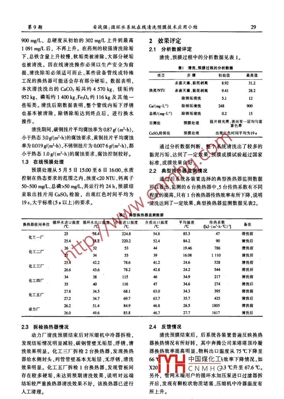 第9期中國氯堿No.9282010年9月China Chlor- AlkaliSep,2010循環(huán)水系統(tǒng)在線清洗預(yù)膜技術(shù)應(yīng)用小結(jié)安戰(zhàn)強(qiáng)(中平能化集團(tuán)尼龍化工公司,河南平頂山467013)摘要:總結(jié)了循環(huán)水系統(tǒng)在線清洗預(yù)膜的控制過程技術(shù)要點和效果,對存在的問題提出了處理建議。關(guān)鍵詞:循環(huán)水;換熱器;在線清洗預(yù)膜;效果中圖分類號:TQ022.12文獻(xiàn)標(biāo)識碼:B文章編號:1009- 1785(2010)09 -0028- -02Summary of on-line cleaning pre -film process of circulating watersystemAN Zhan-qiang(Nelon Chemical Co, Ltd, Zhongping Energy and Chemical Group, Pingdingshan 467013, China)Abstract: The control process, main points of technology and effects of the circulating water system onlinecleaning pre- flm were summarized. The treatment suggestions of existing problems were put forward.Key words: circulating water; heat exchanger; online cleaning pre-film; effect為提高換熱設(shè)施的換熱效率、延長設(shè)備使用壽清洗出約286 kg沉積的有機(jī)物,殺菌滅藻、剝離處命,中平能化集團(tuán)尼龍化工公司在2010年5月對循理效果較明顯。環(huán)水系統(tǒng)進(jìn)行在線化學(xué)清洗和預(yù)膜處理。本次清洗強(qiáng)力殺菌剝離濁度趨勢見圖1。預(yù)膜委托專業(yè)水處理公司總承包,負(fù)責(zé)技術(shù)方案的設(shè)計、實施并保證清洗預(yù)膜效果。0一:第一次1過程控制325第二次201.1 殺菌剝離三15由于循環(huán)水系統(tǒng)自2007年大修以來,運行時國10間較長且曾發(fā)生物料泄漏,存留在管線、換熱器內(nèi)0:00 04:48 09:36 14:24 19:12 00:00 04:48的黏泥量、菌群種類、結(jié)垢物較多,決定投加較大圈1強(qiáng)力殺菌剝離濁度數(shù)據(jù)趨勢圉劑量固體殺菌劑、黏泥剝離劑交替殺菌剝離2次。從殺菌剝離的水質(zhì)分析數(shù)據(jù)及現(xiàn)場水體表面觀察,1.2 |中國煤化工系統(tǒng)存在較多污垢沉積。第1次殺菌剝離濁度由HCNMHG二6:45至4日10:008.92 mg/L上升至最高31.2 mg/L,帶出約155 kg菌結(jié)束,整個有優(yōu)過程約21 n。其間,pH值控制為藻、黏泥。第2次殺菌剝離,濁度由9.41 mg/L上升至3.7左右,水中總鐵含量從初始的0.2 mg/L上升到最高28.2 mg/L,洗出約131 kg菌藻、黏泥,2次共最高15 m/L,Ca2+從初始的248 mg/L上升到最高.第9期安戰(zhàn)強(qiáng):循環(huán)水系統(tǒng)在線清洗預(yù)膜技術(shù)應(yīng)用小結(jié)29900 mg/L、總硬度從初始的302 mg/L上升到最高.2效果評定.1091mg/L后,不再上升。在藥劑的較強(qiáng)清洗除垢2.1 分析數(shù)據(jù)評定下,總鐵含量上升較慢,軟垢類被清除,大部分硬垢清洗預(yù)膜過程中的分析數(shù)據(jù)見表1。也被清洗。因在線清洗操作必須以生產(chǎn)安全為前表1清洗、預(yù)膜過程 的分析數(shù)據(jù)提,清洗除垢必須適可而止,某些設(shè)備管線或特殊項日步驟初始值最高值工況的換熱器可能還會存有部分硬垢。數(shù)據(jù)表明,殺菌滅藁、黏泥剝離8.9231.2本次清洗洗出的CaCO3垢共約4570 kg、鎂垢約濁度/NTU殺菌滅藻、黏泥剝離9.4128.2952kg、磷垢約1 400kg、Fe;04約116kg及其他一除銹垢清冼5.12些垢類。清洗后期數(shù)據(jù)表明,整個管線內(nèi)垢下浮銹Ca/(mg:-L")除銹垢清洗)0也基本被清除,除銹除垢達(dá)到終點后,進(jìn)行換水總鐵/(mgL")).215操作。目測法頇膜處理掛片較光滑,表面有一層均勻藍(lán)紫色暈清洗期間,碳鋼掛片平均腐蝕率為0.87 g/ (m2:h),CuSO,檢驗法預(yù)膜處理出現(xiàn)紅色時間平均為198小于熱態(tài)3.0 g(m2.h)的腐蝕要求,黃銅掛片平均腐蝕率為0.019 g(m2.h)、不銹鋼掛片為0.007 6g(m'.h),都通過分析數(shù)據(jù)判斷,整個系統(tǒng)清洗出了較多的小于熱態(tài)1.0g(m2.h)的腐蝕要求,腐蝕控制較好。黏泥污垢,達(dá)到了一定效果,預(yù)膜成膜試驗超過國家1.3 在線預(yù)膜處理標(biāo)準(zhǔn),成膜效果良好。預(yù)膜處理從5月5日15:00至6日16:00,水質(zhì)2.2典型換熱器 監(jiān)測情況控制在熱態(tài)要求的范圍之內(nèi),濁度<20 NTU、鈣離子通過后系統(tǒng)各裝置選擇的典型換熱器監(jiān)測數(shù)據(jù)50~500 mg/L、總磷>50 mg/L,共運行約24 h,預(yù)膜結(jié)可以看出,監(jiān)測的6臺換熱器中,5臺傳熱系數(shù)有不同束取出掛片用CuSO4檢驗,出現(xiàn)紅色時間平均為程度的提高,只有1臺換熱器傳熱效率有所下降,說明19s,大于標(biāo)準(zhǔn)(5s以上)的要求。清洗達(dá)到了一定效果,典型換熱器監(jiān)測數(shù)據(jù)見表2。表2典型換熱器監(jiān)測數(shù)據(jù)換熱器使用單位循環(huán)水進(jìn)口溫度循環(huán)水出口溫度介質(zhì)進(jìn)口溫度 介 質(zhì)出口溫度平均溫差傳熱系數(shù)備注_心小(m'.hC門38.4224.87清洗前化工一廠25.420.2S2.484.290清洗后4419.46化工二廠2:3453916.081 11042.278.641.224.652化工三廠6.643.678.224.2544381151634.9217化工四廠35401734.627427.834.568.163.034.3395清洗前.化工五廠7.234.769.763.75.7清洗后.26.251.484.946.826.51805動力廠26.049.685.846.727.716172.3拆檢換熱器情況2.4 反饋情況動力廠清洗預(yù)膜結(jié)束后對樂縮機(jī)中冷器拆檢,清洗預(yù)膜結(jié)束后,后系統(tǒng)各裝置普遍反映換熱發(fā)現(xiàn)結(jié)垢情況明顯減輕,碳鋼管壁無垢層、浮銹,清器換熱情況有所好轉(zhuǎn),其中奔騰公司苯塔塔頂冷凝洗效果明顯。化工三廠拆檢2臺換熱器,發(fā)現(xiàn)換熱.器換熱效率提高明顯,物料出口溫度從75 C下降至器給水側(cè)