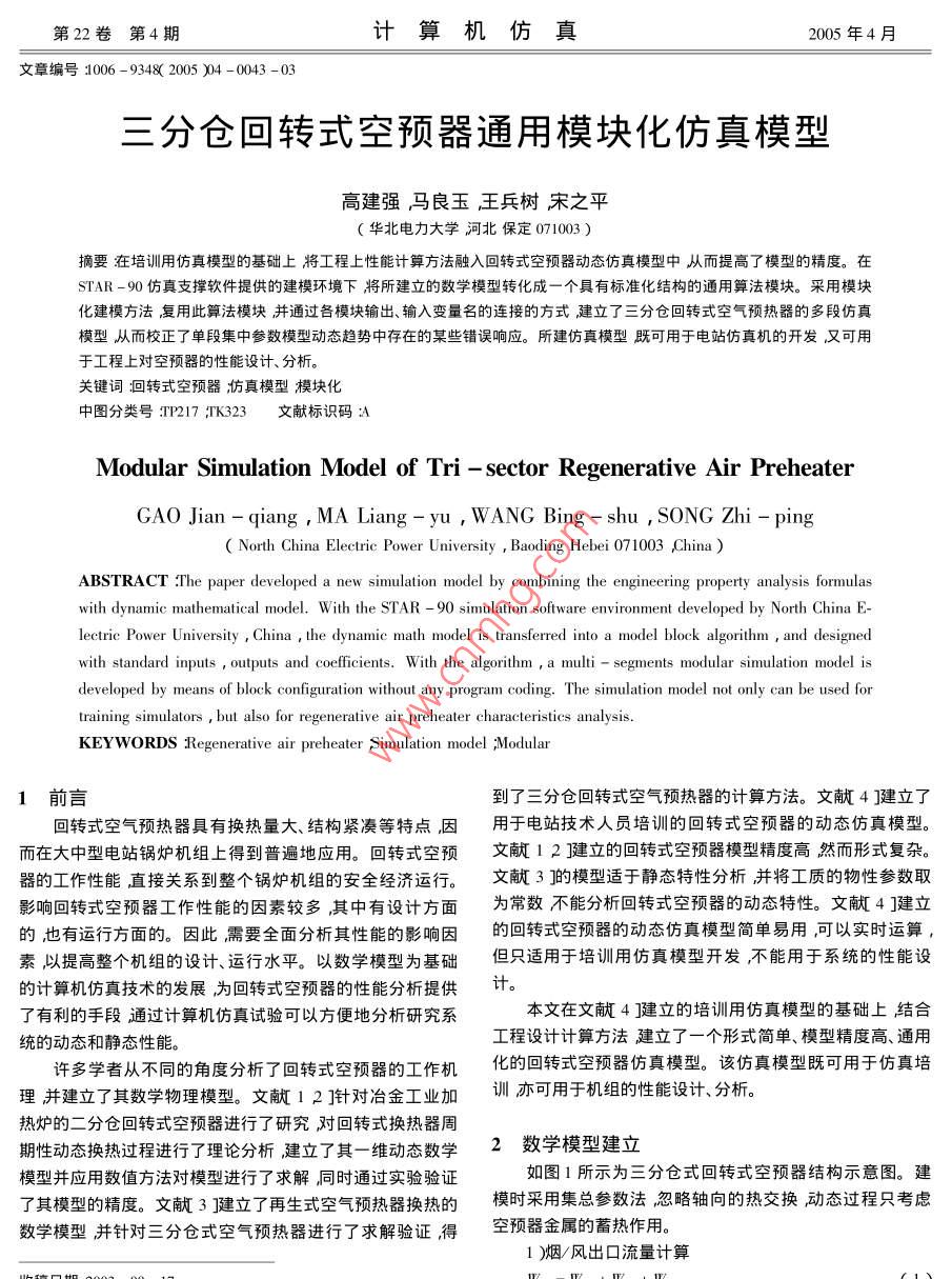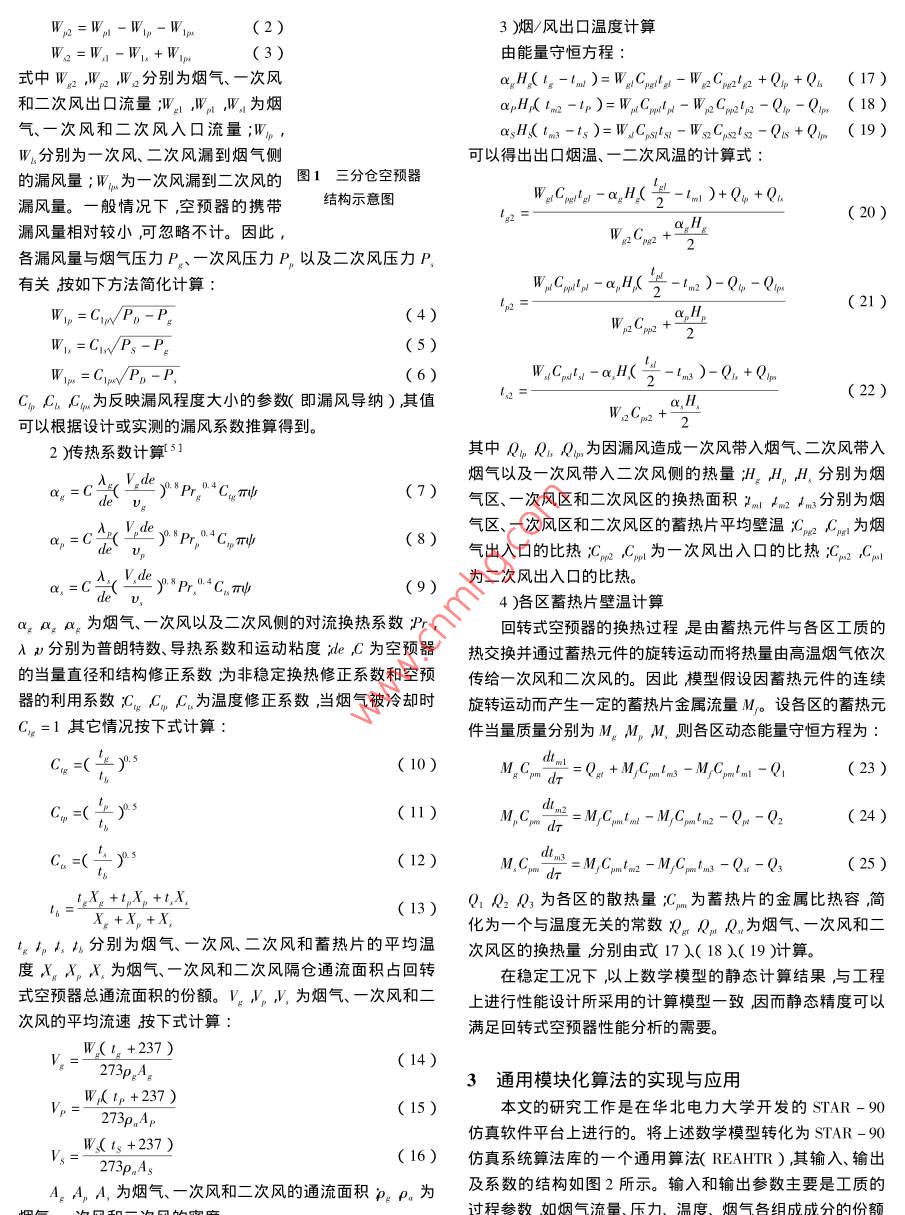 第22卷第4期計(jì)算機(jī)仿真2005年4月文章編號:006-934X2005)4-0043-03三分倉回轉(zhuǎn)式空預(yù)器通用模塊化仿真模型高建強(qiáng)馮良玉王兵樹宋之平(華北電力大學(xué)河北保定071003)擿要狂培訓(xùn)用仿真模型的基礎(chǔ)上將工程上性能計(jì)算方法融λ回轉(zhuǎn)式空預(yù)器動態(tài)仿真模型中從而提髙了模型的精度。在STAR-90仿真支撐軟件提供的建模環(huán)境下將將所建立的數(shù)學(xué)模型轉(zhuǎn)化成一個(gè)具有標(biāo)準(zhǔn)化結(jié)構(gòu)旳通用算法模塊。采用模塊化建模方法復(fù)用此算法模塊并通過眢模塊輸岀、輸入變量名的連接的方式建立了三分倉回轉(zhuǎn)式空氣預(yù)熱器的多段仿真模型從而校正了單段集中參數(shù)模型動態(tài)趨勢中存在的某些錯(cuò)誤響應(yīng)。所建仿真模型既可用于電站仿真機(jī)的開發(fā)又可用于工程上對空預(yù)器的性能設(shè)計(jì)、分析。關(guān)鍵詞洄轉(zhuǎn)式空預(yù)器癘真模型糢塊化中圖分類號:P2l7TK323文獻(xiàn)標(biāo)識碼Modular Simulation Model of Tri-sector Regenerative Air preheaterGAO Jian-qiang MA Liang-yu, WANG Bing-shu, SONG Zhi-pingNorth China Electric Power University Baoding Hebei 071003 ChinaABSTRACT The paper developed a new simulation model by combining the engineering property analysis formulaswith dynamic mathematical model. With the STAR-90 simulation software environment developed by North China E-lectric Power University China the dynamic math model is transferred into a model block algorithm and designwith standard inputs, outputs and coefficients. With the algorithm a multi-segments modular simulation model isdeveloped by means of block configuration without any program coding. The simulation model not only can be used fortraining simulators but also for regenerative air preheater characteristics analyKEYWORDS Regenerative air preheater Simulation model Modular1前言到了三分倉回轉(zhuǎn)式空氣預(yù)熱器的計(jì)算方法。文獻(xiàn)4建立了回轉(zhuǎn)式空氣預(yù)熱器具有換熱量大、結(jié)構(gòu)緊湊等特點(diǎn)因用于電站技術(shù)人員培訓(xùn)的回轉(zhuǎn)式空預(yù)器的動態(tài)仿真模型。而在大中型電站鍋爐機(jī)組上得到普遍地應(yīng)用?;剞D(zhuǎn)式空預(yù)文獻(xiàn)12逮建立的回轉(zhuǎn)式空預(yù)器模型精度高然而形式復(fù)雜。器的工作性能直接關(guān)系到整個(gè)鍋爐機(jī)組的安全經(jīng)濟(jì)運(yùn)行。文獻(xiàn)3的模型適于靜態(tài)特性分析并將工質(zhì)的物性參數(shù)取影響回轉(zhuǎn)式空預(yù)器工作性能的因素較多其中有設(shè)計(jì)方面為常數(shù)不能分析回轉(zhuǎn)式空預(yù)器的動態(tài)特性。文獻(xiàn)4建立的也有運(yùn)行方面的。因此需要全面分析其性能的影響因的回轉(zhuǎn)式空預(yù)器的動態(tài)仿真模型簡單易用可以實(shí)時(shí)運(yùn)算素以提高整個(gè)機(jī)組的設(shè)計(jì)、運(yùn)行水平。以數(shù)學(xué)模型為基礎(chǔ)但只適用于培訓(xùn)用仿真模型開發(fā)不能用于系統(tǒng)的性能設(shè)的計(jì)算機(jī)仿真技術(shù)的發(fā)展為回轉(zhuǎn)式空預(yù)器的性能分析提供計(jì)。了有利的手段通過計(jì)算機(jī)仿真試驗(yàn)可以方便地分析研究系本文在文獻(xiàn)4J建立的培訓(xùn)用仿真模型的基礎(chǔ)上鮚合統(tǒng)的動態(tài)和靜態(tài)性能工程設(shè)計(jì)計(jì)算方法建立了一個(gè)形式簡單、模型精度高、通用許多學(xué)者從不同的角度分析了回轉(zhuǎn)式空預(yù)器的工作機(jī)化的回轉(zhuǎn)式空預(yù)器仿真模型。該仿真模型既可用于仿真培理并建立了其數(shù)學(xué)物理模型。文獻(xiàn)12]針對冶金工業(yè)加訓(xùn)亦可用于機(jī)組的性能設(shè)計(jì)、分析。熱爐的二分倉回轉(zhuǎn)式空預(yù)器進(jìn)行了研究對回轉(zhuǎn)式換熱器周期性動態(tài)換熱過程進(jìn)行了理論分析建立了其一維動態(tài)數(shù)學(xué)2數(shù)學(xué)模型建立模型并應(yīng)用數(shù)值方法對模型進(jìn)行了求解同時(shí)通過實(shí)驗(yàn)驗(yàn)證如圖1所示為三分倉式回轉(zhuǎn)式空預(yù)器結(jié)構(gòu)示意圖。建了其模型的精度。文獻(xiàn)3建立了再生式空氣預(yù)熱器換熱的模時(shí)采用集總參數(shù)法忽略軸向的熱交換動態(tài)過程只考慮數(shù)學(xué)模型并針對三分倉式空氣預(yù)熱器進(jìn)行了求解驗(yàn)證得空預(yù)器金屬的蓄熱作用。1)煙/風(fēng)出口流量計(jì)算)煙/風(fēng)出口溫度計(jì)算Wo=WI-WI+Wipe由能量守恒方程式中W2,即2,2分別為煙氣、一次風(fēng)a H(4-Iml)=Wg -We2 Cpe2lR2+Qip +Qi (17和二次風(fēng)出囗流量;W,W,W為煙HA Im2-tp)=W,C(18)氣、一次風(fēng)和二次風(fēng)入口流量;WasH( Im3 -ts )=W, Casi's-Ws2 Cas2ls-Qus +Qim (19)W4分別為一次風(fēng)、二次風(fēng)漏到煙氣側(cè)可以得出出口煙溫、一二次風(fēng)溫的計(jì)算式的漏風(fēng)量;W為一次風(fēng)漏到二次風(fēng)的圖1三分倉空預(yù)器漏風(fēng)量。一般情況下,空預(yù)器的攜帶結(jié)構(gòu)示意圖Wgr C/g/ -a,H (2-Iml )+Q+20)漏風(fēng)量相對較小可忽略不計(jì)。因此,各漏風(fēng)量與煙氣壓力P、一次風(fēng)壓力P以及二次風(fēng)壓力P有關(guān)按如下方法簡化計(jì)算H)-Q-QrC.,,H,(21)W1=C1、P、-PWIa= Cln/Po-FCC.Cφ為反映漏風(fēng)程度大小的參數(shù)(即漏風(fēng)導(dǎo)納)其值,=-H可以根據(jù)設(shè)計(jì)或?qū)崪y