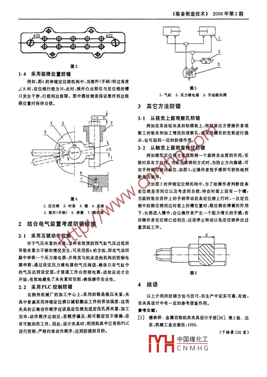 Equipment Manufacturing Technology No. 3, 2006夾具的防錯設計謝俊杰(柳州五菱汽車有限責任公司柳州機械廠,廣西柳州545005)摘要:在大批量生產(chǎn)中,廣泛地采用了防錯措施來保證操作可靠性和提高生產(chǎn)效率,而很多防錯措施是通過夾具來實現(xiàn)的。在分析介紹了幾個實例的基礎上,總結了夾具設計中具有代表性的一些防錯方法和技巧。實踐證明防錯效果好,值得在央具設計中應用。關鍵詞;防錯;夾具;設計;效率中圈分類號:TG75文獻標識碼:B文章編 號:1672 - 545X(2006)03 - 0080-02桿上的5把鏜刀各自進人待加工位置.為了確定偏移距離,在前言夾具體上設置了讓刀限位銷,每次裝夾時,操作者先把工件在大批量生產(chǎn)中,操作者在長時間的重復動作中總難免推至讓刀限位銷以留出讓刀空間,再軸向移動刀桿使各鏜刀有注意力不集中而出現(xiàn)操作失誤的現(xiàn)象,這就要求設計人員處于待加工位置,然后工件回退至預定位銷位置以方便伸縮必須采取--些有針對性的措施,以減少和避免操作者出錯。定位銷進入定位銷孔定位。加工完畢,操作者先把鏜刀定位在夾具上運用防錯措施,是較常見的一種解決手段。筆者結(通過手動旋轉主軸端設有標記的花盤實現(xiàn)),再退出定位合多年的設計實踐,在此探討一些在夾具設計上常見的防錯銷,然后將工件推向讓刀限位銷,即可退出刀桿。這種防錯方方法和技巧。法操作方便,能可靠地避免操作中碰崩刀刃和刮傷工件.1結合工件和夾具結構考慮防錯措施51.1 采用防反銷防錯例如,在發(fā)動機氣缸蓋的加工中,主要以底面及其上的6兩個定位銷孔(圖1中粗線表示)作為定位基準,在圖1中兩3!個定位銷孔對稱分布,且工件外形也基本對稱,若要求操作者每次裝夾時都進行檢查,不但影響效率,而且難免出錯。為9此,根據(jù)該零件底面的結構特點,在夾具體上設置了一個圓10柱銷(圖1中填充圓處),零件-旦裝反底面就會與圓柱銷產(chǎn)u生干涉,避免了出錯??诳谟煽诳谥锌陂T由口s電圈21.鏜刀桿2. 鏜刀3. 齒條圓柱定位銷4.讓刀限位銷5. 工件6. 齒條棱表定位銷7.預定位銷8.襯套 9.限位銷10. 齒桿11. 夾具體φS口申D口申口0毋口只申申1.3采用非對稱結構防錯如設計某鉆孔夾具的可卸式鉆模板時,限于待加工孔的1.2采用限位銷防錯布局,其外形設計如圖3.設計中若通過改變外觀避免出錯,圖2是在車床上鏜凸輪軸孔的夾具示意圖。刀桿~端裝崗的定位銷孔特意設計在主軸孔中,另一端由軸承座支承,因刀桿不能作徑向移動,為直中國煤化工”,也會因為銷和孔不匹加工前,必須使工件在徑向位置偏移-定距離后,讓裝在刀配而MHCNMH(真裝配、修理中的防錯。作者簡介:謝俊杰(1975-),男,工程師,主要從事現(xiàn)場工藝改進、工裝設計.收稿日期:2006-06-078《裝備制造技術》2006 年第3期.中20中22-5迪迪廠3圖31.4 采用極限位置防錯例如,圖4的伸縮定位銷機構中,當推桿(手柄)轉過角度∠A時,定位銷行程為H,此時,推桿凸出部位與定位銷的槽口發(fā)生干涉,行程到達極限。圖中圓柱銷是保證推桿到達極1.氣缸2. 壓力繼電器3. 手動換向閥限位置時保持自鎖。3其它方法防錯.3.1從視覺上 留觀察孔防錯43例如在某些鉆夾具的鉆模板上,特別留出方便操作者觀5察工件裝夾和加工情況的觀察孔,或采用醒目的色彩進行提示,也可起到一定的防錯作用。CA3.2從觸覺上留明顯特征防錯例如棱形定位銷主要起限制一個旋轉自由度的作用,安裝時具有方向性。當采用插銷的方式時,為防止方向搞錯,可在手持部位做出扁位,如圖5,讓操作者憑手感即可較快地判斷是否插對。又如圖2的伸縮定位銷機構中,為了給操作者判斷齒條定位銷是否到位以及考慮到自鎖,特在村套上設有一個槽,圈4當旋轉裝在齒桿上的手柄帶動齒條定位銷上行時,一旦定位1.定位銷2.襯套3.鍵4.底座銷中的限位銷到達襯套上的槽位置時,限位銷在彈簧的作用5.推桿(手柄) 6. 彈簧7. 圃柱銷下,頭部進人槽中,會讓操作者產(chǎn)生-一個阻力增大的手感,告訴操作者定位銷已經(jīng)到位,應該停止轉動以免定位銷伸出過2結合電氣裝置考慮防錯措施量頂起工件。2.1采用互鎖動作防錯.對于氣壓夾緊的夾具,怎樣有效預防因氣缸氣壓過低而導致夾緊力不夠的情況發(fā)生,可采用圖4的方法.即在乞動回路中串聯(lián)一個壓力繼電器,并將其與機床進給機構的控制電源串聯(lián),通過設定壓力繼電器的氣壓閥值,確保只有氣缸中的氣壓達到設定值,才接通工作臺控制電源,進給運動才會圍6開始,有效地避免了未夾緊面切削,確保操作安全性。4結語2.2采用PLC 控制防錯在柳州機械廠的加工中心上,采用的都是液壓夾緊,夾以上介紹的防錯方法與技巧,在生產(chǎn)中證實可靠、有效,具中普遍采用伸縮定位銷以減輕搬運工件的勞動強度,這類在夾具設計中有一定的參考借鑒作用.夾具的正E確動作順序應該是定位銷先進定位孔再夾緊,加工參考文獻:完畢,動作順序應相反,若順序搞反,則可能定位不準確,還[1] 浦林祥.金屬切削機床夾具設計手冊[M].第2版.北有可能刮傷工件.因此,設計夾具時,利用機床中已有的PLC京;機械工業(yè)出版社,1995.進行控制,嚴格約束動作順序,達到防錯的目的。(下轉第126頁)中國煤化工MYHCNMHG31Equipment Manufacturing Technology No. 3, 2006市場。對汽車零部件企業(yè)來說,立足國內(nèi)市場,積極挖掘潛動生產(chǎn)率太低,能耗過高所致。這些經(jīng