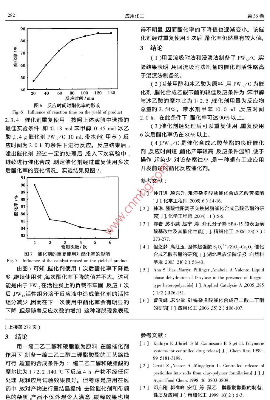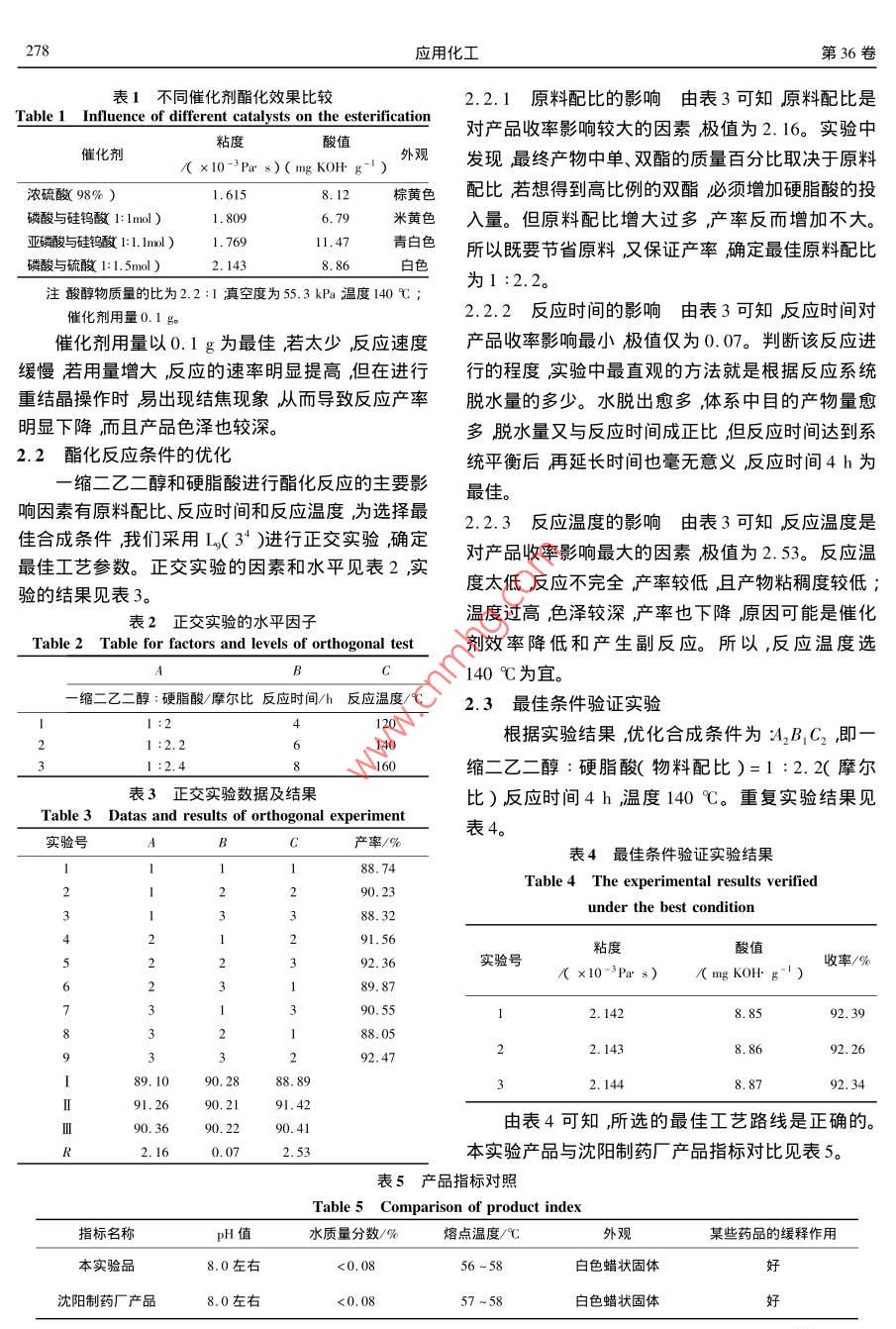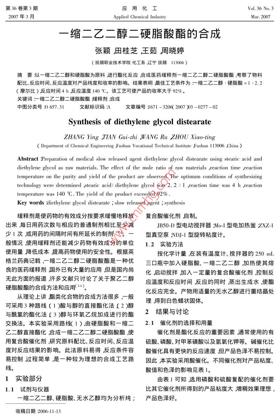 第36卷第3期應(yīng)用化工Vol 36 No. 32007年3月Applied Chemical IndustryMar.2007縮二乙二醇二硬脂酸酯的合成張穎田桂芝王茹周曉婷撫順職業(yè)技術(shù)學(xué)院化工系遼寧撫順113006)摘要以一縮二乙二醇和硬脂酸為原料進(jìn)行酯化反應(yīng)合成醫(yī)藥緩釋劑一縮二乙二醇二硬脂酸酯考察了物料配比、反應(yīng)時(shí)間、反應(yīng)溫度對(duì)產(chǎn)品純度和收率的影響。結(jié)果表明最佳工藝條件為:一縮二乙二醇:硬脂酸=1:2.2(摩爾比)反應(yīng)時(shí)間4h反應(yīng)溫度140℃。該工藝可使產(chǎn)品的收率大于92%。關(guān)鍵詞一縮二乙二醇二硬脂酸酯緩釋劑冾成中圖分類號(hào)657.3文獻(xiàn)標(biāo)識(shí)碼文章編號(hào):671-32062007)03-0277-02ynthesis of diethylene glycol distearateZHANG Ying tIAN Gui-zhi, WANG Ru ZHoU Xiao-tingDepartment of Chemical Engineering Fushun Vocational Technical Institute Fushun 113006 ChinaAbstract i Preparation of medical slow released agent diethylene glycol distearate using stearic acid anddiethylene glycol as raw materials. The effect of the mole ratio of raw materials reaction time reactiontemperature on the purity and yield of the product are observed. The optimum conditions of synthesizingtechnology were determined stearic acid: diethylene glycol was 2.2: I ,reaction time was 4 h, reactiontemperature was 140 C. The yield of the product exceeded 92%0Key words diethylene glycol distearate slow released agent synthesi緩釋劑是使藥物的有效成分按要求緩慢地釋放復(fù)合酸催化劑自制。出來每日用藥次數(shù)與相應(yīng)的普通制劑相比至少減JB50-D型電動(dòng)攪拌器Mo-I型電加熱釜ZXZ-1少1次或用藥的間隔時(shí)間有所延長(zhǎng)的制劑12型真空泵NDJ-1型旋轉(zhuǎn)粘度計(jì)。般情況使用緩釋劑還能減少藥物有效成分的單位1.2實(shí)驗(yàn)方法使用量降低成本提高藥物使用的安全性。根據(jù)英按化學(xué)計(jì)量在裝有溫度計(jì)、攪拌器的250mL格蘭藥典記載,縮二乙二醇二硬脂酸酯是一種優(yōu)口瓶中加入硬脂酸、一縮二乙二醇,加熱使其熔良的醫(yī)藥緩釋劑國(guó)外已有大量的應(yīng)用但是國(guó)內(nèi)尚化啟動(dòng)攪拌加入一定量的復(fù)合酸催化劑控制反無此方面的報(bào)道多文獻(xiàn)只討論了關(guān)于聚乙二醇應(yīng)溫度和反應(yīng)時(shí)間反應(yīng)的同時(shí)蒸出生成水使酯硬脂酸酯的合成方法和應(yīng)用341從理論上講酯類化合物的合成方法很多,般化反應(yīng)完全。產(chǎn)物用適量的無水乙醇進(jìn)行重結(jié)晶處可采用3種路線(1)酸與醇的直接酯化法(2)醇理得到白色蠟狀固體。與酰氯的酯化法(3)醇與環(huán)氧乙烷加成進(jìn)行的酯2結(jié)果與討論交換法。本實(shí)驗(yàn)采用路線(1),由硬脂酸和一縮二2.1催化劑的選擇和用量乙二醇直接酯化合成一縮二乙二醇二硬脂酸酯使催化劑是酯化反應(yīng)的重要因素通常使用的有用復(fù)合酸催化劑,研究原料配比、反應(yīng)時(shí)間、反應(yīng)溫硫酸、磷酸、對(duì)甲苯磺酸以及氫氧化鉀等。堿催化比度對(duì)反應(yīng)結(jié)果的影響。此法原料易得反應(yīng)條件容酸催化具有更快的反應(yīng)速度但產(chǎn)品色澤不易控制。易控制過程簡(jiǎn)單是一種較為理想的合成工藝路因此本實(shí)驗(yàn)采用酸催化。不同催化劑對(duì)產(chǎn)品粘度、線酸值和色澤的影響見表11實(shí)驗(yàn)部分由表1可知選用磷酸和硫酸復(fù)配的催化劑要1.1試劑與儀器比其它催化劑所得到的產(chǎn)品粘度大增稠效果理想一縮二乙二醇、硬脂酸、無水乙醇均為分析純;產(chǎn)品色澤好。收稿日期2006-11-13278應(yīng)用化工第36卷表1不同催化劑酯化效果比較2.2.1原料配比的影響由表3可知原料配比是Table 1 Influence of different catalysts on the esterification對(duì)產(chǎn)品收率影響較大的因素極值為2.16。實(shí)驗(yàn)中粘度酸值催化劑(×10P)(mK0Hg1)外觀發(fā)現(xiàn)最終產(chǎn)物中單、雙酯的質(zhì)量百分比取決于原料濃硫酸(98%)1.6158.12棕黃色配比若想得到高比例的雙酯必須增加硬脂酸的投磷酸與硅鎢酸1:1mol米黃色入量。但原料配比增大過多,產(chǎn)率反而增加不大。亞磷酸與硅鎢酸1:1.lml)1.769114白色所以既要節(jié)省原料又保證產(chǎn)率確定最佳原料配比磷酸與硫酸1:1.5mol)白色為1:2.2注酸醇物質(zhì)量的比為2.2:1真空度為55.3kPa溫度140℃催化劑用量0.1g2.2.2反應(yīng)時(shí)間的影響由表3可知反應(yīng)時(shí)間對(duì)催化劑用量以0.1g為最佳,若太少反應(yīng)速度產(chǎn)品收率影響最小極值僅為0.07。判斷該反應(yīng)進(jìn)緩慢若用量增大反應(yīng)旳速率明顯提高但在進(jìn)行行的程度實(shí)驗(yàn)中最直觀的方法就是根據(jù)反應(yīng)系統(tǒng)重結(jié)晶操作時(shí)易出現(xiàn)結(jié)焦現(xiàn)象從而導(dǎo)致反應(yīng)產(chǎn)率脫水量的多少。水脫出愈多,體系中目的產(chǎn)物量愈明顯下降而且產(chǎn)品色澤也較深。多脫水量又與反應(yīng)時(shí)間成正比但反應(yīng)時(shí)間達(dá)到系2.2酯化反應(yīng)條件的優(yōu)化統(tǒng)平衡后再延長(zhǎng)時(shí)間也毫無意義反應(yīng)時(shí)間4h為縮二乙二醇和硬脂酸進(jìn)行酯化反應(yīng)的主要影響因素有原料配比、反應(yīng)時(shí)間和反應(yīng)溫度為選擇最佳。佳合成條件我們采用L(34)進(jìn)行正交實(shí)驗(yàn),確定2.2.3反應(yīng)溫度的影響由表3可知