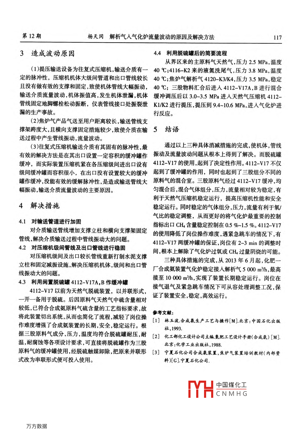 Vol.32 No.12石油化工應(yīng)用第32卷第12期Dec.2013PETROCHEMICAL INDUSTRY APPLICATION2013年12月解析氣人氣化爐流量波動(dòng)的原因及解決方法楊天岡(中國(guó)石油寧夏石化公司,寧夏銀川 750021)摘要:焦?fàn)t氣綜合利用是一項(xiàng)改善環(huán)境,提高資源利用率的有益項(xiàng)目,通過對(duì)造成解析氣流量波動(dòng)原因的分析,相應(yīng)解決措施的實(shí)施,解決了解析氣流量波動(dòng)問題,實(shí)現(xiàn)了解析氣穩(wěn)定并入,保證了裝置安全穩(wěn)定運(yùn)行。關(guān)鍵詞:焦?fàn)t氣;解析氣;氣化爐;液氮洗尾氣;脫硫罐doi:10.396/j.sn.1673- -5285.2013.12.029中圖分類號(hào):TQ546文獻(xiàn)標(biāo)識(shí)碼:B文章 編號(hào):1673- -5285(2013 )12-0115-03內(nèi)蒙古烏海市焦炭企業(yè)眾多,生產(chǎn)過程有大量焦主要組分取 2013年實(shí)際值(NG 配氣站取樣點(diǎn)A1,取爐氣產(chǎn)生。焦?fàn)t煤氣利用率很低,一般被送 至火炬系統(tǒng)平均值):體積百分比。燃燒放空或者直接排放。排放的焦?fàn)t氣中含有萘、苯、銀1 天然氣組分表(g/m')焦油等有毒有害物質(zhì),其排放量超出了國(guó)家排放標(biāo)準(zhǔn)CH,CH。CO2N2HzH2O數(shù)千倍,嚴(yán)重影響了當(dāng)?shù)鼐用窦爸苓叧鞘协h(huán)境。焦?fàn)t氣94.3409 3.223636 0.6118 0.6618 1.264 5252中又含有H2、CH4.CO.CO2等,H2含量為50 %~60 %,1.2 液氮洗尾氣組分CH4含量為25 %~30 %,熱值為4 041 kcal/cm',是合成化肥一廠合成氨裝置脫除CO利用液氮洗,其中氨的好原料。為提高資源利用率,改善環(huán)境,緩解化肥液氮洗尾氣中含有一 部分CO.CH,等有效氣組分。將裝置天然氣供應(yīng)不足的矛盾,寧夏石化公司2011年啟液氮洗尾氣通過壓縮機(jī)4116-K2提壓后,送天然氣壓動(dòng)焦?fàn)t氣綜合利用,用焦?fàn)t氣部分替代天然氣作為生縮機(jī)入口, 與天然氣混合后,替代-部分天然氣作為氣產(chǎn)合成氨的原料氣。化爐的原料之- - 。隨進(jìn)氣化爐原料氣組分的變化,液氮焦?fàn)t氣分離崗位的主要任務(wù)是將來(lái)自烏海來(lái)峰站洗尾氣組分變化較大,設(shè)計(jì)指標(biāo)(見表2、表3)。的3.0 MPa的焦?fàn)t煤氣,采用變壓吸附技術(shù)將其分離表2液氮洗尾氣組分設(shè)計(jì)指標(biāo)(體積/% )成富氫氣和富甲烷氣(解析氣),富氫氣通過加氫催化平均值COHH2Al脫氧等壓干燥得到高純度產(chǎn)品氫氣,經(jīng)壓縮機(jī)提壓后1.1-8.145.192.7919.396.8331.80作為合成氨的原料氣和燃料氣。表3液氮洗尾氣組分實(shí)際指標(biāo)(體積/%)|末站制氫高家S脫氫產(chǎn)品寒氫壓機(jī)8.OMPs 二化CO .CH1.1~8.134.7710.048 2.7919.65642.7353.0MPa解析氣壓縮機(jī)4.2MPe。1.3解析氣組分圖1裝置流程框困解析氣是從烏海送來(lái)的焦?fàn)t氣,經(jīng)過PSA變壓吸1進(jìn)氣化爐三股原料氣及簡(jiǎn)要流程附分離出氫氣后,剩余部分。將解析氣通過解析氣壓縮機(jī)4120 -K3/K4提壓后,送天然氣壓縮機(jī)人口,與天然1.1天然氣組分氣混合后,替代一部分天然氣作為氣化爐的原料之一。天然氣是寧夏石化合成氨的主要原料氣,天然氣解析氣主要組分( 見表4)。中國(guó)煤化工YHCNMH G*收稿日期:2013-10-23116石油化工應(yīng)用2013年 .第32卷表4解析氣組分表1.4進(jìn)氣化爐簡(jiǎn)要流程序號(hào)組分名稱單位值從界區(qū)來(lái)的主原料氣天然氣,壓力2.5 MPa,溫度H2%(V)16.7540 C;41 16-K2來(lái)的液氮洗尾氣,壓力3.8 MPa,溫度CH443.3640 C;焦?fàn)t氣解析氣4120-K3/K4,壓力3.5 MPa,穩(wěn)定8.640 C;將以上三股物料匯合后直接進(jìn)人天然氣壓縮機(jī)017.344112-K1/K2進(jìn)行提壓,提壓到9.4~10.6 MPa,進(jìn)入氣CO28.76化爐進(jìn)行反應(yīng)(見圖2)。CHN5.102氣化接入焦?fàn)t氣存在的問題D20.00H2O10.00從啟動(dòng)焦?fàn)t氣項(xiàng)目,到設(shè)備安裝歷時(shí)- -年多,到合計(jì)100.002013年4月完成了裝置的穩(wěn)定試車運(yùn)行。分別向用戶[天然氣x-4112-KI1K2D4112-V17A4112-V17B4116PICA20A4112FCV21244116-K24120-3K4 ]圖2進(jìn)氣化爐流程圖-套,二套輸送產(chǎn)品氫氣,解析氣,由于提壓輸送設(shè)備炸的危險(xiǎn); 后進(jìn)入CO變換爐使變換爐內(nèi)的變換觸媒為往復(fù)式壓縮機(jī),輸送介質(zhì)有其固有的脈沖性。化肥一過氧超溫,使觸媒燒結(jié)失去活性。CH含量過高:- -是廠氣化爐接入原料氣有三股,單臺(tái)氣化爐100 %的負(fù)氣化爐反 應(yīng)生成大量的碳黑,生成有效氣減少,合成氨荷下,主氣量天然氣接入量為17 838 m)/h,液氮洗尾氣產(chǎn)量下降, 資源浪費(fèi);二是生成大量的碳黑隨工藝氣進(jìn)穩(wěn)定接入量為500m0m,解析氣接入量般為2500m'/h。 入 co變換爐包裹,堵塞變換觸媒,使其活性下降,變解析氣接入后,出現(xiàn)流量大幅波動(dòng),波動(dòng)幅度最大在換率下降;三是過 量CH進(jìn)人后系統(tǒng)凈化工段,增加了1 000 m/h左右,流量的波動(dòng)造成入氣化爐總流量的甲醇洗, 液氮洗負(fù)荷及板式換熱器堵塞等危害。大幅波動(dòng)?;? -廠 -氣化崗位氣化爐造氣原理為德士由于焦?fàn)t氣并人氣化爐流量大幅波動(dòng),焦?fàn)t氣裝古氣化爐,氣態(tài)烴非催化部分氧化法,原料氣氧氣、蒸置運(yùn)行不穩(wěn)定 ,氣化爐頻繁的接人退出解析氣,以及焦汽在一定的配比下在氣化爐內(nèi)在1 200~-1 350 C的高爐氣裝置跳 車的緊急處理,使氣化爐頻繁的處于過氧溫條件下反應(yīng)。由于流量的大幅波動(dòng)及三股氣體組分及陰燒中, 給裝置的安全穩(w