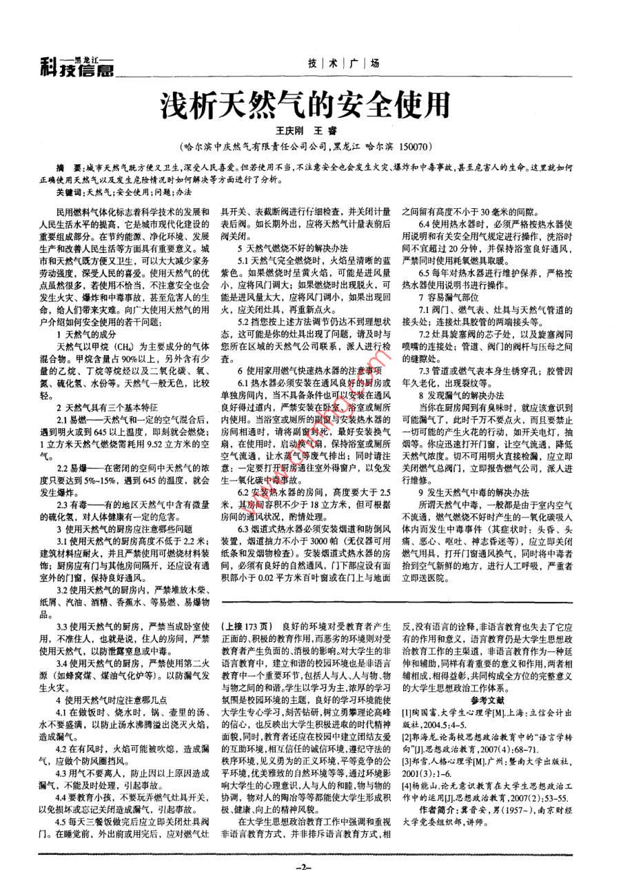 科技信層技術(shù)|廣|場淺析天然氣的安全使用王慶剛王睿(哈爾濱中慶然氣有限責(zé)任公司公司,黑龍江哈爾濱150070)擴要:城市天然氣既方便又衛(wèi)生,深受人民喜愛。但若使用不當(dāng),不注意安全也會發(fā)生火災(zāi)、爆炸和中毒事故,甚至危害人的生命。這里就如何正確使用天然氣以及發(fā)生危險情況時如何解決等方面進行了分析。關(guān)鍵詞:天然氣;安全使用;問題;辦法民用燃料氣體化標(biāo)志著科學(xué)技術(shù)的發(fā)展和具開關(guān)、表截斷閥進行仔細(xì)檢查,并關(guān)閉計量之間留有高度不小于30毫米的間隙人民生活水平的提高,它是城市現(xiàn)代化建設(shè)的表后閥。如長期外出,應(yīng)將天然氣計量表前后64使用熱水器時,必須嚴(yán)格按熱水器使重要組成部分。在節(jié)約能源、凈化環(huán)境、發(fā)展閥關(guān)閉。用說明和有關(guān)安全用氣規(guī)定進行操作,洗浴時生產(chǎn)和改善人民生活等方面具有重要意義。城間不宜超過20分鐘,并保持浴室良好通風(fēng)市和天然氣既方便又衛(wèi)生,可以大大減少家務(wù)51天然氣完全燃燒時,火焰呈清晰的藍(lán)嚴(yán)禁同時使用耗氧燃具取暖。勞動強度,深受人民的喜愛。使用天然氣的優(yōu)紫色。如果燃燒時呈黃火焰,可能是進風(fēng)量65每年對熱水器進行維護保養(yǎng),嚴(yán)格按點雖然很多,若使用不恰當(dāng),不注意安全也會小,應(yīng)將風(fēng)門調(diào)大;如果燃燒時出現(xiàn)脫火,可熱水器使用說明書進行操作發(fā)生火災(zāi)、爆炸和中毒事故,甚至危害人的生能是進風(fēng)量太大,應(yīng)將風(fēng)門調(diào)小,如果出現(xiàn)回7容易漏氣部位命,給人們帶來災(zāi)難。向廣大使用天然氣的用火,應(yīng)關(guān)閉灶具,再重新點火7.1閥門、燃?xì)獗?、灶具與天然氣管道的戶介紹如何安全使用的若干問題52擋您按上述方法調(diào)節(jié)仍達狀接頭處;連接灶具膠管的兩端接頭等天然氣的成分態(tài),這可能是你的灶具出現(xiàn)了問題,72灶具旋塞閥的芯子處,以及旋塞閥同天然氣以甲烷(CH)為主要成分的氣體您所在區(qū)域的天然氣公司聯(lián)系檢噴嘴的連接處;管道、閥門的閥桿與壓母之間混合物。甲烷含量占90%以上,另外含有少查量的乙烷、丁烷等烷烴以及二氧化碳、氧、6使用家用燃?xì)饪焖贌崴鞯淖⒁馐马?3管道或燃?xì)獗肀旧砩P穿孔;膠管因氮、硫化氫、水份等。天然氣一般無色,比較61熱水器必須安裝在通風(fēng)良好的廚房或年久老化,出現(xiàn)裂紋等單獨房間內(nèi),當(dāng)不具備條件也可以安裝在通風(fēng)8發(fā)現(xiàn)漏氣的解決辦法2天然氣具有三個基本特征良好得過道內(nèi),嚴(yán)禁安裝在臥室、浴室或廁所當(dāng)你在廚房聞到有臭味時,就應(yīng)該意識到21易燃—一—天然氣和一定的空氣混合后,內(nèi)使用。當(dāng)浴室或廁所的副窗與安裝熱水器的可能漏氣了,此時千萬不要點火,而且要禁止遇到明火或到645以上溫度,即刻就會燃燒;房間相通時,請將副窗封死,最好安裝換氣一切可能的產(chǎn)生火花的行動,如開關(guān)電燈,抽1立方米天然氣燃燒需耗用9.52立方米的空扇,在使用時,啟動換氣扇,保持浴室或廁所煙等。你應(yīng)迅速打開門窗,讓空氣流通,降低空氣流通,讓水蒸氣等廢氣排出;同時請注天然氣濃度。切不可用明火直接檢漏,應(yīng)立即度只要達到5%15%,遇到645的溫度,就會生一氧化碳中往室外得窗戶,以免發(fā)關(guān)閉燃?xì)饪傞嗛T,立即報告燃?xì)夤?派人進22易爆—在密閉的空間中天然氣的濃意:一定要打開廚房發(fā)生爆炸62安裝熱水器的房間,高度要大于259發(fā)生天然氣中毒的解決辦法23有毒—有的地區(qū)天然氣中含有微量米,其房間容積不少于18立方米,但可根據(jù)所謂天然氣中毒,一般都是由于室內(nèi)空氣的硫化氫,對人體健康有一定的危害。房間的通風(fēng)狀況,酌情處理。不流通,燃?xì)馊紵缓脮r產(chǎn)生的一氧化碳吸入3使用天然氣的廚房應(yīng)注意哪些問題63煙道式熱水器必須安裝煙道和防倒風(fēng)體內(nèi)而發(fā)生中毒事件(其癥狀時:頭昏、頭3.I使用天然氣的廚房高度不低于2.2米;裝置,煙道抽力不小于300帕(無儀器可用痛、惡心、嘔吐、神志昏迷等),應(yīng)立即關(guān)閉建筑材料應(yīng)耐火,并且嚴(yán)禁使用可燃燒材料裝紙條和發(fā)煙物檢查)。安裝煙道式熱水器的房燃?xì)庥镁?打開門窗通風(fēng)換氣,同時將中毒者飾;廚房應(yīng)有門與其他房間隔開,還應(yīng)設(shè)有通間,必須有良好的自然通風(fēng),門下部應(yīng)設(shè)有面抬到空氣新鮮的地方,進行人工呼吸,嚴(yán)重者室外的門窗,保持良好通風(fēng)。積部小于0.02平方米百葉窗或在門上與地面立即送醫(yī)院32使用天然氣的廚房內(nèi),嚴(yán)禁堆放木柴、紙屑、汽油、酒精、香蕉水、等易燃、易爆物33使用天然氣的廚房,嚴(yán)禁當(dāng)成臥室使(上接173頁)良好的環(huán)境對受教育者產(chǎn)生反沒有語言的詮釋,非語言教育也失去了它應(yīng)用,不準(zhǔn)住人,也就是說,住人的房間,嚴(yán)禁正面的、積極的教育作用而惡劣的環(huán)境則對受有的作用和意義,語言教育仍是大學(xué)生思想政使用天然氣,以防泄露窒息或中毒。教育者產(chǎn)生負(fù)面的消極的影響。對大學(xué)生的非治教育工作的主渠道,非語言教育作為