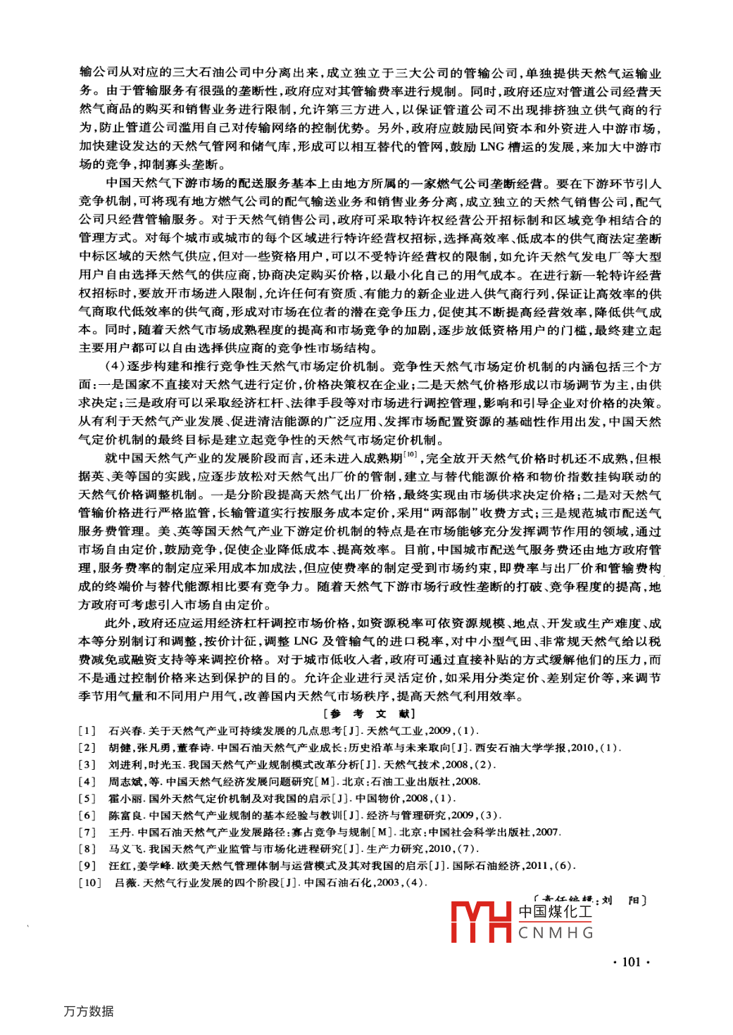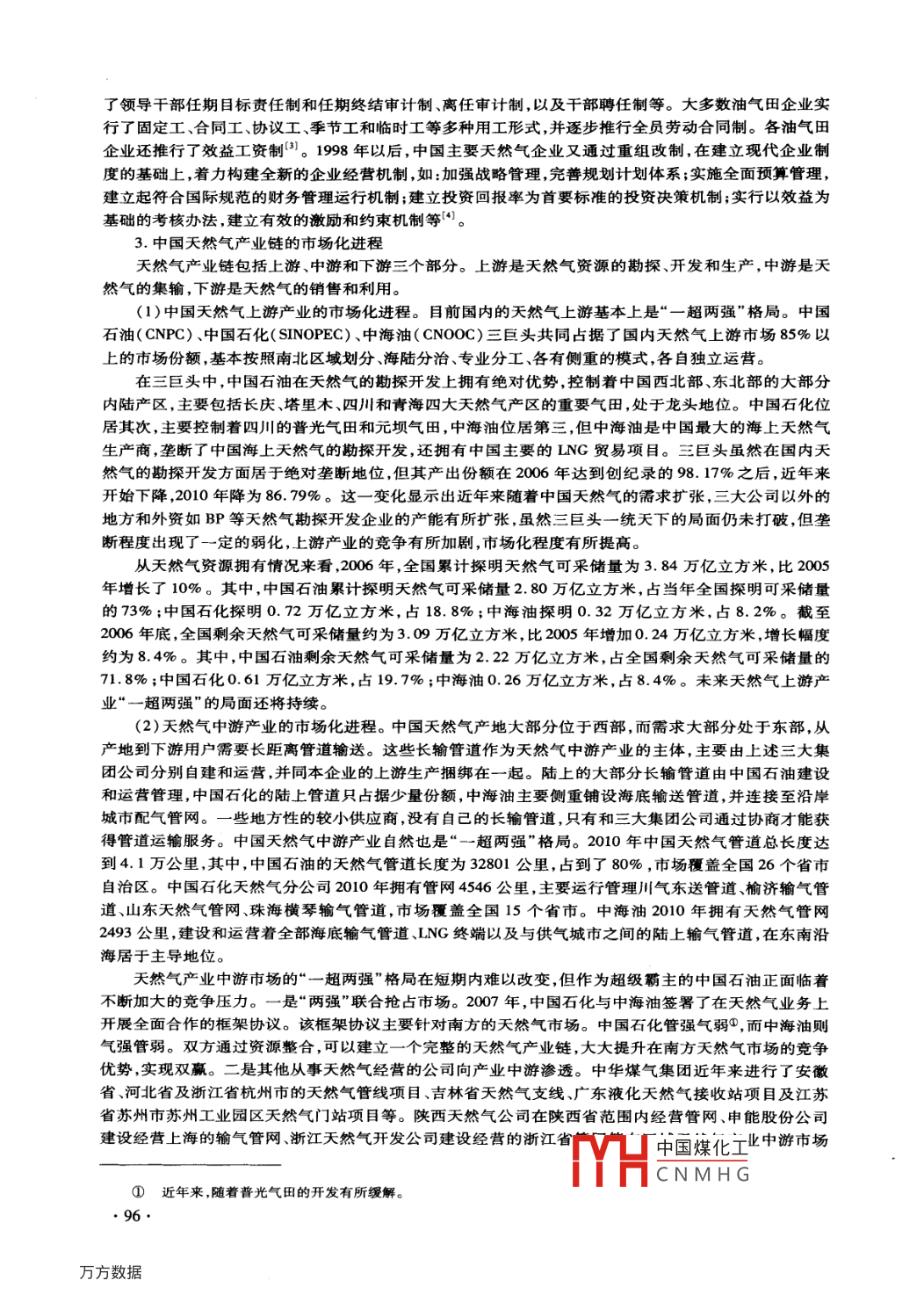 2013年1月學(xué)術(shù)交流Jan.,2013總第226期第1期Academic ExchangeSerial No 226 No 1中國天然氣產(chǎn)業(yè)的市場化研究王少國,房宏琳2(1.首都經(jīng)濟(jì)貿(mào)易大學(xué)經(jīng)濟(jì)學(xué)院北京10005;2.黑龍江省社會科學(xué)院學(xué)習(xí)與探索雜志社哈爾濱15001[摘要]隨著中國能源需求的日益擴(kuò)大,大力開發(fā)和利用天然氣這一清潔而熱值高的能源已經(jīng)成為中國提高人民生活水平、推進(jìn)可持續(xù)發(fā)展和改善環(huán)境質(zhì)量的最佳選擇。而如何有效開發(fā)和利用天然氣資源是中國需要迫切解決的一項課題。從發(fā)達(dá)國家天然氣產(chǎn)業(yè)的發(fā)展歷程來看,一個共同的經(jīng)驗是天然氣產(chǎn)業(yè)的市場化,這成為提高天然氣產(chǎn)業(yè)發(fā)展績效的規(guī)律。目前,中國天然氣產(chǎn)業(yè)的市場化程度還不高。分析中國天然氣產(chǎn)業(yè)的市場化現(xiàn)狀,有效借鑒發(fā)達(dá)國家天然氣產(chǎn)業(yè)市場化的經(jīng)驗,尋找有序推進(jìn)中國天然氣產(chǎn)業(yè)的市場化路徑,對于中國天然氣產(chǎn)業(yè)的健康發(fā)展具有重要意義。[關(guān)鍵詞]天然氣產(chǎn)業(yè);市場化;能源利用[中圖分類號]F270[文獻(xiàn)標(biāo)志碼]A[文章編號]1000-8284(2013)01-0093-09、中國天然氣產(chǎn)業(yè)的市場發(fā)展和供求狀況1.由區(qū)域內(nèi)市場發(fā)展為全國性市場1997年之前,隨著萊膠管道、靖西二線、中山天然氣管道、南北干線區(qū)域環(huán)形管網(wǎng)與羅家寨、渡口河集輸氣管道的建成投產(chǎn),區(qū)域性天然氣市場獲得了快速發(fā)展。與中國的天然氣勘探開發(fā)、集輸集中在區(qū)域內(nèi)相適應(yīng),天然氣消費市場也主要局限在以上區(qū)域內(nèi)。隨著20世紀(jì)末中國開始的大規(guī)模輸氣管道建設(shè),澀寧蘭線、陜京線、忠武線、西氣東輸管線陜京二線等長輸天然氣管道的陸續(xù)建成投產(chǎn),使各區(qū)域管道連接成網(wǎng),基本形成了全國性天然氣輸氣管網(wǎng)框架。中國一中亞天然氣管網(wǎng)的建成投產(chǎn),使中亞的天然氣也供應(yīng)到了中國市場。另外,為解決東部沿海地區(qū)的用氣需求,還實施了進(jìn)口LNG項目。中國天然氣市場供應(yīng)格局呈現(xiàn)出“西氣東輸、海氣上岸、北氣南下”的局面,有效地實現(xiàn)了資源與市場的對接,形成了全國性的天然氣市場。據(jù)統(tǒng)計,目前,中國大陸31個省級行政區(qū)中,除西藏自治區(qū)尚未利用天然氣外,其余30個省級行政區(qū)都有不同程度的應(yīng)用,天然氣消費量超過10億立方米的省級行政區(qū)達(dá)到20個2.中國天然氣市場的供求狀況(1)中國天然氣的國內(nèi)供給。由圖1可以看出,從1993年至今,天然氣產(chǎn)量呈現(xiàn)出逐年遞增態(tài)勢。尤其是2000年以來,天然氣產(chǎn)量年均增速達(dá)15%,2010年已達(dá)968億m。中國天然氣占能源生產(chǎn)總量的比重也不斷提高,由1993年的2.0%,提高到2010年的4.3%,提高了一倍多。(2)中國的天然氣需求。1996年以后,隨著大型長輸天然氣管道的陸續(xù)建成,中國天然氣消費量隨之迅速增長,到1998年突破200億立方米,2006年突破500億立方米,2010年突破1000億立方米,達(dá)1090億立方米,為2000年的4倍多(見圖2)。最近10年是中國天然氣消費的快速增長期,年均增長近80億立方米。自2004年中國“西氣東輸”管道建成以來,全國天然氣消費量年均增長近100億立方米從能源消費構(gòu)成來看,1993年中國天然氣消費占能源消費總量的比重為1.9%,此后這一比重呈現(xiàn)緩慢[收稿日期]2012-10-28中國煤化工[基金項目]首都經(jīng)濟(jì)貿(mào)易大學(xué)特大城市經(jīng)濟(jì)與社會發(fā)展研究院資助TH[作者簡介]王少國(1972-),男教授博士研究生導(dǎo)師經(jīng)濟(jì)學(xué)博士,副LCNMHG凵改勹濟(jì)增長研究。提高態(tài)勢,2010年達(dá)到4.4%,仍遠(yuǎn)低于24%的世界平均水平。000s小小小小小少小中小少圖11993-2010年中國天然氣產(chǎn)量變化趨勢數(shù)據(jù)來源:BP世界能源統(tǒng)計相關(guān)年份muthIll圖21993-2010年中國天然氣消費量數(shù)據(jù)來源:《中國統(tǒng)計年鑒》相關(guān)各期和BP能源統(tǒng)計2011目前,中國天然氣主要用于工業(yè)原料、工業(yè)燃料發(fā)電和居民用氣。從中國的天然氣消費結(jié)構(gòu)來看,消費結(jié)構(gòu)趨于優(yōu)化。從表1可以看出,近年來,中國天然氣用于工業(yè)燃料和發(fā)電增長迅速,分別由2001年的18.0%和4.0%提高到2009年的33.4%和10.3%,用于民用燃料的比重也有所提高,由2001年的23.0%提高到2009年的30.6%,用于化工原料的比重大幅下降,由2001年的49.0%下降到2009年的25.7%。這種消費結(jié)構(gòu)的變化主要是因為:天然氣管網(wǎng)的建設(shè)和城市化的發(fā)展大大開拓了天然氣市場,城市燃?xì)庵刑烊粴夤饬靠焖僭鲩L,使天然氣消費的民用比重大幅提高;天然氣作為工業(yè)燃料燃燒后的環(huán)境污染小,與燃料油相比經(jīng)濟(jì)性較好,在節(jié)能減排的政策背景下呈現(xiàn)出較快發(fā)展的態(tài)勢;燃?xì)廨啓C(jī)與蒸汽輪機(jī)聯(lián)合循環(huán)發(fā)電技術(shù)的進(jìn)步促進(jìn)了天然氣在發(fā)電領(lǐng)域的利用,使天然氣用于發(fā)電的比重獲得大幅提高,目前,世界天然氣發(fā)電在總發(fā)電量中所占的比重在1/3左右,中