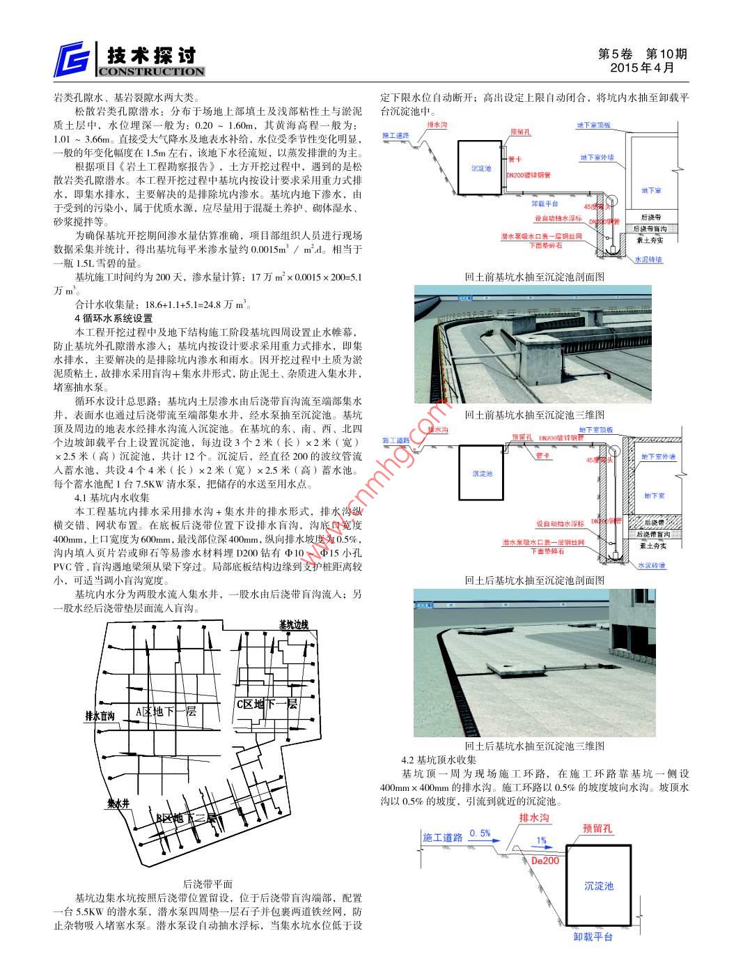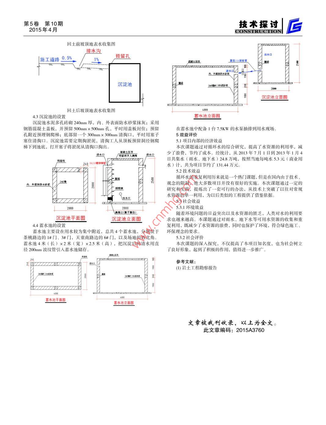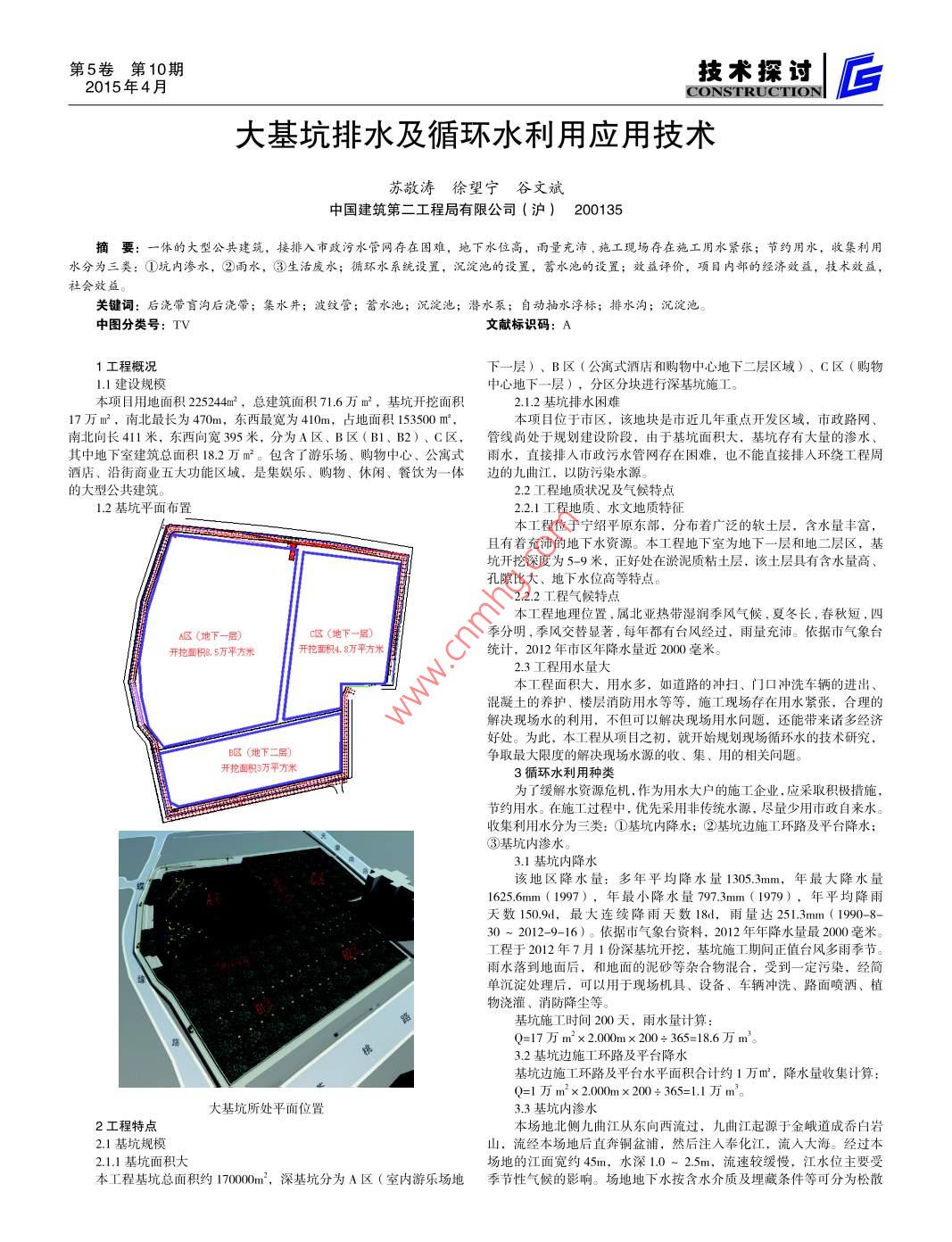第5卷第10期技術(shù)探討2015年4月CONSTRUCTION后大基坑排水及循環(huán)水利用應(yīng)用技術(shù)蘇敬濤徐望寧谷文斌中國建筑第二工程局有限公司(滬)200135摘要:一體的大型公共建筑,接排入市政污水管網(wǎng)存在困難,地下水位高,雨量充沛,施工現(xiàn)場存在施工用水緊張;節(jié)約用水,收集利用水分為三類:①坑內(nèi)滲水,②雨水,③生活廢水;循環(huán)水系統(tǒng)設(shè)置,沉淀池的設(shè)置,蓄水池的設(shè)置:效益評價,項目內(nèi)部的經(jīng)濟效益,技術(shù)效益,社會效益關(guān)鍵詞:后澆帶盲溝后澆帶;集水井;波紋管;蓄水池;沉淀池;潛水泵;自動抽水浮標(biāo);排水洶;沉淀池中圖分類號:TV文獻(xiàn)標(biāo)識碼:A1工程概況下一層)、B區(qū)(公寓式酒店和購物中心地下二層區(qū)域)、C區(qū)(購物1.1建設(shè)規(guī)模中心地下一層),分區(qū)分塊進行深基坑施工本項目用地面積225244m2,總建筑面積71.6萬m2,基坑開挖面積2.1.2基坑排水困難17萬m2,南北最長為470m,東西最寬為410m,占地面積153500m2本項目位于市區(qū),該地塊是市近幾年重點開發(fā)區(qū)域,市政路網(wǎng)南北向長411米,東西向?qū)?95米,分為A區(qū)、B區(qū)(B1、B2)、C區(qū),管線尚處于規(guī)劃建設(shè)階段,由于基坑面積大,基坑存有大量的滲水其中地下室建筑總面積18.2萬m2。包含了游樂場、購物中心、公寓式雨水,直接排人市政污水管網(wǎng)存在困難,也不能直接排入環(huán)繞工程周酒店、沿街商業(yè)五大功能區(qū)域,是集娛樂、購物、休閑、餐飲為一體邊的九曲江,以防污染水源。的大型公共建筑22工程地質(zhì)狀況及氣候特點1.2基坑平面布置22.1工程地質(zhì)、水文地質(zhì)特征本工程位于寧紹平原東部,分布著廣泛的軟土層,含水量豐富且有著充沛的地下水資源。本工程地下室為地下一層和地二層區(qū),基坑開挖深度為5-9米,正好處在淤泥質(zhì)粘土層,該土層具有含水量高孔隙比大、地下水位高等特點222工程氣候特點本工程地理位置,屬北亞熱帶濕潤季風(fēng)氣候,夏冬長,春秋短,四A區(qū)(地下一層)C區(qū)(地下一層)季分明,季風(fēng)交替顯著,每年都有臺風(fēng)經(jīng)過,雨量充沛。依據(jù)市氣象臺開挖面積8.5萬平方米開挖面積4.8萬平方米統(tǒng)計,2012年市區(qū)年降水量近2000毫米23工程用水量大本工程面積大,用水多,如道路的沖掃、門口沖洗車輛的進出混凝土的養(yǎng)護、樓層消防用水等等,施工現(xiàn)場存在用水緊張,合理的解決現(xiàn)場水的利用,不但可以解決現(xiàn)場用水問題,還能帶來諸多經(jīng)濟好處。為此,本工程從項目之初,就開始規(guī)劃現(xiàn)場循環(huán)水的技術(shù)研究R區(qū)(地下二層爭取最大限度的解決現(xiàn)場水源的收、集、用的相關(guān)問題。開挖面積3萬平方3循環(huán)水利用種類為了緩解水資源危機,作為用水大戶的施工企業(yè),應(yīng)采取積極措施節(jié)約用水。在施工過程中,優(yōu)先采用非傳統(tǒng)水源,盡量少用市政自來水收集利用水分為三類:①基坑內(nèi)降水;②基坑邊施工環(huán)路及平臺降水③基坑內(nèi)滲水。3.1基坑內(nèi)降水該地區(qū)降水量:多年平均降水量1305.3mm,年最大降水量l6256mm(1997),年最小降水量797.3mm(1979),年平均降雨天數(shù)150.9,最大連續(xù)降雨天數(shù)184,雨量達(dá)251.3mm(1990-8-30~2012-9-16)。依據(jù)市氣象臺資料,2012年年降水量最2000毫米工程于2012年7月1份深基坑開挖,基坑施工期間正值臺風(fēng)多雨季節(jié)。雨水落到地面后,和地面的泥砂等雜合物混合,受到一定污染,經(jīng)簡單沉淀處理后,可以用于現(xiàn)場機具、設(shè)備、車輛沖洗、路面噴灑、植物澆灌、消防降塵等?;邮┕r間200天,雨水量計算Q=17萬m2×2000m3.2基坑邊施工環(huán)路及平臺降水基坑邊施工環(huán)路及平臺水平面積合計約1萬m2,降水量收集計算1萬m2×2.00m×200÷365=1.1萬m3。大基坑所處平面位置3基坑內(nèi)滲水2工程特點本場地北側(cè)九曲江從東向西流過,九曲江起源于金峨道成岙白巖2.1基坑規(guī)模山,流經(jīng)本場地后直奔銅盆浦,然后注入奉化江,流入大海。經(jīng)過本21.1基坑面積大場地的江面寬約45m,水深1.0~2.5m,流速較緩慢,江水位主要受本工程基坑總面積約17000mn2,深基坑分為A區(qū)(室內(nèi)游樂場地季節(jié)性氣候的影響。場地地下水按含水介質(zhì)及埋藏條件等可分為松散技術(shù)探討第5卷第10期CONSTRUCTION2015年4月巖類孔隙水、基巖裂隙水兩大類。定下限水位自動斷開;高出設(shè)定上限自動閉合,將坑內(nèi)水抽至卸載平松散巖類孔隙潛水:分布于場地上部填土及淺部粘性土與淤泥臺沉淀池中層中,水位埋深一般為:0.20~1.60m,其黃海高程一般為排水溝地下室頂板1.01~366m。直接受大氣降水及地表水補給,水位受季節(jié)性變化明顯一般的年變化幅度在15m左右,該地下水徑流短,以蒸發(fā)排泄的為主地下室外墻根據(jù)項目《巖土工程勘察報告》,土方開挖過程中,遇到的是松沉淀泡巖類孔隙潛水。本工程開挖過程中基坑內(nèi)按設(shè)計要求采用重力式排200疆鋅鍋管水,即集水排水,主要解決的是排除坑內(nèi)滲水?;觾?nèi)地下滲水,由于受到的污染小,屬于優(yōu)質(zhì)水源,應(yīng)盡量用于混凝土養(yǎng)護、砌體濕水、卸載平臺砂漿攪拌等設(shè)自動抽水浮標(biāo)后澆帶為確保基坑開挖期間滲水量估算準(zhǔn)