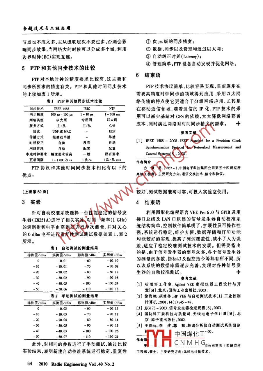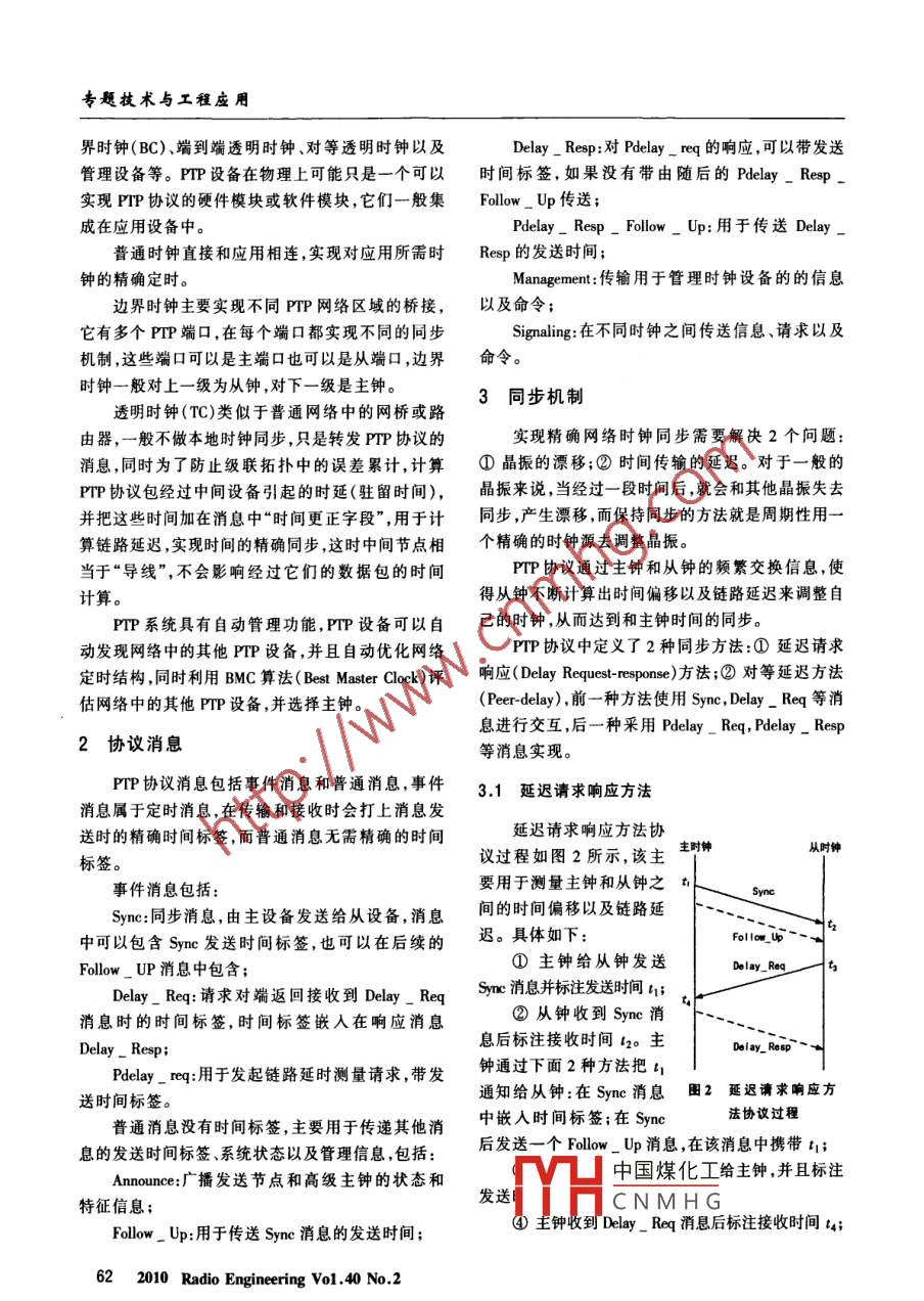 專題技術(shù)與工程廢用PTP技術(shù)分析方強(qiáng)(中國(guó)電子科技集團(tuán)公司第五十四研究所,河北石家莊050081)摘要時(shí)間同步技術(shù)廣泛應(yīng)用于工業(yè)自動(dòng)化、儀表測(cè)量以及通信等領(lǐng)域,傳統(tǒng)的同步技術(shù)的同步精度比較低,已經(jīng)無法滿足高精度同步的需求,IEEE1588標(biāo)準(zhǔn)精確時(shí)間同步協(xié)議(PTP)的提出,解決了應(yīng)用領(lǐng)域中需要高精度時(shí)間同步的問題,它可以通過分組網(wǎng)絡(luò)實(shí)現(xiàn),大大降低系統(tǒng)成本。對(duì)PTP中的系統(tǒng)模型、同步機(jī)制進(jìn)行了分析,給出了PTP實(shí)現(xiàn)時(shí)注意的問題。關(guān)鍵詞PP;1588;NP中圖分類號(hào)TP393文獻(xiàn)標(biāo)識(shí)碼A文章編號(hào)1003-3106(2010)02-0061-04Analysis on PTPFANG QiangThe 54th Research institute of CETC, Shijiazhuang Hebei 050081, China)Abstract Time synchronization techniques are widely applied to industrial automation, instrument measurement and telecommunicationbut traditional methods can t satisfy the requirement in some precise time synchronization application. IEEE1588 standard addresses precisesynchronization of clocks in application that needs precise time references. It can achieve highly accurate synchronization over pnetwork(e. g. Ethemet)and reduce cost of system deployment. In this paper, PTP system model and precise synchronization principle arediscussed and some key points in designing PTP system are givenKey words PTP: 1588; NTP成本,提高了效率0引言時(shí)間同步技術(shù)廣泛應(yīng)用于工業(yè)自動(dòng)化、工業(yè)控1系統(tǒng)模型制、儀器測(cè)量以及通信領(lǐng)域,早期的時(shí)間同步技術(shù)一PTP系統(tǒng)是一個(gè)分布式網(wǎng)絡(luò)結(jié)構(gòu),在PP系統(tǒng)般需要專用的時(shí)間同步網(wǎng)絡(luò)為應(yīng)用系統(tǒng)提供服務(wù),中,協(xié)議運(yùn)行的邏輯范圍稱為一個(gè)域( Domain),域中無法直接在應(yīng)用網(wǎng)絡(luò)中(尤其是在分組網(wǎng)絡(luò)中)傳遞設(shè)備采用主、從方式實(shí)現(xiàn)時(shí)間精準(zhǔn)同步,所有的實(shí)時(shí)時(shí)間同步信息,所以系統(tǒng)的成本比較高,NTP時(shí)鐘組成主從同步端口,一個(gè)設(shè)備可以有多個(gè)( Network Time protoco)雖然可以在應(yīng)用網(wǎng)絡(luò)中實(shí)現(xiàn)端口,對(duì)上它是從端口,對(duì)下它是主端口。系時(shí)間同步,但是精度不是很高,無法滿足日益增長(zhǎng)的統(tǒng)中有一個(gè)高級(jí)主時(shí)鐘( Grandmaster),它決定了對(duì)精確時(shí)間同步的需求,所以PTP技術(shù)應(yīng)運(yùn)而生。整個(gè)系統(tǒng)的時(shí)鐘IEEE1588標(biāo)準(zhǔn)(網(wǎng)絡(luò)測(cè)量和控制系統(tǒng)精確時(shí)鐘同步頻率。系統(tǒng)中主協(xié)議,簡(jiǎn)稱PP)由安捷倫實(shí)驗(yàn)室的成員開發(fā),并于從設(shè)備通過交換2002年11月正式成為IEEE標(biāo)準(zhǔn)(版本1.0),最初PIP協(xié)議消息,來的標(biāo)準(zhǔn)主要用于工業(yè)自動(dòng)化、精密控制以及工業(yè)測(cè)調(diào)整本地時(shí)鐘,從量和測(cè)試方面,但是隨著精確時(shí)間定時(shí)的廣泛應(yīng)用,而達(dá)到時(shí)鐘的同IEEE在2008年4月推出了2.0版本,增加了PTP在步。一個(gè)簡(jiǎn)單的電信、網(wǎng)絡(luò)、航空以及電力系統(tǒng)中的應(yīng)用。 IEEE PTP1588的出現(xiàn)解決了時(shí)間同步應(yīng)用中對(duì)時(shí)間精度的圖1"中國(guó)煤化工系模要求,實(shí)現(xiàn)了網(wǎng)絡(luò)中精確時(shí)鐘同步;采用了以太網(wǎng)絡(luò)CNMHG普通時(shí)鐘(OC)邊實(shí)現(xiàn)傳輸可以和采用分組網(wǎng)絡(luò)的應(yīng)用結(jié)合降低了收稿日期:200182010旱無實(shí)電工翟第40癮第2期61專題技術(shù)與工程應(yīng)用界時(shí)鐘(BC)、端到端透明時(shí)鐘、對(duì)等透明時(shí)鐘以及Delay_ Resp:對(duì) Delay_meq的響應(yīng),可以帶發(fā)送管理設(shè)備等。PTP設(shè)備在物理上可能只是一個(gè)可以時(shí)間標(biāo)簽,如果沒有帶由隨后的 Delay Resp實(shí)現(xiàn)PIP協(xié)議的硬件模塊或軟件模塊,它們一般集Folw_Up傳送;成在應(yīng)用設(shè)備中。Pdelay_ Resp Follow Up:用于傳送De普通時(shí)鐘直接和應(yīng)用相連,實(shí)現(xiàn)對(duì)應(yīng)用所需時(shí)Resp的發(fā)送時(shí)間;鐘的精確定時(shí)。Management:傳輸用于管理時(shí)鐘設(shè)備的的信息邊界時(shí)鐘主要實(shí)現(xiàn)不同PTP網(wǎng)絡(luò)區(qū)域的橋接,以及命令;它有多個(gè)PTP端口,在每個(gè)端口都實(shí)現(xiàn)不同的同步ignaling:在不同時(shí)鐘之間傳送信息、請(qǐng)求以及機(jī)制,這些端口可以是主端口也可以是從端口,邊界命令。時(shí)鐘一般對(duì)上一級(jí)為從鐘,對(duì)下一級(jí)是主鐘。3同步機(jī)制透明時(shí)鐘(T℃C)類似于普通網(wǎng)絡(luò)中的網(wǎng)橋或路由器,一般不做本地時(shí)鐘同步,只是轉(zhuǎn)發(fā)PP協(xié)議的實(shí)現(xiàn)精確網(wǎng)絡(luò)時(shí)鐘同步需要解決2個(gè)問題消息,同時(shí)為了防止級(jí)聯(lián)拓?fù)渲械恼`差累計(jì),計(jì)算①晶振的漂移;②時(shí)間傳輸?shù)难舆t。對(duì)于一般的PTP協(xié)議包經(jīng)過中間設(shè)備引起的時(shí)延(駐留時(shí)間),晶振來說,當(dāng)經(jīng)過一段時(shí)間后就會(huì)和其他晶振失去并把這些時(shí)間加在消息中“時(shí)間