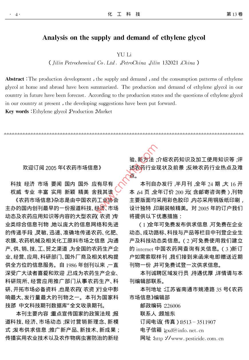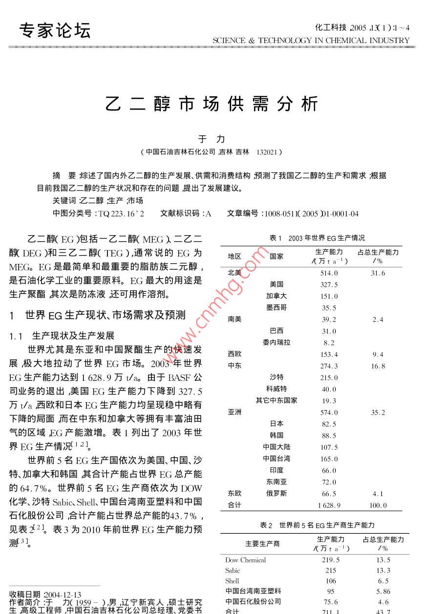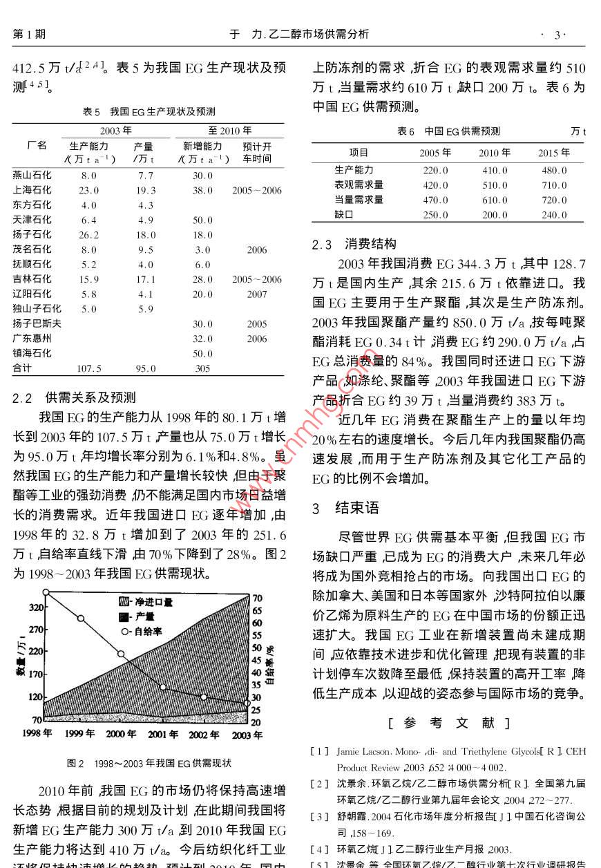 專家論壇化工科技20053(1):1~4scienCe TeChnology In chemical industry乙二醇市場供需分析于力中國石油吉林石化公司吉林吉林132021)摘要綜述了國內(nèi)外乙二醇的生產(chǎn)發(fā)展、供需和消費結(jié)構(gòu)預(yù)測了我國乙二醇的生產(chǎn)和需求根據(jù)目前我國乙二醇的生產(chǎn)狀況和存在的問題提出了發(fā)展建議關(guān)鍵詞乙二醇泩產(chǎn)市場中圖分類號:TQ223.16+2文獻標(biāo)識碼:A文章編號:100805112005m1-000104乙二醇EG)包括一乙二醇MEG)二乙二表12003年世界EG生產(chǎn)情況釀DEG)和三乙二醇(TEG),通常說的EG為地區(qū)國家生產(chǎn)能力占總生產(chǎn)能力MEG。EG是最簡單和最重要的脂肪族二元醇萬ta1)是石油化學(xué)工業(yè)的重要原料。EG最大的用途是北美美國生產(chǎn)聚酯其次是防凍液還可用作溶劑。加拿大世界EG生產(chǎn)現(xiàn)狀、市場需求及預(yù)測墨西哥南美1.1生產(chǎn)現(xiàn)狀及生產(chǎn)發(fā)展巴西委內(nèi)瑞拉8.2世界尤其是東亞和中國聚酯生產(chǎn)的快速發(fā)西歐展極大地拉動了世界EG市場。2003年世界中東EG生產(chǎn)能力達到1628.9萬t/a。由于BASF公215.0司業(yè)務(wù)的退出美國EG生產(chǎn)能力下降到327.5科威特萬t/a西歐和日本EG生產(chǎn)能力均呈現(xiàn)穩(wěn)中略有其它中東國家洲574.0下降的局面而在中東和加拿大等擁有豐富油田35.2日本82.5的區(qū)域EG產(chǎn)能激增。表1列出了2003年世韓國界EG生產(chǎn)情況12中國大陸世界前5名EG生產(chǎn)國依次為美國、中國、沙中國臺灣特、加拿大和韓國其合計產(chǎn)能占世界EG總產(chǎn)能東南亞的64.7%。世界前5名EG生產(chǎn)商依次為DOw72.0俄羅斯化學(xué)沙特 Sabic, shell中國臺灣南亞塑料和中國計1628.9100.0石化股份公司合計產(chǎn)能占世界總產(chǎn)能的43.7%見表22。表3為2010年前世界EG生產(chǎn)能力預(yù)表2世界前5名EG生產(chǎn)商生產(chǎn)能力測3主要生產(chǎn)商生產(chǎn)能力占總生產(chǎn)能力13Shell收稿日期2004-12-13中國臺灣南亞塑料作者簡介:于力(1959),男,遼寧新賓人,碩土研究中國石化股份公司生高級工程師中國石油吉林石化公司總經(jīng)理、黨委書化工科技第13卷表32010年前世界EG生產(chǎn)能力預(yù)測國家與地區(qū)中國大陸沙特伊朗科威特委內(nèi)瑞拉加拿大印度中國臺灣總計新增能力(萬ta1)305.0166.084.064.040.040.033.030.062.0由表3可以看出今后幾年世界EG生產(chǎn)能1.2供需關(guān)系及預(yù)測力的增長基本來自中國、沙特、伊朗、科威特、委內(nèi)世界EG供需狀況見表4,可以看出世界EG瑞拉和加拿大等國家。預(yù)計到2010年世界EG供需基本平衡。的生產(chǎn)能力將達到2391萬t/a屆時沙特生產(chǎn)能1998~2003年,世界EG消費年均增長速度力達到648.5萬t/a將成為世界EG最大生產(chǎn)達到6.0%EG消費的快速增長基本上要歸功于世界PET的旺盛需求表4世界EG供需狀況實際預(yù)測增長率/%項目1998200320081998-20032003-20082008-2013生產(chǎn)能力/萬ta1)1277162920452446產(chǎn)量/萬t10654162248需求量/萬14142003年世界EG產(chǎn)量為1416萬t其中亞20%。洲、北美、中東和西歐分別占33.5%、30.8%亞洲EG絕大部分用于生產(chǎn)聚酯約占總消20.4%和9.2%2003年世界EG需求量為1414費量的92.7%比2002年上升了1%。萬t,其中亞洲、北美和西歐分別占60.1%、北美EG的消費結(jié)構(gòu)不同于亞洲地區(qū)用于21.7%和11%。今后5年中東和亞洲是EG發(fā)生產(chǎn)聚酯的EG約占總消費量的59.2%比200展迅速的2個地區(qū)生產(chǎn)能力年均增長速度將分年上升了4.4%但仍遠遠低于亞洲地區(qū)的比例;別達到14.6%和5.7%。預(yù)計到2008年,中東而用于生產(chǎn)防凍劑的比例高達26.8%,略低于EG生產(chǎn)能力將超過北美成為世界第2大EG生2002年這是兩大消費地區(qū)消費結(jié)構(gòu)的最大區(qū)產(chǎn)基地但其產(chǎn)品仍主要用于出口國內(nèi)消費增長別速度較慢。西歐用于生產(chǎn)聚酯的EG占總消費量的1.3消費結(jié)構(gòu)66.9%比2002年下降了1%,也遠低于亞洲地世界EG消費結(jié)構(gòu)現(xiàn)狀及預(yù)測見圖1。區(qū)的比例而用于生產(chǎn)防凍劑的比例高達18%1600略高于2002年。1400未來世界EG的消費熱點主要還是來自PET的旺盛需求預(yù)計到2008年用于生產(chǎn)PET的-2008年EG占其總消費量的82.5%,較2003年高出約2.5%防凍劑的發(fā)展仍相對較緩3國黝,_現(xiàn)2我國EG生產(chǎn)現(xiàn)狀、市場需求及預(yù)測PET防凍劑其它2.1生產(chǎn)現(xiàn)狀及生產(chǎn)發(fā)展2003年我國EG總生產(chǎn)能力為107.5萬t/a,圖1世界EG消費結(jié)構(gòu)現(xiàn)狀及預(yù)測產(chǎn)量為95.0萬t。到2006年隨著3套南京揚2003年世界EG消費量為1414萬t其中30萬v/a、廣東惠州32萬va和上海石化381137萬t用于生產(chǎn)聚酯,約占總消費量的萬va)建EG裝置的建成投運我國FG總生80.4%較200年上升了2%約170萬t用于生產(chǎn)能力將增加100萬a達到207.5萬ao到產(chǎn)防凍劑約占總消費量的12%與2002年持2010年將有燕山石化30萬a鎮(zhèn)海石化50萬第1期于力.乙二醇市場供需分析412.5萬t/24表5為我國EG生產(chǎn)現(xiàn)狀及預(yù)上防凍劑的需求折合EG的表觀需求量約510測萬t當(dāng)量需求約610萬t缺口200萬t。表6為表5我國EG生產(chǎn)現(xiàn)狀及預(yù)測中國EG供需預(yù)測003年至2010年表6中國EG供需預(yù)測萬t廠名生產(chǎn)能力產(chǎn)量新增能力預(yù)計開萬ta-1)/萬t萬ta-1)車時間2005年2010年20