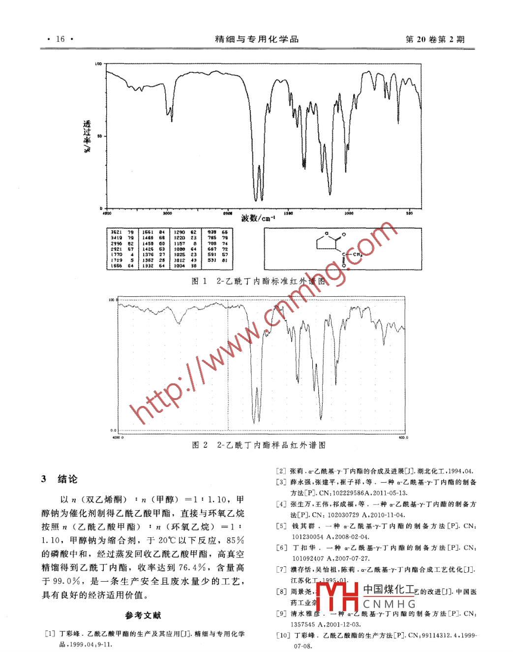 第20卷第2期精細與專用化學品Feb.20122012年2月Fine and Specialty Chemicals13.四用科技雙乙烯酮法合成乙酰丁內(nèi)酯的研究姚俊生',丁揚2, 石春明1(1.南通醋酸化工股份有限公司,江蘇南通226009;2.大連理工大學化工與環(huán)境生命學部,遼寧大連116024)摘要:以雙乙烯酮為原料催化合成乙酰乙酸甲酯,再與環(huán)氧乙烷在堿性條件下縮合反應合成乙酰丁內(nèi)酯??疾炝舜呋瘎A/酸的種類等因素對產(chǎn)物收率的影響,優(yōu)化了反應工藝。關鍵詞:雙乙烯酮;環(huán)氧乙烷;乙酰丁內(nèi)酯Study on synthesis of 2-acetylbutyrolactone based on diethylene ketoneYAO Jun-sheng',DING Yang”, SHI Chun-ming'(1. Nantong Acetic Acid Co. Ltd. ,Nantong 226009,China;2. Faculty of Chemical, Environmental and Biological Science and Technology,Dalian University of Technology, Dalian 116024,China)Abstract: 2- Acetylbutyrolactone was synthesized based on diethylene ketone by esterification with Methanol,and then condensation with epoxy ethane under the condition of alkaline. The influence factor, such as the varie-ty of catalyst, alkaline and acid, was studied, and the the whole process of reaction was optimized.Key words: diethylene ketone; epoxy ethane; 2-acetylbutyrolactone乙酰丁內(nèi)酯是a-乙?;?r丁內(nèi)酯的簡稱,具第二種方法以乙酰乙酸乙酯為原料,水作溶有類似酯的氣味的淺色液體,熔點-12~-13°C, 沸劑,加人環(huán)氧乙烷,滴加氫氧化鈉進行縮合反應,點142~ 143C (4kPa), 107~ 108C (667Pa),然后酸中和、苯萃取、負壓精餾回收乙酰乙酸乙酯96C (0. 4kPa),相對密度1. 1846 (20/4C), 折和乙酰丁內(nèi)酯0。國內(nèi)企業(yè)曾規(guī)?;a(chǎn),但是存射率1.4562, 閃點110C,水中溶解度為20%,在著產(chǎn)品收率低,工業(yè)化生產(chǎn)收率只有50%,廢水在該品中溶解度為12%。與鐵接觸時溶液呈藍水量大的缺點,最終被迫放棄生產(chǎn)。以此方法為基至淺藍紫色。在醫(yī)藥中主要用于維生素B、的合成,礎,日本大賽璐公司作了改進[9:以乙酰乙酸甲酯也用于合成3,4二取代吡啶和5- (β羥乙基) -4-為原料,甲醇為溶劑,加入環(huán)氧乙烷,以甲醇~氫甲基噻唑和葉綠素。近年來,在精細化工合成中也氧化鈉為縮合劑。據(jù)報道收率達70%。但由于收有新的用途1。合成乙酰丁內(nèi)酯的方法有兩種印:第一種方法率不是很高,廢水量大,因而產(chǎn)品競爭力較弱。是以r丁內(nèi)酯和乙酸乙酯為原料制得。該方法須為了降低生產(chǎn)成本,我們采用雙乙烯酮和醇催用大量甲苯作為溶劑和金屬鈉作縮合劑。這種方法化反應后生成乙酰乙酸甲酯直接和環(huán)氧乙烷反應制的缺點是生產(chǎn)過程中使用金屬鈉和產(chǎn)生氫氣而存在得產(chǎn)品,此種方法未見文獻報道。本文通過雙乙烯著安全風險,同時產(chǎn)生大量的甲苯和乙酸乙酯混合酮酯化反應后直接合成乙酰丁內(nèi)酯,考察了催化劑物,沒有經(jīng)濟使用價值。目前國內(nèi)采用該工藝生種類,縮合劑中國煤化工物料配比等產(chǎn)[3~刀],國外早已淘汰。因索對合成乙YHCNMHG收稿日期: 2011 -01 - 12作者簡介:姚俊生,工程師,從事化工產(chǎn)品研究開發(fā)20多年,有多項成果獲江蘇省、南通市科技進步獎,多項發(fā)明專利獲得授權(quán)。●14●精細與專用化學品第20卷第2期反應原理:H2C-C一-O+CH:OH一→CHs COCH2 COOCHH2C-C- -OCHsCO、CH3COCH2COOCHs + NaOCHs 一HC Na+ HOCH3CHzOOCCH,COCH2- - -0HC Na +CH2- CH:→=0+CH,OHCH:一CCH3OOCNa+ COCH3Na+ COCH3.COCHsCH2CCH一- CH=0+ H,PO,- ◆C-0+ NaH2PO,CH--- -0CH2一-0~30°C,密閉保溫4h,補加環(huán)氧乙烷2g,繼續(xù)保1實驗部分溫5h反應結(jié)束。1.1儀器與試劑1.2.4 中和,蒸發(fā),萃取Agilent7820氣相色譜儀配氫火焰檢測器(美將縮合反應液冷卻到35C以下,用91g 85%國安捷倫公司); TJ270-30A紅外分光光度計(天的磷酸緩慢中和,中和時間約1h,過濾去除副產(chǎn)津光學儀器廠);品無水磷酸二氫鈉,濾液用水浴加熱,在80. 0kPa雙乙烯酮(南通醋酸化工股份有限公司生產(chǎn),下蒸發(fā)甲醇。當釜溫達到60C時蒸發(fā)結(jié)束,冷卻,98%);無水乙醇(AR,國藥試劑);氫氧化鈉加甲苯30g攪拌,靜置,分層。上層油層為粗產(chǎn)(AR,國藥試劑);甲醇(AR, 國藥試劑);環(huán)氧.品,下層水層分別用甲苯50g,20g 萃取分層兩次,,乙烷(工業(yè)級);磷酸(AR,國藥試劑);硫酸分層萃取溫度保持在40C以下,水層棄去,油層(AR,國藥試劑);甲醇鈉(工業(yè)級,江蘇森萱醫(yī)合并到粗產(chǎn)品中。用蒸餾塔在85kPa下蒸餾脫水和回收甲苯(回流比1~6)。當塔釜溫度達到藥化工有限公司,29. 5%)。120°C后,蒸餾結(jié)束。冷卻到35C以下過濾除鹽,1.2 乙酰丁內(nèi)酯的合成粗酯供精餾。回收甲苯用50mLX2水洗滌后套用。1.2.1 乙酰乙酸甲酯的合成C10]在帶有攪拌器、加熱器、回流冷凝器的三口燒瓶回收甲醇進行精餾提濃脫去雜質(zhì)后含量大于99%,套用到酯化反應。中,加人1.1mol(35.2g)甲醇和0.02mol催化劑,升溫1.2.5 精餾回流,滴加1mol(84g)雙乙烯酮,滴加完保溫1h,分析粗酯在真空度大于95kPa下精餾回收乙酰乙.雙乙烯酮小于0. 01%,直接用于下步反應。酸甲酯。當釜中溫度達到125C后將其真空度提高1.2.2 原料配制到99. 3kPa繼續(xù)脫低沸物,此時回流比大于5。頂(1) NaOH- CH3OH溶液溫達到70°C時脫低沸物結(jié)束(得到低沸物要重新將1800g甲醇加人5000mL三口反應瓶中,在精餾回收乙酰乙酸甲酯,其含量大于95%,套用水冷卻下將含量99%的氫氧化鈉325g慢慢加人反到縮合反應),最后用不低于99. 3kPa的高真空度應瓶中,攪拌全溶