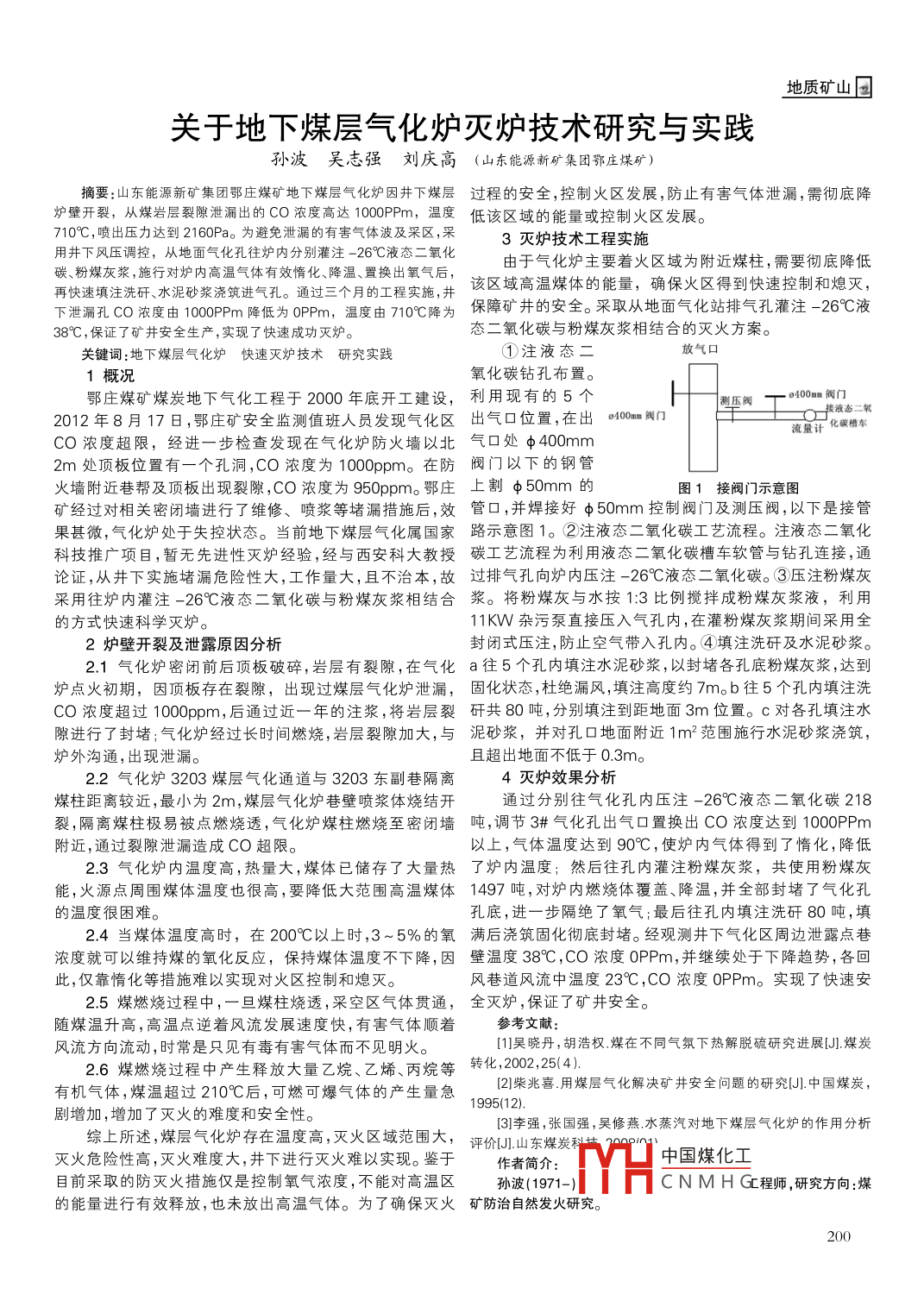 地質(zhì)礦山國關(guān)于地下煤層氣化爐滅爐技術(shù)研究與實(shí)踐孫波吳志強(qiáng)劉慶高(山東 能源新礦集團(tuán)鄂莊煤礦)摘要:山東能源新礦集團(tuán)鄂莊煤礦地下煤層氣化爐因井下煤層過程的安全 ,控制火區(qū)發(fā)展,防止有害氣體泄漏,需徹底降爐壁開裂,從煤巖層裂隙泄漏出的CO濃度高達(dá)1000PPm,溫度低該區(qū)域的能量或控制火區(qū)發(fā)展。710°C, ,噴出壓力達(dá)到2160Pa。為避免泄漏的有害氣體波及采區(qū),采3滅爐技術(shù)工程實(shí)施用井下風(fēng)壓調(diào)控,從地面氣化孔往爐內(nèi)分別灌注-26°C液態(tài)二氧化由于氣化爐主要著火區(qū)域?yàn)楦浇褐枰獜氐捉档吞?、粉煤灰漿,施行對爐內(nèi)高溫氣體有效惰化、降溫.置換出氧氣后,該區(qū)域高溫煤體的能量,確?;饏^(qū)得到快速控制和熄滅,再快速填注洗研水泥砂漿澆筑進(jìn)氣孔。通過三個(gè)月的工程實(shí)施,井保障礦井的安全。采取從地面氣化站排氣孔灌注- 26°C液下泄漏孔CO濃度由1000PPm降低為0PPm,溫度由710°C降為38°C,保證了礦井安全生產(chǎn),實(shí)現(xiàn)了快速成功滅爐。態(tài)二氧化碳與粉煤灰漿相結(jié)合的滅火方案。關(guān)鍵詞:地下煤層氣化爐快速滅爐 技術(shù)研究實(shí)踐①注液態(tài)二放氣口1概況氧化碳鉆孔布置。鄂莊煤礦煤炭地下氣化工程于2000年底開工建設(shè),利用現(xiàn)有的5個(gè)測壓閥- o400mn閥門or接液態(tài)二氧2012年8月178 ,鄂莊礦安全監(jiān)測值班人員發(fā)現(xiàn)氣化區(qū)出氣口位置,在出 0100m 閥門-流量計(jì)化碳槽車CO濃度超限,經(jīng)進(jìn)一步檢查發(fā)現(xiàn)在氣化爐防火墻以北氣口 處φ400mm2m處頂板位置有一個(gè)孔洞,CO濃度為1000ppm。在防閥門以下 的鋼管火墻[附近巷幫及頂板出現(xiàn)裂隙,CO濃度為950ppm。鄂莊上割φ50mm的圖1接閥門示意圖礦經(jīng)過對相關(guān)密閉墻進(jìn)行了維修、噴漿等堵漏措施后,效管口,并焊接好φ50mm控制閥門及測壓閥,以下是接管果甚微,氣化爐處于失控狀態(tài)。當(dāng)前地下煤層氣化屬國家路示意圖 1。②注液態(tài)二氧化碳工藝流程。注液態(tài)二氧化科技推廣項(xiàng)目,暫無先進(jìn)性滅爐經(jīng)驗(yàn),經(jīng)與西安科大教授碳工藝流程為利用液態(tài)二氧化碳槽 車軟管與鉆孔連接,通論證,從井下實(shí)施堵漏危險(xiǎn)性大,工作量大,且不治本,故過排氣孔向爐內(nèi)壓注-26°C液態(tài)二氧化碳。③壓注粉煤灰采用往爐內(nèi)灌注-26C液態(tài)二氧化碳與粉煤灰漿相結(jié)合漿。將粉煤灰與水按1:3比例攪拌成粉煤灰漿液,利用的方式快速科學(xué)滅爐。11KW雜污泵直接壓入氣孔內(nèi),在灌粉煤灰漿期間采用全2爐壁開裂及泄露原因分析封閉式壓注,防止空氣帶入孔內(nèi)。④填注洗矸及水泥砂漿。2.1氣化爐密閉前后頂板破碎,巖層有裂隙,在氣化a往5個(gè)孔內(nèi)填注水泥砂漿,以封堵各孔底粉煤灰漿,達(dá)到爐點(diǎn)火初期,因項(xiàng)板存在裂隙,出現(xiàn)過煤層氣化爐泄漏,固化狀態(tài) ,杜絕漏風(fēng),填注高度約7m。b往5個(gè)孔內(nèi)填注洗CO濃度超過1000ppm,后通過近一年的注漿,將巖層裂矸共80噸,分別填注到距地面3m位置。c對各孔填注水隙進(jìn)行了封堵;氣化爐經(jīng)過長時(shí)間燃燒,巖層裂隙加大,與泥砂漿,并對孔0地面附近1m2范圍施行水泥砂漿澆筑,爐外溝通,出現(xiàn)泄漏。且超出地面不低于0.3m。2.2氣化爐3203煤層氣化通道與3203東副巷隔離4滅爐效果分析煤柱距離較近,最小為2m,煤層氣化爐巷壁噴漿體燒結(jié)開通過分別往氣化孔內(nèi)壓注- -26°C液態(tài)二 氧化碳218裂,隔離煤柱極易被點(diǎn)燃燒透,氣化爐煤柱燃燒至密閉墻噸,調(diào)節(jié) 3#氣化孔出氣口置換出CO濃度達(dá)到1000PPm附近,通過裂隙泄漏造成CO超限。以上,氣體溫度達(dá)到90°C,使?fàn)t內(nèi)氣體得到了惰化,降低2.3 氣化爐內(nèi)溫度高, 熱量大,煤體已儲(chǔ)存了大量熱了爐內(nèi)溫度;然后往孔內(nèi)灌注粉煤灰漿,共使用粉煤灰能,火源點(diǎn)周圍煤體溫度也很高,要降低大范圍高溫煤體1497 噸,對爐內(nèi)燃燒體覆蓋、降溫,并全部封堵了氣化孔的溫度很困難。孔底,進(jìn)-步隔絕了氧氣;最后往孔內(nèi)填注洗矸80噸,填.2.4當(dāng)煤體溫度高時(shí),在200C以上時(shí),3~5%的氧滿后澆筑固化徹底封堵。經(jīng)觀測井下氣化區(qū)周邊泄露點(diǎn)巷濃度就可以維持煤的氧化反應(yīng),保持煤體溫度不下降,因壁溫度38°C,CO濃度0PPm,并繼續(xù)處于下降趨勢,各回此,僅靠惰化等措施難以實(shí)現(xiàn)對火區(qū)控制和熄滅。風(fēng)巷道風(fēng)流中溫度23°C,CO濃度0PPm。實(shí)現(xiàn)了快速安2.5煤燃燒過程中,一旦煤柱燒透,采空區(qū)氣體貫通,全滅爐 ,保證了礦井安全。隨煤溫升高,高溫點(diǎn)逆著風(fēng)流發(fā)展速度快,有害氣體順著參考文獻(xiàn):風(fēng)流方向流動(dòng),時(shí)常是只見有毒有害氣體而不見明火。[1]吳曉丹,胡浩權(quán).煤在不同氣氛下熱解脫硫研究進(jìn)展[JI煤炭2.6煤燃燒過程中產(chǎn)生釋放大量乙烷、乙烯、丙烷等轉(zhuǎn)化,2002,25(4).有機(jī)氣體,煤溫超過210°C后,可燃可爆氣體的產(chǎn)生量急1995(12).[2]柴兆喜.用煤層氣化解決礦井安全問題的研究[J].中國煤炭,劇增加,增加了滅火的難度和安全性。[3]李強(qiáng),張國強(qiáng),吳修燕.水蒸汽對