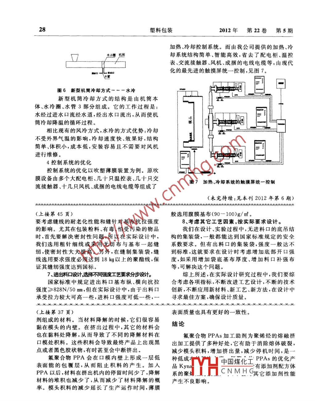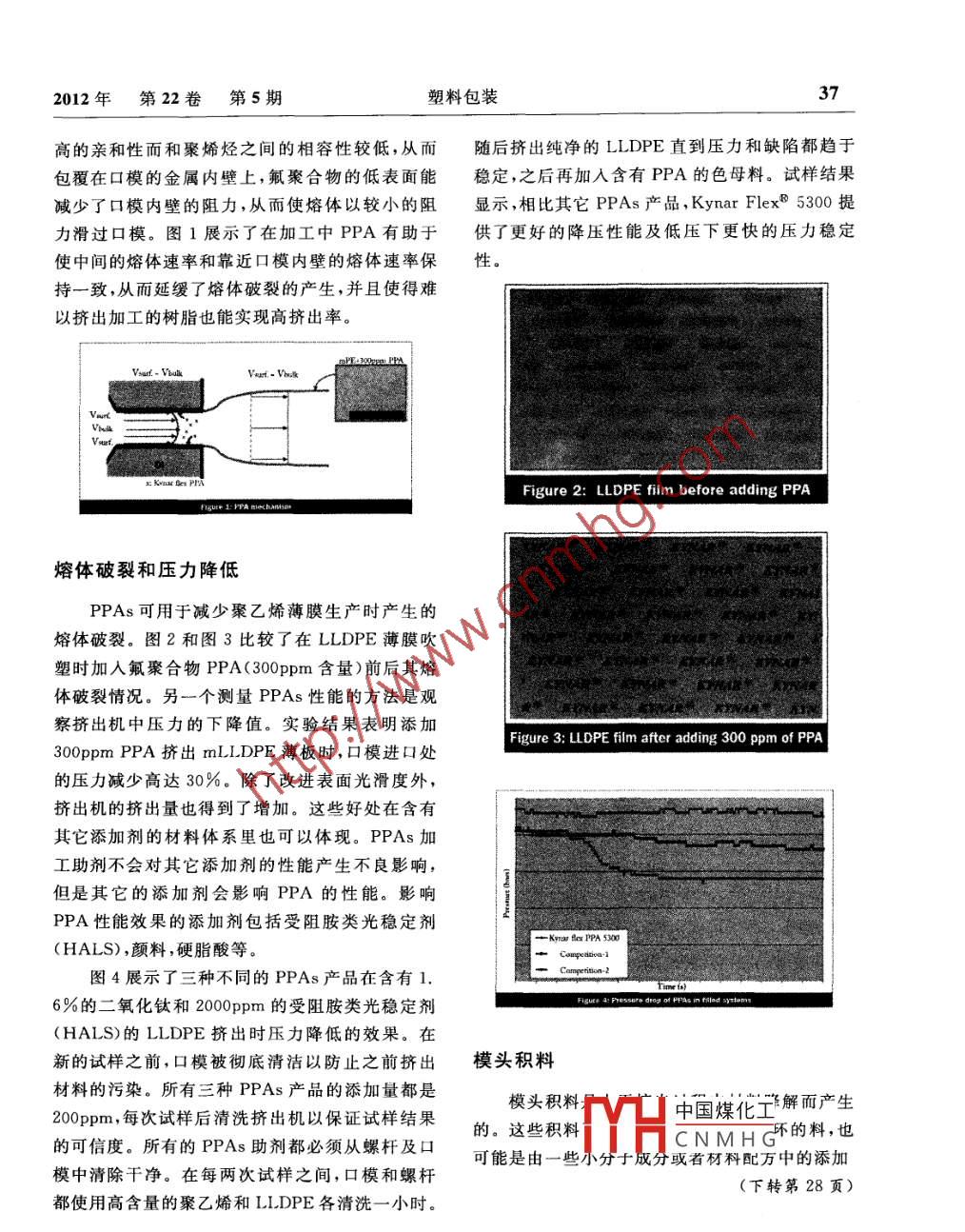 36塑料包裝2012年第22卷第5期Kynar氟聚合物在聚烯烴薄膜加工中的應(yīng)用提高產(chǎn)量,減少停機(jī)時(shí)間余磊阿科瑪(中國(guó))投資有限公司力,延遲了模頭積料的產(chǎn)生,有助于更快的生產(chǎn)切換和啟動(dòng),從而提高了生產(chǎn)力,改善了產(chǎn)品外觀,減少了待料時(shí)間并且節(jié)約了能量。在擠出薄膜時(shí),加工助劑PPAs的使用允許使用較窄的口模間隙,從而使薄膜獲得更好的性能平衡。這些優(yōu)點(diǎn)可以在多種擠出加工中體現(xiàn)出來,比如管道,細(xì)絲,電線電纜的擠出,另外還有吹塑成型。有兩種類型的偏氟乙烯/六氟丙烯(VF2/HFP)聚合物產(chǎn)品可以用作PPAs(聚合物加工助劑),即氟聚合物及氟彈性體。其中氟聚合物加工助劑是基于聚偏二氟乙烯(PVDF)和VF2/HFP樹脂的聚合物,它的HFP含量低于13%。另外一種氟彈性體加工助劑,它的HFP含量比氟聚合物加工助劑高,從而增加了成本并且需要使用分配劑。在 LLDPE加工中使用氟聚合物加工助劑能夠獲得和氟彈性體助劑一樣好的性能。氟聚合物加工助劑為聚烯烴加工帶來的同等甚至更好的性能,加上其更低的生產(chǎn)成本,使它成為氟彈性體加氟聚合物是一種用于聚烯烴熔融擠出,特別工助劑的優(yōu)秀的替代品是薄膜吹塑應(yīng)用的有效加工助劑。本文介紹了氟聚合物家族中特有的氟聚合物系列產(chǎn)品PVDF以PPA工作機(jī)理及PVDF/HFP共聚物,作為加工助劑用在薄膜擠在熔融加工過程中,較窄的口模間隙和高擠出及其它應(yīng)用上的優(yōu)點(diǎn)及高效性能。出速率會(huì)產(chǎn)生高剪切率。擠出時(shí)高剪切率加上口氟聚合物加工助劑(PPAs)有助于聚烯烴以模內(nèi)壁H中國(guó)煤化工力。含有茂金屬及其它聚合物的擠出加工,尤其顯著的是它可以的線性CNMHG樹脂有較窄的減少線性低密度聚乙烯( LLDPE)薄膜加工中產(chǎn)生分子量分布,另外即使在低擠出速率下其熔體應(yīng)的熔體破裂。PPAs加工助劑減少了加工工藝壓力仍然較高。PPA加工助劑由于和金屬之間有較2012年第22卷第5期塑料包裝37高的親和性而和聚烯烴之間的相容性較低,從而隨后擠出純凈的 LLDPE直到壓力和缺陷都趨于包覆在口模的金屬內(nèi)壁上,氟聚合物的低表面能穩(wěn)定,之后再加入含有PPA的色母料。試樣結(jié)果減少了口模內(nèi)壁的阻力,從而使熔體以較小的阻顯示,相比其它PPAs產(chǎn)品, Kynar Flex.5300提力滑過口模。圖1展示了在加工中PPA有助于供了更好的降壓性能及低壓下更快的壓力穩(wěn)定使中間的熔體速率和靠近口模內(nèi)壁的熔體速率保性。持一致,從而延緩了熔體破裂的產(chǎn)生,并且使得難以擠出加工的樹脂也能實(shí)現(xiàn)高擠出率。E kax Be plAFigure 2: LLDPE film before adding PPA熔體破裂和壓力降低PPAs可用于減少聚乙烯薄膜生產(chǎn)時(shí)產(chǎn)生的熔體破裂。圖2和圖3比較了在 LLDPE薄膜吹塑時(shí)加入氟聚合物PPA(300ppm含量)前后其熔體破裂情況。另一個(gè)測(cè)量PPAs性能的方法是觀察擠出機(jī)中壓力的下降值。實(shí)驗(yàn)結(jié)果表明添加Figure 3: LLDPE film after adding 300 ppm of PPA300 ppm PPA擠出 mLlDPE薄板時(shí),口模進(jìn)口處的壓力減少高達(dá)30%。除了改進(jìn)表面光滑度外擠出機(jī)的擠出量也得到了增加。這些好處在含有其它添加劑的材料體系里也可以體現(xiàn)。PPAs加工助劑不會(huì)對(duì)其它添加劑的性能產(chǎn)生不良影響,但是其它的添加劑會(huì)影響PPA的性能。影響PPA性能效果的添加劑包括受阻胺類光穩(wěn)定劑Kwar Aer PPA 5000(HALS),顏料,硬脂酸等。圖4展示了三種不同的PPAs產(chǎn)品在含有16%的二氧化鈦和2000ppm的受阻胺類光穩(wěn)定劑(HAIS)的 LLDPE擠出時(shí)壓力降低的效果。在新的試樣之前,口模被徹底清潔以防止之前擠出模頭積料材料的污染。所有三種PPAs產(chǎn)品的添加量都是模頭積料200ppm,每次試樣后清洗擠出機(jī)以保證試樣結(jié)果中國(guó)煤化工解而產(chǎn)生的。這些積料環(huán)的料,也的可信度。所有的PPAs助劑都必須從螺桿及口可能是由一些CHaCNMH或省砑科配萬中的添加模中清除干凈。在每?jī)纱卧嚇又g,口模和螺桿(下轉(zhuǎn)第28頁)都使用高含量的聚乙烯和 LLDPE各清洗一小時(shí)。28塑料包裝2012年第22卷第5期加熱、冷卻控制系統(tǒng)。而由我公司提供的加熱、冷卻系統(tǒng)結(jié)構(gòu)簡(jiǎn)單、智能高效,省去了配電柜、溫控表、交流接觸器、風(fēng)機(jī)、成捆的電線電纜等,由現(xiàn)代化的最先進(jìn)的觸摸屏統(tǒng)一控制,見圖7。圖6新型機(jī)筒冷卻方式一--水冷新型機(jī)筒冷卻方式的結(jié)構(gòu)是由機(jī)筒本體、水冷圈、水管3部分組成。它的工作過程是:水經(jīng)過進(jìn)水口流經(jīng)水道,經(jīng)出水口流出,從而使機(jī)筒冷卻降溫的循環(huán)過程。相比現(xiàn)有的風(fēng)冷方式,水冷的方式優(yōu)勢(shì):冷卻不受外界氣溫的影響,冷卻速度快、效果好,結(jié)構(gòu)簡(jiǎn)單、體積小,成本低,安裝容易且不需要對(duì)風(fēng)機(jī)進(jìn)行維修。4控制系統(tǒng)的優(yōu)化控制系統(tǒng)的優(yōu)化以吹塑薄膜裝置為例。原吹膜設(shè)備由多個(gè)大配電柜、幾十只溫控表、幾十只交流接觸器、十幾只風(fēng)機(jī)、成捆的電線電纜等組成了圖7加熱、冷卻系統(tǒng)的觸摸屏統(tǒng)一控制(未完待續(xù):