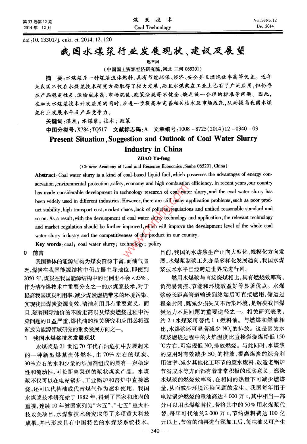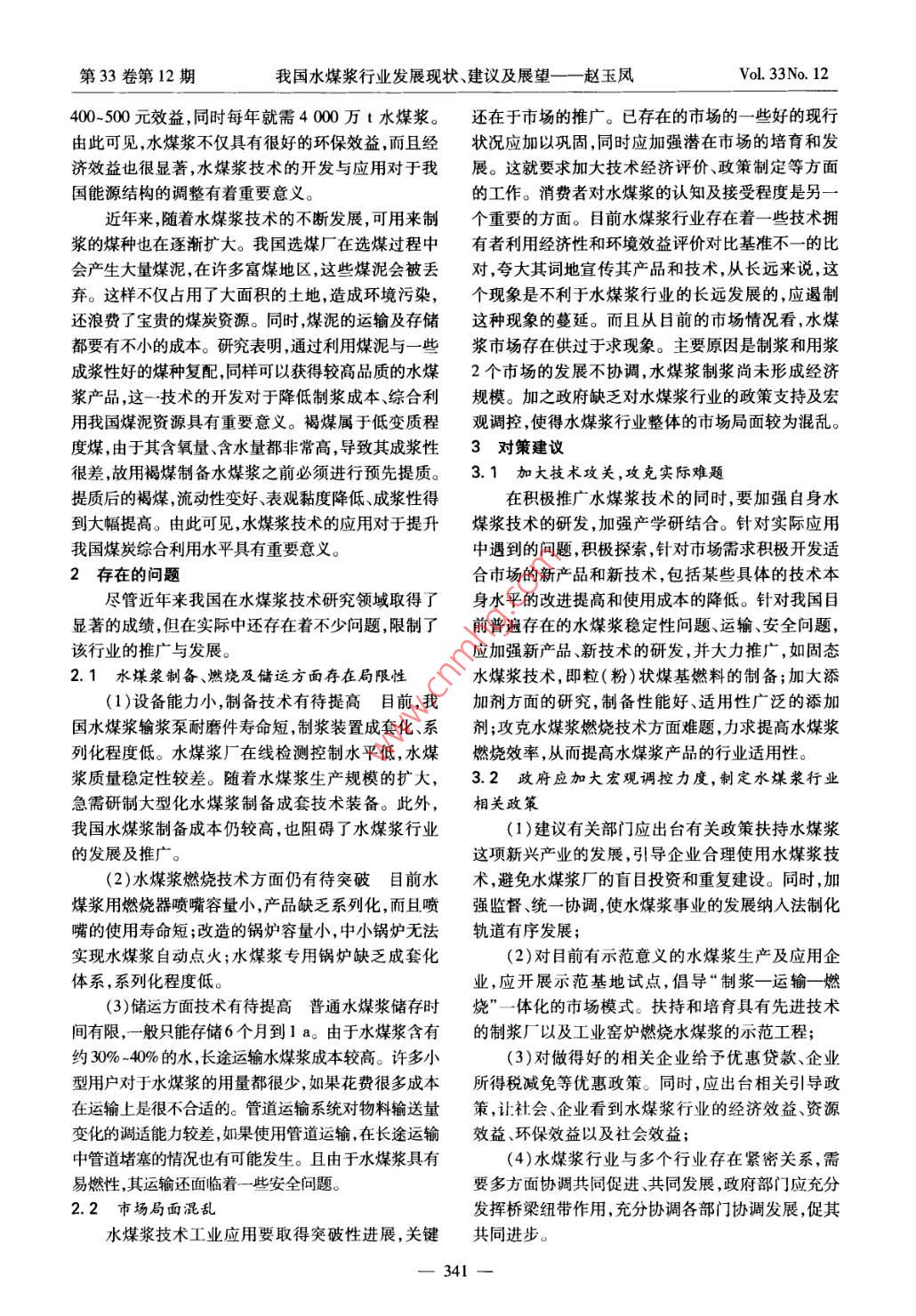 第33卷第12期煤炭技術(shù)Vol. 33No. 122014年12月Coal TechnologyDec. 2014li:10.13301/j.cnki.ct.2014.12.120我國水媒漿行業(yè)發(fā)展現(xiàn)狀、建議及長望趙玉鳳(中國國土資源經(jīng)濟(jì)研究院,河北三河065201)摘要:水煤漿是一種煤基流體燃料,具有節(jié)能環(huán)保、經(jīng)濟(jì)、安全并且燃燒效率高等優(yōu)點(diǎn)。近年來我國不僅在水煤漿技術(shù)研究方面取得了較大發(fā)展,而且水煤漿在工業(yè)上已有了廣泛應(yīng)用,但仍存在產(chǎn)品穩(wěn)定性差、運(yùn)輸成本高、市場混亂、政策法規(guī)等不健全、缺乏統(tǒng)一合理的標(biāo)準(zhǔn)等問題。因此,在加大水煤漿技術(shù)開發(fā)應(yīng)用的同時(shí),應(yīng)進(jìn)一步提高和完善相關(guān)技術(shù)及市場規(guī)范,從而提高我國水煤漿行業(yè)發(fā)展水平及產(chǎn)品競爭力。關(guān)鍵詞:煤炭;水煤漿;技術(shù);政策中圖分類號:X784;TQ517文獻(xiàn)標(biāo)志碼:A文章編號:1008-8725(2014)12-0340-03Present Situation, Suggestion and Outlook of Coal Water SlurryIndustry in ChinaZHAO Yu-fengChinese Academy of Land and Resource Economics, Sanhe 065201, China)Abstract: Coal water slurry is a kind of coal-based liquid fuel, which possesses the advantages of energy con-servation, environmental protection, safety, economy and high combustion efficiency. In recent years, our counthas made considerable development in technology research of coal water slurry, and the coal water slurry hasbeen widely used in different industries. However, there are still many application problems, such as poor product stability, high transport cost, market chaos, lack of policies, regulations and unified reasonable standard andso on. As a result, with the development of coal water slurry technology and application, the relevant technologyand market regulation should be further improved, which will improve theopment level of the whole coalwater slury industry and the competitiveness of the product in our country.Key words: coal; coal water slurry; technology policy0前言目前,我國的水煤漿生產(chǎn)正向大型化、規(guī)?;较虬l(fā)我國整體的能源結(jié)構(gòu)為煤炭資源豐富,而油氣匱展,水煤漿制漿工藝亦呈多樣化發(fā)展趨向,我國水煤乏,煤炭在我國能源結(jié)構(gòu)中仍占據(jù)主導(dǎo)地位即使到漿技術(shù)水平已經(jīng)跨進(jìn)世界先進(jìn)行列。2050年,煤炭在我國能源結(jié)構(gòu)中的比例也不會<35%。燃用水煤漿與直接燒煤相比,具有燃燒效率高、作為潔凈煤技術(shù)中重要分支之一的水煤漿技術(shù),對于負(fù)荷易調(diào)控、節(jié)能和環(huán)境效益好等顯著優(yōu)點(diǎn)。水煤提高我國煤炭利用率、減少煤炭燃燒帶來的環(huán)境污染、漿經(jīng)長距離管道輸送到終端后可直接燃用,儲運(yùn)過實(shí)現(xiàn)我國煤炭資源髙效、清潔利用具有重要意義。而程全封閉,既減少損失又不污染環(huán)境,是解決我國煤且,隨著國際油價(jià)的不斷走高以及煤炭燃燒過程中污炭運(yùn)力不足問題的重要途徑之一。相關(guān)研究表明染問題的日益嚴(yán)重煤代油的相關(guān)研究和應(yīng)用必將逐約2t水煤漿可替代1t燃料油。與燃煤和燃油相漸成為能源領(lǐng)域研究的重要發(fā)展方向之一。比,水煤漿還可顯著減少NO,的排放。這是因?yàn)樗覈簼{技術(shù)發(fā)展現(xiàn)狀煤漿燃燒過程中的火焰溫度比直接燃燒煤粉低150水煤漿是21世紀(jì)70年代石油危機(jī)中發(fā)展起來℃左右,可實(shí)現(xiàn)低NO排放燃燒。與此同時(shí),水煤漿的一種新型煤基流體燃料,由70%左右的煤炭、的應(yīng)用對有效減少SO2的排放、提高煤炭的綜合利30%左右的水和少量的添加劑組成的具有一定穩(wěn)定用效率減少其他化工環(huán)節(jié)的廢水廢料、改造老鍋爐性和流動性、可長距離泵送的漿狀煤炭產(chǎn)品。水煤節(jié)省成本等方面都有著非常積極的現(xiàn)實(shí)意義。燃燒漿不僅可以在電站鍋爐、工業(yè)鍋爐和窯爐中直接燃水煤漿的燃燒效率高,在相同的熱量下可減少燃煤燒,還可以代替油或代替煤氣作為燃料使用。我國量,從而減少環(huán)境污染問題的發(fā)生。我國每年用于水煤漿技術(shù)研究始于1982年,得到了國家和政府的電站鍋爐燃燒的重油高達(dá)4000萬t,其中相當(dāng)一部重視,連續(xù)10年被國家列為“六五”、“七五”重大科分可以用水煤漿替代,若將其中的50%用水煤漿代技攻關(guān)項(xiàng)日,水煤漿技術(shù)研究取得了多項(xiàng)重大科技替每年可代油約200萬t,節(jié)約燃料費(fèi)達(dá)100億成果,并已形成具有中國特色的水煤漿系統(tǒng)技術(shù)。元以上,節(jié)省的油再進(jìn)行深加工后,每噸油又可產(chǎn)生第33卷第12期我國水煤漿行業(yè)發(fā)展現(xiàn)狀建議及展望—一趙玉鳳Vol. 33 No. 12400-500元效益,同時(shí)每年就需4000萬t水煤漿。還在于市場的推廣。已存在的市場的一些好的現(xiàn)行由此可見,水煤漿不僅具有很好的環(huán)保效益,而且經(jīng)狀況應(yīng)加以鞏固,同時(shí)應(yīng)加強(qiáng)潛在市場的培育和發(fā)濟(jì)效益也很顯著,水煤漿技術(shù)的開發(fā)與應(yīng)用對于我展。這就要求加大技術(shù)經(jīng)濟(jì)評價(jià)、政策制定等方面國能源結(jié)構(gòu)的調(diào)整有著重要意義。的工作。消費(fèi)者對水煤漿的認(rèn)知及接受程度是另一近年來,隨著水煤漿技術(shù)的不斷發(fā)
