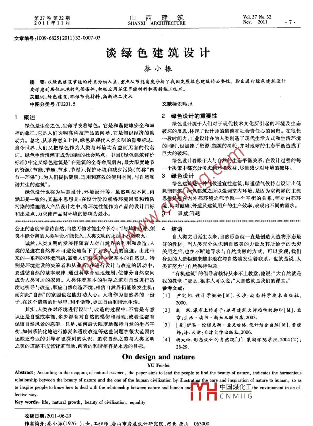 第37卷第32期山西建筑Vol.37 No. 322011年11月SHANXI ARCHTTECTURENov.2011文章編號:1009-6825 (2011 )32-0006-02設(shè)計與自然余菲菲摘要:通過描繪自然本色,旨在引導(dǎo)人們?nèi)グl(fā)現(xiàn)自然之美;通過論述自然對人類的關(guān)照和啟示,說明了自然之美與人類文明之美是相容相通的,從而啟示人們?nèi)绾稳フ_地處理人與自然的關(guān)系,如何去對環(huán)境進行有效地設(shè)計與改造。關(guān)鍵詞:生命,自然生長,文明之美,平等中圖分類號:TU-021文獻標(biāo)識碼:A大自然是我們賴以生存的環(huán)境,無論是在過去還是在物質(zhì)文人類也是自然萬物的一份子。通過與自然的交流、溝通、對明飛速發(fā)展的今天,我們都應(yīng)該去認(rèn)真地體昧自然之美,尊重自話,人類從自然界 得到很多啟示,并且將這些啟示運用到人的生然之美。在人類進行設(shè)計創(chuàng)造的活動中,不應(yīng)該過度地破壞和開產(chǎn) 和生活中來。人們喜歡水的無色和透明,那么現(xiàn)在無所不用的發(fā)自然資源,應(yīng)遵循自然給我們的關(guān)照和啟示,科學(xué)合理地去建玻璃材料是否 與其有相通之處。自然界除了在材料或物質(zhì)的使設(shè)更加和諧的宜居家園。用上眷顧人類外還給人類以形式美的啟發(fā):植物的干與枝,花與1發(fā)現(xiàn)自然之美 .葉,以及動物的軀干與四肢(或異)提示著我們關(guān)于“主從”問題的自然所蘊含的一切,遠遠超過了我們所知所學(xué);而我們認(rèn)真存在;蜘蛛網(wǎng)蜂窩等由于有規(guī)律地重復(fù)出現(xiàn)或有秩序的變化,激所學(xué)的,在自然的世界里都能找到對應(yīng)。小到一片單葉,再到葉發(fā)了人們的美感,從而出現(xiàn)了韻律美;物質(zhì)世界的有機統(tǒng)-性向與枝、干的組合;微觀到葉片的網(wǎng)狀脈絡(luò),宏觀到森林群落乃至整我們展示著秩序與變化的關(guān)系...人類的舞蹈、繪畫及其他-切個地球和宇宙。自然界無處不在地向我們展示它的美,它的生造型藝術(shù)無不遵循著這些美學(xué)原則。機。有機的,無機的,人類的定義給了他們“生物”與“非生物”的2.2 自然對造型活 動的引導(dǎo)區(qū)別。然而在有些人心里,自然萬物都是有生命的。而且只有那在建筑的造型活動領(lǐng)域,建筑大師賴特喜歡從大自然擷取靈些所謂的“非生物”與“生物"交相呼應(yīng)時,我們眼前的景致才變得感 ,如達納之家的藝術(shù)玻璃圖案就是從鹽膚木( Sumac)的植物形如此生動鮮明。試問,石頭與小草相依為伴,是小草增色了石頭,態(tài)而來。 柯布西埃的朗香教堂的屋頂造型就是來自“帆”“漁民還是石頭給了小草依靠。自然界給了我們無窮的美的享受,我們帽" 及“蟹殼"的形態(tài)類比??虏嘉靼Uf過,他的繪畫圖板上放著將由自然啟發(fā)而來的規(guī)律重新運用到自然的材料上,以形成更多的蟹殼“ 變成"他在朗香教堂上的屋頂。另外,一- 些生物體的形體新的視覺形象, ,不斷豐富著人類的視野。自然促使人類拿起筆和構(gòu)成也啟發(fā)人們?nèi)パ芯啃碌漠a(chǎn)品結(jié)構(gòu)和發(fā)明新的產(chǎn)品:如自然界.紙去作畫,畫山水、花鳥、風(fēng)景等等。因為人類無法將自然收于囊的核桃 貝殼、鳥類的卵等對薄殼建筑結(jié)構(gòu)形式的啟發(fā);蜻蜓等鳥中,則采取了這種方寸之上顯其精神的辦法。自從有了“畫”之類對于 人類發(fā)明飛行器的貢獻....在關(guān)注我們戶外生存環(huán)境的后,人們就用“景致如畫”來形容自然風(fēng)景的美。其實自然界原本景觀設(shè)計領(lǐng)城, 自然之美的體現(xiàn)更是無處不在。人們懂得硬質(zhì)的就是自個兒作畫的,只不過這“畫”作于自然、現(xiàn)于自然、留于自道路在野草的掩映下更 顯生趣,堅持廣袤的稻田景觀也可以進入然;這“畫”遵循自然生長法則,在萬維的空間里自然生長萬象。大學(xué)校園;起伏的地形和自由的水體帶來自然柔和的線條體驗,看那湖中的倒影,誰能說它不是一幅出自天公之手的絕妙的水墨植被 與小品相映成趣,渾然天成。人類在營造自身生存環(huán)境的時畫;還有那深邃而色彩斑斕的海底,當(dāng)陽光穿過冰層的縫隙灑向候,注重自然物及其形態(tài)的表象層面的視覺效果,同時也在一定這個世界時,自然潑酒而成的“油畫”場景震撼人心。自然界到處程度 上向自然靠近,學(xué)習(xí)自然造物的規(guī)律?!熬爸氯绠嫛?硬要給它加個畫框的話,那就是人的心胸,人的眼2.3 自 然對設(shè)計科學(xué)的啟示界。自然給我們展示了它豐富的材質(zhì)、形態(tài)、色彩,使人們陶醉在人類向自然學(xué)習(xí),由最初的對自然形態(tài)的模仿,然后上升到.它四季變相的風(fēng)景中。有的人駐足在一朵五彩花前,欣賞它的恣抽象的思考。 之后,人們開始尋求自然形態(tài)的技術(shù)原理,用科學(xué)意綻放;有的人被一-片巖石的巖縫和紋路所吸引;有的人站在群的純理性的眼光進行研究。以科學(xué)的自然觀審視形態(tài),可以發(fā)現(xiàn)山的另一邊,看群山的起伏,看樹的點綴,看天空云朵與山峰的映許多令人嘆為觀止的規(guī)律:力學(xué)與形態(tài)的規(guī)律、結(jié)構(gòu)與形態(tài)的規(guī)...大自然給了人們這無限風(fēng)光,人們用不同的眼光去涉獵所需。律、數(shù)學(xué)與形態(tài)的規(guī)律等等,同時也催生出了許多新型