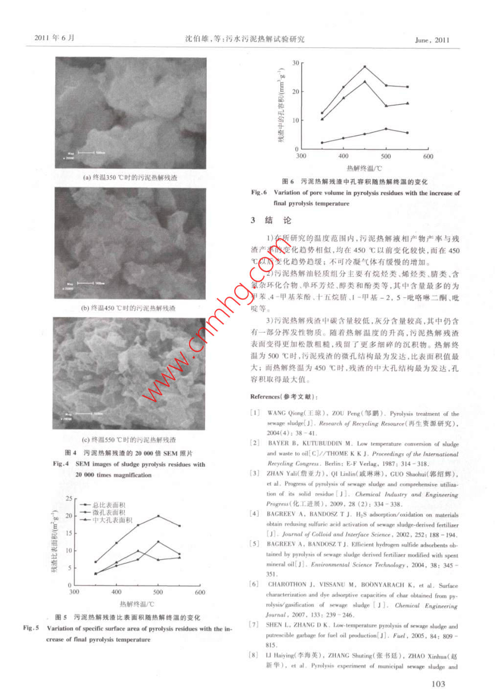 第11卷第3期妻金與境季Vol. 11 No. 32011年6月Joumal of Safety and EnvironmentJune, 2011文章編號:1009604(2011030100051試驗部分污水污泥熱解試驗研究1.1試驗原料與反應(yīng)流程沈伯雄,張增輝,陳建宏,郝曉翠,文姥試驗污泥取白天津巾某污水處理廠的消化污泥,含水率為7688%,在(105±5)℃條件下恒溫干燥24h,得到污泥干(南開大學(xué)環(huán)境科學(xué)與工程學(xué)院,天津30001)燥基。為使物料的敉度均勻,將污泥干燥基研磨至0.075pm以下。污泥熱解裝置為實驗室自制的固定床熱解爐,見圖1要:研究了熱解終溫對污水污泥熱解產(chǎn)物產(chǎn)率的影響,對污泥熱熱解條件:常壓,隔絕氧,無載氣,熱解終溫350~550℃解油中的輕質(zhì)組分進(jìn)行了分析并初步探討了污泥熱解疫渣的插本性每50℃設(shè)為1個試驗工況,升溫速率20℃/min,熱解終溫保質(zhì)。研究表明熱解終溫為40-500℃時,液相產(chǎn)物產(chǎn)率較高,隨著持時間為45min。熱解終溫的升高熱解殘渣減少的趨勢與液相產(chǎn)物增加的趨勢相似;1.2測試與分析方法450℃時得到的污泥熱解油的輕質(zhì)組分中主要含有烷烴類、烯烴類稱取污泥干爍基10.0g放入反應(yīng)器內(nèi),接通加熱裝置電類含氯雜環(huán)化合物和單環(huán)芳香烴等;隨著熱解終溫的升高,殘渣源開始試驗,熱解產(chǎn)生的氣體經(jīng)冷凝收集得到液體和不可冷表面越來越松散和粗糙:40℃時得到的熱解殘渣孔容積最大,面50凝氣體。液體的質(zhì)量通過試驗前后液相產(chǎn)物收集裝置的質(zhì)量℃時得到的殘渣微孔最為發(fā)達(dá),比表面積值最高。差獲得,熱解殘渣的質(zhì)尅通過試驗前后反應(yīng)器的質(zhì)量差得到關(guān)鬟惆:環(huán)境工程學(xué);污泥熱解;熱解油;輕質(zhì)組分;熱解殘渣根據(jù)質(zhì)量守恒計算氣體產(chǎn)生量。用二氯甲烷對污泥熱解液相中圖分類號:X705文獻(xiàn)標(biāo)識碼:A產(chǎn)物進(jìn)行萃取,提取熱解油中的有機組分然后在常壓下對其Do:103969/j.in.1006094.2011.03.025進(jìn)行蒸餾,收集沸點在300℃以下的餾分,冉利川氣質(zhì)聯(lián)用儀0引言(5890Cc-5971Ms)對其組分進(jìn)行測試。將污泥熱解殘渣研磨至0.075m以下,采用德國 Heraeus公司的Van-EL型元素污水污泥是用活性污泥法對污水進(jìn)行好氧生化處理中的分析儀測定殘渣CHN元素的含量;采用島津公司Ss-550型一種副產(chǎn)物其中含有大量的微生物細(xì)菌重金屬及合成有掃描電子顯徽鏡觀察熱解殘渣的表面形貌;采用美國Qumn機物處理不當(dāng)將會危害人體的健康及污染環(huán)境。目前,常用 hrome nova-2000全自動氣體吸附系統(tǒng)對污泥熱解殘渣的污泥處置方法主要有填埋、堆肥和焚燒但這些方式存在處的比表面積和孔結(jié)構(gòu)進(jìn)行測試。本文未研究不可冷凝氣體的理成本高,不能有效回收能量和造成嚴(yán)重的二次污染等問題。組成與性質(zhì)污泥熱解技術(shù)是在無氧環(huán)境下,把干燥的污泥加熱至一定溫度,在干餾和熱分解的作用下,使污泥轉(zhuǎn)化為熱解油、水、不可2結(jié)果與討論冷凝氣體(NCc)和熱解殘渣(焦炭)4種物質(zhì)l。其研究開始2.1熱解終溫對污泥熱解產(chǎn)物產(chǎn)率的影響于20世紀(jì)80年代,最早是由 Bayer2)提出來的。此技術(shù)工藝在污泥熱解過程中,影響固液氣3相產(chǎn)物產(chǎn)率及特性簡單充分利用了污泥中含量豐富的有機質(zhì),進(jìn)而提高了污泥的因素很多其中最為關(guān)鍵的影響因素則是熱解溫度。因的綜合利用價值。盡管熱解裝置相對復(fù)雜,但是熱解過程二此,本文重點研究熱解終溫對熱解產(chǎn)物產(chǎn)率及特性的影響。次污染小,處理成本低于焚燒過程,較其他處置方法也有一定熱解殘渣為熱解結(jié)束后殘留在反應(yīng)器內(nèi)的固體碳渣,它的優(yōu)勢是當(dāng)前污泥處置的前沿研究課題3,受到了學(xué)者的廣是固體廢耷物脫除揮發(fā)分反應(yīng)和碳化反應(yīng)的結(jié)果,由于其中泛關(guān)注。 Agreen等4研究了污水污泥熱解殘渣對H2S氣體還含有少量可揮發(fā)成分,通常也稱之為半焦。圖2顯示了熱解終溫對污泥熱解產(chǎn)物產(chǎn)率的影響,可以看出,污泥熱解殘的吸附性能,并對其進(jìn)行了改性研究。 Jindarom等6著重研究質(zhì)與染料吸附性能。$hem等果用渣在污泥熱解產(chǎn)物中占了很大的比例。隨著熱解終溫的開GC-Ms對污泥熱解油進(jìn)行了檢測,發(fā)現(xiàn)其中含氧芳香族化合溫控儀物占很高的比例。在國內(nèi),李海英國報道了污泥熱解殘渣的元素分析結(jié)果與燃料特性,并對熱解油進(jìn)行∫油質(zhì)評價,認(rèn)為從發(fā)熱值、運動黏度、閃點、凝點等指標(biāo)來看,熱解油都滿足熱電偶熱解爐燃料油的要求。污泥樣品本文采用固定床常壓低溫?zé)峤饧夹g(shù)研究熱解終溫對污水氣休出口污泥熱解三相產(chǎn)物產(chǎn)率的影響,對污泥熱解油中沸點低于300℃的輕質(zhì)有機組分進(jìn)行分析,并對熱解殘渣的相關(guān)性質(zhì),特別是比表面積和孔容積進(jìn)行研究。液相產(chǎn)物收集瓶冰水混合物普收稿日期:2010-07-16污泥熱解裝置圖作者篇介:沈伯雄,教授,主要從事固體廢物處理與煙氣凈化的研究, shenhe nankai,咖,cn基金項目:重點基礎(chǔ)研究發(fā)展計劃項目(200cB202m);國家自然科學(xué)基金項日(50976050)2011年6月沈伯雄,等:污水污泥熱解試驗研究June, 20