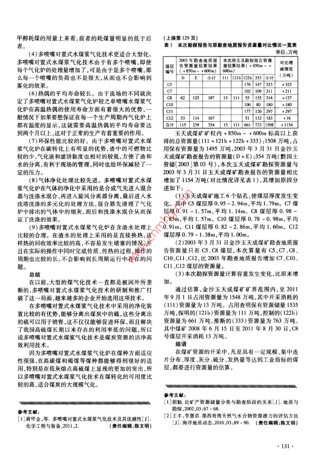 多噴嘴對置式水煤漿氣化技術及其優(yōu)越性李娟平董杰(充礦魯南化工有限公司,山東棗莊277527摘要:多噴對置式水煤漿氣化技術是氣流床氣化技術,以煤炭大規(guī)模高效氣化技術為基礎將城市煤氣、潔凈發(fā)電和供熱液體燃料等清潔能源產品的生產與煤炭化學深加工相結合的一種加壓大型化工裝置。本文對我國這項擁有自主知識產權技術的研發(fā)以及在當前的應用加以概述,從而來發(fā)現多噴嘴對置式水煤漿氣化的爐流場結構及其在進料上面的技術特點和優(yōu)越性。關鍵詞:多噴嘴對置式水煤漿氣化技術;流場結構;優(yōu)越性doi:10.3969/j.issn.1008-0155.2013.09.076中圖分類號:F403.7;TQ546文獻標志碼:B文章編號:1008-0155(2013)09-0130-02多噴嘴對置式水煤漿氣化技術在被我國研發(fā)和投入到工業(yè)化的應用中后,以其自身的發(fā)展優(yōu)勢,在煤氣化行業(yè)中成為了主流技術,為我國當前的煤氣化技術的發(fā)展指明了方向,為我國的煤化工事業(yè)的大規(guī)模發(fā)HA-I展提供了技術的保證,同時也標志著我國在水煤漿氣流床氣化技術上達到了世界領先水平。多噴嘴對置式水煤漿氣化技術的研發(fā)以及在工業(yè)化中的應用1、技術的研發(fā)1.射流區(qū)2.撞擊區(qū)3.撞擊流股區(qū)多噴嘴對置式水煤漿氣化技術是在我國的兗礦魯4.回流區(qū)5.折返流區(qū)6.管流區(qū)南化肥廠進行研發(fā)的。我國自主研發(fā)的這項多噴嘴對圖1多噴嘴對置式氣化爐流場結構示意圖置式水煤漿氣化技術,在性能上已經處于國際領先水平,并且在化工產品的推行領域、動力燃料及大宗化學水煤漿和氧氣進入到氣化室后,進行了一系列的品原料向油基的轉變等方面,很大程度上促進了煤清物理和化學的反應過程,這些反應過程中,霧化、傳熱潔利用產業(yè)的發(fā)展。蒸發(fā)、揮發(fā)、燃燒的反應過程比較的快,在前五個區(qū)域2、技術工業(yè)化中就已經基本上完成了,而只有氣化反應比較的慢,在多噴嘴對置式水煤漿氣化技術在“十五”期間進入管流區(qū)中進行。到了商業(yè)示范階段。多噴嘴對置式水煤漿氣化技術投三、多噴嘴對置式水煤漿氣化技術的優(yōu)越性產以來,重量級的多噴嘴對置式水煤漿氣化爐、燃氣發(fā)和單燒嘴相比較,多噴嘴對置式水煤漿氣化技術電裝置等設備在不斷地完善創(chuàng)新中,已經全面的進入在技術上具有如下的優(yōu)越性。到了實際生產的階段,并且在運行周期上也在不斷的(1)在進料方面的優(yōu)越性。多噴嘴形成撞擊的物突破料的混合,能夠使得物料在混合的過程中燃燒更加的多噴嘴對置式水煤漿氣化技術的機構充分,在霧化的效果上也會更好,而對置式的燒嘴氣化氣化爐是水煤漿氣化中的關鍵設備,氣化爐內流技術中,多股射流經過撞擊后形成了撞擊流股,在這個程結構的合理性對于水煤漿氣化的效率和安全性能都過程中軸向的速度明顯的減弱,爐內的流體在停留的起著決定性的作用。在多噴嘴對置式水煤漿氣化中采時間上分布比較的合理,短路的現象也得到了改善使用的是當前國內外最先進的撞擊流技術來加強混合得轉化率明顯的提高。的,并以此來促進傳熱和傳質。下面就結合氣化爐內(2)在碳轉化上有明顯的優(yōu)勢。通過對轉化爐中的流程分布特點來對多噴嘴對置式水煤漿氣化的核心渣的可燃物進行驗證,可以得出多噴嘴對置式水煤漿技術以及結構進行簡要的概述氣化爐碳中的可燃物在10%以下,而單噴嘴水煤漿氣多噴嘴氣化是通過對水煤漿及氧氣在同一水平面化爐的渣中可燃物一般在25%-40%,通過兩者的對上向上對噴的原理來研制的,水煤漿和氧氣在撞擊之比可以看出多噴嘴對置式水煤漿氣化爐在碳轉化上具后形成了射流區(qū)、撞擊區(qū)、撞擊流股、回流區(qū)、折返流區(qū)有明顯的優(yōu)勢。和管流區(qū)六個區(qū)組成的氣化爐內的流場。圖1為多噴嘴對置式氣化爐流場結構示意圖:(3)耗煤量也明顯降低。通過對采用多噴嘴對置式水煤漿氣化技術的兗礦國泰化工有限公司噸甲醇耗煤量和使用單噴嘴水煤漿氣化爐的兗礦魯南化肥廠噸收稿日期:2013-05-29作者簡介:李娟平(1982—)女,陜西西安人,本科畢業(yè),助理工程師現在兗礦魯南化工有隈公司工作。130·甲醇耗煤的用量上來看,前者的耗煤量明顯的低于后(上接第129頁者表1本次勘探報告與原勘查地質報告資源量對比情況一覽表(4)多噴嘴對置式水煤漿氣化技術更適合大型化。單位:萬噸多噴嘴對置式水煤漿氣化技術由于有多個噴嘴,即使20年劫查地質報本次核實及助探報告資源對比增每個氣化爐的處理量增加了,可是由于是多個噴嘴那/“資源量估算結果量估算結果(+80m煤層|告850m~+600m)600m)減情況么每一個噴嘴的負荷也不是很大,從而也不會影響到DE工小計m121b123小計(萬噸)霧化的效果。176147323+323(6)熱偶的平均壽命較長。由于流場的不同就決+2l1定了多噴嘴對置式水煤漿氣化爐較之單噴嘴水煤漿氣c8621251871311551135314+127化爐在高溫熱偶的使用壽命方面有著很大的優(yōu)勢,10080180+180般情況下如果要想保證在每一個生產周期內氣化爐上Cl253|11416十十團圜都有溫度的顯示,這就需要高溫熱偶的平均壽命要達[合計5293541316172310981+114到兩個月以上,這對于正常的生產有著重要的作用。玉天成煤礦礦權內+850m~+600m標高以上獲(7)環(huán)保性能比較的好。由于多噴嘴
