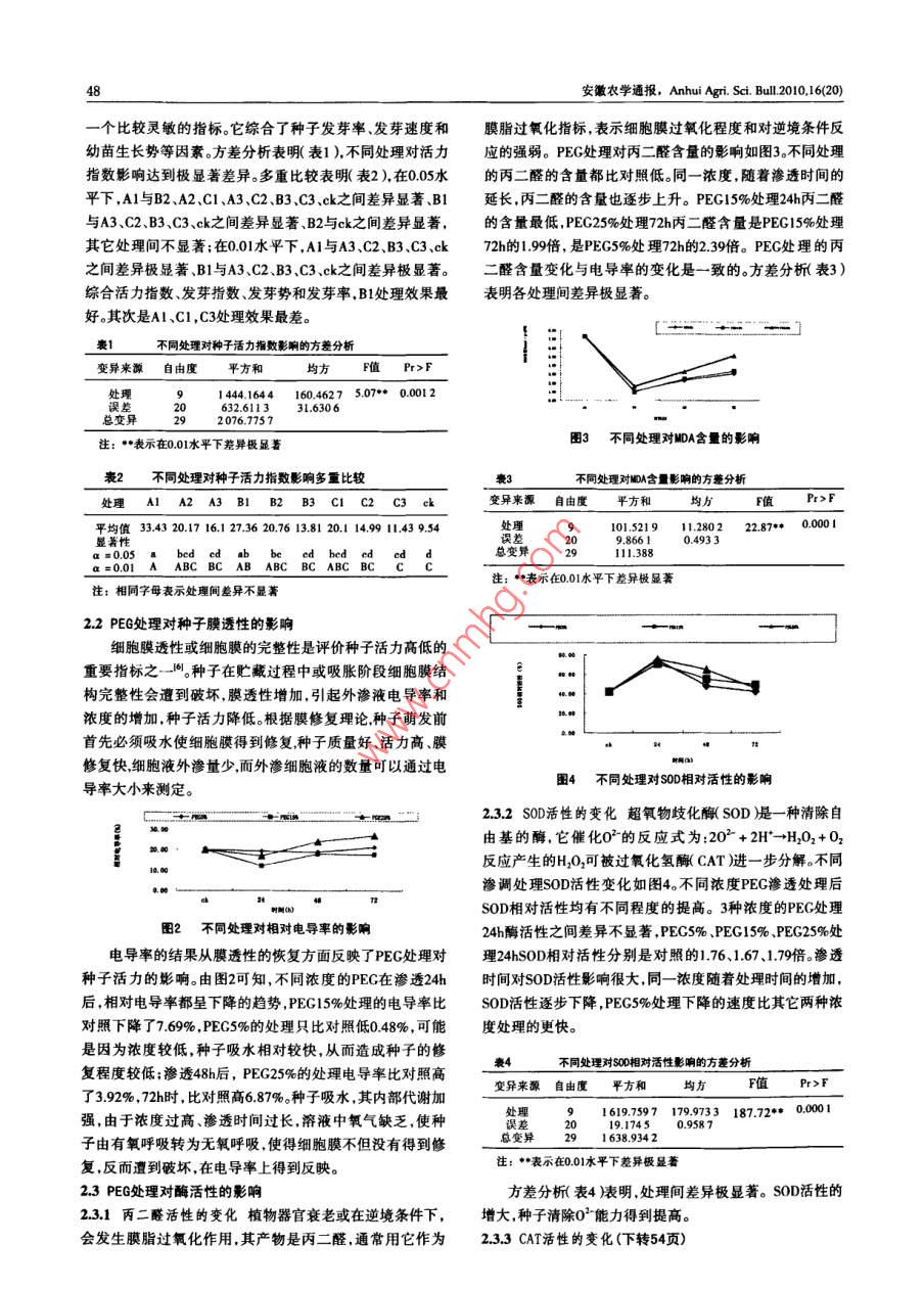安徽農(nóng)學(xué)通報, Anhui Agri..bu201016(20)47聚乙二醇(PEG)處理對希蒙德木種子活力的影響周建勇高捍東2(1滁州市林業(yè)局,安徽滁州2390002南京林業(yè)大學(xué))摘要:希蒙德木種子經(jīng)過PEG處理后內(nèi)部酶的活性發(fā)生變化,不同濃度的PEG處理24h后,可以降低種子的膜透性和丙二醛的含量,提高超氧化物歧化酶和過氧化氫酶的活性;但隨著處理時間的延長,膜的透性增加,丙二醛含量上升,超氧化物歧化酶和過氧化氫酶的活性降低PEG5%處理24h效果最好關(guān)鍵詞:聚乙二醇;希蒙德木種子;相對電導(dǎo)率丙二醛;超氧化物岐酶;過氧化氫酶中圖分類號S793文獻標識碼B文章編號1007-7731(2010)20-047-00 Effect of PEG Pretreatment on Vigor of Simmomdsia Seed Zhou Jianyong' Gao Handong' (1Chuzhou Forestry Bureau, Chuzhou339000, China; 2 Nanjing Forestry University) Abstrac: Simmondsia seeds were treated with PEC.The results showed that pretreatments of PEG with differe ent levels after 24h can decrease relative electrical conductivity and MDA content, and increase SOD activity and CAT activity.But with the time longened, relative electrical conductivity and MDA content increase while SOD and CAT activity decrease. The treatment of PEG5% with 24h has the greatest effect. Key words: PEG;Simmondsis seed; Relative electrical conductivity; Malonaldehyde;Catalase;Superoxide dismutase希蒙德木( Simmondsia Chinensis(link)Schneider)系 DUNCAN多重比較希蒙德木科,僅1屬1種,為多年生常綠灌木,是一種耐干旱2結(jié)果與分析的重要油料植物,原產(chǎn)地在美國西南部與墨西哥西北部接2.1PEG處理對種子活力的影響壤的索諾拉沙漠地區(qū)。PEG是一種優(yōu)良的高分子滲透劑,種子發(fā)芽率是衡量種子生活力的重要指標,而種子發(fā)197 3Heydecker3年首次利用PEG處理種子,獲得了整齊的出芽指數(shù)和活力指數(shù)反映出該批種子萌發(fā)速率和活力狀況。苗效果我們用PE-6000處理希蒙德木種子,研究其對種PEG處理對種子的發(fā)芽勢、發(fā)芽率、發(fā)芽指數(shù)、活力指數(shù)影響子生化指標的影響,以期提高種子活力。如圖1從圖1中可以發(fā)現(xiàn),不同濃度、不同滲調(diào)時間處理對1試驗材料與方法種子的發(fā)芽率有明顯的差異,B2處理比對照提高了17.34%11試驗材料其次是C1、A1比對照相應(yīng)地增加了16.67%、1%,而B3和C3試驗用種子為以色列進口。兩個處理反而比對照的發(fā)芽率低。在發(fā)芽勢、發(fā)芽指數(shù)、1.2試驗方法力指數(shù)方面都比對照有明顯的提高。但隨著滲透調(diào)節(jié)時間1.2.1PEG滲透調(diào)節(jié)處理采用PEG-6000按下表處理,以清的延長,各項指標都相應(yīng)地下降,這是因為PEC溶液是粘稠水浸泡12h的種子為對照(5%、15%、25%的PE-6000的的液體,隨著濃度、時間的增加,溶液中氧氣的含量下降,抑滲透勢分別相當于-0.25Mpa、0.75Ma、-1.25Mpa),每處制了種子的有氧呼吸,在某種程度上抑制了種子代謝。理重復(fù)3次,每次隨機取100粒種子。1.2.2生化指標的測定發(fā)芽測定:將各處理種子洗凈后放置在鋪有濕潤脫脂棉的發(fā)芽盒內(nèi),置于25℃恒溫發(fā)芽箱中發(fā)芽,定期統(tǒng)計發(fā)芽數(shù),并對發(fā)芽率、發(fā)芽勢、發(fā)芽指數(shù)、活力指數(shù)進行計算。質(zhì)膜透性的測定采用相對電導(dǎo)率法;過氧化氫酶(CAT)活性的測定采用高錳酸鉀滴定法2丙G處種子二醛(MDA)含量的測定方法參照汪安琳的硫代巴比妥酸圖1不同PEG處理對種子發(fā)芽的影響(TBA法超氧化物歧化酶SOD活性的測定方法參照汪種子活力是指在適宜和不適宜的環(huán)境條件下種子的發(fā)安琳李柏林采用NBT光照化學(xué)還原法。芽和出苗能力包括幼苗生長勢和整齊度。因此在衡量種子13數(shù)據(jù)分析與處理活力時常將發(fā)芽指數(shù)與幼苗生長勢結(jié)合起來用活力指數(shù)采用 Mierosoft Excel SAS統(tǒng)計軟件進行方差分析和反映種子活力水平。對種子活力進行評價時,活力指數(shù)是作者簡介:周建勇(1973-),男,工程師,從事林學(xué)管理、林木種苗研究。收稿日期:2010-09-2148安徽農(nóng)學(xué)通報, Anhui Agri.c.u201016(20)一個比較靈敏的指標。它綜合了種子發(fā)芽率、發(fā)芽速度和膜脂過氧化指標,表示細胞膜過氧化程度和對逆境條件反幼苗生長勢等因素方差分析表明(表1)不同處理對活力應(yīng)的強弱。PEG處理對丙二醛含量的影響如圖3不同處理指數(shù)影響達到極顯著差異。多重比較表明(表),在0.05水的丙二醛的含量都比對照低同一濃度,隨著滲透時間的平下,A1與B2、A2、C1、A3、C2、B3、C3、ck之間差異顯著、B1延長,丙二醛的含量也逐步上升PEG15%處理24h丙二醛與A3、C2、B3、3、ck之間差異顯著、B2與ck之間差異顯著,的含量最低,PEG25%處理72h丙二醛含量是PEG15%處理其它處理間不顯著;在0.01水平下,A1與A3、2、B3、C3、ck72h的1.99倍,是PEG5%處理72h的2.39倍PEG處理的丙之間差異極顯著、B1與A3、C2、B3、C3、ck之間差異極顯著。二醛含量變化與電導(dǎo)率的變化是一致的。方差分析表3)綜合活力指數(shù)、發(fā)芽指數(shù)、發(fā)芽勢和發(fā)芽率,B1處理效果最表明各處理間差異極顯著好其次是A1、C1,C3處理效果最差。表1不同處理對種子活力指數(shù)影響的方差分析變異來源自由度平方和均方F值Pr>F91164160.46275.070.0012處理206.775731.6306總變異292076.775注:表示在0.01水平下差異極顯著圖3不同處理對MDA含量的影響表2不同處理對種子活力