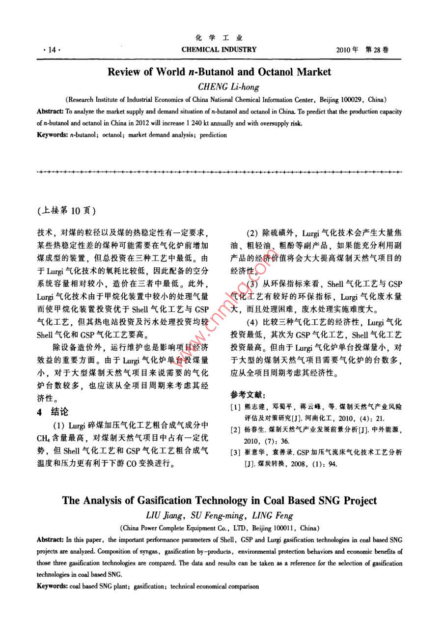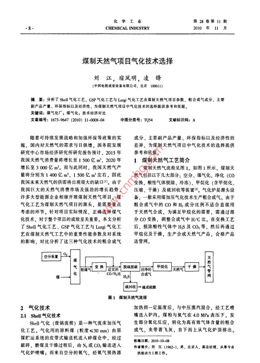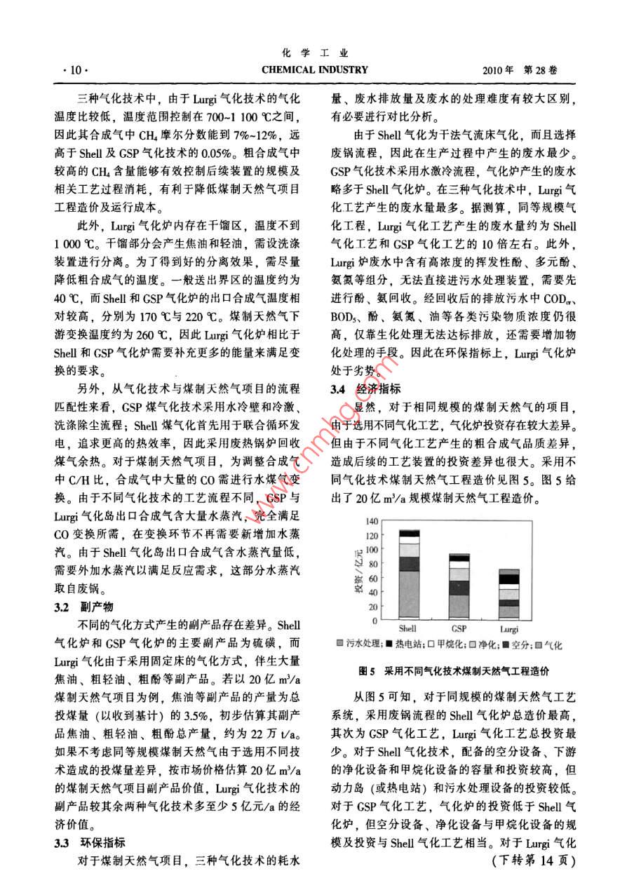 化學(xué)工業(yè)第28卷第11期●8.CHEMICAL INDUSTRY2010年11月煤制天然氣項目氣化技術(shù)選擇劉江,宿鳳明,凌鋒(中國電能成套設(shè)備有限公司,北京10011)摘要: 分析了Shell氣化工藝,GSP氣化工藝與Lurgi氣化工藝在煤制天然氣項目參數(shù)、粗合成氣成分、主要副產(chǎn)品產(chǎn)量、環(huán)保指標(biāo)以及經(jīng)濟性,為煤制天然氣項目中氣化技術(shù)的選擇提供參考和依據(jù)。關(guān)鍵詞:煤氣化廠;煤氣化;技術(shù)經(jīng)濟對比文章編號: 1673- 9647 (2010) 1-0008-04中圖分類號: TQ54文獻標(biāo)識碼: A隨著可持續(xù)發(fā)展戰(zhàn)略和加強環(huán)保等政策的實成分、主要副產(chǎn)品產(chǎn)量、環(huán)保指標(biāo)以及經(jīng)濟性的施,國內(nèi)對天然氣的需求與日俱增。國務(wù)院發(fā)展差異,為煤制天然氣項目中氣化技術(shù)的選擇提供研究中心市場經(jīng)濟研究所研究報告預(yù)計,2015年參考和依據(jù)。我國天然氣消費量將增長至1500億m', 2020年1煤制天然氣工藝簡介增長至3 000億m'。而與此同時,我國天然氣產(chǎn)煤制天然氣流程見圖1。如圖1所示,煤制天量將分別為1 400億m2、1 500億m23左右,因此然氣包括以下幾大部分:空分、煤氣化,凈化(CO我國未來天然氣的供需將出現(xiàn)很大的缺口1。由于變換,酸性氣體脫除、冷凍)、甲烷化(含甲烷化、我國巨大的天然氣消費市場及強勁的增長趨勢,壓縮、干燥)及硫回收等裝置2。氣化爐是源頭設(shè)許多大型能源企業(yè)相繼開展煤制天然氣項目。煤備,一般采用煤加壓氣化技術(shù)生產(chǎn)粗合成氣。由于氣化工藝為煤制天然氣項目的源頭,是需要重點粗合成氣中的CO和H2成分比例不適合直接用考慮的環(huán)節(jié)。針對項目實際情況,正確選擇煤氣于天然氣合成,為滿足甲烷化的需要,需通過部化技術(shù),對于整個項目的成敗至關(guān)重要。本文分析分CO變換,調(diào)整合成氣中H/C比。在變換工藝了Shell 氣化工藝、GSP氣化工藝與Lurgi氣化工后,脫除酸性氣體中H$S及CO2等,然后再通過藝在煤制天然氣工藝中的重要性能參數(shù)及對系統(tǒng)甲烷化及干燥,生產(chǎn)合成天然氣產(chǎn)品,合格產(chǎn)品的影響,對比分析了這三種氣化技術(shù)的粗合成氣送管網(wǎng)?!?空分裝置謀然|粗煤氣l變換適宜的脫硫脫碳.潔凈的甲烷化天熱干燥煤一化|C0/H2比H2S合成氣網(wǎng)碗回收+硫或硫酸圖1煤制天然氣流程2氣化技術(shù)加熱到- -定溫度后,與中壓蒸汽混合,經(jīng)工藝噴2.1 Shell 氣化技術(shù)嘴送人爐內(nèi)。煤粉與氧氣在4.0 MPa表壓下,發(fā)Shell氣化(廢鍋流程)是一種氣流床加壓氣生部分氧化反應(yīng),轉(zhuǎn)化為高有效氣體含量的粗合化工藝。氣化用的原料煤(粒度≤30 mm)由原成氣,夾帶著飛灰,自下而上從氣化爐頂排出。煤貯運系統(tǒng)的皮帶式輸送機送人碎煤倉中,經(jīng)過收稿日期: 2010-10-08破碎、磨煤及干燥過程后,由N2或CO2輸送進入作者簡介:劉江(1962-), 男,北京人,副總經(jīng)理,從事專業(yè)氣化爐噴嘴;而來自空分的氧氣,經(jīng)氧氣預(yù)熱器熱能動力工程工作。第11期劉江等:煤制天然氣項目氣化技術(shù)選擇●9●氣化爐頂部的煤氣溫度約1600 C,由后部返回2.3 Lurgi 碎煤加壓氣化技術(shù)的冷煤氣混合激冷至900C左右進人廢鍋回收熱Lurgi氣化屬于固定床碎煤加壓氣化工藝。該量。Shell 氣化爐氣化工藝如圖2所示。工藝采用的原料粒度為5~50 mm,氣化劑采用水蒸汽與純氧;原料煤從氣化爐上部加入,在爐內(nèi)從上至下依次經(jīng)過干燥、干餾、半焦氣化、殘焦燃十高壓蒸汽燒、灰渣排出等物理化學(xué)過程。氣化溫度為700~1 100 C,氣化壓力為3.0~4.0 MPa。Lurgji碎煤加T壓氣化爐如圖4所示。中壓蒸汽煳料煤、合成氣爐渣圖2 Shell氣化爐工藝旋轉(zhuǎn)爐篦氣化劑2.2 GSP 氣化技術(shù)GSP氣化是一種氣流床加壓氣化工藝。該工藝排灰鎖斗首先將原料煤(原料以煤為例)進行破碎、磨煤灰資和干燥,干燥后的煤粉用高壓N2 (高于氣化壓力約1 MPa)或CO2 (做甲醇時用CO2)輸送到氣化圖4 Lurgi 氣化爐工藝爐頂部的燒嘴,煤粉與氧氣和蒸汽在氣化爐內(nèi)瞬間(≈10s)完成反應(yīng),反應(yīng)溫度為1 400~1 600 C,3不同氣化工藝主要技術(shù)參數(shù)對比氣化壓力通常為2.5~4.0 MPal);反應(yīng)后的氣體進3.1爐參數(shù)和粗合成 氣成分人反應(yīng)室下部的激冷室進行激冷,液態(tài)渣也流人比較三種氣化工藝主要參數(shù)和所產(chǎn)粗合成氣.激冷室凝固,通過灰鎖排入渣池。GSP 氣化爐工成分如表1所示。藝如圖3所示。表1三種氣化工藝主要 參數(shù)和所產(chǎn)粗合成氣成分干煤粉| 純氧項目Shell 氣化GSP氣化Lurgi氣化參數(shù):?氣化壓力MPa4.23-4.0低壓蒸汽氣化溫度/C 1 300-1 7001 350-1 750 700-1 100純氧純氧+水蒸汽純氧+水蒸汽出口合成氣170220溫度/C粗合成氣摩爾合成氣去下游分?jǐn)?shù)/%55-5665-~7516-28灰水處理H235-~3620-2838-40CO27~7.54~-527-32↓爐渣CH4+C2 .7~120.8~1.10.8-1.10.5~2圖3 GSP 氣化爐工藝化學(xué)工業(yè)●10.CHEMICAL INDUSTRY2010年第28卷三種氣化技術(shù)中,由于Lurgi氣化技術(shù)的氣化量、廢水排放量及廢水的處理難度有較大區(qū)別,溫度比較低,溫度范圍控制在700~1 100 C之間,有必要進行對比分析。因此其合成氣中CH,摩爾分?jǐn)?shù)能到7%~12%,遠(yuǎn)由于Shell氣化為干法氣流床氣化,而且選擇高于Shell及GSP氣化技術(shù)的0.05%。粗合成氣