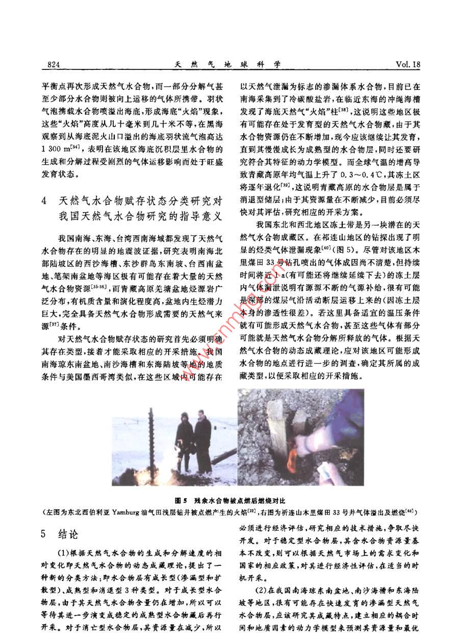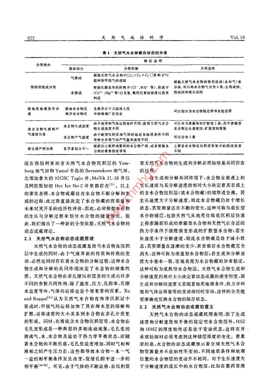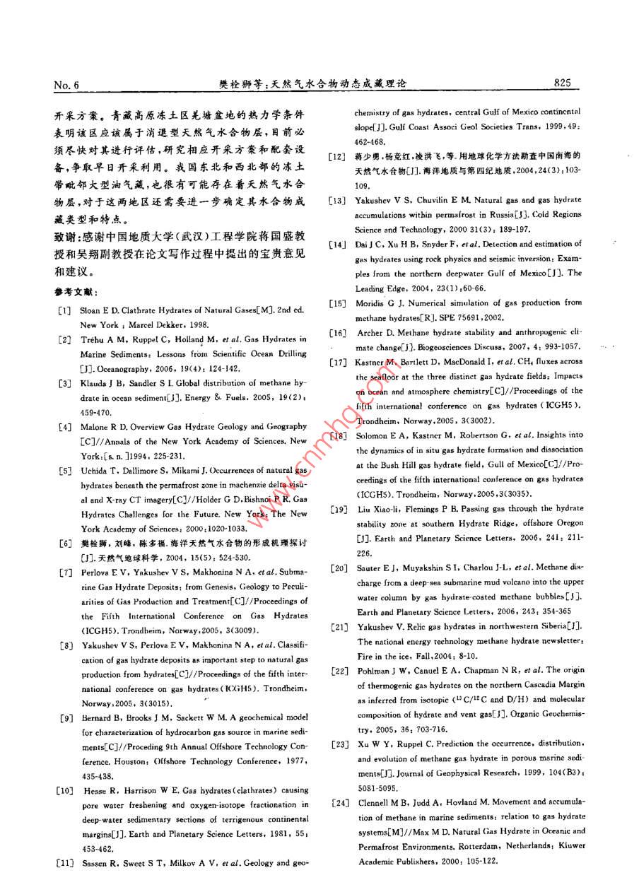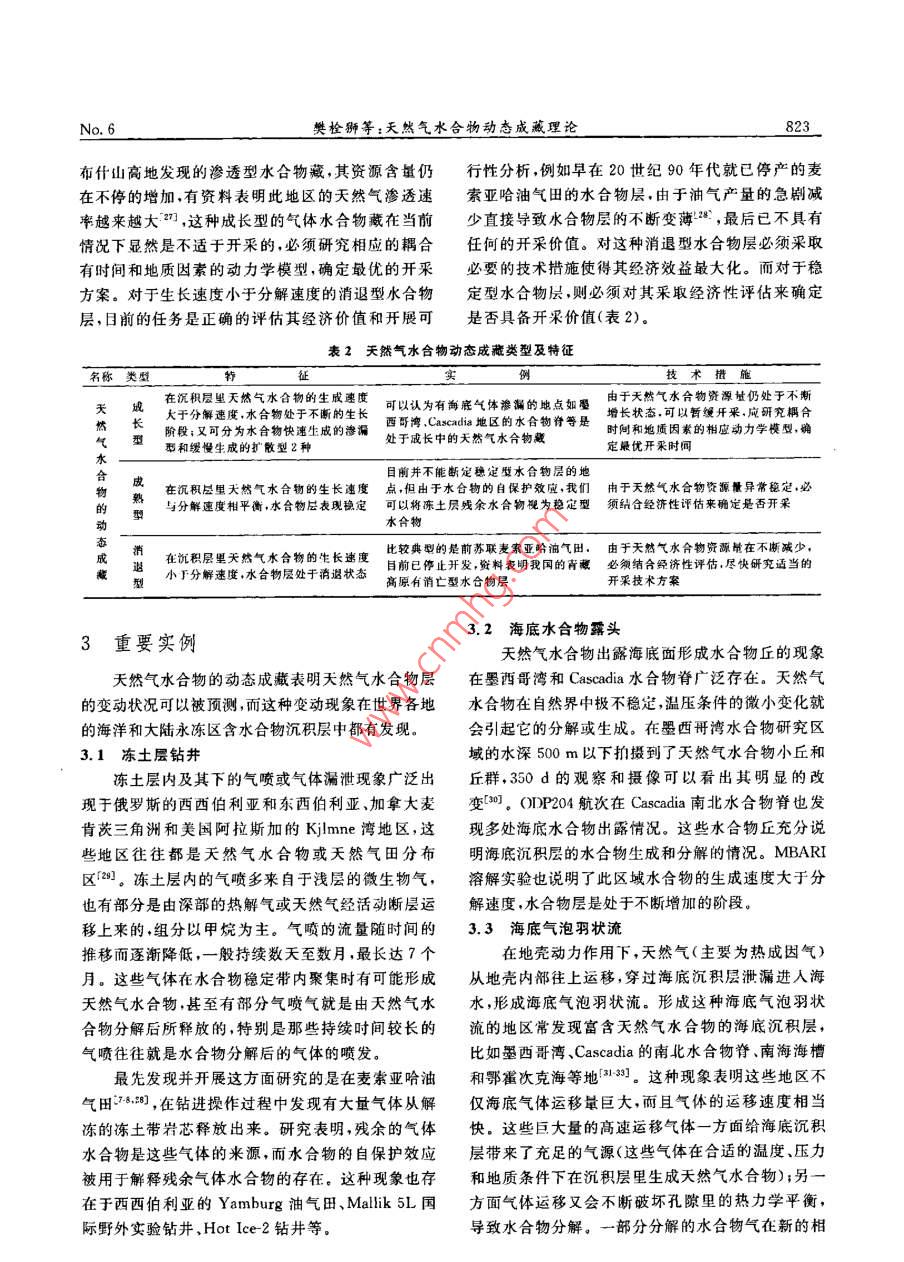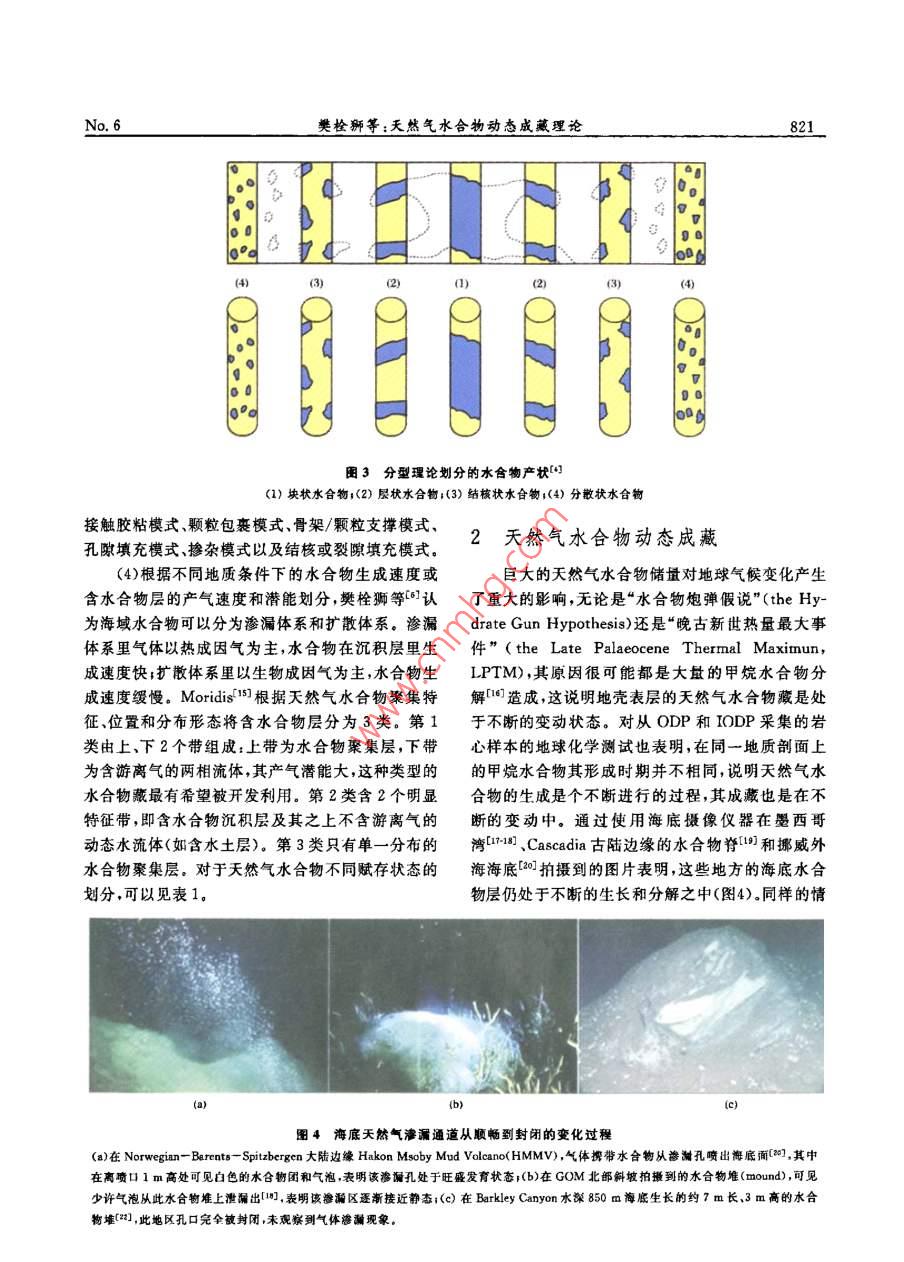 第18卷第6期天然氣地球科學(xué)Vol 18 No2007年12月NATURAL GAS GEOSCIENCEDec.2007天然氣水合物天然氣水合物動態(tài)成藏理論樊栓獅1,關(guān)進安2,梁德青23,寧伏龍(1.華南理工大學(xué)傳熱強化與過程節(jié)能教育部重點實驗窒,廣東廣州,510640;2.中國科學(xué)院廣州能源研究所,廣東廣州510640;3.中國科學(xué)院廣州天然氣水合物研究中心,廣東廣州510640;4.中國科學(xué)院研究生院,北京100039;5.中國地質(zhì)大學(xué)工程學(xué)院,湖北武漢430074)摘要:總結(jié)了天然氣水合物的賦存狀態(tài)及其分類,從生成和分解速度角度提出了天然氣水合物的動態(tài)成巖理論,并依據(jù)凍土層鉆井氣體噴溢、海底水合物露頭和海底羽狀氣泡流等實例論證了這種動態(tài)成藏理論。指出天然氣水合物賦存狀態(tài)主要有3種美型,即成長型(滲透型、擴散型)、成熟型和消選型,認為我國南海北部陸坡區(qū)的西沙海槽、東沙群島東南坡、臺西南盆地、筆架南盆地等區(qū)琥有可能存在著仍處于發(fā)育階段的滲透型或擴散型水合物層,而青藏高原羌塘盆地則是屬于消退型水合物,祁連山地區(qū)、準(zhǔn)噶爾盆地等的烴類氣體泄漏表明在我國西北和東北的凍土帶也可能存在著含氣水合物層。關(guān)鍵詞:天然氣水合物;儲層;分類;動態(tài)成蕆;理論中圖分類號:TE122文獻標(biāo)識碼:A文章編號:1672-1926(2007)06-0819-080前言的分類,不少學(xué)者分別從生成水合物的氣體來源和水合物在沉積層中的賦存狀態(tài)、水合物的賦存范天然氣水合物是由小“客體”分子(<0.9mm)圍以及水合物儲層的演變過程等方面總結(jié)了水合物如CH4等在一定溫度壓力條件下接觸到水分子而的分類特征。形成的白色似冰的籠型結(jié)晶化合物,具有單位能無論是從水合物在沉積層的產(chǎn)狀還是從水合物量密度高、分布廣、規(guī)模大、埋藏淺、成藏物化條件佳氣體的來源等角度考慮對天然氣水合物分類都沒等優(yōu)點具廣泛分布于世界各大洋海底與陸地永凍涉及到其自身的一項重要特征,即天然氣水合物層,(圖1),從圖1中可以看出水合物在凍土帶和是一種并不穩(wěn)定的固體,即使在合適的熱力學(xué)條件大陸邊緣陸坡廣泛存在, Klauda and Sandler認下,水合物自身也會不斷分解這一點對于分析天然為全球海域的天然氣水合物中儲存有74000Gt的氣水合物在自然界的賦存狀態(tài)非常重要。本文根據(jù)甲烷(,其數(shù)量之大,是全世界常規(guī)天然氣儲量的3天然氣水合物的熱穩(wěn)定特性,認為其在自然界中的個數(shù)量級。可見水合物氣資源量極其豐富,被譽為聚集是一種生成和分解同時存在的過程,據(jù)此提出21世紀(jì)的可代替能源了水合物的動態(tài)成藏理論,并且通過3個自然界水天然氣水合物在沉積物地層中聚集形成具有一合物形成的實例來論證。定儲量規(guī)模的礦藏是一個復(fù)雜的過程,它必須有充足的烴類氣源、合適的相平衡溫壓條件和良好的圈1天然氣水合物的賦存狀態(tài)閉條件。為了合理開發(fā)利用天然氣水合物資源,需目前,對于天然氣水合物在自然界的賦存狀態(tài),要根據(jù)水合物生成和儲存狀態(tài)的特點對其進行恰當(dāng)通常分為以下幾類:收稱日期:2007-07-23;修回日期;2007-09-28.基金項目:中國科學(xué)院創(chuàng)新項目(編號:KGCX2sw-224);國家自然科學(xué)基金(編號:904103);廣東省自然科學(xué)基金重點(編號:52001130聯(lián)合資助作者簡介:樊栓獅(1965-),男陜西蒲城人,教授博士生導(dǎo)師,主要從事天然氣水合物,化工分離等研究.Ema;fans@ams.gie.ac,cn天然氣地球科學(xué)Vol 18助證實了的陸地水合物●勘探證實了的海洋水合物推測存在的陸地水合物O推測存在的海洋水合物圖1天然氣水合物在全球的分布地點預(yù)測(1)根據(jù)天然氣水合物的物質(zhì)組分劃分,有氣源合物的自保護效應(yīng)能聚集更大量的天然氣13]。說與水源說12類。天然氣水合物是由氣體和水溫度℃組成的一種固體物質(zhì),其籠型結(jié)構(gòu)里包容了不同尺寸的氣體分子。根據(jù)烴類氣體成分比值[R=C1(C2+C3)和甲烷的碳同位素8C值來判別甲烷氣體的成因,此即為氣源說。在美國墨西哥灣水合物區(qū)塊的研究工作表明形成水合物的烴類氣體共有3種成因;熱成因氣、生物成因氣和混合成因氣1300天然氣水合物在海底沉積物里生成和分解時,會導(dǎo)致孔隙水中陰離子(Cl-、SO等)陽離子(Ca2+、Mg2+等)和氫氧同位素的的異常1,對孔隙水進行地球化學(xué)檢測可以指示水合物的存在情況,此即為水源說圖2凍土帶中HSz與HMZ的分布范圍(2)根據(jù)天然氣水合物存在的地理地質(zhì)環(huán)境和(左圖顯示HM2通常處于水合物相平衡線外,熱穩(wěn)定性劃分,可以分為陸地凍土層天然氣水合物右圖表明殘余水合物通常被冰包裹和海洋天然氣水合物。天然氣水合物廣泛存在(3)根據(jù)水合物在沉積層里的生成產(chǎn)狀劃分,有于全世界各地的海洋和內(nèi)陸湖中特別是在大陸邊不同的劃分方法。 Malone等首先對海洋水合物緣的淺海里。另外一個水合物富集的地域是大陸凍產(chǎn)狀進行了多年研究,他們運用分型理論(此理論是士層,在西伯利亞阿拉斯加等地區(qū)的凍土層里均已后來研究水合物在沉積層膠結(jié)性質(zhì)的基礎(chǔ))指出水鉆獲了含水合物巖心,通過對鉆井過程的各項參數(shù)合物主要存在于以下4