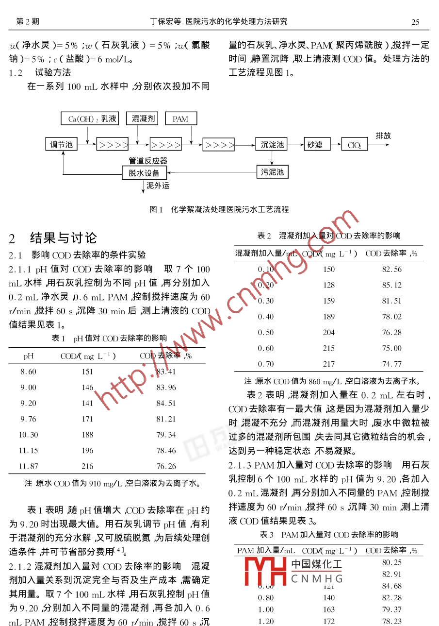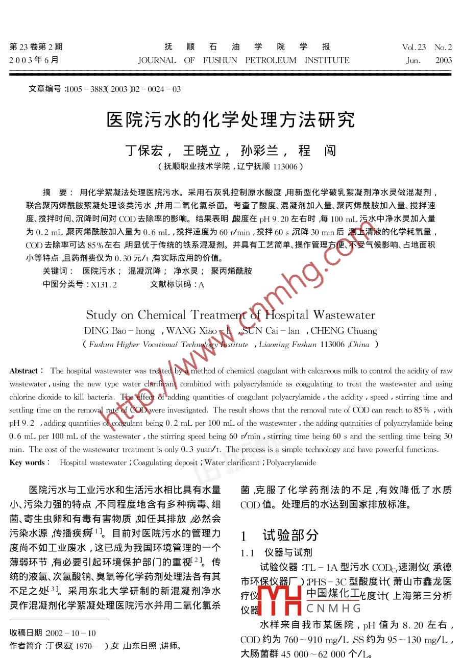 第23卷第2期撫順石油學(xué)院學(xué)報(bào)Vol.23 No. 22003年6月JOURNAL OF FUSHUN PETROLEUM INSTITUTEJun. 2003文章編號:1005 - 3883( 2003 )2 - 0024-03醫(yī)院污水的化學(xué)處理方法研究丁保宏,王曉立,孫彩蘭,程闖(撫順職業(yè)技術(shù)學(xué)院,遼寧撫順113006 )摘要:用化學(xué)絮凝法處理醫(yī)院污水。采用石灰乳控制原水酸度用新型化學(xué)破乳絮凝劑凈水靈做混凝劑,聯(lián)合聚丙烯酰胺絮凝處理該類污水并用二氧化氯殺菌。考查了酸度、混凝劑加入量、聚丙烯酰胺加入量、攪拌速度、攪拌時(shí)間、沉降時(shí)間對COD去除率的影響。結(jié)果表明酸度在pH9.20左右時(shí),每100 mL污水中凈水靈加入量為0. 2 mL聚丙烯酰胺加入量為0.6 mL ,攪拌速度為60 r/min ,攪拌60s沉降30 min后測上清液的化學(xué)耗氧量,COD去除率可達(dá)85%左右明顯優(yōu)于傳統(tǒng)的鐵系混凝劑。并具有工藝簡單、操作管理方便、不受氣候影響、占地面積小等特點(diǎn)且藥劑費(fèi)僅為0. 30元/t ,有實(shí)際應(yīng)用的價(jià)值。關(guān)鍵詞:醫(yī)院污水 ;混凝沉降;凈水靈;聚丙烯酰胺中圖分類號:X131.2文獻(xiàn)標(biāo)識碼:AStudy on Chemical Treatment of Hospital W astewaterDING Bao- hong , WANG Xiao-li ,SUN Cai - lan , CHENG Chuang( Fushun Higher Vocational Technology Institute , Liaoning Fushun 113006 ,China )Abstract : The hospital wastewater was treated by a method of chemical coagulant with calcareous milk to control the acidity of rawwastewater , using the new type water clarificant combined with polyacrylamide as coagulating to treat the wastewater and usingchlorine dioxide to kill bacteria. The effect of adding quantities of coagulant polyacrylamide , the acidity ,speed , stirring time andsettling time on the removal rate of COD were investigated. The result shows that the removal rate of COD can reach to 85% , withpH 9.2 ,adding quantities of coagulant being 0.2 mL per 100 mL of the wastewater , the adding quantities of polyacrylamide being0.6 mL per 100 mL of the wastewater , the string speed being 60 r/min , stiring time being 60 s and the stling time being 30min. The cost of the wastewater treatment is only 0. 3 yuan/t. The process is a simple technology and have powerful functions.Key words : Hospital wastewater ; Coagulating deposit ; Water clarificant ; Polyacrylamide醫(yī)院污水與工業(yè)污水和生活污水相比具有水量菌,克服了化學(xué)藥劑法的不足,有效降低了水質(zhì)小污染力強(qiáng)的特點(diǎn)不同程度地含有多種病毒、細(xì)COD值。處理后的水達(dá)到國家排放標(biāo)準(zhǔn)。菌、寄生蟲卵和有毒有害物質(zhì),如任其排放必然會(huì)污染水源傳播疾病1。目前對醫(yī)院污水的管理力1試驗(yàn)部分度尚不如工業(yè)廢水,這已成為我國環(huán)境管理的一個(gè)1.1儀器與試劑薄弱環(huán)節(jié),有必要引起環(huán)境保護(hù)部門的重視2]。傳試驗(yàn)儀器:TL- 1A型污水CODc速測儀(承德統(tǒng)的液氯、次氯酸鈉、臭氧等化學(xué)藥劑處理法各有其市環(huán)保儀器廠) ;PHS - 3C型酸度計(jì)(蕭山市鑫龍醫(yī)不足之處3。采用東北大學(xué)研制的新混凝劑凈水中國煤化工長度計(jì)(.上海第三分析靈作混凝劑化學(xué)絮凝處理醫(yī)院污水并用二氧化氯殺儀器CNMHG水樣來自我市某醫(yī)院,pH值為8.20左右,收稿日期2002-10- 10COD約為760~ 910 mg/L SS約為95 ~ 130 mg/L,作者簡介:丁保宏( 1970- )女山東日照,講師。.大腸菌群45 000~ 62000個(gè)/I。.采用的化學(xué)藥劑有:re( 聚丙烯酰胺)=0.1% ;第2期丁保宏等.醫(yī)院污水的化學(xué)處理方法研究25re(凈水靈)=5% ;w(石灰乳液) =5% ;w(氯酸量的石灰乳、凈水靈、PAM(聚丙烯酰胺),攪拌- -定鈉)=5% ic( 鹽酸)= 6 mol/Lo .時(shí)間,靜置沉降,取. 上清液測COD值。處理方法的1.2試驗(yàn)方法 .工藝流程見圖1。在一系列100mL水樣中,分別依次投加不同_Ca(OH)2乳液混凝劑 |PAM排放調(diào)節(jié)池上>習(xí)↓>習(xí)↓>>習(xí)[沉淀池一~砂濾]-[aO.管道反應(yīng)器脫水設(shè)備| 污泥池↓泥外運(yùn)圖1化學(xué)絮凝法處理醫(yī)院污水工藝流程2結(jié)果與討論表2混凝劑加入量對COD去除率的影響2.1 影響COD去除率的條件實(shí)驗(yàn)混凝劑加入量/mL COD/(mg L~1) COD 去除率%2.1.1 pH值對COD去除率的影響取7個(gè)1000.10l 5082. 56mL水樣用石灰乳控制為不同pH值再分別加入0.2012885. 12.0.2 mL凈水靈0.6 mL PAM控制攪拌速度為600.3015981.51r/min攪拌60s沉降30 min后測上清液的COD0.40.1 8978. 02值結(jié)果見表1。0.5020476.28表1 pH 值對COD去除率的影響0.6021575.00pHCOD/(mg L- ')COD去除率%0.7021774. 778. 6015183.41注原水COD值為860 mg/L空白溶液為去離子水。9.0014683. 96表2表明,混凝劑加入量在0.2 mL左右時(shí),9.2014184.51COD去除率有-最大值這是因?yàn)榛炷齽┘尤肓可?.7617181.21時(shí)混凝不充分,而混凝劑用量大時(shí)廢水中微粒被10. 3018879. 34過多的混凝劑所包圍失去同其它微粒結(jié)合的機(jī)會(huì),11. 1519678.46達(dá)到另-種穩(wěn)定狀態(tài)不易凝聚。11.8721676.262.1.3 PAM加入量對COD去除率的影響用石灰注原水COD值為910 mg/L空白溶液為去離子水。乳控制6個(gè)100 mL水樣的pH值為9.20 ,各加入0.2 mL混凝劑再分別加入不同量的PAM控制攪表1表明隨pH值增大,COD去除率在pH約拌速度為60 r/min攪拌60s沉降30 min測上清為9.20時(shí)出現(xiàn)最大值。用石灰乳調(diào)節(jié)pH值有利液COD值結(jié)果見表3。于混凝劑的充分水解,又可脫硫脫氮,為后續(xù)處理創(chuàng)表3 PAM 加入量對COD去除率的影