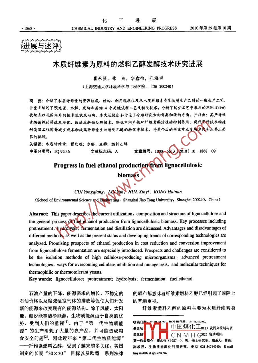 化工進(jìn)展CHEMICAL INDUSTRY AND ENGINEERING PROGRESS2010年第29卷第10期進(jìn)展與述木質(zhì)纖維素為原料的燃料乙醇發(fā)酵技術(shù)研究進(jìn)展崔永強(qiáng),林燕,華鑫怡,孔海南(上海交通大學(xué)環(huán)境科學(xué)與工程學(xué)院,上海200240摘要:介紹了木質(zhì)纖維素的資源組成、結(jié)構(gòu)、利用現(xiàn)狀以及從木質(zhì)纖維素類生物質(zhì)生產(chǎn)乙醇的一般生產(chǎn)工藝,并重點(diǎn)綜逑了預(yù)處理、水解、發(fā)酵和蒸餾4個(gè)關(guān)鍵流程工藝及相關(guān)技術(shù),分析了這些工藝中采用的不同方法的優(yōu)缺點(diǎn)以及國內(nèi)外的技術(shù)現(xiàn)狀及動(dòng)向,本文還提出和討論了今后研究方向需要加強(qiáng)的方面,并指出:高產(chǎn)纖維素酶菌株的篩選及馴化、改進(jìn)原料預(yù)處理技術(shù)、降低中間產(chǎn)物對(duì)纖維素酶活性的抑制作用、現(xiàn)代育種技術(shù)構(gòu)建耐高溫工程菌等減少成本和提高纖維素生物質(zhì)到乙醇的轉(zhuǎn)化率技術(shù),將是今后的研究重點(diǎn)發(fā)展方向和業(yè)界正面臨的挑戰(zhàn)關(guān)鍵詞:木質(zhì)纖維素;預(yù)處理;水解、發(fā)酵;燃料乙醇中圖分類號(hào):TQ9206文獻(xiàn)標(biāo)志碼:A文章編號(hào):1000-6613(2010)10-1868-09Progress in fuel ethanol production from lignocellulosicbiomassCUI Yongqiang, LIN Yan, HUA Xinyi, KONG Hainan(School of Environmental Science and Engineering, Shanghai Jiao Tong University, Shanghai 200240, China)Abstract: This paper describes the current utilization, composition and structure of lignocellulose andthe general process of fuel ethanol production from lignocellulosic biomass. Key processes includingpretreatment, hydrolysis, fermentation and distillation are discussed. Advantages and disadvantages ofdifferent methods, as well as the present status and developing trends of corresponding technologiesanalyzed. Promising prospects of ethanol production in cost reduction and conversion improvementfrom lignocellulose fermentation are especially introduced. Prospects and challenges are considered tobe the isolation methods of high cellulose-producing microorganisms, advanced pretreatmenttechnologies, ways for overcoming cellulase inhibition and mutagenesis, and molecular techniques forthermophilic or thermotolerant yeastsKey words: lignocellulose; pretreatment; hydrolysis; fermentation; fuel ethanol石油產(chǎn)量的下降、能源需求的增長、不穩(wěn)定的的頒布都意味著纖維素燃料乙醇已經(jīng)引起了國際上石油價(jià)格以及縮減溫室氣體的排放等促使人們開發(fā)的普遍重視新的能源來改變現(xiàn)有的能源結(jié)構(gòu)。除了風(fēng)能、太陽纖維素燃料乙醇的原料主要為木質(zhì)纖維素類能、潮汐能等潔凈能源,生物質(zhì)能源由于自身的優(yōu)勢(shì),受到人們的重視。由于“第一代生物質(zhì)能收稿日?、峰為日,n1nn26。源”的生產(chǎn)消耗了大量的農(nóng)產(chǎn)品,并可能造成糧金中國煤化工o5)及污染控制與賽源化研食安全問題,因此近年來“第二代生物質(zhì)能源”CN MHGO2)資助項(xiàng)目r:水強(qiáng)(1987~),男,幀上砑究生。聯(lián)系人:林燕纖維素燃料乙醇,受到了越來越多關(guān)注,美國副教授,生物質(zhì)能源化利用研究,電話021547454;Ema制定的長期“30×30”目標(biāo)以及歐盟一系列法律 linyan00 sjtu.edu.c永強(qiáng)等:木質(zhì)纖維素為原料的燃料乙醇發(fā)酵技術(shù)研究進(jìn)展1869·生物質(zhì),主要包括纖維素、半纖維素和木質(zhì)素。木表1纖維素、半纖維素、木質(zhì)素在常見農(nóng)作物及質(zhì)纖維素的原料豐富,植物每年通過光合作用可產(chǎn)廢棄物的含量1生髙達(dá)1550億噸纖維素類物質(zhì),而每年用于工業(yè)過農(nóng)業(yè)廢棄物纖維素%半纖維素%木質(zhì)素%程或燃燒的纖維素僅占2%左右,具有很大利用空硬木于間。我國在2004年開始試點(diǎn)推廣在汽油中添加乙軟木干醇,但當(dāng)時(shí)的大部分乙醇產(chǎn)自玉米、高粱和甘蔗,堅(jiān)果殼原料價(jià)格和來源受到限制,因此非糧纖維素乙醇的玉米芯前景十分廣闊。研究木質(zhì)纖維素燃料乙醇對(duì)解決能源短缺、環(huán)境污染、氣候變暖等問題具有非常重牧草35~5010~30大的意義。麥稈20~2515~20稻草桿1木質(zhì)纖維素15~20木質(zhì)纖維素主要由纖維素(40%~50%)、半纖分類垃圾維素(25%~35%)和木質(zhì)素(15%~20%)構(gòu)成,5~20如圖1所示5。纖維素是一種有1000~10000個(gè)葡百慕大沿海牧草萄糖單體以β-1,4糖苷鍵連接的直鏈多糖,多個(gè)分柳枝草30~50子平行緊密排列成絲狀不溶性微小纖維,其基本組固體牛糞16~4.7I4~3.32.7~57成單位是纖維二糖,它是地球上最豐富的聚合體;半纖維素是一類高度分支的雜多糖,糖殘基有己糖初始廢水懸浮物8~1524~29(如D半乳糖、L半乳糖等)、戊糖(D-木糖、L阿拉伯糖)和糖醛酸,半纖維素的組成依原料的不5518~30同而有所差別;木質(zhì)素不是由碳水化合物組成,而化學(xué)漿廢紙60~7010~20是由苯內(nèi)烷結(jié)構(gòu)單元組成的近似球狀的高聚體,對(duì)水解纖維素起到屏障作用向天然纖維素材料的結(jié)構(gòu)性質(zhì)非常復(fù)雜,木聚糖使其難以直接被生物降解。同時(shí),不同生物質(zhì)的是植物半纖維素的主要成分,其主鏈常以氫鍵形式纖維素、半纖維素、木質(zhì)素含量差別也很大,其在與纖維素的纖維絲相連,而側(cè)鏈通過阿魏酸或醛酸常見的農(nóng)作物及廢棄物