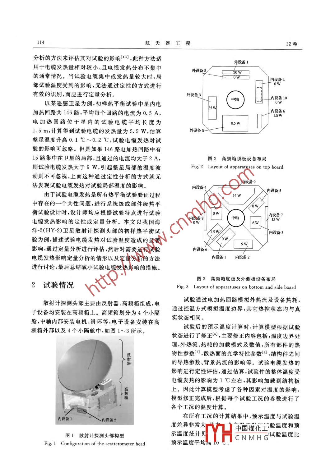 第22卷第2期航天器工程Vol 22 No. 22013年4月SPACECRAFT ENGINEERING試驗電纜發(fā)熱對熱設計驗證的影響分析彭方漢王甜甜耿利寅李國強(北京空間飛行器總體設計部,北京100094)摘要試驗電纜發(fā)熱是航天器熱平衡試驗中一個難以消除的附加影響因素,常對熱設計的正常驗證造成很大干擾,分析其影響是保證熱平衡試驗驗證正確有效的一項重要措施。針對試驗電纜發(fā)熱對試驗結果及熱設計驗證的影響,文章以我國海洋-2(HY2)衛(wèi)星散射計探測頭部熱平衡試驗為例,提出了一種定量分析的方法,并描述了對其影響進行分析和予以消除的具體過程。通過討論散射計探測頭部熱平衡試驗的特點,以及具有類似特點的系統(tǒng)級和部件級熱平衡試驗的情形,歸納了試驗電纜發(fā)熱定量分析的具體實施方式,并總結了適用于定量分析的熱設計驗證試驗的特點。在軌遙測數(shù)據(jù)表明,定量分析的方式可正確有效地評估試驗電纜發(fā)熱的影響,修正后的計算模型可對在軌溫度進行準確的預示關鍵詞試驗電纜;發(fā)熱;驗證;影響中圖分類號:V416.4文獻標志碼:ADO:10.3969/.issn.1673-8748.2013.02.022Analysis of Impact of Electric Cable Heat on Thermal Design TestPENG Fanghan WANG Tiantian GENG Liyin LI Guoqiang(Beijing Institute of Spacecraft System Engineering, Beijing 100094, China)Abstract: Heat generated by electric cable is an inevitable influencing factor in thermal balancetest. The heat causes serious interference to the thermal design verification tests. It is importantto analyze and eliminate the effect of the heat to guarantee the tests valid and accurate. Taking itfor an example to describe the effect of electric cable heat on the test result in HY-2 scatterometerheads thermal balance test, this article presents a quantitative analysis method and describes theocess of eliminating the effect of the heat radiation on the results. Also, by analyzing the situa-tion of the scatterometer head's thermal balance and other system or component level thermalbalance tests with the similar problem, this article sums up the characteristics of the thermaldesign verification tests gives the quantitative analysis method and enumerates the steps for usingthe quantitative analysis method. In-orbit telemetry data shows that the quantitative analysismethod can precisely predict the effect of electric cable heat radiationKey words: electric cable; heat radiation; validation; impact驗常采用電加熱回路口和紅外籠23來進行熱耗、外1引言熱流的模擬。電加熱回路設計以加熱器的發(fā)熱量為目標值,連接加熱器的電纜發(fā)熱量是額外增加的熱熱控方案研制過程中,整星及部件的熱平衡試源。對于試驗電纜發(fā)熱的影響,目前普遍采用定性v山中國煤化工收稿日期:201208-02;修回日期:2013-03-07CNMHG作者簡介:彭方漢(1982-),男,工程師,從事航天器及有效載荷熱設計工作。Emm: penglangnan(gy sina,com114航天器工程22卷分析的方法來評估其對試驗的影響45,此種方法適外設備1用于電纜發(fā)熱量相對較小、且電纜發(fā)熱分布不集中設備2CoW的通常情況。當試驗電纜集中或發(fā)熱量較大時,局Ow內設備4部試驗溫度受到的影響,無法通過定性的方式進行有效的識別,而應進行定量分析。外設備3以某遙感衛(wèi)星為例,初樣熱平衡試驗中星內電中軸加熱回路共146路,平均每個回路的電流為0.5A,內設備6電加熱回路位于星內的試驗電纜平均長度為1.5m,計算得到試驗電纜的發(fā)熱量為5.5W,估算整星溫度升高0.1℃~0.2℃,試驗電纜發(fā)熱對試驗的影響可忽略。但是如果146路電加熱回路中有15路集中在衛(wèi)星的局部,且通過的電流均大于2A,圖2高頻箱頂板設備布局則試驗電纜發(fā)熱大于9W,引起整星局部的溫度波Fig 2 Layout of apparatuses on top board動則不可忽視,上面這種通過定性分析的方式就無法發(fā)現(xiàn)試驗電纜發(fā)熱對試驗局部溫度的影響。內設備9內設備4內設備5由于試驗電纜發(fā)熱是所有熱平衡試驗驗證過程中存在的一個共性問題,進行系統(tǒng)級或部件級熱平衡試驗設計時,設計師均應根據(jù)試驗特點進行試驗電纜發(fā)熱影響的定性或定量分析。本文以我國海內設備8中軸洋-2(HY-2)衛(wèi)星散射計探測頭部的初樣熱平衡試內設備3驗為例,描述試驗電纜發(fā)熱對試驗溫度造成的顯著影響,通過定量分析進行評估,然后對需要進行試驗內設備6電纜發(fā)熱影響定量分析的情形以及定量分析的方法勺設備1內設備2進行討論,最后總結減小試驗電纜發(fā)熱影響的措施。圖3高頻箱底板及外側板設備布局2試驗情況ig. 3 Layout of apparatuses on bottom and side board散射計探測頭部主要由反射器高頻箱組成,電試驗通過電加熱回路模擬外熱流及設備熱耗,子設備均安裝在高頻箱上。高頻箱劃分為4個小隔通過控溫方式模擬溫度邊界,其它熱控狀態(tài)均與真艙中軸內部安裝電機、滑環(huán)等,電子設備安裝在高實狀態(tài)相同。頻箱外部以及4個小隔艙中,如圖1~3所示試驗后的預示溫度計算時,計算模型根據(jù)試驗狀態(tài)進行了修正,主要修正內容包括:溫度邊界處理,外熱流、熱耗的加載模式及數(shù)值,所有部件的熱物性參數(shù),散熱面的光學特性參數(shù),結構件之間的導熱參數(shù)、背景熱流的影響等。試驗電纜發(fā)熱的影響進行定性評估,通過估算,試驗件的整體溫度受電纜發(fā)熱的影響為1℃左右,其影響加載到結構板上。因此計算模型考慮了各種因素對溫度的影響,模型修正完成后,根據(jù)每個試