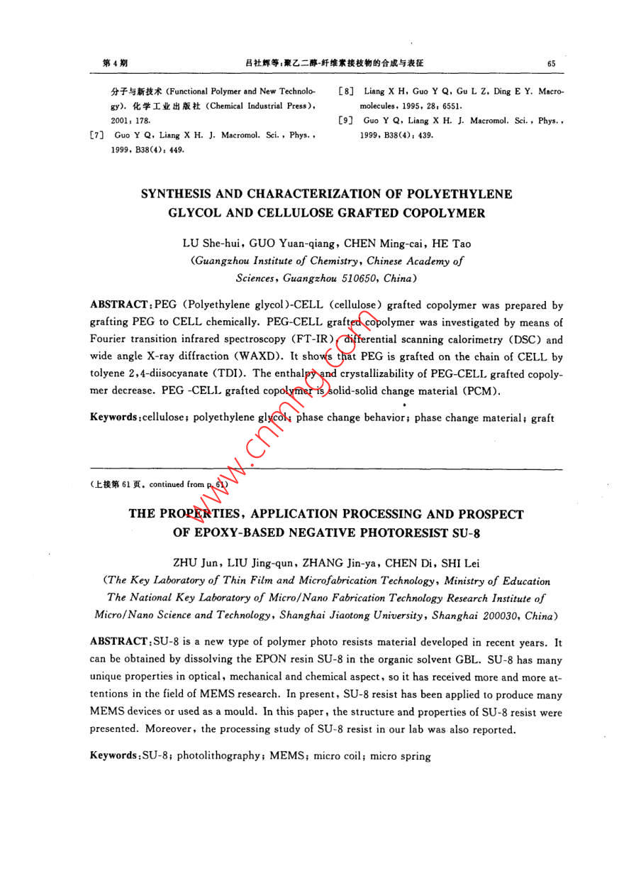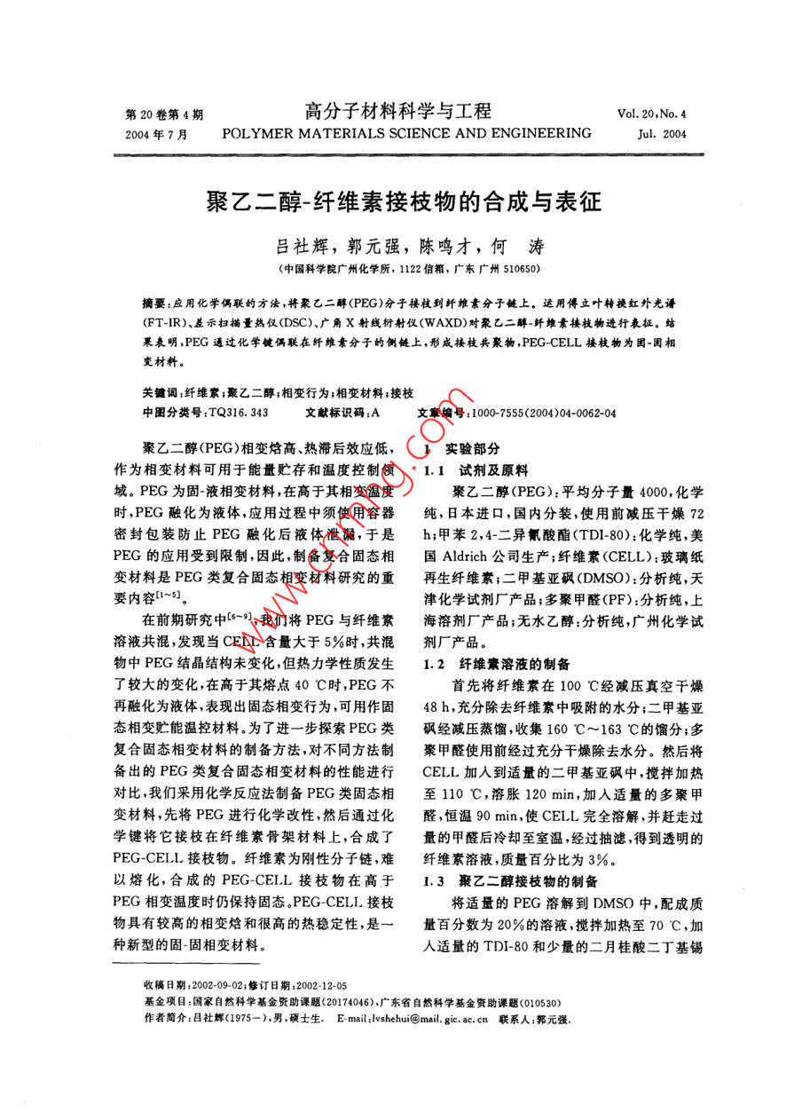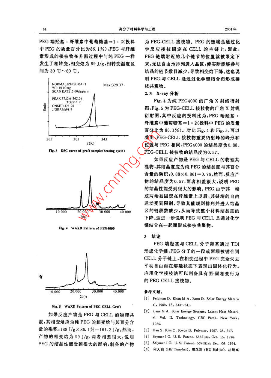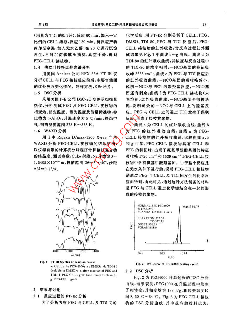 第20卷第4期高分子材料科學與工程Vol 20. No 42004 F7 B POLYMER MATERIALS SCIENCE AND ENGINEERINGJul.2004聚乙二醇纖維素接枝物的合成與表征呂社輝,郭元強,陳鳴才,何濤(中國科學院廣州化學所,1122信箱,廣東廣州510650)摘要:應(yīng)用化學偶聯(lián)的方法,將聚乙二醇(PEG)分子接枝到纖維素分子鏈上。運用傅立葉轉(zhuǎn)挾換紅外光語FT-IR)、羞示掃描量熱儀(DSC)、廣角X射線樹射儀(WAXD)對聚乙二醵纖維素接枝物進行裹征。蛄果表明,PEG通過化學鍵偶聯(lián)在纖維素分子的側(cè)鏈上,形成接枝共聚物, PEG-CELL接枝物為-固相變材料。關(guān)鍵詞:纖維素;聚乙二醇;相變行為;相變材料;接枝中圖分類號:TQ316.343文獻標識碼:A文章編號:10007555(2004)04-0062-04聚乙二醇(PEG)相變焓高、熱滯后效應(yīng)低,1實驗部分作為相變材料可用于能量貯存和溫度控制領(lǐng)1.1試劑及原料域。PEG為固-液相變材料,在高于其相變溫度聚乙二醇(PEG):平均分子量4000,化學時,PEG融化為液體,應(yīng)用過程中須使用容器純,日本進口,國內(nèi)分裝,使用前減壓干燥72密封包裝防止PEG融化后液體泄漏,于是h;甲苯2,4二異氰酸酯(TDl-80);化學純,美PEG的應(yīng)用受到限制因此,制備復(fù)合固態(tài)相國 Aldrich公司生產(chǎn);纖維素(CELL):玻璃紙變材料是PEG類復(fù)合固態(tài)相變材料研究的重再生纖維素;二甲基亞砜(DMSO):分析純,天要內(nèi)容~5津化學試劑廠產(chǎn)品;多聚甲醛(PF):分析純,上在前期研究中”,我們將PEG與纖維素海溶劑廠產(chǎn)品;無水乙醇:分析純,廣州化學試溶液共混,發(fā)現(xiàn)當CELL含量大于5%時,共混劑廠產(chǎn)品。物中PEG結(jié)晶結(jié)構(gòu)未變化,但熱力學性質(zhì)發(fā)生1.2纖維素溶液的制備了較大的變化,在高于其熔點40℃時,PEG不首先將纖維素在100℃經(jīng)減壓真空干燥再融化為液體,表現(xiàn)出固態(tài)相變行為,可用作固48h,充分除去纖維素中吸附的水分;二甲基亞態(tài)相變貯能溫控材料。為了進一步探索PEG類砜經(jīng)減壓蒸餾,收集160℃~163℃的餾分;多復(fù)合固態(tài)相變材料的制備方法,對不同方法制聚甲醛使用前經(jīng)過充分干燥除去水分。然后將備出的PEG類復(fù)合固態(tài)相變材料的性能進行CEL加入到適量的二甲基亞砜中,攪拌加熱對比我們采用化學反應(yīng)法制備PEG類固態(tài)相至110℃,溶脹120min,加入適量的多聚甲變材料,先將PEG進行化學改性然后通過化醛恒溫90min,使CEL完全溶解,并趕走過學鍵將它接枝在纖維素骨架材料上,合成了量的甲醛后冷卻至室溫,經(jīng)過抽濾,得到透明的PEG-CELL接枝物。纖維素為剛性分子鏈,難纖維素溶液質(zhì)量百分比為3%。以熔化,合成的 PEG-CELL接枝物在高于1.3聚乙二醇接枝物的制備PEG相變溫度時仍保持固態(tài)。 PEG-CELI接枝將適量的PEG溶解到DMSO中,配成質(zhì)物具有較高的相變焓和很高的熱穩(wěn)定性,是一量百分數(shù)為20%的溶液,攪拌加熱至70℃,加種新型的固固相變材料人適量的TD-80和少量的二月桂酸二丁基錫收稿日期:2002-09-02;修訂日期:2002-12-05基金項目:國家自然科學基金資助課題(20174046)廣東省自然科學基金資助課題(010530作者簡介:呂社輝(1975-),男,碩土生,E-mail:Ivshehui@mail.gie,ae.cn聯(lián)系人:郭元強第4期呂社解等:聚乙二醇纖維素接枝物的合成與表征(用量為TD的0.1%),反應(yīng)60min。加入一定化學反應(yīng)用FTIR分別分析了CELL、PF比例的CELL溶液,反應(yīng)120min。待反應(yīng)產(chǎn)物DMSO、TDI-80、PEG與TDI反應(yīng)后、PB冷卻至室溫,加入無水乙醇,在70℃進行沉淀CELL接枝物的紅外吸收,對反應(yīng)過程紅外測再生,再對沉淀物減壓抽濾,真空干燥,得到試結(jié)果見Fg.1中曲線a~g曲線。曲線d為PEG-CELL接技物。TDI-80的紅外吸收曲線,其濃度與反應(yīng)過程中1.4傅立葉轉(zhuǎn)換紅外光譜分析的TD-80的濃度相同,一NCO基團的特征吸用美國 Analect公司RFX-65AFT-IR儀收峰2268cm-1;曲線e為PEG與TDI反應(yīng)后分析CELL與PEG接枝反應(yīng)前后,主要官能團的紅外吸收曲線,一NCO基團的吸收峰減小,的紅外吸收變化情況。制樣方法,KBr壓片說明一NCO與PEG的端羥基反應(yīng),一NCO基1.5DSC分析團還有剩余;曲線f為PEG-CELL接枝物(未采用美國PE公司DSC-2C型差示掃描量除溶劑)紅外吸收曲線,一NCO基團全部被消熱儀,分析測試PEG及 PEG-CELL接枝物的耗,說明剩余的一NCO與CELL上的羥基反相變焓、相變溫度。銦為溫度及能量標準物,參應(yīng)。PEG與CELL之間通過TDI發(fā)生了偶聯(lián)比物為a-Al2O3,升溫速率為5℃/min,靜態(tài)空反應(yīng),形成了接枝共聚物。氣,掃描溫度范圍273K~373K。曲線a為CELL的紅外吸收曲線,曲線b16WAXD分析為PEG的紅外吸收曲線,曲線g為PEG用日本 Rigaku d/max-1200X-ray廣角CELL接枝物的紅外吸收曲線,比較曲線a,bWAXD分析 PEG-CELL接枝物的結(jié)晶結(jié)構(gòu),和g可知, PEG-CELL接枝物具有CELL和以儀器自帶的計算機分峰程序計算接枝復(fù)合物PEG的特征峰出現(xiàn)了氨基甲酸酯基團的特征的結(jié)晶度。測試參數(shù):Cuka射線,Ni片濾波λ=吸收峰1726cm-和1539cm-1, PEG-CELI接1.5405×10-10m,掃描范圍20=6°~40°,步距枝物中含有氨基甲酸酯基團。由于整個反應(yīng)是△26=0.1°/s。在無水條件下進行的,說明 PEG-CELL接枝物是通過PEG與CELL及TDI間發(fā)生的化學反應(yīng)而得到由此可見,通過這種方法制備的材料是PEG與CELL通過化學鍵結(jié)合在一起而形成的接枝共聚物NORMALMax:334.78SCAN R