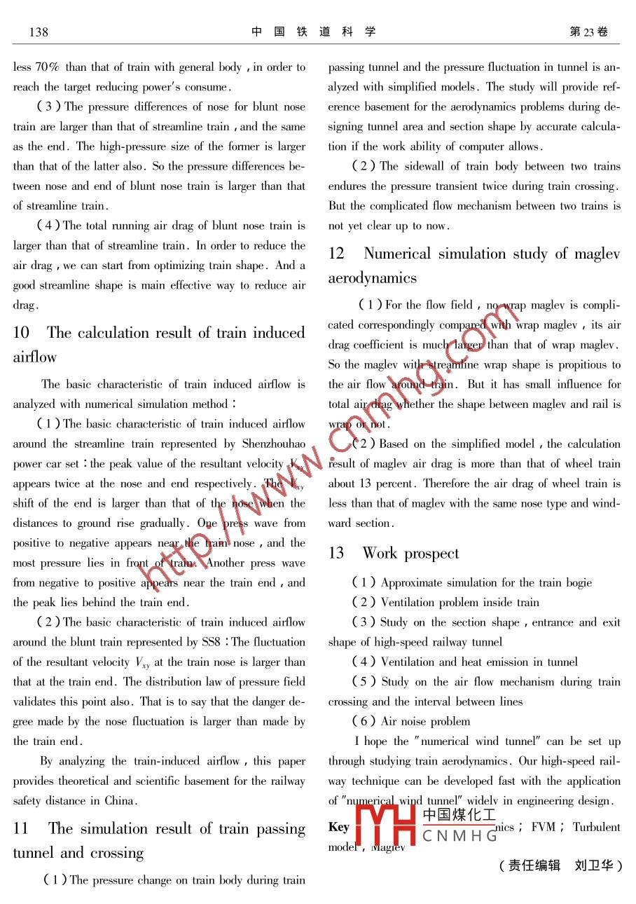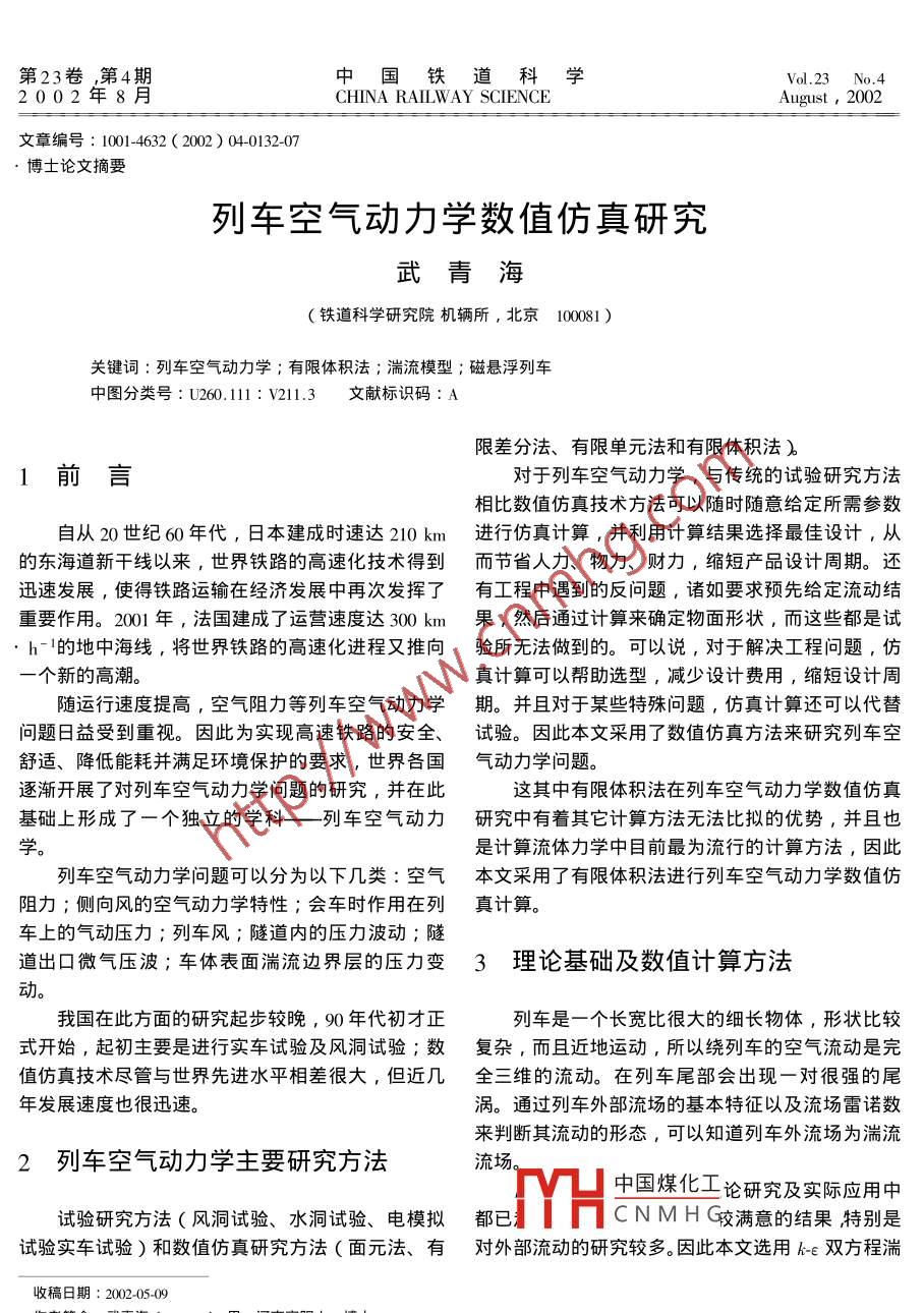 第23卷,第4期中國鐵道科學(xué)2002年8月CHINA RAILWAY SCIENCEAugust, 2002文章編號(hào):1001-4632(2002)04013207博士論文摘要列車空氣動(dòng)力學(xué)數(shù)值仿真研究武青海鐵道科學(xué)研究院機(jī)輛所,北京100081)關(guān)鍵詞:列車空氣動(dòng)力學(xué);有限體積法;湍流模型;磁懸浮列車中圖分類號(hào):U260.111:V211.3文獻(xiàn)標(biāo)識(shí)碼:A限差分法、有限單元法和有限體積法)1前言對(duì)于列車空氣動(dòng)力學(xué),與傳統(tǒng)的試驗(yàn)研究方法相比數(shù)值仿真技術(shù)方法可以隨時(shí)隨意給定所需參數(shù)自從20世紀(jì)60年代,日本建成時(shí)速達(dá)210km進(jìn)行仿真計(jì)算,并利用計(jì)算結(jié)果選擇最佳設(shè)計(jì),從的東海道新干線以來,世界鐵路的高速化技術(shù)得到而節(jié)省人力、物力、財(cái)力,縮短產(chǎn)品設(shè)計(jì)周期。還迅速發(fā)展,使得鐵路運(yùn)輸在經(jīng)濟(jì)發(fā)展中再次發(fā)揮了有工程中遇到的反問題,諸如要求預(yù)先給定流動(dòng)結(jié)重要作用。2001年,法國建成了運(yùn)營速度達(dá)300km果,然后通過計(jì)算來確定物面形狀,而這些都是試h-的地中海線,將世界鐵路的高速化進(jìn)程又推向驗(yàn)所無法做到的??梢哉f,對(duì)于解決工程問題,仿個(gè)新的高潮。真計(jì)算可以幫助選型,減少設(shè)計(jì)費(fèi)用,縮短設(shè)計(jì)周隨運(yùn)行速度提高,空氣阻力等列車空氣動(dòng)力學(xué)期。并且對(duì)于某些特殊問題,仿真計(jì)算還可以代替問題日益受到重視。因此為實(shí)現(xiàn)高速鐵路的安全、試驗(yàn)。因此本文采用了數(shù)值仿真方法來研究列車空舒適、降低能耗并滿足環(huán)境保護(hù)的要求,世界各國氣動(dòng)力學(xué)問題。逐漸開展了對(duì)列車空氣動(dòng)力學(xué)問題的研究,并在此這其中有限體積法在列車空氣動(dòng)力學(xué)數(shù)值仿真基礎(chǔ)上形成了一個(gè)獨(dú)立的學(xué)科——列車空氣動(dòng)力研究中有著其它計(jì)算方法無法比擬的優(yōu)勢(shì),并且也學(xué)是計(jì)算流體力學(xué)中目前最為流行的計(jì)算方法,因此列車空氣動(dòng)力學(xué)問題可以分為以下幾類:空氣本文采用了有限體積法進(jìn)行列車空氣動(dòng)力學(xué)數(shù)值仿阻力;側(cè)向風(fēng)的空氣動(dòng)力學(xué)特性;會(huì)車時(shí)作用在列真計(jì)算。車上的氣動(dòng)壓力;列車風(fēng);隧道內(nèi)的壓力波動(dòng);隧道出口微氣壓波;車體表面湍流邊界層的壓力變3理論基礎(chǔ)及數(shù)值計(jì)算方法動(dòng)我國在此方面的研究起步較晚,90年代初才正列車是一個(gè)長寬比很大的細(xì)長物體,形狀比較式開始,起初主要是進(jìn)行實(shí)車試驗(yàn)及風(fēng)洞試驗(yàn);數(shù)復(fù)雜,而且近地運(yùn)動(dòng),所以繞列車的空氣流動(dòng)是完值仿真技術(shù)盡管與世界先進(jìn)水平相差很大,但近幾全三維的流動(dòng)。在列車尾部會(huì)出現(xiàn)一對(duì)很強(qiáng)的尾年發(fā)展速度也很迅速渦。通過列車外部流場(chǎng)的基本特征以及流場(chǎng)雷諾數(shù)來判斷其流動(dòng)的形態(tài),可以知道列車外流場(chǎng)為湍流2列車空氣動(dòng)力學(xué)主要研究方法流場(chǎng)I凵中國煤化工論研究及實(shí)際應(yīng)用中試驗(yàn)研究方法(風(fēng)洞試驗(yàn)、水洞試驗(yàn)、電模擬都已CNMHG校滿意的結(jié)果特別是試驗(yàn)實(shí)車試驗(yàn))和數(shù)值仿真研究方法(面元法、有對(duì)外部流動(dòng)的研究較多。因此本文選用kε雙方程湍收稿日期:200205作者簡介方據(jù)"3-),男,河南安陽人,博士第4期博士論文摘要133流模型來研究列車空氣動(dòng)力學(xué)問題?!鱵23G,△xYH2k-ε雙方程湍流模型的求解方程組由以下基本Re△y2ayRe1△z方程組成連續(xù)方程變換后得到最終形式dU dF dg dHdFdG雷諾方程H△d2+(△xm△ym△zm…)0+pax,=p、少當(dāng)a3,y分別取值小于或遠(yuǎn)小于m時(shí)所采用的網(wǎng)格和差分格式才能比較正確地計(jì)入各方向的粘性貢獻(xiàn)。因此在α3,γ分別取值m時(shí)就可以得到dx: a湍動(dòng)能k方程臨界網(wǎng)格間距值Δx*、Δy*、△z*。Ig hIgErak, duiau'. dg△z=gRe湍流耗散率ε方程5計(jì)算域的選取2u dump在仿真計(jì)算中,一般采取有限計(jì)算域來代替無2限計(jì)算域,計(jì)算域的大小直接影響到計(jì)算結(jié)果的可dx dx: d信程度。但是對(duì)于不同類型計(jì)算對(duì)象,其計(jì)算域的ut;/u’;du’;du大小不能一概而論,所以需要具體問題具體對(duì)待。ax. ax adx: d本論文中的計(jì)算域的選取采取了試算分析的方法確au';o’oua-u'定。在對(duì)于計(jì)算域的選取中,試算方法不失為一種有效的方法數(shù)值計(jì)算方法采用有限體積法中常用的SIPE( Semi-Implicit Method for Pressure-Linked Equa6移動(dòng)網(wǎng)格技術(shù)ions)求解離散方程組。在列車交會(huì)和過隧道的瞬態(tài)計(jì)算中,存在計(jì)算4貼體網(wǎng)格間距的確定對(duì)象之間的相對(duì)運(yùn)動(dòng),利用移動(dòng)網(wǎng)格來模擬物體之間的相對(duì)運(yùn)動(dòng),可以很好地進(jìn)行處理移動(dòng)網(wǎng)格界面三維流動(dòng)無量綱化的NS方程之間的邊界條件。dU dF aG dH在移動(dòng)網(wǎng)格的一些實(shí)際應(yīng)用中,計(jì)算域的大F dG aH在計(jì)算過程中有很大變化,此時(s