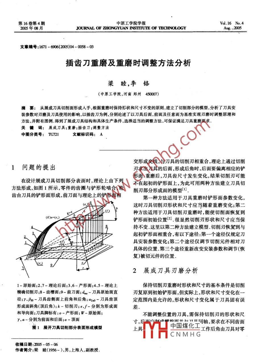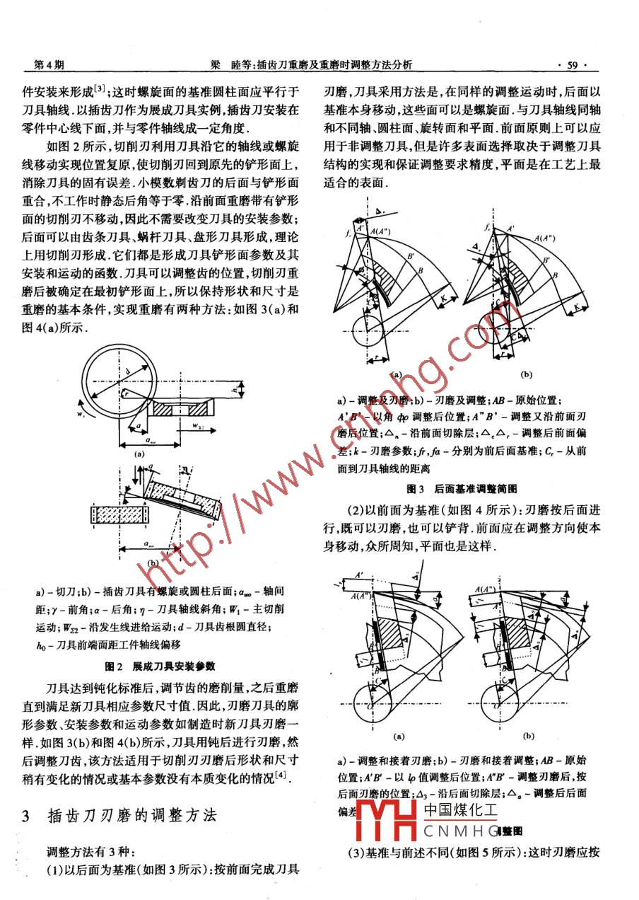 第16卷第4期中原工學(xué)院學(xué)報(bào)Vol 16 No 42005年08月JOURNAL OF ZHONGYUAN INSTITUTE OF TECHNOLOGYAug.,2005文章編號(hào):161-60100080插齒刀重磨及重磨時(shí)調(diào)整方法分析梁睦,李鉻(中原工學(xué)院,河南鄭州450007摘要:從展成刀具切削面形成入手,根據(jù)重磨時(shí)保持形狀和尺寸不變的原則建立了切削部分的模型,分析了刀具安裝參數(shù)對(duì)刃磨及刀具使用的影響,以插齒刀為例,分別論述了以刀具后面前面及任意面為基準(zhǔn)實(shí)現(xiàn)刃磨時(shí)調(diào)整原理和方法,并附有圖例得到了展成刀具結(jié)構(gòu)和具體生產(chǎn)條件,選擇適當(dāng)?shù)恼{(diào)整方法,可保證滿足刀具重磨要求關(guān)鑣詞:展成刀具;重磨;插齒刀;調(diào)整方法中圖分類號(hào):TG721文獻(xiàn)標(biāo)識(shí)碼:A交形成交線,與刀具的切削刃相重合,理論上通過切削1問題的提出刃求出刀具的后面,形成后角時(shí),后面要偏離相應(yīng)的鏟形面重磨后,刀具齒尺寸發(fā)生變化,結(jié)果切削刃可能方法形成如圖1所示零件的齒圈與鏟形輪嚙合輪削刃部分形成面的模型在設(shè)計(jì)展成刀具切削部分表面時(shí),理論上由下列不在起初的鏟形面上,為此可用兩種方法建立刀具切齒由刀具的鏟形面形成,前刀面與理論上的鏟形面相第一種方法適用于刀具重磨時(shí)鏟形面參數(shù)變化,這時(shí)刀具切削刃形狀和尺寸應(yīng)當(dāng)隨著重磨變化;第二種方法適用于刀具切削刃重磨時(shí),能使切削面恢復(fù)到(K)a=(e,)鏟形面初始位置2.很顯然切削刃形狀和尺寸應(yīng)當(dāng)保持不變這里以第二種方法建立模型切削刃恢復(fù)到與起初鏟形面相重合,有以下途徑:第一個(gè)途徑僅規(guī)定刀具安裝參數(shù)變化;第二個(gè)途徑僅調(diào)節(jié)切削元件相對(duì)刀具體的位置第三個(gè)途徑重新改變安裝參數(shù)和調(diào)節(jié)(恢復(fù))被切元件的位置.2展成刀具刃磨分析1-原始面;2、7-理論后面;36-產(chǎn)形面;4、5-理論上保持切削刃重磨時(shí)形狀和尺寸的基本條件是切削精確切削刃;8-齒槽面;9-前刀面;d-刀具原始面直刃復(fù)原到初始鏟形面,但實(shí)際上,形狀和尺寸變化在一徑;y,B-刀具齒側(cè)面上前角和后角刀具齒頂定范圍內(nèi)是允許的,形狀和尺寸變化屬于刀具固有誤形成面斜角(頂后角);k-切削刃;e,f-分別為形成面差導(dǎo)向面;刀具腳標(biāo)有:o-產(chǎn)形面;W-原始面;不能調(diào)整位置的刀具,需保持切削刃的形狀和尺y,a-分別為前面和后面;a-頂面寸始而普開日同軸,要求在不同齒面圖1展開刀具切削部分表面形成模型上具中國煤化工工作后角由刀具對(duì)零CNMHG收稿日期:2005-05-06作者簡(jiǎn)介:梁睦(1956-),男,上海人,副教授第4期梁睦等插齒刀重磨及重磨時(shí)調(diào)整方法分6件安裝來形成3;這時(shí)螺旋面的基準(zhǔn)圓柱面應(yīng)平行于刃磨,刀具采用方法是,在同樣的調(diào)整運(yùn)動(dòng)時(shí),后面以刀具軸線以插齒刀作為展成刀具實(shí)例插齒刀安裝在基準(zhǔn)本身移動(dòng)這些面可以是螺旋面與刀具軸線同軸零件中心線下面,并與零件軸線成一定角度和不同軸圓柱面、旋轉(zhuǎn)面和平面前面原則上可以應(yīng)如圖2所示,切削刃利用刀具沿它的軸線或螺旋用于非調(diào)整刀具,但是許多表面選擇取決于調(diào)整刀具線移動(dòng)實(shí)現(xiàn)位置復(fù)原,使切削刃回到原先的鏟形面上,結(jié)構(gòu)的實(shí)現(xiàn)和保證調(diào)整要求精度,平面是在工藝上最消除刀具的固有誤差.小模數(shù)剃齒刀的后面與鏟形面適合的表面重合,不工作時(shí)靜態(tài)后角等于零沿前面重磨帶有鏟形面的切削刃不移動(dòng),因此不需要改變刀具的安裝參數(shù);后面可以由齒條刀具、蝸桿刀具、盤形刀具形成,理論上用切削刃形成它們都是形成刀具鏟形面參數(shù)及其安裝和運(yùn)動(dòng)的函數(shù).刀具可以調(diào)整齒的位置,切削刃重磨后被確定在最初鏟形面上,所以保持形狀和尺寸是重磨的基本條件,實(shí)現(xiàn)重磨有兩種方法:如圖3(a)和圖4(a)所示(a)a)-調(diào)整及刃磨;b)-刃磨及調(diào)整;AB-原始位置;AB'-以角中調(diào)整后位置;A"B’-調(diào)整又沿前面刃磨后位置;△。-沿前面切除層;△。△,-調(diào)整后前面偏差;k-刃磨參數(shù);斤,瓜-分別為前后面基準(zhǔn);C-從前面到刀具軸線的距離圖3后面基準(zhǔn)調(diào)整簡(jiǎn)圖(2)以前面為基準(zhǔn)(如圖4所示):刃磨按后面進(jìn)行,既可以刃磨,也可以鏟背前面應(yīng)在調(diào)整方向使本身移動(dòng),眾所周知,平面也是這樣.a)-切刀;b)-插齒刀具有螺旋或圓柱后面;a-軸間距;y-前角;a-后角;-刀具軸線斜角;啊1-主切削運(yùn)動(dòng);W2-沿發(fā)生線進(jìn)給運(yùn)動(dòng);d-刀具齒根圓直徑;而-刀具前端面距工件軸線偏移圖2展成刀具安裝參數(shù)刀具達(dá)到鈍化標(biāo)準(zhǔn)后,調(diào)節(jié)齒的磨削量,之后重磨直到滿足新刀具相應(yīng)參數(shù)尺寸值因此,刃磨刀具的廓形參數(shù)、安裝參數(shù)和運(yùn)動(dòng)參數(shù)如制造時(shí)新刀具刃磨一樣如圖3(b)和圖4(b)所示,刀具用鈍后進(jìn)行刃磨,然(b)后調(diào)整刀齒,該方法適用于切削刃刃磨后形狀和尺寸a)-調(diào)整和接著刃磨;b)-刃磨和接著調(diào)整;AB-原始稍有變化的情況或基本參數(shù)沒有本質(zhì)變化的情況4.位置;A'B"