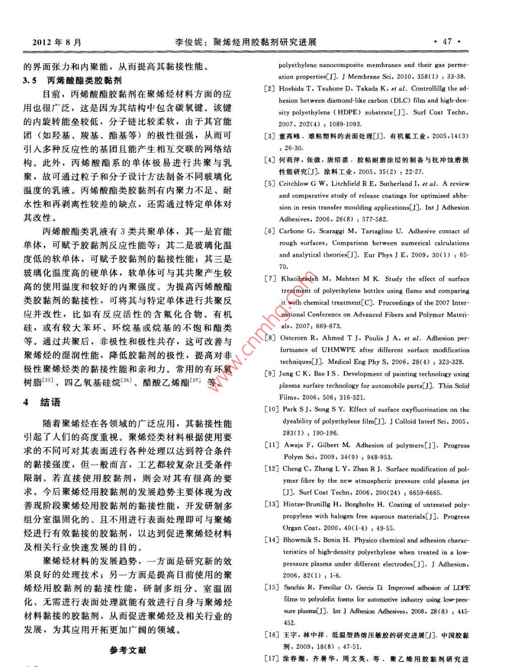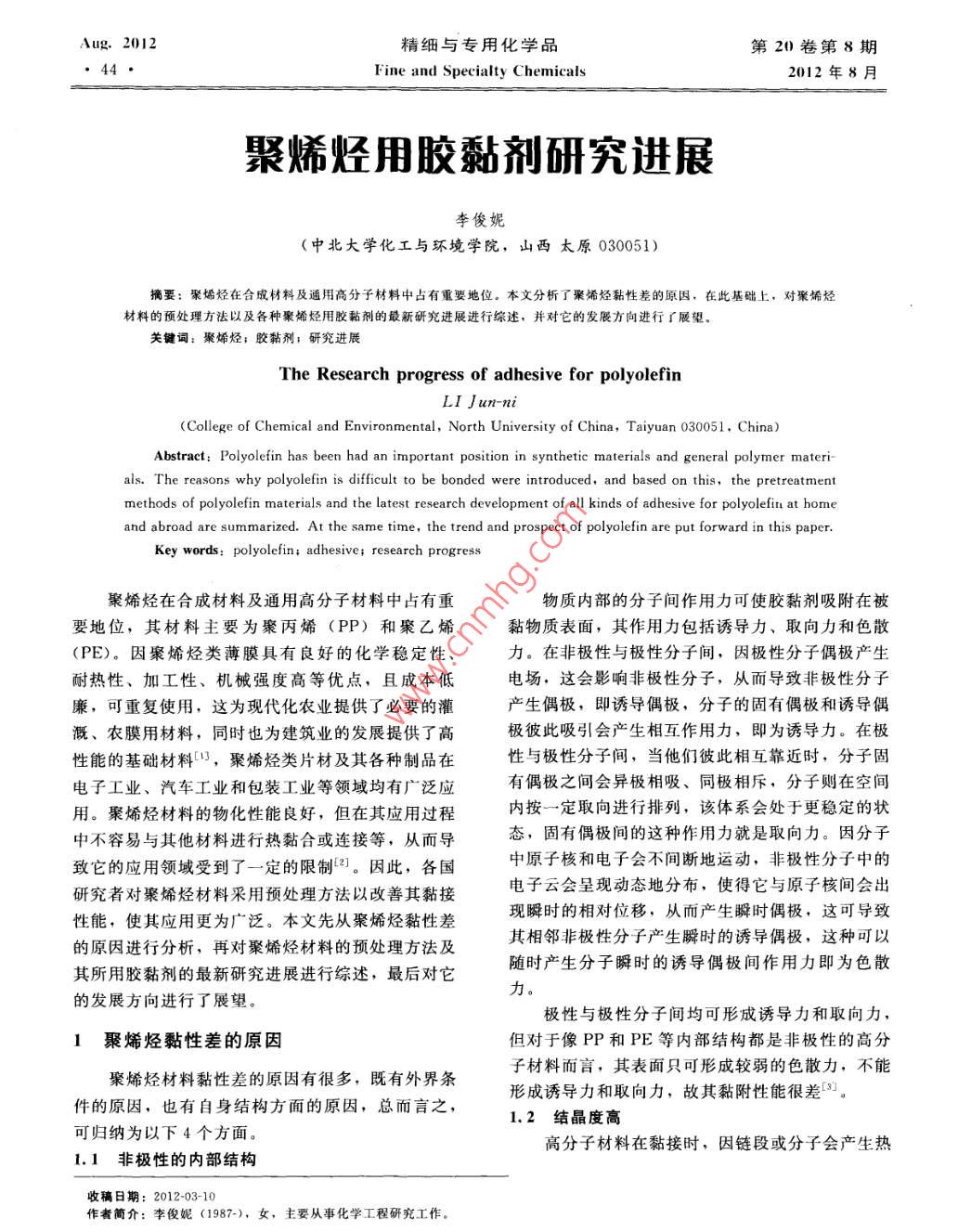 Aug. 2012精細與專用化學品第20卷第8期44●Fine and Specialty Chemicals2012年8月聚烯烴用膠黏劑研究進展李俊妮(中北大學化工與環(huán)境學院,山西太原030051)摘要:聚烯烴在合成材料及通用高分子材料中占有重要地位。本文分析了聚烯烴黏性差的原因,在此基礎(chǔ)上,對聚烯烴材料的預(yù)處理方法以及各種聚烯經(jīng)用膠黏劑的最新研究進展進行綜述,并對它的發(fā)展方向進行r展望。關(guān)鍵詞:聚烯烴;膠黏劑;研究進展The Research progress of adhesive for polyolefinLI Jun-ni(College of Chemical and Environmental, North University of China, Taiyuan 030051. China)Abstract: Polyolefin has been had an important position in synthetic materials and general polymer materi-als. The reasons why polyolefin is difficult to be bonded were introduced, and based on this, the pretreatmentmethods of polyolefin materials and the latest research development of all kinds of adhesive for polyolefin at homeand abroad are summarized. At the same time, the trend and prospect of polyolefin are put forward in this paper.Key words: polyolefin; adhesive; research progress聚烯烴在合成材料及通用高分子材料中占有重物質(zhì)內(nèi)部的分子間作用力可使膠黏劑吸附在被要地位,其材料主要為聚丙烯(PP) 和聚乙烯黏物質(zhì)表面,其作用力包括誘導(dǎo)力、取向力和色散(PE)。因聚烯烴類薄膜具有良好的化學穩(wěn)定性、力。在非極性與極性分子間,因極性分子偶極產(chǎn)生耐熱性、加工性、機械強度高等優(yōu)點,且成本低電場,這會影響非極性分子,從而導(dǎo)致非極性分子廉,可重復(fù)使用,這為現(xiàn)代化農(nóng)業(yè)提供了必要的灌產(chǎn)生偶極,即誘導(dǎo)偶極,分子的固有偶極和誘導(dǎo)偶溉、農(nóng)膜用材料,同時也為建筑業(yè)的發(fā)展提供了高極彼此吸引會產(chǎn)生相互作用力,即為誘導(dǎo)力。在極性能的基礎(chǔ)材料[,聚烯烴類片材及其各種制品在性與極性分子間,當他們彼此相互靠近時,分子固電子工業(yè)、汽車工業(yè)和包裝工業(yè)等領(lǐng)域均有廣泛應(yīng)有偶極之間會異極相吸、同極相斥,分子則在空間用。聚烯烴材料的物化性能良好,但在其應(yīng)用過程內(nèi)按一定取向進行排列,該體系會處于更穩(wěn)定的狀中不容易與其他材料進行熱黏合或連接等,從而導(dǎo)態(tài),固有偶極間的這種作用力就是取向力。因分子致它的應(yīng)用領(lǐng)域受到了一定的限制[2]。因此,各國中原子核和電子會不間斷地運動,非極性分子中的研究者對聚烯烴材料采用預(yù)處理方法以改善其黏接電子云會呈現(xiàn)動態(tài)地分布,使得它與原子核間會出性能,使其應(yīng)用更為廣泛。本文先從聚烯烴黏性差現(xiàn)瞬時的相對位移,從而產(chǎn)生瞬時偶極,這可導(dǎo)致的原因進行分析,再對聚烯烴材料的預(yù)處理方法及其相鄰非極性分子產(chǎn)生瞬時的誘導(dǎo)偶極,這種可以其所用膠黏劑的最新研究進展進行綜述,最后對它隨時產(chǎn)生分子瞬時的誘導(dǎo)偶極間作用力即為色散的發(fā)展方向進行了展望。極性與極性分子間均可形成誘導(dǎo)力和取向力,1聚烯烴黏性差的原因但對于像PP和PE等內(nèi)部結(jié)構(gòu)都是非極性的高分聚烯烴材料黏性差的原因有很多,既有外界條子材料而言,其表面只可形成較弱的色散力,不能件的原因,也有自身結(jié)構(gòu)方面的原因,總而言之,形成誘導(dǎo)力和取向力,故其黏附性能很差[]。1.2結(jié)晶度高可歸納為以下4個方面。高分子材料在黏接時,因鏈段或分子會產(chǎn)生熱1.1非極性的內(nèi)部結(jié)構(gòu)收稿日期: 2012-03-10作者簡介:李俊妮(1987-), 女,主要從事化學工程研究工作。2012年8月李俊妮:聚烯烴用膠黏劑研究進展運動,被黏物與膠黏劑各自的鏈段或分子可以相互2.1底漆促進劑法擴散,此時黏合界面就會消失,從而形成一個能產(chǎn)國外研究者提出一種新技術(shù),以提高聚烯烴的生牢固膠接過渡區(qū),這就是黏接擴散理論[]。聚烯黏接性,即聚烯烴在黏接前將其表面涂覆黏結(jié)促進烴材料的結(jié)晶度均較高,故化學穩(wěn)定性很好,相比劑和底漆,統(tǒng)稱為底膠。其實底膠自身并沒有黏接非結(jié)晶的高分子材料,其溶脹及溶解性能較差,當作用,但聚烯烴材料與其結(jié)合會有一定的相容性,溶劑型膠黏劑與它黏接時,因分子量大、分子鏈不且對膠黏劑也有極強的作用力。該技術(shù)操作簡單,易擴散和運動以及結(jié)晶度高等,其很難和膠黏劑分但所用底膠必須具有一定的極性,且針對性強。子間發(fā)生相互結(jié)合,且膠黏劑很難擴散到分子排列Hintzel等[13]提出3種不含鹵素的水溶性PP非常緊密的聚烯烴基體中,故他們之間不能形成很用黏接促進劑,其一是在紫外光條件下,對把疊氮有效的黏附作用?;已趸柰樽鳛橄嘣鋈軇┑乃苄阅z進行化學1.3 潤濕性能差反應(yīng),以在聚烯烴表面引人含氮基團;其二是在聚未固化前的膠黏劑一般呈流動狀態(tài)。膠黏劑在烯烴材料表面對含過氧化氫、乙酸和吡啶組分的,黏接物表面浸潤并固化的過程即為黏接過程,故膠且以FeCl3為催化劑的水溶性體系進行催化氧化反黏劑在被黏物表面充分鋪展且對被黏物表面的潤濕應(yīng);其三是在聚丙烯的烷基芳香性溶劑中接枝聚丙性能良好是膠黏劑能很好地黏接各種材料的主要條烯酸并將其作為黏接促進劑。前2種黏接均為化學件之一?;w材料與流動態(tà