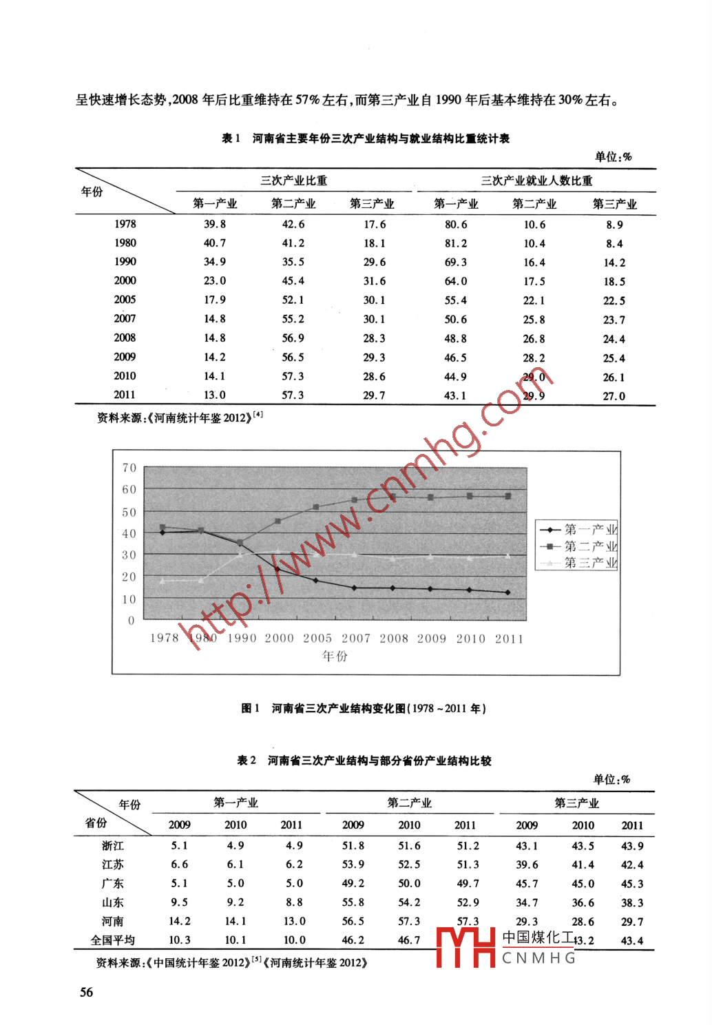 第27卷第4期河南財政稅務(wù)高等??茖W(xué)校學(xué)報Vol. 27. No.42013年8月Joumal of Henan College of Finance & TaxationAug, 2013河南省第三產(chǎn)業(yè)現(xiàn)狀研究許勤(鄭州大學(xué)商學(xué)院,河南鄭州450000)摘要]隨著改革開放的深入推進(jìn),河南經(jīng)濟(jì)保持著較快的發(fā)展速度,經(jīng)濟(jì)規(guī)模已躋身全國第一陣營,其中第三產(chǎn)業(yè)在河南經(jīng)濟(jì)發(fā)展中起著重要作用。但從總體來看,河南經(jīng)濟(jì)的產(chǎn)業(yè)結(jié)構(gòu)還不夠合理,第三產(chǎn)業(yè)比重過低,產(chǎn)業(yè)結(jié)構(gòu)與就業(yè)結(jié)構(gòu)失衡,第三產(chǎn)業(yè)內(nèi)部結(jié)構(gòu)有待進(jìn)一步調(diào)整。[關(guān)鍵詞]河南省;產(chǎn)業(yè)結(jié)構(gòu);第三產(chǎn)業(yè);就業(yè)結(jié)構(gòu)[中圖分類號]F264.1[文獻(xiàn)標(biāo)識碼]A [文章編號 ]1008 - 5793(2013)04 -0055 -05隨著全球經(jīng)濟(jì)的發(fā)展,發(fā)達(dá)國家經(jīng)濟(jì)已進(jìn)人了以第三產(chǎn)業(yè)為主導(dǎo)的經(jīng)濟(jì)發(fā)展模式,第三產(chǎn)業(yè)占經(jīng)濟(jì)總量的比重已超過50% ,有的甚至達(dá)到70%以上,如美國1970年第三產(chǎn)業(yè)比重就已達(dá)到64% ,近年來維持在76%左右。第三產(chǎn)業(yè)作為經(jīng)濟(jì)主體,已成為現(xiàn)代化經(jīng)濟(jì)的重要特征,第三產(chǎn)業(yè)的發(fā)展水平已成為衡量現(xiàn)代化經(jīng)濟(jì)發(fā)達(dá)程度的重要標(biāo)準(zhǔn)。改革開放以來,河南經(jīng)濟(jì)持續(xù)發(fā)展,河南省生產(chǎn)總值( GDP)從1978年的162. 92億元增加到2011年的26931.03億元,生產(chǎn)總值明顯高于中部六省中的其他五省(湖北、湖南、安徽、江西、山西),根據(jù)2011年的統(tǒng)計數(shù)據(jù),河南省經(jīng)濟(jì)總量位居全國第五,排在廣東省、山東省、江蘇省和浙江省之后,河南省經(jīng)濟(jì)已躋身全國第一-陣營"] ,第三產(chǎn)業(yè)生產(chǎn)產(chǎn)值也由1978年的28. 6億元增加到2011年的7991.72億元,取得了不錯的成績,但自1990年以來,河南省的第三產(chǎn)業(yè)便停止遞增態(tài)勢,連續(xù)多年在30%徘徊,同全國其他省市相比,排名居后列,2011年第三產(chǎn)業(yè)比重僅為29. 7% ,低于全國平均水平10.5個百分點,還不及北京的1/2[2]。-、河南省三次產(chǎn)業(yè)結(jié)構(gòu)層次不高從表I可以看出,1978年河南省三次產(chǎn)業(yè)結(jié)構(gòu)呈現(xiàn)出第二產(chǎn)業(yè)比重最大,第-產(chǎn)業(yè)次之,第三產(chǎn)業(yè)比重最低的“二、一、三”的低級狀態(tài),經(jīng)過多年發(fā)展和產(chǎn)業(yè)結(jié)構(gòu)調(diào)整,到2011年三次產(chǎn)業(yè)結(jié)構(gòu)已經(jīng)發(fā)展成為工業(yè)化過程的“二、三、- -” 格局[3。從表1和表2可看出,河南省第-產(chǎn)業(yè)比重由1978年的39.8%逐步調(diào)整為2011年的13%,高于全國平均水平及同時期其他主要經(jīng)濟(jì)大省水平,其中2011年浙江為5.1%、江蘇為6.6%、廣東為5. 1%、山東為9.5% ;第三產(chǎn)業(yè)則由1978年的17. 6% ,逐步調(diào)整為2011年的29. 7% ,低于同期浙江的43. 9%、江蘇的42.4%廣東的45.3%、山東的38.3%及全國平均水平43.4%。同全國其他主要經(jīng)濟(jì)省份相比,可以看到河南省在產(chǎn)業(yè)結(jié)構(gòu)優(yōu)化升級上的差距,主要體現(xiàn)在第-產(chǎn)業(yè)比重下降幅度和速度偏慢,第三產(chǎn)業(yè)的上升幅度和速度相對滯后。對比全國的三次產(chǎn)業(yè)結(jié)構(gòu)水平,河南省的產(chǎn)業(yè)結(jié)構(gòu)層次不高,尤其是第--產(chǎn)業(yè)比重明顯偏高,第三產(chǎn)業(yè)比重明顯偏低。近年來,河南省第三產(chǎn)業(yè)比重排名多次墊底,顯示出河南省產(chǎn)業(yè)結(jié)構(gòu)優(yōu)化升級速度明顯偏慢。這在河南省歷年產(chǎn)業(yè)結(jié)構(gòu)變化圖中也有所反映(如圖1所示) ,河南第- -產(chǎn)業(yè)自1980年到2007年呈現(xiàn)快速下降趨勢,2007年后下降趨勢減緩;第二產(chǎn)業(yè)自1990年到2008年.[收稿日期]2013 -04 -06[基金項目]河南省政府決策研究招標(biāo)課題(2012B639)中國煤化工[作者簡介]許勤( 1963- ) ,男,河南??h人,鄭州大學(xué)副教授,研究方向.HCNMHG.5:呈快速增長態(tài)勢,2008年后比重維持在57%左右,而第三產(chǎn)業(yè)自1990年后基本維持在30%左右。表1河南省主要年份三次產(chǎn)業(yè)結(jié)構(gòu)與就業(yè)結(jié)構(gòu)比重 統(tǒng)計表單位:%三次產(chǎn)業(yè)比重三次產(chǎn)業(yè)就業(yè)人數(shù)比重年份第一產(chǎn)業(yè)第二產(chǎn)業(yè)第三產(chǎn)業(yè)197839.842.617.680.610.68.9198040.741.218. 181.210.48.4199034.935.529.669.316. 414.2200023.045.431.664.017.518.5200517.952.130. 155.422.122.5200714.855.230.150.65.823.7200856.928.348.826.824.4200956. 529.346.528. 225.4201014.157.328.644.929.026.1201113.07.329.743.129. 927.0資料來源:《河南統(tǒng)計年鑒2012>[4]765+第一產(chǎn)業(yè)4一第二產(chǎn)業(yè)30201(978 1980 1990 2000 2005 2007 2008 2009 2010 2011圖1河南省三次產(chǎn)業(yè)結(jié)構(gòu)變化圖(1978 ~2011年)表2河南省三次產(chǎn)業(yè)結(jié)構(gòu)與部分省份產(chǎn)業(yè)結(jié)構(gòu)比較省份浙江5.14.951.851.651.243.543.9江蘇6.66.16.253.952.551.339.641.4.42.4廣東5.049.2.50.049.745.745.3山東9.59.28.855. 854.252.934.736.638.3河南56.5_57.329.. 3全國平均10.310. 110.046.246.7中國煤化工43.243.4資料來源:《