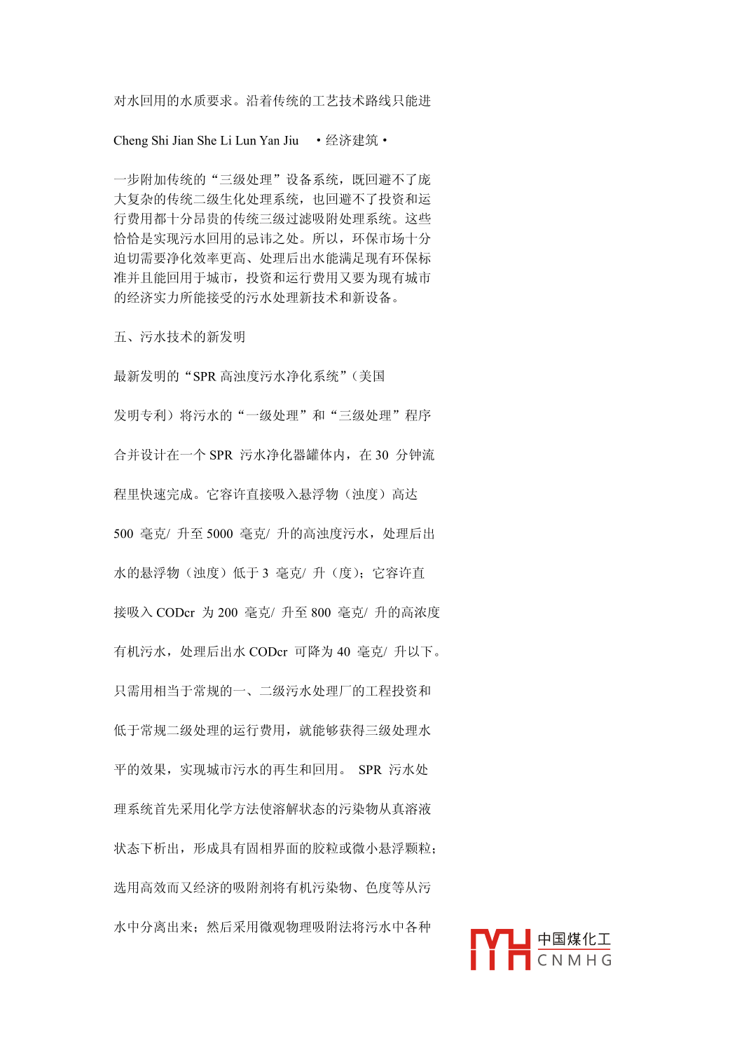 淺析高效污水處理技術(shù)寧志強(qiáng)徐麗清(1許昌市市政實(shí)業(yè)有限公司,河南許昌461000)許昌瑞貝卡水業(yè)有限公司,河南許昌461000)摘要:本文介紹了活性污泥法的一種變型SPR技術(shù)及其近年來(lái)在國(guó)內(nèi)外的發(fā)展前景,對(duì)SPR工藝操作周期的四個(gè)主要順序,即進(jìn)水、曝氣、沉淀、潷水四個(gè)階段作了分析,并闡述了在我國(guó)應(yīng)用SPR技術(shù)的幾個(gè)工程實(shí)例及其運(yùn)行參數(shù),以供參考。關(guān)鍵詞:高效;污水;處理技術(shù)污水處理廠廠址的選定污水處理廠址的選定是城市和工業(yè)區(qū)的總體規(guī)劃的組成部分。廠址的選擇同城市和工業(yè)區(qū)排水管道的布置、處理后污水出路密切相關(guān),應(yīng)進(jìn)行深入的調(diào)查研究和技術(shù)經(jīng)濟(jì)比較,并應(yīng)考慮以下原則: 1、 廠址必須位于給水水源的下游;如果城鎮(zhèn)、工業(yè)區(qū)和生活區(qū)位于河流附近,廠址必須在它們的下游,而且要在夏季主風(fēng)向的下風(fēng)向,并應(yīng)同城鎮(zhèn)、工業(yè)區(qū)、生活區(qū)以及農(nóng)村居民點(diǎn)保持一-定的距離, 但又不宜太遠(yuǎn),以免增加管道的長(zhǎng)度。2、廠址應(yīng)盡可能與處理后出水的主要去向(如灌溉農(nóng)田)或受納水體靠近。3、充分利用地形,選擇有適當(dāng)坡度的地區(qū),以滿足污水處理構(gòu)筑物和設(shè)備高程布置的需要,節(jié)省能源和動(dòng)力。4、盡可能少占和不占農(nóng)田,并考慮有發(fā)展的可能性。二、污水處理處理工藝流程污水處理廠的處理工藝流程以及處理構(gòu)筑物和設(shè)備型式的選定是污水處理廠設(shè)計(jì)的重要環(huán)節(jié)。確定污水處理工藝流程的主要依據(jù)是污水所需要達(dá)到的處理程度,而處理程度則取決于處理后出水的去向。處理后的出水如果排入水體,則污水的處理程度既要能夠充分利用水體自凈能力,又要防止水體遭到污染。不考慮水體自凈能力,而任意采用高級(jí)處理方法是不經(jīng)濟(jì)的,但也不宜將水體自凈能力耗盡,要留有余地。處理后污水如中國(guó)煤化工用于灌溉農(nóng)田,污水水質(zhì)應(yīng)達(dá)到所要求的標(biāo)準(zhǔn)。處理后MYHCNMH G的出水如果回用于工業(yè)企業(yè)或城市建設(shè),要考慮兩種情況:直接回用;作某些補(bǔ)充處理后再行回用。污水處理廠一般是以去除BOD (生化需氧量)物質(zhì)作為主要目標(biāo)。在大型污水處理廠中多采用以沉淀為中心的污水一級(jí)處理和以生物處理為中心的污水二級(jí)處理。有時(shí)為了去除氮、磷等物質(zhì),還在生物處理后,進(jìn)行污水三級(jí)處理。污水處理的產(chǎn)物一-初級(jí)沉淀池產(chǎn)生的污泥, 由污泥處理系統(tǒng)處理。污泥處理系統(tǒng)是污水處理廠的組成部分,污泥采用需氧消化和厭氧消化兩種方法處理(見(jiàn)污泥消化)。需氧消化多用于服務(wù)人口在5萬(wàn)以下的小型污水處理廠;而厭氧消化則普遍用于大中型污水處理廠。污泥處理的程序是:污泥濃縮、污泥厭氧消化、污泥干化、焚燒。工業(yè)廢水處理工藝流程的確定較為復(fù)雜,應(yīng)綜合考慮各方面的因素,如去除的主要對(duì)象,對(duì)處理出水水質(zhì)的要求,廢水的水量、水質(zhì)的變化等。對(duì)各種污染物可以采用的處理單元如表:處理工藝流程的排列順序,是先簡(jiǎn)單后復(fù)雜;從去除對(duì)象考慮,則先去除懸浮的污染物,然后去除膠體物質(zhì)和溶解性物質(zhì)。三、污水處理系統(tǒng)的升級(jí)SPR污水處理系統(tǒng)首先采用化學(xué)方法使溶解狀態(tài).的污染物從真溶液狀態(tài)下析出,形成具有固相界面的膠?;蛭⑿腋☆w粒;選用高效而又經(jīng)濟(jì)的吸附劑將有機(jī)污染物、色度等從污水中分離出來(lái);然后采用微觀物理吸附法將污水中各種膠粒和懸浮顆粒凝聚成大塊密實(shí)的絮體;再依靠旋流和過(guò)濾水力學(xué)等流體力學(xué)原理,在自行設(shè)計(jì)的SPR高濁度污水凈化器內(nèi)使絮體與水快速分離;清水經(jīng)過(guò)罐體內(nèi)自我形成的致密的懸浮泥層過(guò)濾之后,達(dá)到三級(jí)處理的水準(zhǔn),出水實(shí)現(xiàn)回用;污泥則在濃縮室內(nèi)高度濃縮,定期靠壓力排出,由于污泥含水率低,且脫水性能良好,可以直接送入機(jī)械脫水裝置,經(jīng)脫水之后的污泥餅亦可以用來(lái)制造人行城市建設(shè)理論研究●97 ●中國(guó)煤化工MYHCNMH G城市建設(shè)理論研究2011年10月25日道地磚,免除了二次污染。SPR污水處理系統(tǒng)與眾不同的技術(shù)特點(diǎn): 1、 城市生活污水和處理藥劑的混合主要是在泵前吸藥管道、污水泵葉輪、蛇形反應(yīng)管和瓷球反應(yīng)罐的組合作用下完成的,依照紊流速度、混.合時(shí)間、和水力學(xué)結(jié)構(gòu)數(shù)據(jù)設(shè)計(jì),得以十分充分的混合,為取得最佳混凝凈化效果和最大限度地節(jié)省藥劑創(chuàng)造了前提條件。這是過(guò)去常規(guī)的--級(jí)處理和二級(jí)處理之水工結(jié)構(gòu)所做不到的。2、SPR系統(tǒng)處理城市污水時(shí),采用五種以上污水處理藥劑及其最佳配方組合使用,靠化學(xué)反應(yīng)使污水中溶解狀態(tài)的有機(jī)污染物、重金屬離子和有害的鹽類從水中析出,成為有固相界面的