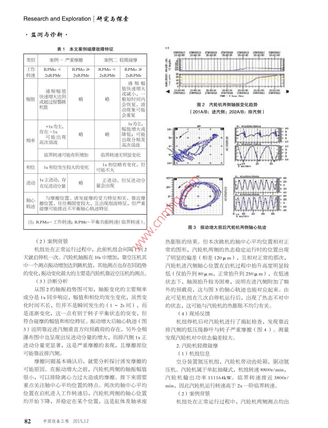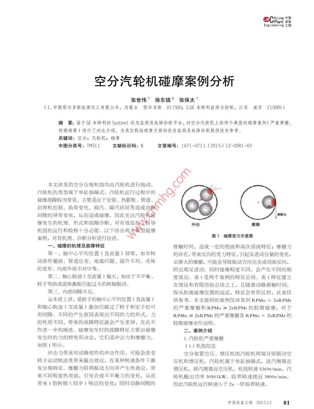 E Plan ga空分汽輪機碰摩案例分析張世偉徐東鎮(zhèn)2張保太1(1,中煤鄂爾多斯能源化工有限公司,內(nèi)蒙古鄂爾多斯017300;2GE本特利監(jiān)測與控制,江蘇南京210005)摘要:基于匪E本特利的 System1狀態(tài)監(jiān)測及故障診斷平臺,對空分汽輪機上的兩個典型的碰摩案例(嚴(yán)重摩擦」輕微碰摩)進行了對比介紹,為類似機組碰摩方面的狀態(tài)監(jiān)測及故障診斷提供技術(shù)參考關(guān)鍵詞:空分;汽輪機;碰摩中圖分類號:TM311文獻標(biāo)識碼:B文章編號:1671-0711(2015)12-0081-03本文涉及的空分壓縮機組均由汽輪機進行拖動汽輪機的類型屬于單缸抽凝式。汽輪機運行過程中的碰摩故障較為常見,主要是由于安裝、熱膨脹、管道啟停機控制、負(fù)荷變化、抽汽、凝汽狀況等造成動靜間隙的異常變化,從而造成碰摩。因此關(guān)注汽輪機碰摩發(fā)生的機理、形式和故障診斷,對有效監(jiān)控、指導(dǎo)機組的運行和檢修十分必要。以下結(jié)合兩個典型碰摩案例,對其機理、診斷分析進行論述。圖1碰摩受力示意圖一、碰摩的機理及故障特征接觸時間,造成一定的削波和高次諧波特征;摩擦力第一、軸中心平均位置(直流量)異常,如非轉(zhuǎn)的存在,帶來反向的受力特征,引起反進動分量的變化動部件翹曲、管道應(yīng)變、地基問題、溫升不均、殼體足夠大的摩擦,可能會導(dǎo)致振動方向完全或局部反向,的變形、內(nèi)部外部不對中等。即出現(xiàn)反進動。同時碰摩程度不同,會產(chǎn)生不同的剛第二、軸心軌跡(交流量)偏大,如由于不平衡度效應(yīng)。表1是兩個案例的特征總結(jié)。表1特征建立轉(zhuǎn)子彎曲或流體激振引起過大的轉(zhuǎn)軸振動。在理論和有限經(jīng)驗總結(jié)之上,且隨著動靜接觸時間,第三、內(nèi)部間隙不足探頭距離碰摩位置的遠近,特征會有所區(qū)別,此表僅從本質(zhì)上講,是轉(zhuǎn)子的軸中心平均位置(直流量供參考。本文提到的案例僅涉及到RPMo<2 XRPMr和軸心軌跡(交流量)疊加后超過了轉(zhuǎn)子和定子的可的嚴(yán)重摩擦和RPMo≥2 XRPMr的輕微碰摩,對于用間隙。不同的產(chǎn)生原因表現(xiàn)出不同的力的形式,力RPMo≥2 XRPMr的嚴(yán)重摩擦及RPMo<2 XRPMr的的性質(zhì)不同,帶來的故障特征就會產(chǎn)生差異,在此不輕微碰摩未作說明。作進一步的闡述。碰摩發(fā)生時的故障特征主要由碰摩案例介紹發(fā)生時的力的特性所決定,它們是沖擊力和摩擦力1.汽輪機嚴(yán)重摩擦如圖1所示。(1)機組信息沖擊力帶來對動靜部件的沖擊作用,可能會改變空分裝置空壓、增壓機組汽輪機兩端分別驅(qū)動空轉(zhuǎn)子運動軌跡及帶來敲擊效應(yīng),在某種轉(zhuǎn)速條件下激壓機和增壓機。汽輪機屬于單缸抽凝式,進汽側(cè)靠近發(fā)分頻特征。摩擦力阻礙振動方向并產(chǎn)生熱效應(yīng),帶增壓機,排汽側(cè)靠近空壓機。機組轉(zhuǎn)速5369/min,汽來不同程度熱彎曲,引發(fā)合成不平衡力的變化,從而輪機輸出功率30501kW。臨界轉(zhuǎn)速接近3800r/min,帶來1倍轉(zhuǎn)頻(同步)響應(yīng)的變化;同時動靜間隙的因此汽輪機運行轉(zhuǎn)速小于2x一階臨界轉(zhuǎn)速。中國設(shè)備工程2015.1281Research and Exploration|研寬與探索監(jiān)測與診新表1本文案例碰摩故障特征作RPM