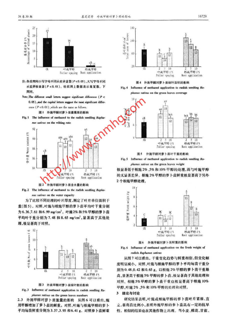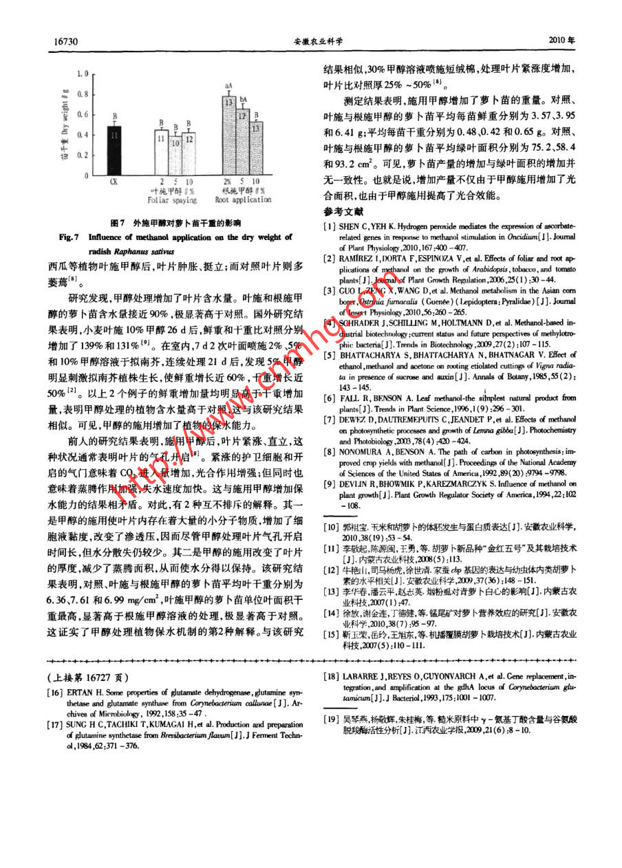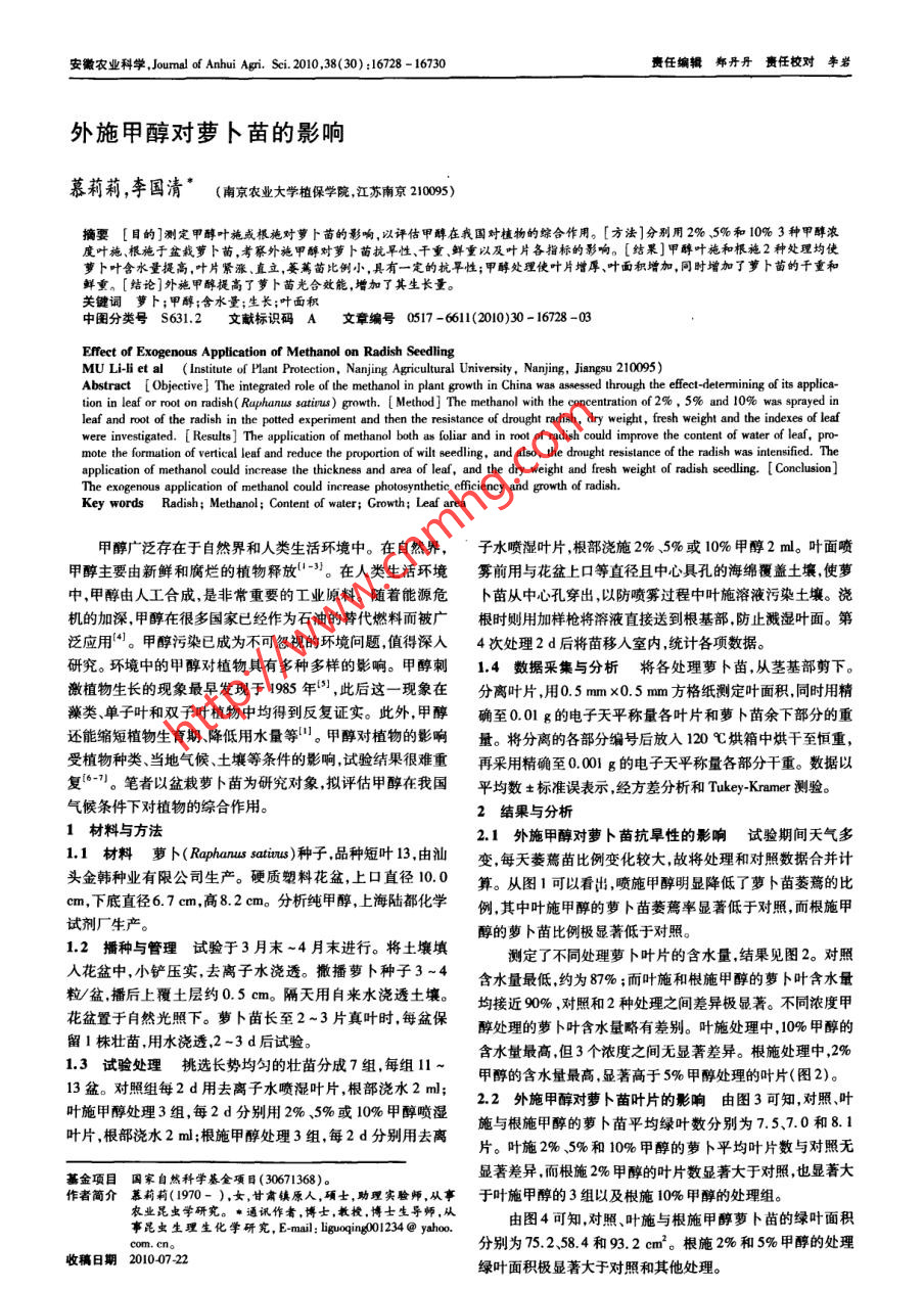 安徽農(nóng)業(yè)科學(xué),Joumal of Anhui Agi. Sci. 2010 ,38(30) :16728 - 16730責(zé)任編輯鄭丹丹責(zé)任校對(duì)李巖外施甲醇對(duì)蘿卜苗的影響慕莉莉,李國清”(南京農(nóng)業(yè)大學(xué)植保學(xué)院,江蘇南京 2055摘要[目的]測(cè)定 甲醇葉施或根施對(duì)蘿卜苗的影響,以評(píng)估甲醇在我國對(duì)植物的綜合作用。[方法]分別用2% .5%和10% 3種甲醇濃度葉施、根施于盆栽蘿卜苗,考察外施甲醇對(duì)蘿卜苗抗早性、干重.鮮重以及葉片各指標(biāo)的影響。[結(jié)果]甲醇葉施和根施2種處理均使蘿卜葉含水量提高,葉片緊漲、直立,萎蔫苗比例小,具有一定的抗旱性;甲醇處理使葉片增厚、葉面積增加,同時(shí)增加了蘿卜苗的干重和鮮重。[結(jié)論]外施甲醇提高了蘿卜苗光合效能,增加了其生長(zhǎng)量。關(guān)鍵詞蘿卜;甲醇;舍水量;生 長(zhǎng);葉面積中圖分類號(hào)S631.2文獻(xiàn)標(biāo)識(shí)碼A文章編號(hào) 0517 -6611(2010)30 - 16728 -03Effect of Exogenous Application of Methanol on Radish SeedlingMU Li-i et al ( Instiute of Plant Protection, Nanjing Agricultural University , Nanjing, Jiangsu 210095)Abstract [ Objective ] The itegrated role of the methanol in plant growth in China was asesed through the efect-detemining of its applica-tion in leaf or root on radish( Ruphanus satirus) growth. [ Method] The methanol with the concentration of2%,5% and 10% was sprayed inleaf and root of the radish in the ptted experiment and then the resistance of drought radish, dry weight, fresh weight and the indexes of leafwere investigated. [ Results] The application of methanol both as foliar and in root of radish could improve the content of water of leaf, pro-mote the formation of vertical leaf and reduce the pruportion of wilt seedling, and also, the drought resistance of the radish was intensified. Theapplication of methanol could increase the thickness and area of leaf, and the dry weight and fresh weight of radish seedling. [ Conclusion ]The exogenous application of methanol could increase photosynthetic eficiency and growth of radish.Key words Radish; Methanol; Content of waler; Growth; Leaf area甲醇廣泛存在于自然界和人類生活環(huán)境中。在自然界,子水噴濕葉片,根部澆施2%、5%或10%甲醇2 ml。葉面噴甲醇主要由新鮮和腐爛的植物釋放(1-3]。在人類生活環(huán)境霧前用與花盆上口等直徑且中心具孔的海綿覆蓋土壤,使夢(mèng)中,甲醇由人工合成,是非常重要的工業(yè)原料。隨著能源危卜苗從中心孔穿出,以防噴霧過程中葉施溶液污染土壤。澆機(jī)的加深,甲醇在很多國家已經(jīng)作為石油的替代燃料而被廣根時(shí)則用加樣槍將溶液直接送到根基部,防止濺濕葉面。第泛應(yīng)用“。甲醇污染已成為不可忽視的環(huán)境問題,值得深人4次處理2 d后將苗移人室內(nèi),統(tǒng)計(jì)各項(xiàng)數(shù)據(jù)。研究。環(huán)境中的甲醇對(duì)植物具有多種多樣的影響。甲醇刺1.4數(shù)據(jù)采集與分析將各處理蘿 卜苗,從莖基部剪下。激植物生長(zhǎng)的現(xiàn)象最早發(fā)現(xiàn)于1985年0] ,此后這一現(xiàn)象在分離葉片,用0.5 mm x0.5 mm方格紙測(cè)定葉面積,同時(shí)用精藻類、單子葉和雙子葉植物中均得到反復(fù)證實(shí)。此外,甲醇確至0.01 g的電子天平稱量各葉片和蘿卜苗余下部分的重還能縮短植物生育期、降低用水量等"。甲醇對(duì)植物的影響量。將分離的各部分編號(hào)后放入120 C烘箱中烘干至恒重,受植物種類、當(dāng)?shù)貧夂颉⑼寥赖葪l件的影響,試驗(yàn)結(jié)果很難重再采用精確至0.001 g的電子天平稱量各部分千重。數(shù)據(jù)以復(fù)[6-7。筆者以盆栽蘿卜苗為研究對(duì)象,擬評(píng)估甲醇在我國平均數(shù)t標(biāo)準(zhǔn)誤表示,經(jīng)方差分析和Tukey-Kramer測(cè)驗(yàn)。氣候條件"下對(duì)植物的綜合作用。2結(jié)果與分析1材料與方法2.1外施甲醇對(duì)蘿 卜苗抗旱性的影響試驗(yàn)期間天氣多1.1 材料蘿卜(Raphanus satirs)種子,品種短葉13,由汕變,每天萎觴苗比例變化較大,故將處理和對(duì)照數(shù)據(jù)合并計(jì)頭金韓種業(yè)有限公司生產(chǎn)。硬質(zhì)塑料花盆,上口直徑10.0算。從圖1可以看出,噴施甲醇明顯降低了蘿卜苗萎蔫的比cm,下底直徑6.7 cem,高8.2 cm。分析純甲醇,上海陸都化學(xué)例,其中葉施甲醇的蘿卜苗萎蔫率顯著低于對(duì)照,而根施甲試劑廠生產(chǎn)。醇的蘿卜苗比例極顯著低于對(duì)照。1.2播種與管理試驗(yàn)于3月末~4 月末進(jìn)行。將土壤填測(cè)定了不同處理蘿卜葉片的含水量結(jié)果見圖2。對(duì)照入花盆中,小鏟壓實(shí),去離子水澆透。撒播蘿卜種子3~4含水量最低,約為87% ;而葉施和根施甲醇的蘿卜葉含水量粒/盆播后上覆土層約0.5 cm。隔天用自來水澆透土壤。均接近90% ,對(duì)照和2種處理之間差異極顯著。不同濃度甲花盆置于自然光照下。蘿卜苗長(zhǎng)至2~3片真葉時(shí),每盆保酶處理的蘿卜葉含水量略有差別。葉施處理中.10%甲醉的留1株壯苗,用水澆透,2~3 d后試驗(yàn)。1.3 試驗(yàn)處理 挑選長(zhǎng)勢(shì)均勻的壯苗分成7組,每組11 ~含水量最高,但3個(gè)濃度之間無顯著差異。根施處理中,2%13盆。對(duì)照組每2 d用去離子水噴濕葉片,根部澆水2 ml;甲醇的含水量最高,顯著高于5%甲醇處理的葉片(圖2)。葉施甲醇處理3組,每2d分別用2%、5%或10%甲醇噴濕2.2外施甲醇對(duì)蘿 卜苗葉片的影響由圖3 可知,對(duì)照、葉葉片,根部澆水2 ml ;根施