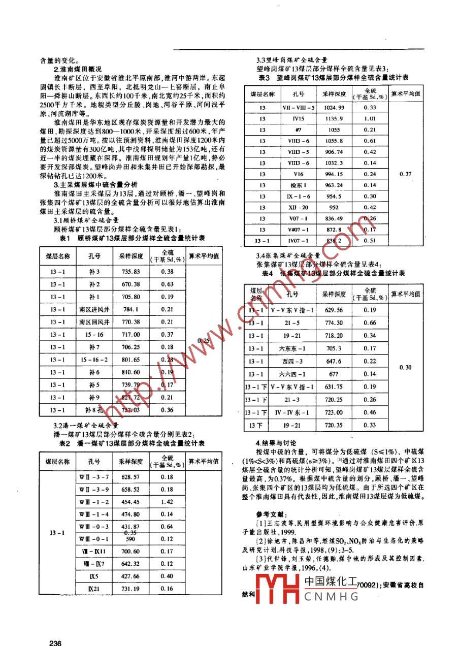 淮南煤田13煤層煤中硫含量分析葛濤(安徽理工大學(xué)地球與環(huán)境科學(xué)學(xué)院,安徽淮南232001)摘要:淮南煤田是華東地區(qū)現(xiàn)存煤炭資源量和開發(fā)潛學(xué)和環(huán)保產(chǎn)業(yè)的興起與發(fā)展,人們對煤炭資源在開發(fā)利用過力最大的煤田,本文通過對淮南煤田主采煤層—13煤層的程中對環(huán)境的污染也H益關(guān)注。由干我國一直把煤炭作為主全硫含量分析,為淮南煤的利用及污染防治提供參考。要能源,加上部分落后的燃煤方式、煙氣污染控制技術(shù)及灰渣關(guān)鍵詞:淮南煤田13煤層全硫含量低硫煤利用技術(shù)落后,煤炭在利用過程中引起的環(huán)境污染問題已相當(dāng)嚴(yán)重。大量燃煤所排放的SO2已經(jīng)在我國形成了極大的危1前言害,pH值小于56的地區(qū)迅速擴(kuò)大,形成的酸雨和SO2污染區(qū)已國作為燃煤大囡,盡管近年來煤炭資源的開采量有下超過國土面積的40%。(2降的趨勢,但在今后相當(dāng)長的時間內(nèi)仍是世界上煤炭消費量前人關(guān)注的主要是高硫煤和富含有害微量元素的煤,已和生產(chǎn)量最大的國家。根據(jù)我國能源資源形勢預(yù)測,到2010有的多數(shù)研究成果均反映我國西南地區(qū)的情況,對淮南煤田年,我國煤炭資源在一次性能源消費結(jié)構(gòu)中將占667%,到煤中硫含量的研究比較少,對深部原煤的研究尚屬空白。本文050年也將占50%以上??谝虼嗣禾抠Y源在我國能源消費中的通過實測數(shù)據(jù)對淮南煤田主采煤層煤中硫的含量進(jìn)行定性和主導(dǎo)地位在未來相當(dāng)長的時間內(nèi)不會改變。然而隨著環(huán)境科定量分析,并通過硫在淮南煤田內(nèi)的分布特征預(yù)測深部煤層理解的。因此,在翻譯這段文字時一定要增加這部分的缺省的“歲寒三友( Three friends in Winter)。當(dāng)我們在黃山旅游中看文化,否則日標(biāo)語干擾會導(dǎo)致信息傳遞失敗。增加對文化缺省到這些姿態(tài)各異的植物時自然而然會聯(lián)想到人品的高潔、堅韌信息“白娘子"這個名詞進(jìn)行補允說明,才能避免信息傳輸失敗不拔。但是對于外國游客而言,其不過是一些尋常植物而已此3)減譯和信息壓縮外,“龍”在中西方文化中也有截然不同的含義,這就要求譯者信息的壓縮是指通過加工、整理概括抽象、綜合等把信在翻譯時必須對隱含的信息進(jìn)行解釋說明,以成功傳遞信息。息變成一定規(guī)律、公理模型的性質(zhì)。壓縮性的特征體現(xiàn)了翻5結(jié)語譯中的不等值原則。例如:信息傳遞理論是一種研究信息處理和信息傳遞的科學(xué)。這兒的峽谷又是另一番景象:谷中愈水奔流,穿峽而過,它不僅研究信息的表達(dá)與轉(zhuǎn)換,而且妍究信息的傳遞方式和兩岸樹木蔥蕘,鮮花繁茂,碧草萋萋,活脫脫一帽生機(jī)盎然的信息的處理方式等。翻譯是一種語際交際活動,是一個復(fù)雜天然風(fēng)景畫。各種奇峰異嶺,令人感受各異,遐想萬千。的語言轉(zhuǎn)換與信息傳遞的過程,因而信息論中的基本原理適It is another scene through which a rapid strean flows,Tres,用于解釋翻譯過程。本文分析了漢英對譯實例,指出某些譯grass and flowers of natural vitality, thrive on both banks,The例在信息處理中出現(xiàn)的問題及正確處理的方法。本研究的結(jié)untiny論表明信息論對旅游材料翻譯實踐的指導(dǎo)作用不僅是可行漢語結(jié)構(gòu)松散,詞藻華麗,多用虛詞,追求韻律美和節(jié)奏的,而且是科學(xué)的和系統(tǒng)的,其對豐富現(xiàn)代翻譯理論有著積感,在描寫景物時常用疊詞、近義詞、同復(fù)合詞等突出景物:極的意義。製萋”、“蔥"和“戎"、“繁"和“茂”、“奇峰"和“異嶺"表達(dá)的是相同的意思。在漢語中這種表達(dá)結(jié)構(gòu)是必要的,是美的。然而注釋:英語結(jié)構(gòu)緊湊、簡潔、客觀,如果逐句直譯,就只會讓外冋游客①"核心句”是轉(zhuǎn)換生威語法中的一個概念,屬深層結(jié)構(gòu)感到不知所云,甚至毫無意義,何談欣賞美景,傳播中國文化?的范疇。根據(jù)喬姆斯基的理論,核心句是語言中表層結(jié)構(gòu)賴以所以這種“美的結(jié)構(gòu)"只會增加外國人的解碼負(fù)擔(dān),是多余的生成的基礎(chǔ),可以通過轉(zhuǎn)換產(chǎn)生不同的表層結(jié)構(gòu)的句子。信息,也就是圖2中的干擾2譯者必須壓縮信息(4)特譯,解釋和信息離散參考文獻(xiàn)在信息的傳遞過程中,信息的離散性是指原信息的損耗[1 Eugene A Nida, Toward a Science of Translation, Leiden與偏離。中西方不同的文化漢語和英語迥然不同的形式,必 E.J. Brill,1964:1然導(dǎo)致這種離散,在圖2中表現(xiàn)為十?dāng)_1和十?dāng)_2。造成這一現(xiàn)JNewmark, P A Textbook of Translation[ M]. Hemel Hemp-象的具體原因主要有兩點:①源語言的形無法用目標(biāo)諸言的sead: Prentice- Hall International,1988形表達(dá)。如漢語中的律詩回文、仿語等。②由于文化傳統(tǒng)不同[3 ]Nida, E.A. Toward a Science of Translation[ M ] Leiden: E.造成形象聯(lián)想的差異。J. Brill. 1964劉備章武三年病死于白帝城永安官,五月回咸都,八月[4Shannon, C.E. A Mathematical Theory of Communication葬于惠陵。[J].The Bell System Technical Jourmal, 1948: 379-423, 623-656.Liu Bei died of illness in 233 in present-day feng ie coSichuan province. He was buried here in the same year (e unty,[5]柯細(xì)香淺談 Skopostheor