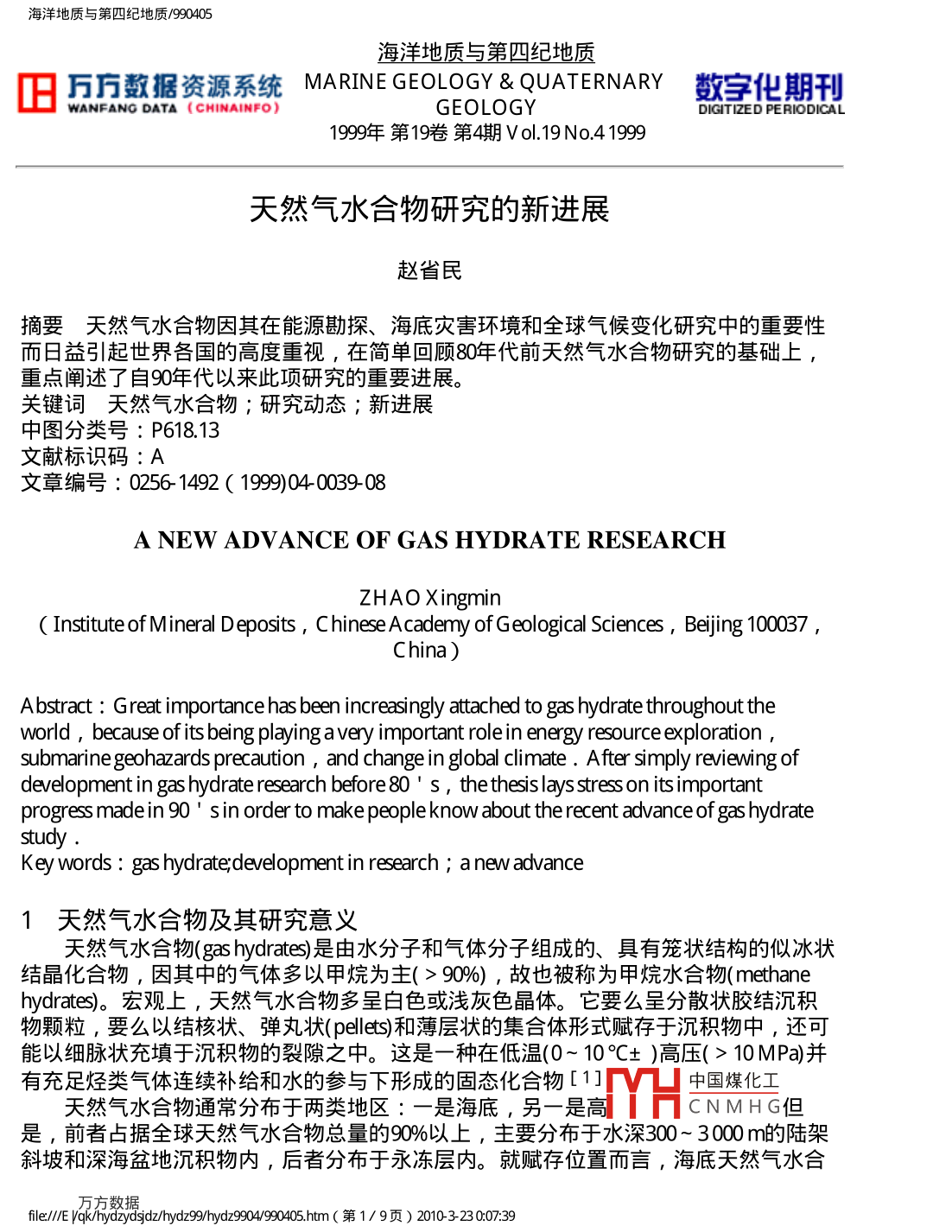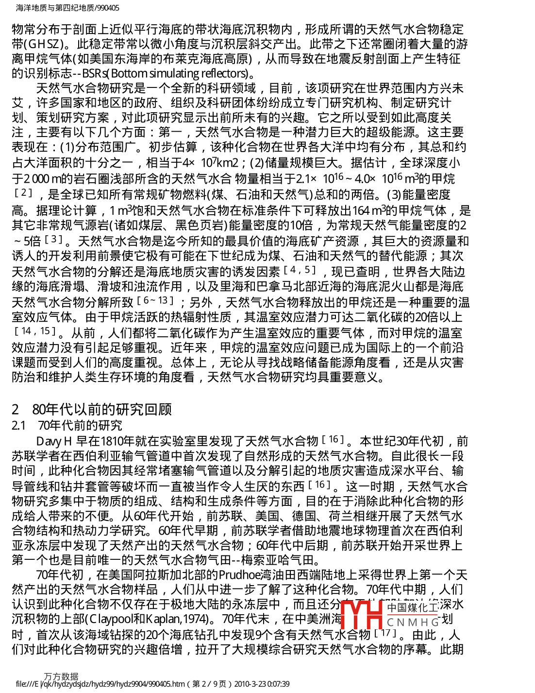海洋地質(zhì)與第四紀(jì)地質(zhì)/90405海洋地質(zhì)與第四紀(jì)地質(zhì)舊J萬(wàn)數(shù)據(jù)資源系統(tǒng) MARINE GEOLOGY& QUATERNARY數(shù)化期刊WANFANG DATA (CHINAINFO)GEOLOGYDIGITIZED PERIODICAL1999年第19卷第4期Ⅴo.19No41999天然氣水合物研究的新進(jìn)展趙省民摘要天然氣水合物因其在能源勘探、海底災(zāi)害環(huán)境和全球氣候變化研究中的重要性而日益引起世界各國(guó)的高度重視,在簡(jiǎn)單回顧80年代前天然氣水合物研究的基礎(chǔ)上重點(diǎn)闡述了自90年代以來(lái)此項(xiàng)研究的重要進(jìn)展。關(guān)鍵詞天然氣水合物;研究動(dòng)態(tài);新進(jìn)展中圖分類號(hào):P618.13文獻(xiàn)標(biāo)識(shí)碼:A文章編號(hào):0256-1492(1999)04003908A NEW ADVANCE OF GAS HYDRATE RESEARCHZHAO Xingmin(Institute of Mineral Deposits, Chinese Academy of Geological Sciences, Beijing 100037China)Abstract: Great importance has been increasingly attached to gas hydrate throughout theworld, because of its being playing a very important role in energy resource explorationsubmarine geohazards precaution, and change in global climate. After simply reviewing ofdevelopment in gas hydrate research before 80S, the thesis lays stress on its importantprogress made in 90 sin order to make people know about the recent advance of gas hydratestudyKey words: gas hydrate; development in research a new advance1天然氣水合物及其研究意義天然氣水合物 gas hydrates)是由水分子和氣體分子組成的、具有籠狀結(jié)構(gòu)的似冰狀結(jié)晶化合物,因其中的氣體多以甲烷為主(>90%),故也被稱為甲烷水合物( methanehydrates。宏觀上,天然氣水合物多呈白色或淺灰色晶體。它要么呈分散狀膠結(jié)沉積物顆粒,要么以結(jié)核狀、彈丸狀( pellets)和薄層狀的集合體形式賦存于沉積物中,還可能以細(xì)脈狀充填于沉積物的裂隙之中。這是一種在低溫(0~10°C±)高壓(>10MPa并有充足烴類氣體連續(xù)補(bǔ)給和水的參與下形成的固態(tài)化合物[1中國(guó)煤化工天然氣水合物通常分布于兩類地區(qū):一是海底,另一是高YHCNMHG但是,前者占據(jù)全球天然氣水合物總量的90%以上,主要分布于水深30~3000m的陸架斜坡和深海盆地沉積物內(nèi),后者分布于永凍層內(nèi)。就賦存位置而言,海底天然氣水合fle∥/ yak/hydzydsidz/hydes9hd2904990405hm(第1/9頁(yè))2010323007:39海洋地質(zhì)與第四紀(jì)地質(zhì)/90405物常分布于剖面上近似平行海底的帶狀海底沉積物內(nèi),形成所謂的天然氣水合物穩(wěn)定帶(GHSZ)。此穩(wěn)定帶常以微小角度與沉積層斜交產(chǎn)岀。此帶之下還常圈閉著大量旳游離甲烷氣體(如美國(guó)東海岸的布萊克海底高原),從而導(dǎo)致在地震反射剖面上產(chǎn)生特征的識(shí)別標(biāo)志- BSRs( Bottom simulating reflectors).天然氣水合物研究是一個(gè)全新的科研領(lǐng)域,目前,該項(xiàng)研究在世界范圍內(nèi)方興未艾,許多國(guó)家和地區(qū)的政府、組織及科研團(tuán)體紛紛成立專門(mén)研究機(jī)構(gòu)、制定研究計(jì)劃、策劃研究方案,對(duì)此項(xiàng)研究顯示岀前所未有的興趣。它之所以受到如此高度關(guān)注,主要有以下幾個(gè)方面:第一,天然氣水合物是一種潛力巨大的超級(jí)能源。這主要表現(xiàn)在:(1)分布范圍廣。初步估算,該種化合物在世界各大洋中均有分布,其總和約占大洋面積的十分之一,相當(dāng)于4×10κkm2;(2)儲(chǔ)量規(guī)模巨大。據(jù)估計(jì),全球深度小于2000m的巖石圈淺部所含的天然氣水合物量相當(dāng)于21×1016~40×1016m的甲烷[2],是全球已知所有常規(guī)礦物燃料(煤、石油和天然氣)總和的兩倍。(3)能量密度高。據(jù)理論計(jì)算,1m飽和夭然氣水合物在標(biāo)準(zhǔn)條件下可釋放出164m的甲烷氣體,是其它非常規(guī)氣源巖(諸如煤層、黑色頁(yè)巖)能量密度的10倍,為常規(guī)天然氣能量密度的25倍[3]。天然氣水合物是迄今所知的最具價(jià)值的海底礦產(chǎn)資源,其巨大的資源量和誘人的開(kāi)發(fā)利用前景使它極有可能在下世紀(jì)成為煤、石油和天然氣的替代能源;其次天然氣水合物的分解還是海底地質(zhì)災(zāi)害的誘發(fā)因素[4,5],現(xiàn)已查明,世界各大陸邊緣的海底滑塌、滑坡和濁流作用,以及里海和巴拿馬北部近海的海底泥火山都是海底天然氣水合物分解所致[6~13];另外,天然氣水合物釋放出的甲烷還是一種重要的溫室效應(yīng)氣體。由于甲烷活躍的熱輻射性質(zhì),其溫室效應(yīng)潛力可達(dá)二氧化碳的20倍以上[14,15]。從前,人們都將二氧化碳作為產(chǎn)生溫室效應(yīng)的重要?dú)怏w,而對(duì)甲烷的溫室效應(yīng)澘力沒(méi)有引起足夠重視。近年來(lái),甲烷的溫室效應(yīng)問(wèn)題已成為國(guó)際上的一個(gè)前沿課題而受到人們的高度重視??傮w上,無(wú)論從尋找戰(zhàn)略儲(chǔ)備能源角度看,還是從災(zāi)害防治和維護(hù)人類生存環(huán)境的角度看,天然氣水合物研究均具重要意義。280年代以前的研究回顧2.1x0年代前的研究Davy H早在1810年就在實(shí)驗(yàn)室里發(fā)現(xiàn)了天然氣水合物[16]。本世紀(jì)30年代初,前蘇聯(lián)學(xué)者在西伯利亞輸氣管道中首次發(fā)現(xiàn)了自然形成的天然氣水合物。自此很長(zhǎng)一段時(shí)間,此種化合物因其經(jīng)常堵塞輸氣管道以及分解引起的地質(zhì)災(zāi)害造成深水平臺(tái)、輸導(dǎo)管線和鉆井套管等破壞