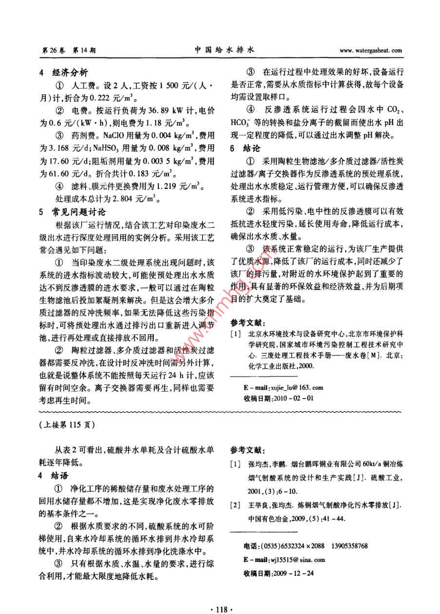 第26卷第14期中國(guó)給水排水vol 26 No. 142010年7月CHINA WATER WASTEWATERJu.2010硫酸系統(tǒng)循環(huán)水的水質(zhì)、水溫、水量調(diào)節(jié)及改進(jìn)王舉良,張均杰,李兆宏(煙臺(tái)鵬暉銅業(yè)有限公司,山東煙臺(tái)264002)摘要:硫酸系統(tǒng)的水可分為凈化洗滌水和設(shè)備冷卻水。凈化洗滌水雜質(zhì)含量高,經(jīng)處理后可返回凈化工序使用。設(shè)備冷卻水可分為自來(lái)水冷卻系統(tǒng)和井水冷卻系統(tǒng),自來(lái)水冷卻系統(tǒng)的循環(huán)水排到井水冷卻系統(tǒng),井水冷卻系統(tǒng)的循環(huán)水排到凈化洗滌水中,這樣不僅提高了水的綜合利用率,而且可實(shí)現(xiàn)廢水零排放,達(dá)到節(jié)水、降耗的目的。關(guān)鍵詞:硫酸系統(tǒng);凈化洗滌水;設(shè)備冷卻水中圖分類(lèi)號(hào):TU992文獻(xiàn)標(biāo)識(shí)碼:C文章編號(hào):1000-4602(2010)14-0113-04Regulation and Improvement of Water Quality, Water Temperatureand Water Quantity of Sulfuric Acid SystemWANG Ju-liang, ZHANG Jun-jie, LI Zhao-hongYantai Penghui Copper Industry Co. Ld, Yantai 264002, ChinaAbstract: Water of sulfuric acid system can be divided into purification wash water and equipmentcooling water. The purification wash water has high impurity, and it can return to purification process af-ter being treated. The equipment cooling water can come from tap water cooling system and well watercooling system. The circulating water from tap water cooling system is drained into the well water coolingsystem from which the circulating water is drained into the purification wash water system. This can im-prove the comprehensive utilization rate of water and attain zero discharge of wastewater to achieve waterKey words: sulfuric acid system; purification wash water; equipment cooling water煙臺(tái)鵬暉銅業(yè)有限公司的硫酸系統(tǒng)于1995年設(shè)計(jì)轉(zhuǎn)化入口煙氣量為53760m3/h,SO2濃度10月投產(chǎn),其用水工藝見(jiàn)圖1。為5.0%;凈化采用絕熱增濕稀酸洗滌,轉(zhuǎn)化采用“22”Ⅳ-Ⅲ-I一Ⅱ兩轉(zhuǎn)兩吸工藝。硫酸系統(tǒng)的水可分為凈化洗滌水和設(shè)備冷卻水。凈化洗滌水與煙氣煙氣煙氣直接接觸,其中雜質(zhì)含量高。凈化洗滌水包括煙氣間冷沖洗水、填料塔洗滌稀酸、空塔洗滌稀酸、凈化空塔}一填料壞一間冷器一[吸工序產(chǎn)出的廢酸、廢水處理工序的配液用水、廢水處路理后達(dá)標(biāo)排放的水或返回到凈化工序的回用水。設(shè)而-地一-A這樂(lè)(菜備冷卻水不與被冷卻的介質(zhì)直接接觸(主要冷卻設(shè)備中的煙氣硫酸、潤(rùn)滑油軸承)。設(shè)備冷卻水可B園¥分為自來(lái)水冷卻系統(tǒng)和并水冷卻系統(tǒng);自來(lái)水冷卻圖1硫酸系統(tǒng)用水工藝系統(tǒng)的循環(huán)水排到井水冷卻系統(tǒng),井水冷卻系統(tǒng)的Fig 1 Water process for sulfuric acid system循環(huán)水排到凈化洗滌水中。設(shè)備冷卻水包括間冷冷第26卷第14期中國(guó)給水排水Www卻水、干吸冷卻水、一吸和二吸循環(huán)槽加水、SO2風(fēng)干吸循環(huán)水池水的C含量高,向干吸循環(huán)水池補(bǔ)機(jī)冷卻水、水泵冷卻水。如何合理調(diào)節(jié)水質(zhì)、水溫、自來(lái)水,水池上部的水溫度高、密度小、Cl含量高水量以保證生產(chǎn)穩(wěn)定運(yùn)行,降低水耗和電耗,實(shí)現(xiàn)零當(dāng)其超過(guò)溢流口時(shí)就流到凈化循環(huán)水池。干吸循環(huán)排放以消除對(duì)環(huán)境的污染,這在水資源日益匱乏和水池和凈化循環(huán)水池各有一個(gè)溢流口,調(diào)整干吸循環(huán)保要求越來(lái)越嚴(yán)格的今天有著重要的現(xiàn)實(shí)意義。環(huán)水池溢流口比梯形溢流口高150mm,凈化循環(huán)水1水質(zhì)的調(diào)節(jié)池溢流口比梯形溢流口低150mm,即使硫酸系統(tǒng)發(fā)1.1水質(zhì)的要求生意外事故突然停車(chē),凈化循環(huán)水池的水也不會(huì)流硫酸系統(tǒng)主要用水設(shè)備和部位對(duì)水質(zhì)的要求從到干吸循環(huán)水池。采用這種方法調(diào)節(jié)水質(zhì)和水量簡(jiǎn)高到低的順序是:干吸冷卻水、間冷冷卻水、間冷沖單、實(shí)用、省水、省電、高效特別是提高了新補(bǔ)充的洗水、填料塔洗滌稀酸、空塔洗滌稀酸、凈化工序產(chǎn)自來(lái)水減少干吸冷卻水中C含量的效能。出的廢酸。對(duì)水質(zhì)進(jìn)行調(diào)節(jié),是把前面用水設(shè)備和間冷冷卻循環(huán)水管在間冷沖洗循環(huán)槽上有閥部位的水向后面用水設(shè)備和部位調(diào)節(jié)。門(mén),打開(kāi)即可向其補(bǔ)水;間冷沖洗循環(huán)泵出口管道在干吸工序的濃硫酸冷卻器用不銹鋼制造,用水填料塔循環(huán)槽上設(shè)置閥門(mén),可用來(lái)補(bǔ)水;填料塔下塔冷卻濃硫酸,水中C含量偏高對(duì)其腐蝕嚴(yán)重,所以酸的管道設(shè)置支管和閥門(mén),控制向空塔循環(huán)槽補(bǔ)稀一般限定水中C≤200mg/L酸,空塔沉淀槽廢酸用泵送到廢水處理工序,處理達(dá)1.2水質(zhì)的調(diào)節(jié)標(biāo)后排放。2008年10月將處理后的水返回到間冷干吸冷卻水選用自來(lái)水,并且循環(huán)使用;自來(lái)水沖洗循壞槽中循環(huán)使用,達(dá)到零排放。Cl^含量為80~120mg/L,循環(huán)使用Cl含量逐漸升2009年12月利用大修的機(jī)會(huì),用DN200管道高,當(dāng)超過(guò)限定值時(shí),將干吸冷卻水放出一部分,再把間冷沖洗循環(huán)