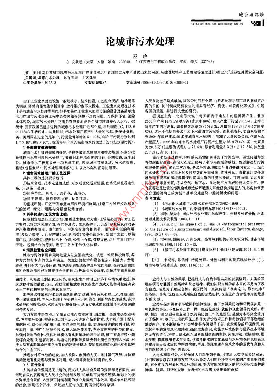城鄉(xiāng)與環(huán)境China science and Technology Review w論城市污水處理巫玲(1.安徽理工大學(xué)安徽準(zhǔn)南2320002.江西應(yīng)用工程職業(yè)學(xué)院江西萍鄉(xiāng)337042)[摘要]針對目前城市現(xiàn)有污水處理廠在建設(shè)和運(yùn)行管理的過程中所暴露出來的問題,從建設(shè)規(guī)模和工藝確定等角度進(jìn)行對比分析及污泥處置安全問題關(guān)鍵詞]城市污水處理運(yùn)行管理工藝選擇中圖分類號:[R123.3文獻(xiàn)標(biāo)識碼:A文章編號:1009914X(2010)050003-0由于工業(yè)廢水處理沒施一般規(guī)模小、技術(shù)性強(qiáng)工藝組合靈活,結(jié)構(gòu)通常已造成威脅,國際公約已明令禁止;堆肥處理不但可以達(dá)到穩(wěn)定污為鋼制即使內(nèi)部管線穿插較多運(yùn)行維護(hù)也不太困難。工業(yè)廢水處理在技術(shù)時(shí)制成肥料農(nóng)業(yè)利用具有經(jīng)濟(jì)、簡便、可資源化等優(yōu)點(diǎn),引起上是與城市污水處理類同的但是如采把工業(yè)廢水處理設(shè)施的設(shè)計(jì)思路簡單地并進(jìn)行大量的研究。套用在城市污水處理工程中會帶來很多預(yù)想不到的問題。為保護(hù)環(huán)境,消除上海、北京等大城市每天都有千噸左右的濕污泥產(chǎn)生。北京水體污染,城市污水處理廠正雨后春筍般地在各個(gè)城市建成并投入運(yùn)行,據(jù)1479t/d濕污泥(含水率80%),每天產(chǎn)生干污泥296t/d,上海市統(tǒng)計(jì),目前我國已建并運(yùn)轉(zhuǎn)的城市污水處理廠近500座年處理能力為11.6每年產(chǎn)生的污泥量如果按含水率為80%計(jì)算,總量為129萬t/年(含固率×108m3生活污水。與此同時(shí),污水處理廠將產(chǎn)生大量的污泥,據(jù)統(tǒng)計(jì)資料80%),這還不包括自來水廠和下水道通溝污泥等。而其他省份,如山東省截至英、美兩國在過去的幾年中污泥量每年增加5~10%,年產(chǎn)干污泥分別達(dá)到到2004年底已建成60多座城市污水處理廠,削減了大量污染負(fù)荷但濕污泥1.7×10t和9×10°t。我國每年產(chǎn)生的城市污水污泥達(dá)1億t以上(濕污泥)產(chǎn)量巨大。2003年山東省污水處理廠污泥產(chǎn)生量為26.8萬t/a,其中處置量1合理確定建設(shè)規(guī)模為20.8萬t(主要為填埋),占77.6%,綜合利用量3.3萬t占12.3%排放量城市污水廠建設(shè)規(guī)摸的確定,是根據(jù)城市總體規(guī)劃和排水規(guī)劃分期分批2.7萬t,占10.1%地建設(shè)污水管網(wǎng)和污水處理廠,要根據(jù)水環(huán)境保護(hù)的目標(biāo),分期實(shí)施,逐步到在污水處理過程中,50%的污染物都轉(zhuǎn)移到了污泥當(dāng)中,污泥問題卻沒位。城市排水工程建設(shè)是一項(xiàng)系統(tǒng)工程,涉及城區(qū)管渠改造,污水的收集有得到很好解決,在很大程度上影響了水污染控制的成效。能否解決好污泥輸送(包括泵站),污水處理和捧放利用,以及污泥處置等問題在處理處置問題,避免二次污染,是水環(huán)境治理成功與杏的關(guān)鍵因素之一,城市2城市污水處理廠的工藝選擇污水處理廠的污泥得不到及時(shí)有效的處理處置,直接外運(yùn)、直接農(nóng)用或任意具體工程的選擇要求包括堆放和不規(guī)范的填埋都將使污泥成為新的環(huán)境污染源??上攵?如此多的①技術(shù)合理。技術(shù)先進(jìn)而成熟,對水質(zhì)變化適應(yīng)性強(qiáng)出水達(dá)標(biāo)且穩(wěn)定性污泥如果肆意處置將從空氣、地下水、食物鏈三方面威脅著人類生活。沒高,污泥易于處理有妥善處理處置的污泥給城市造成環(huán)境壓力和經(jīng)濟(jì)負(fù)擔(dān)是巨大的污泥如何安②經(jīng)濟(jì)節(jié)能,耗電小,造價(jià)低,占地少。全合理的消納已成為城市基礎(chǔ)設(shè)施建設(shè)中亟待解決的問題③易于管理,操作管理方便,設(shè)備可靠參考文獻(xiàn)④重視環(huán)境。廠區(qū)平面布置與周圍環(huán)境相協(xié)調(diào),注意廠內(nèi)噪聲控制和臭[1]《污水排入城市下水道水質(zhì)標(biāo)準(zhǔn)》CJ3082-1999)氣的治理,綠化、道路與分期建設(shè)結(jié)合好[2]《城鎮(zhèn)污水處理廠污染物排放標(biāo)準(zhǔn)》(GB18918-2002)3科學(xué)的進(jìn)行工藝方案比較[3]李季吳為中國內(nèi)外污水處理廠污泥產(chǎn)生、處理及處置分析污泥因地制宜地進(jìn)行工藝方案(主要是生物處理方案)比較是必要的。對工藝處理處置技術(shù)及裝置,2003,1-14.方案的比較力求客觀全面,在同等進(jìn)水、出水條件下,其設(shè)計(jì)參數(shù)應(yīng)包括對各[4] Davis, R D The impact of EU and UK environmental pressures種污染物的去除率、曝氣時(shí)間、污泥負(fù)荷和容積負(fù)荷、賺氣量和氧的利用 n the future of sludgetreatment and disposal. Water Environ. Manag率(及動力效率)、污泥產(chǎn)量(及污泥指數(shù))等作全面分析,數(shù)據(jù)豐富就可以集1996,10(2),65—69廣益揚(yáng)長避短根據(jù)技術(shù)上合理,經(jīng)濟(jì)上合算管理方便運(yùn)行可靠且有利[5]韋朝海陳傳好,污泥處理、處置與利用的研究現(xiàn)狀分析城市環(huán)境于近、遠(yuǎn)期結(jié)合的原則,進(jìn)行工藝方案的優(yōu)化挾擇與城市生態(tài)1998,11(4):10~14污泥處置安全問題[6]《城市污水處理工程項(xiàng)日建設(shè)標(biāo)準(zhǔn)》(修訂)(建設(shè)部2001.6,1施城市污泥的利用和最終處置方法主要有焚燒、填埋、堆肥和投海等各種方式都有