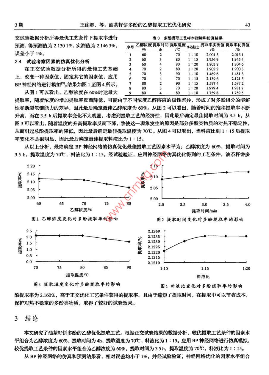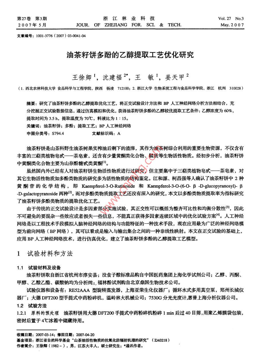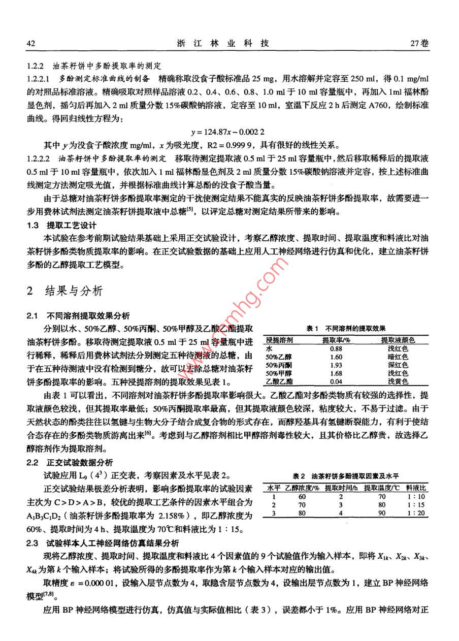 第27卷第3期浙江林業(yè)科技Vol 27 No. 32007年5月JOUR. OF ZHEJIANG FOR. SCl. TECH.May,2007文章編號:1001-3776(2007)03-0041-04油茶籽餅多酚的乙醇提取工藝優(yōu)化研究王徐卿1,沈建福2,王敏1,姜天甲2(1.西北農(nóng)林科技大學食品科學與工程學院,陜西楊凌712100;2.浙江大學生物系統(tǒng)工程與食品科學學院,浙江杭州310028)摘要:研究了油茶籽餅多酚的乙醇提取優(yōu)化工藝,將正交試驗設計方法和BP人工神經(jīng)網(wǎng)絡分析方法相結合,充分挖據(jù)正交試驗數(shù)據(jù)信息,通過仿真模擬和優(yōu)化,獲得油茶籽餅多酚的乙醇較優(yōu)提取工藝條件:乙醇濃度為60%,提取時間為35h,提取溫度為70℃,料液比為1:15。關鍵詞:油茶籽餅;多酚;提取工藝;BP人工神經(jīng)網(wǎng)絡中圖分類號:S7944文獻標識碼:A油茶籽餅是山茶科野生油茶樹果實榨油后剩下的渣滓,其作為油茶樹綜合利用的重要生物資源,不僅含有豐富的三萜類植物皂甙—茶皂素,還含有少量黃酮類化合物、鞣質(zhì)等生物活性物質(zhì)。經(jīng)初步分析,油茶籽餅中黃酮類化合物主要為山奈酚糖甙類黃酮。雖然國內(nèi)外已經(jīng)有人對油茶籽餅生物活性物質(zhì)進行過研究,但主要集中于三萜類植物皂甙—茶皂素,對其它生物活性物質(zhì)如多酚類物質(zhì)的研究多為活性物質(zhì)的結構鑒定。江和源、柯昌強等人確認了油茶籽餅中2種黃酮苷的化學結構,即 Kaempferol-3- o-Rutinoside和 Kaempferol-3-0(60-βD- glucopyranosyl)-βD-galactopyranoside兩種2。而對多酚類物質(zhì)提取工藝還沒有深入的研究,本文以多酚類物質(zhì)提取率為指標研究了油茶籽餅多酚類物質(zhì)的提取優(yōu)化工藝由于傳統(tǒng)的正交試驗設計是多因素部分實施試驗,其正交性可以概括為整齊可比性和均衡分散性,因此不可避免的要混雜一些效應或者損失一些信息,不能真正獲得多因素連續(xù)區(qū)域中的優(yōu)化試驗方案。人工神經(jīng)網(wǎng)絡是以工程技術手段模擬人腦神經(jīng)網(wǎng)絡的結構與功能特征的一種技術手段,現(xiàn)在應用最為廣泛的神經(jīng)網(wǎng)絡模型為前向網(wǎng)絡(BP網(wǎng)絡),其可以看成是輸入與輸出集合之間的一種非線性映射。本文在正交試驗的基礎上應用BP人工神經(jīng)網(wǎng)絡技術,進行仿真優(yōu)化,建立了油茶籽餅多酚的乙醇提取工藝模型1試驗材料和方法11試驗材料及設備油茶籽餅取自浙江省杭州市淳安縣;沒食子酸標準品購自中國醫(yī)藥集團上?;瘜W試劑公司;乙醇、丙酮、甲醇、乙酸乙酯、碳酸鈉均為分析純;,福林酚試劑購自北京鼎國生物技術公司。試驗儀器和設備有:RE52AAA型旋轉(zhuǎn)蒸發(fā)器,上海亞榮生化儀器廠;循環(huán)水式多用真空泵,鄭州長城儀器廠;大德DFT200型手提式中藥粉碎機,溫嶺林大機械公司;7530G分光光度計惠普上海分析儀器公司。12試驗方法121原料的預處理油茶籽餅用大德DFI200手提式中藥粉碎機粉碎1min后過40目篩,用聚乙烯膜袋包裝,密封后置于4℃冰箱中儲藏待用。收稿日期:20070314;修回日期:2007-0420基金項目:浙江省自然科學基金“山茶油活性物質(zhì)的抗氧化防輻射機理的研究”(zA0218)作者簡介:王徐卿(1982-),男,江蘇大豐人,碩士研究生;·通訊作者27卷122油茶籽餅中多酚提取率的測定1.22.1多酚測定標準曲線的制備精確稱取沒食子酸標準品25mg,用水溶解并定容至250m,得0.1mgm的對照品標準溶液。精確吸取對照樣品溶液0.2、0.4、0.6、0.8、1.0m于10ml容量瓶中,再加入1m福林酚顯色劑,搖勻后再加入2m質(zhì)量分數(shù)15%碳酸鈉溶液,定容至10ml,室溫下反應2h后測定A760,繪制標準曲線。得回歸線性方程為:y=12487x-0.0022其中y為沒食子酸濃度mgm,x為吸光度,R2=09999,具有很好的線性關系。1.2.2.2油茶籽餅中多酚提取率的測定移取待測定提取液0.5m于25ml容量瓶中,然后移取稀釋后的提取液0.5ml于10m容量瓶中,依次加入1m福林酚顯色劑及2ml質(zhì)量分數(shù)15%碳酸鈉溶液并定容,按上述標準曲線測定方法測定吸光值,并根據(jù)標準曲線計算總酚的沒食子酸當量。由于總糖對油茶籽餅多酚提取率測定的干擾使測定結果不能真實的反映油茶籽餅多酚提取率,故需要進一步用費林試劑法測定油茶籽餅提取液中總糖,以評定總糖對測定結果所帶來的影響。1.3提取工藝設計本試驗在參考前期試驗結果基礎上采用正交試驗設計,考察乙醇濃度、提取時間、提取溫度和料液比對油茶籽餅多酚類物質(zhì)提取率的影響。在正交試驗數(shù)據(jù)的基礎上應用人工神經(jīng)網(wǎng)絡進行仿真和優(yōu)化,建立油茶籽餅多酚的乙醇提取工藝模型。2結果與分析21不同溶劑提取效果分析油茶籽餅多酚。移取待測定提取液0m于25m容量瓶中進表1不同溶劑的提取效果分別以水、50%乙醇、50%丙酮、50%甲醇及乙酸乙酯提取提取率/%提取液顏色淺紅色行稀釋,稀釋后用費林試劑法分別測定五種待測液的總糖,由50%乙醇60暗紅色于在五種待測液中沒有檢測到糖分,故可以去除總糖對油茶籽5%深紅色淺紅色餅多酚提取率的影響。五種浸提溶劑的提取效果見表1。淺黃色由表1可以看出,不同溶劑對油茶籽餅多酚提取率影響很大。乙酸乙酯對多酚類物質(zhì)有較強的選擇性,提取液顏色較淺,但其提取率最低;50%丙酮提取率最高,但其提取液顏色較深,粘度較大,不易于過濾。由于天然狀態(tài)的酚類往往以氫鍵與生物大分子結合成復合物的形式