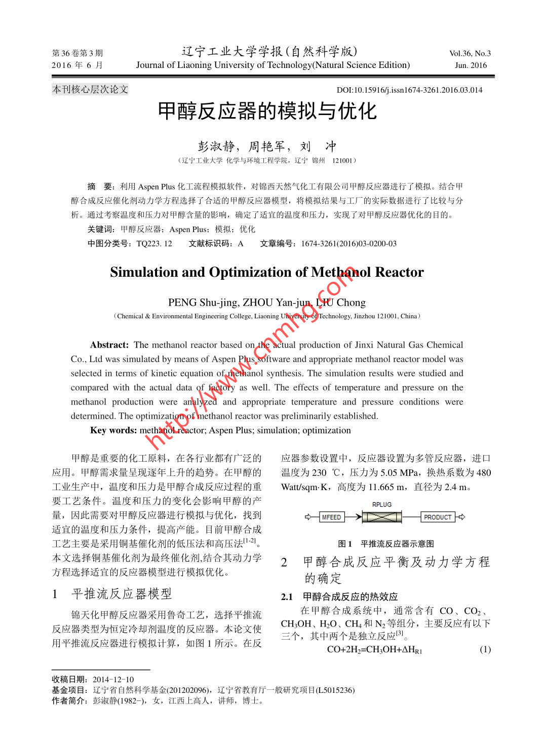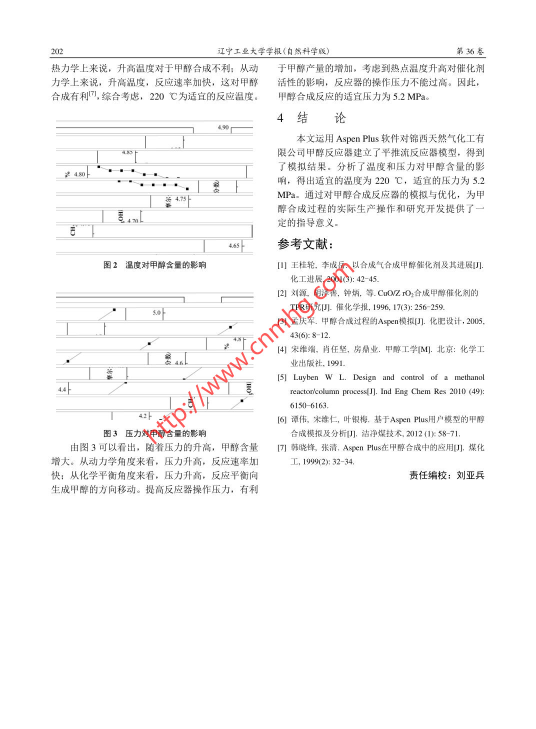 第36卷第3期遼寧工業(yè)大學(xué)學(xué)報(bào)(自然科學(xué)版)Vol.36, No.3.2016年6月Journal of Liaoning University of Technology(Natural Science Edition)Jun. 2016本刊核心層次論文DOI: 10.15916/j.sn1674 3261.2016.03.014甲醇反應(yīng)器的模擬與優(yōu)化彭淑靜,周艷軍,劉沖(遼寧工業(yè)大學(xué)化學(xué)與環(huán)境工程學(xué)院,遼寧錦州121001 )摘要:利用Aspen Plus化工流程模擬軟件,對錦西天然氣化工有限公司甲醇反應(yīng)器進(jìn)行了模擬。結(jié)合甲醇合成反應(yīng)催化劑動力學(xué)方程選擇了合適的甲醇反應(yīng)器模型,將模擬結(jié)果與工廠的實(shí)際數(shù)據(jù)進(jìn)行了比較與分析。通過考察溫度和壓力對甲醇含量的影響,確定了適宜的溫度和壓力,實(shí)現(xiàn)了對甲醇反應(yīng)器優(yōu)化的目的。關(guān)鍵詞:甲醇反應(yīng)器: Aspen Plus;模擬;優(yōu)化中圖分類號: TQ223. 12文獻(xiàn)標(biāo)識碼: A文章編號: 1674-3261(2016)03-0200-03Simulation and Optimization of Methanol ReactorPENG Shu-jing, ZHOU Yan-jun, LIU Chong(Chemical & Environmental Engineering College, Liaoning University of Technology. Jinzhou 121001, China)Abstract: The methanol reactor based on the actual production of Jinxi Natural Gas ChemicalCo., Ltd was simulated by means of Aspen Plus software and appropriate methanol reactor model wasselected in terms of kinetic equation of methanol synthesis. The simulation results were studied andcompared with the actual data of factory as well. The effects of temperature and pressure on themethanol production were analyzed and appropriate temperature and pressure conditions weredetermined. The optimization of methanol reactor was preliminarily established.Key words: methanol reactor; Aspen Plus; simulation; optimization甲醇是重要的化工原料,在各行業(yè)都有廣泛的應(yīng)器參數(shù)設(shè)置中,反應(yīng)器設(shè)置為多管反應(yīng)器,進(jìn)口應(yīng)用。甲醇需求量呈現(xiàn)逐年上升的趨勢。在甲醇的溫度為230 C,壓力為5.05 MPa,換熱系數(shù)為480工業(yè)生產(chǎn)中,溫度和壓力是甲醇合成反應(yīng)過程的重Watt/sqm.K,高度為11.665 m,直徑為2.4 m。要工藝條件。溫度和壓力的變化會影響甲醇的產(chǎn)RPLUG量,因此需要對甲醇反應(yīng)器進(jìn)行模擬與優(yōu)化,找到心MFEED]->工文工[ PRODUCT ]→適宜的溫度和壓力條件,提高產(chǎn)能。目前甲醇合成工藝主要是采用銅基催化劑的低壓法和高壓法1-2。圖1平推流反應(yīng)器示意圖本文選擇銅基催化劑為最終催化劑,結(jié)合其動力學(xué)2甲醇合成反應(yīng)平衡及動力學(xué)方程方程選擇適宜的反應(yīng)器模型進(jìn)行模擬優(yōu)化。的確定1平推流反應(yīng)器模型2.1甲醇合成反應(yīng)的熱效應(yīng)錦天化甲醇反應(yīng)器采用魯奇工藝,選擇平推流在甲醇合成系統(tǒng)中,通常含有CO、CO2、反應(yīng)器類型為恒定冷卻劑溫度的反應(yīng)器。本論文使CH3OH、H2O、CH4和N2等組分,主要反應(yīng)有以下用平推流反應(yīng)器進(jìn)行模擬計(jì)算,如圖1所示。在反三個(gè),其中兩個(gè)是獨(dú)立反應(yīng)B1。CO+2H2=CH3OH+AHp1(1)收稿日期: 2014-12- 10基金項(xiàng)目:遼寧省自然科學(xué)基金(201202096),遼寧省教育廳一般研究項(xiàng)目(L5015236)作者簡介:彭淑靜(1982-), 女, 江西上高人,講師,博士。第3期彭淑靜等:甲醇反應(yīng)器的模擬與優(yōu)化201CO2+3H2=CH;OH+H2O+OHk2(2)為5.35%,模擬結(jié)果為4.79%,模擬結(jié)果與實(shí)際數(shù)CO2+H2=CO+H2O+OHR3(3據(jù)接近,但有一定程度的偏差。這是因?yàn)榧状己铣墒街?△H1-=-49.143 kJ/mol,副反應(yīng)動力學(xué)極為復(fù)雜,模擬只考慮了主反應(yīng)。工△Hr2=-41.112 kJ/mol,廠所用催化劑與本次模擬采用的催化劑不同,催化△Hp3=-90 kJ/molo效果不同。在工廠實(shí)際生產(chǎn)中,會產(chǎn)生甲酸甲酯,2.2甲醇合 成反應(yīng)的平衡氬氣等惰性氣體和副產(chǎn)物,所以造成CO、CO2 含理想氣體反應(yīng)平衡常數(shù)Kf隨溫度變化的函數(shù)量有較大差異。式,可用反應(yīng)物和生成物的標(biāo)準(zhǔn)自由焓數(shù)據(jù)及理想表1模擬所得物流組成與工廠實(shí)際數(shù)據(jù)(摩爾分?jǐn)?shù)) %氣體反應(yīng)熱隨溫度變化的關(guān)系式計(jì)算整理得到4:.出塔氣體模擬結(jié)果實(shí)際數(shù)據(jù)Co1.425.52Kn=exp(13.17+9203.26/T-5.93InT-3.9013.85035x10-+0.10x10*r2)(4)71.5157.66Kp=exp(1.67+4553.34/T-2.73InT-:H;OH4.795.351.42x10*2+0.17x104T3)(5)CH415.3514.301.151.23Kp= Kp/ KnH2O1.82.02.3甲醇合 成反應(yīng)動力學(xué)方程惰性氣體及微量9.00Luyben'l在水轉(zhuǎn)化反應(yīng)的基礎(chǔ)上,以反應(yīng)2和表2甲醇反應(yīng) 器內(nèi)溫度、熱量及停留時(shí)間分布表反應(yīng)3為獨(dú)立反應(yīng)得出了甲醇合成銅基催化劑的動管長/m_ 壓力MPa溫度PC熱量/(GJh2)停留時(shí)間/s力學(xué)方程。動力學(xué)方程使用LHHW型方程描述,5.0523005.(266.493967.633壓力單位為bar,反應(yīng)速率單位為kmol. min'.kg'。1.1665.05 262 300-1973.56852.142反應(yīng)2與反應(yīng)3反應(yīng)速率方程式為: .1.7505.05 258.271-2818.28778.7262.3335.05 254.876-322.111105.641|1- (PuoPR.o/ Po,H)2.916R2=(kPco,PH3.4995.05 249.659-4594.604160.274[1+