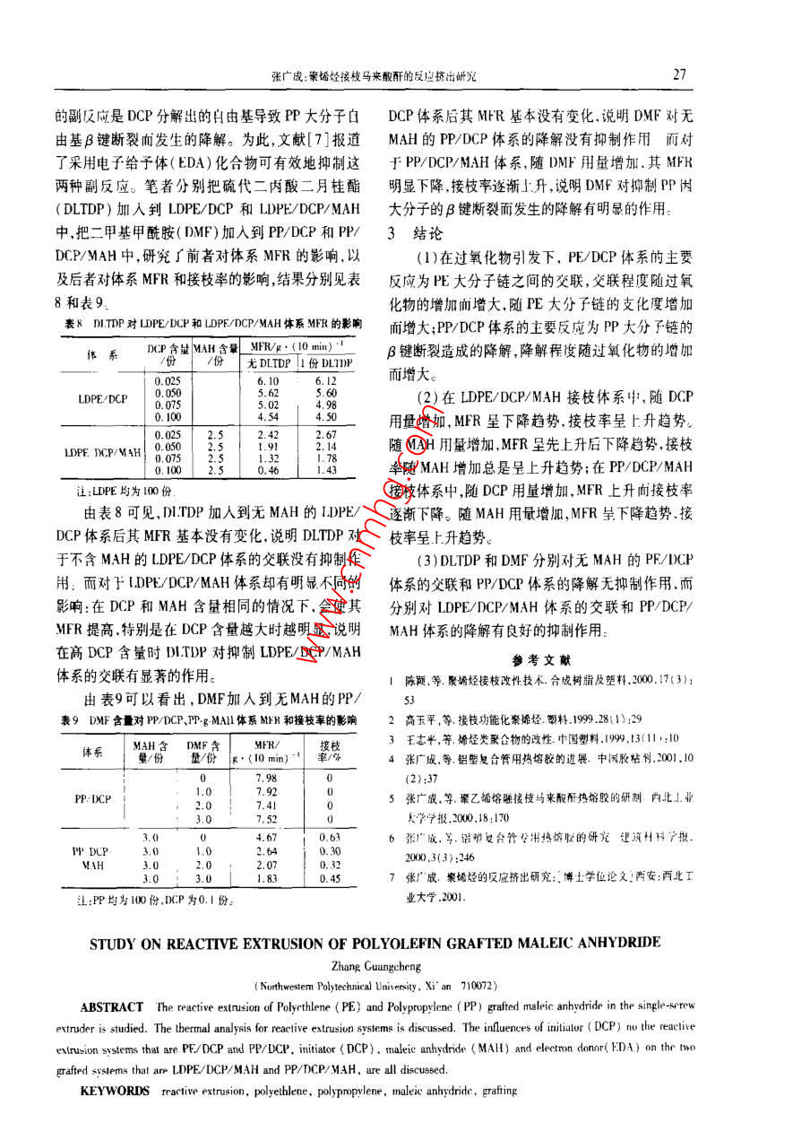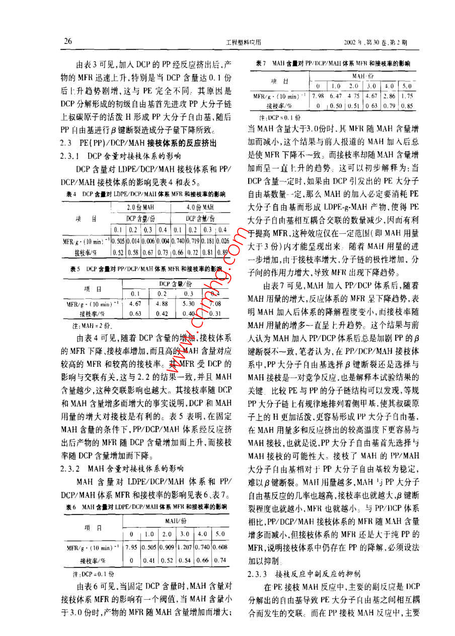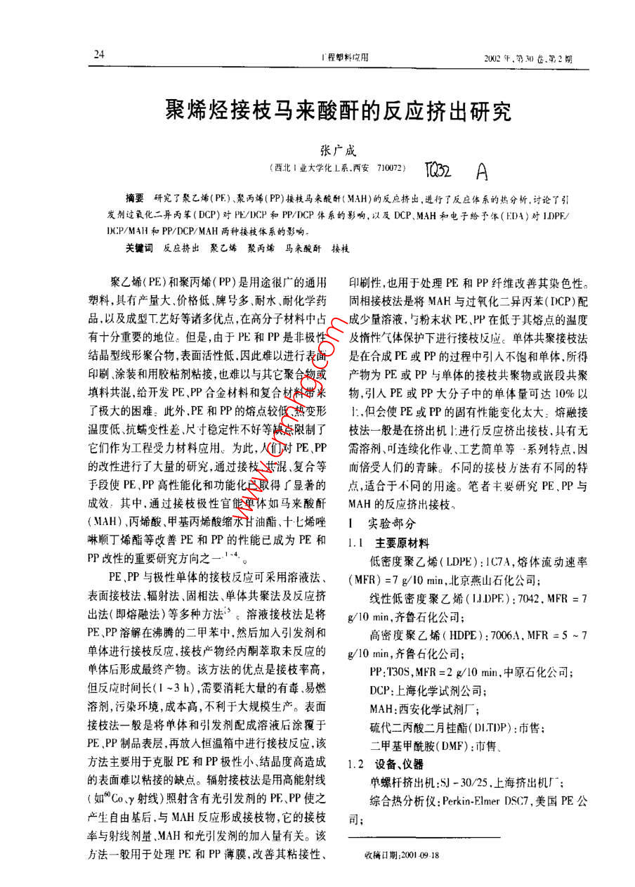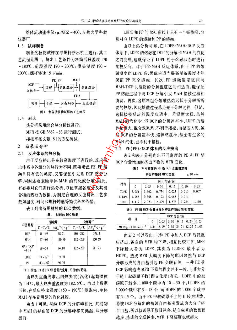 24I程郫料應(yīng)用2002年.第30齒第2切聚烯烴接枝馬來酸酐的反應(yīng)擠出研究張廣成(西北I業(yè)大學(xué)化L系.西安710072)T032 A摘要研究了聚乙烯(PE) 聚丙烯(PP)接核馬來酸酐( MAH)的反應(yīng)擠出,進(jìn)行了反應(yīng)體系的熱分析。討論了引發(fā)制過氧化二異丙笨(DCP)對PE/DCP和PP/DCP體系的影響,以及DCP. MAH和電子給予體(ED4)對LDPF/DCP/M4H和PP/DCP/MAH兩種接枝體系的影響。關(guān)鍵詞反應(yīng)擠出聚乙烯聚丙烯馬來酸酐接枝聚乙烯( PE)和聚丙烯( PP)是用途很廣的通用印刷性,也用于處理PE和PP纖維改善其染色性。塑料,具有產(chǎn)量大.價格低牌號多.耐水、耐化學(xué)藥固相接枝法是將MAH與過氧化二異丙苯(DCP)配品,以及成型T藝好等諸多優(yōu)點(diǎn),在高分子材料中占成少量溶液,與粉末狀PE、PP在低于其熔點(diǎn)的溫度有十分重要的地位。但是,由于PE和PP是非極性及惰性!氣體保護(hù)下進(jìn)行接枝反應(yīng)。單體共聚接枝法結(jié)晶型線形聚合物,表面活性低.因此難以進(jìn)行表面是在合成PE或PP的過程中引入不飽和單體,所得印刷涂裝和用膠粘劑粘接,也難以與其它聚合物或產(chǎn)物為PE或PP與單體的接枝共聚物或嵌段共聚填料共混,給開發(fā)PE、PP合金材料和復(fù)合材料帶來物,引人PE或PP大分子中的單體量可達(dá)10%以了極大的困難:此外,PE和PP的熔點(diǎn)較低熱變形上.但會使PE或PP的固有性能變化太大:熔融接溫度低抗蠕變性差、尺寸穩(wěn)定性不好等缺點(diǎn)限制了枝法一般是在擠出機(jī)l:進(jìn)行反應(yīng)擠出接枝,具有無它們作為工程受力材料應(yīng)用。為此,人們對PE PP需溶劑、可連續(xù)化作業(yè)、工藝簡單等. 系列特點(diǎn),因的改性進(jìn)行了大量的研究,通過接枝.共混、復(fù)合等而倍受人們的青睞。不同的接枝方法有不同的特手段使PE,PP高性能化和功能化已取得了顯著的點(diǎn),適合于不同的用途。筆者主要研究PE.PP與成效:其中,通過接枝極性官能單體如馬來酸酐MAH的反應(yīng)擠出接枝n(MAH)、丙烯酸、甲基丙烯酸縮水甘油酯,十七烯唑1實(shí)驗(yàn)部分啉順丁烯酯等改善PE和PP的性能已成為PE和1.1 主要原材料PP改性的重要研究方向之一4。低密度聚乙烯(LDPE):1C7A,熔體流動速率PE,PP與極性單體的接枝反應(yīng)可采用溶液法、(MFR) =7 g/l0 min,北京燕山石化公司; .表面接枝法、輻射法.固相法、單體共聚法及反應(yīng)擠線性低密度聚乙烯(1B.DPE): 7042. MFR =7出法(即熔融法)等多種方法”。溶液接枝法是將g/10 min,齊魯石化公司; :PE、PP溶解在沸騰的二甲苯中,然后加入引發(fā)劑和高密度聚乙烯( HDPE):7006A, MFR =5 ~ 7單體進(jìn)行接枝反應(yīng).接枝產(chǎn)物經(jīng)內(nèi)酮萃取末反應(yīng)的g/10 min,齊魯石化公司;單體后形成最終產(chǎn)物。該方法的優(yōu)點(diǎn)是接枝率高,PP:130S, MFR =2 g/l0 min,中原石化公司;但反應(yīng)時間長(1 ~3 h) ,需要消耗大量的有毒.易燃DCP:上?;瘜W(xué)試劑公司;溶劑,污染環(huán)境,成本高,不利于大規(guī)模生產(chǎn)。表面MAH:西安化學(xué)試劑廠;接枝法一般是將單體和引發(fā)劑配成溶液后涂覆于碗代二丙酸二月桂酯( DI.T)P):市售;PE、PP制品表層,再放入恒溫箱中進(jìn)行接枝反應(yīng),該二甲基甲酰胺( DMF) :市售方法主要用于克服PE和PP極性小、結(jié)晶度高造成1.2 設(shè)備、儀器的表面難以粘接的缺點(diǎn)。輻射接枝法是用高能射線單螺桿擠出機(jī):SJ - 30/25.上海擠出機(jī)廠; .(如°Coγ射線)照射含有光引發(fā)劑的PE、PP使之綜合熱分析儀: Perkin-Elmer DSC7,美國PE公產(chǎn)生自由基后,與MAH反應(yīng)形成接枝物,它的接枝司;率與射線劑量.MAH和光引發(fā)劑的加入量有關(guān)。該方法一般用于處理PE和PP薄膜,改善其粘接性、收稿日期:2001 0918張廣成:聚烯烴接枝馬來酸酐的反應(yīng)擠出研究25熔體流動速率儀:μPXRZ - 400,古林大學(xué)科教LDPE和PP的DSC曲線上只有一個吸熱峰.分儀器廠.別對應(yīng)LDPE的熔融和PP的熔觸:1.3 試樣制備由以上熱分析可知,在LDPE/MAH/DCP反應(yīng)制備接枝物試樣在單螺桿擠出機(jī)上進(jìn)行,其工體系中,LDPE的熔融在DCP的分解和MAH的汽化藝流程見圖1:擠出工出條件為料筒后段溫度170之前完成,這就保證了LDPE處于熔融狀態(tài)時進(jìn)行~ 180C.前段溫度190 ~ 200C;模頭溫度190 ~接枝反應(yīng)。對于PP/MAH反應(yīng)體系,由于PP的熔200心;螺桿轉(zhuǎn)速15 r/min ,融溫度比LDPE高.因此應(yīng)適當(dāng)提高制備溫度才能E,PPMAH保證PP完全熔融。其次,PP 熔融溫度區(qū)閥與D]一[溶解戶高進(jìn)混合一二高進(jìn)混合MAH/DCP共混物的分解溫度區(qū)間相適應(yīng),能保證分散劑一FDAPP熔融過程中與DCP分解引發(fā)MAH接枝過程相[ 制樣一干煤]一拉條切粒-反應(yīng)擠出協(xié)調(diào)。再次,各原料組分熔融熱焓遠(yuǎn)低于分解所需要的熱焓,因此熔融過程總是先干分解過程.但是,圖1制備接枝物試樣的工藝流程選擇接枝反應(yīng)的溫度應(yīng)適中。若溫度太低,雖然1.4 測試MAH的汽化少,但DCP的分解速率小,1D)PF的熔熱分析采用綜合熱分析儀進(jìn)行;體粘度大,混合效果差,不利于接枝;而溫度太高,雖MFR按GB 3682 - 83進(jìn)行測試;然DCP的分解速率快,熔體粘度小,但會有過多的接枝率按文獻(xiàn)[ 6]的方法測試。MAH汽化,也不利于接枝。2結(jié)果及分析2.2 PE( PP)/DCP體系的反應(yīng)擠出2.1 反應(yīng)體系