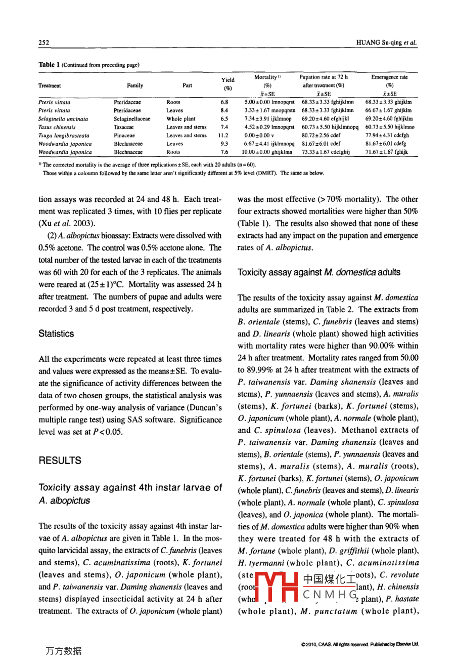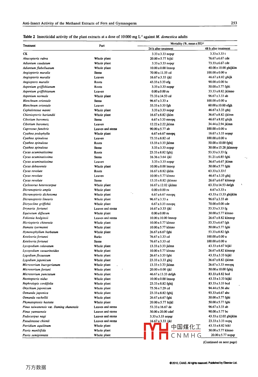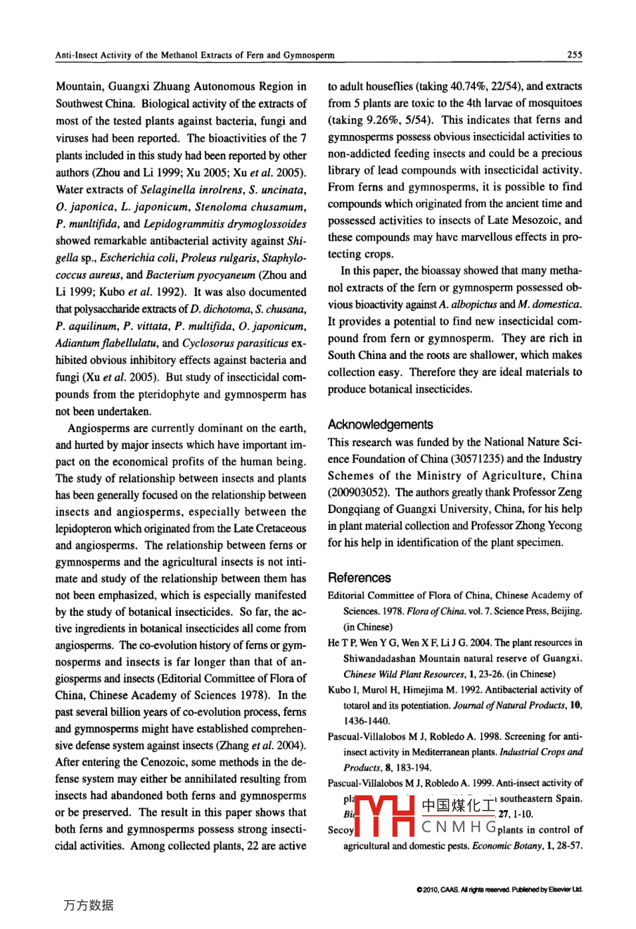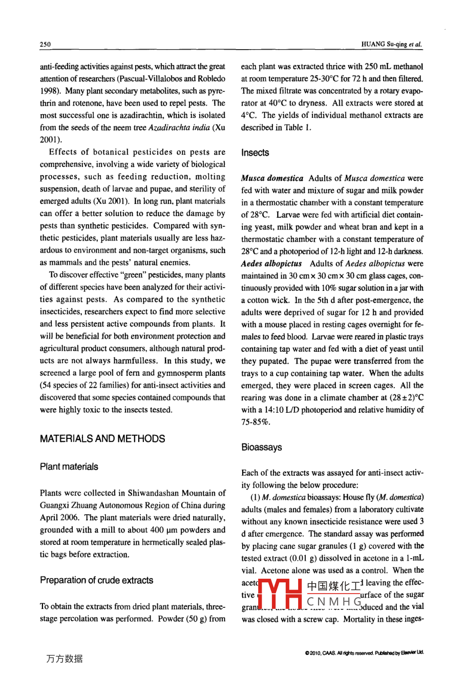 Available online at www.sciencedirect.comAgricultural Sciences in ChinaScienceDirect2010, 9(2): 249-256February 2010Anti-Insect Activity of the Methanol Extracts of Fern and GymnospermHUANG Su- qing', ZHANG Zhi- xiang, LI You-zhi-2, LI Yu-xial and XU Han-hong'' Key Laboratory of Natural Pesticide & Chemical Biology, Ministry of Education/South China Agricultural University, Guangzhou510642. P.R.China2 College of Bio-Safery Science and Technology, Hunan Agricultural University, Changsha 410128, P.R.ChinaAbstractWith environmental and food safety issues becoming one of the greatest concerns of the public, active plant compoundsplay more and more important roles in pest contolling. Fem are of great significance for application as new pesticides dueto their particular status in plant taxology and co-evolution with insects. In this study, methanol extracts were distilledfrom wild fern and gymnosperm of 54 species of 22 families collected from Shiwandashan Mountain in Guangxi ZhuangAutonomous Region of China. Insecticidal activities of the methanol extracts were assayed on both adult house fly(Musca domestica) and mosquito (Aedes albopicrus). Significant insecticidal activities were exhibited in the methanolextracts of five species, Cupressus funebris (leaves and stems), Cycas acuminatissima (roots), Keteleeria fortunei (leavesand stems), Onychium japonicum (whole plant), and Pinus taiwanensis var. Daming shanensis (leaves and stems).Applications of the extracts of these plants resulted in higher than 50% mortalties in 4th instar larvae of A. albopictus at24 h after treatment. The methanol extracts from 13 species possessed insecticidal activities against the adult of M.domestica at 48 h after treatment with higher than 90% mortalities. The extensive screening results showed that these femand gymnosperm were highly potential to be botanical insecticides. The findings provide a feasible and valuable basis forfurther investigation.Key words: plant extracts, anti-insect activity, Musca domestica, Aedes albopictusMelia toosendan and dried flowers of RhododendronINTRODUCTIONmolle to control rice pests in China. In recent years,agrochemical companies and researchers have beenPesticide is an important factor to maintain stable cropsearching for natural products for the development ofyield, but many pesticides are highly toxic and havenew insecticides. They expect to find botanical com-long-term persistence in environment. More thanpounds that are potential to be used as biological insec-8 x 107 t pesticides have been used around the worldticides (Secoy and Smith 1983; Xu 2001; Yang andsince the 1940s. They played an important role in cropChang 1988).protection; meanwhile they also polluted the environ-Botanicals are an important source of insecticidesment (PascualVillalobos and Robledo 1999).(Arroyo 1995). Plant secondary metabolites play an im-Plant materials have been used to control insect pestsportant role in protection of the plants from being dam-in China since ancient times. Even today, farmers stillaged by pests, germ and adverse climate. Some plantuse the dried stems of Nicotiana tabacum, leaves ofsecond中國(guó)煤化工idal, hormonal orTYHCNMHGReceived 13 April, 2009 Accped 25 November, 2009HUANG Su-qing. Postdoctor, E-mail: hsuqing@ 126.com; Correspondence XU Han-hong, Professor, Ph D. Tel: +86 20 -85285127, Fax: +86-20- 38604926, E mail:hhxu@scau. cdu.cn02010.CS. Mryts rseed Ptshebyesresereddot: 10. 151621290710090250HUANG Su-qing et al.anti-feeding activities against pests, which attract the greateach plant was extracted thrice with 250 mL methanolattention of researchers (Pascual-Villalobos and Robledoat room temperature 25- 30°C for 72 h and then filtered.1998). Many plant secondary metabolites, such as pyre-The mixed filrate was concentrated by a rotary evapo-thrin and rotenone, have been used to repel pests. Therator at 40°C to dryness. All extracts were stored atmost successful one is azadirachtin, which is isolated4°C. The yields of individual methanol extracts arefrom the seeds of the neem tree Azadirachta india (Xudescribed in Table 1.2001).Effects of botanical pesticides on pests areInsectscomprehensive, involving a wide variety of biologicalprocesses, such as feeding reduction, moltingMusca domestica Adults of Musca domestica weresuspension, death of larvae and pupae, and sterility offed with water and mixture of sugar and milk powderemerged adults (Xu 2001). In long run, plant materialsin a thermostatic chamber with a constant temperaturecan offer a better solution to reduce the damage byof 28°C. Larvae were fed with artificial diet contain-pests than synthetic pesticides. Compared with syn-ing yeast, milk powder and wheat bran and kept in athetic pesticides, plant materials usually are less haz-thermostatic chamber with a constant temperature ofardous to environment and non-target organisms, such28°C and a photoperiod of 12-h light and 12-h darkness.as mammals and the pests' natural enemies.Aedes albopictus Adults of Aedes albopictus wereTo discover efctive“green" pesticides, many plantsmaintained in 30 cmx 30 cmx 30 cm glass cages, con-of different species have been analyzed for their activi-tinuously provided with 10% sugar solution in a jar withties against pests. As compared to the synthetica cotton wick. In the 5th d after post- emergence, theinsecticides, researchers expect to find more selectiveadults were deprived of sugar for 12 h and providedand less persistent active compounds from plants. Iwith a mouse placed in resting cages overnight for fe-will be beneficial for both environment protection andmales to feed blood. Larvae were reared in plastic traysagricultural product consumers, although natural prod-containing tap water and fed with a diet of yeast untilucts are not always harmfulless. In this study, wethey pupated. The pupae were transferred from thescreened a large pool of ferm and gymnosperm plantstrays to a cup containing tap water. When the adu