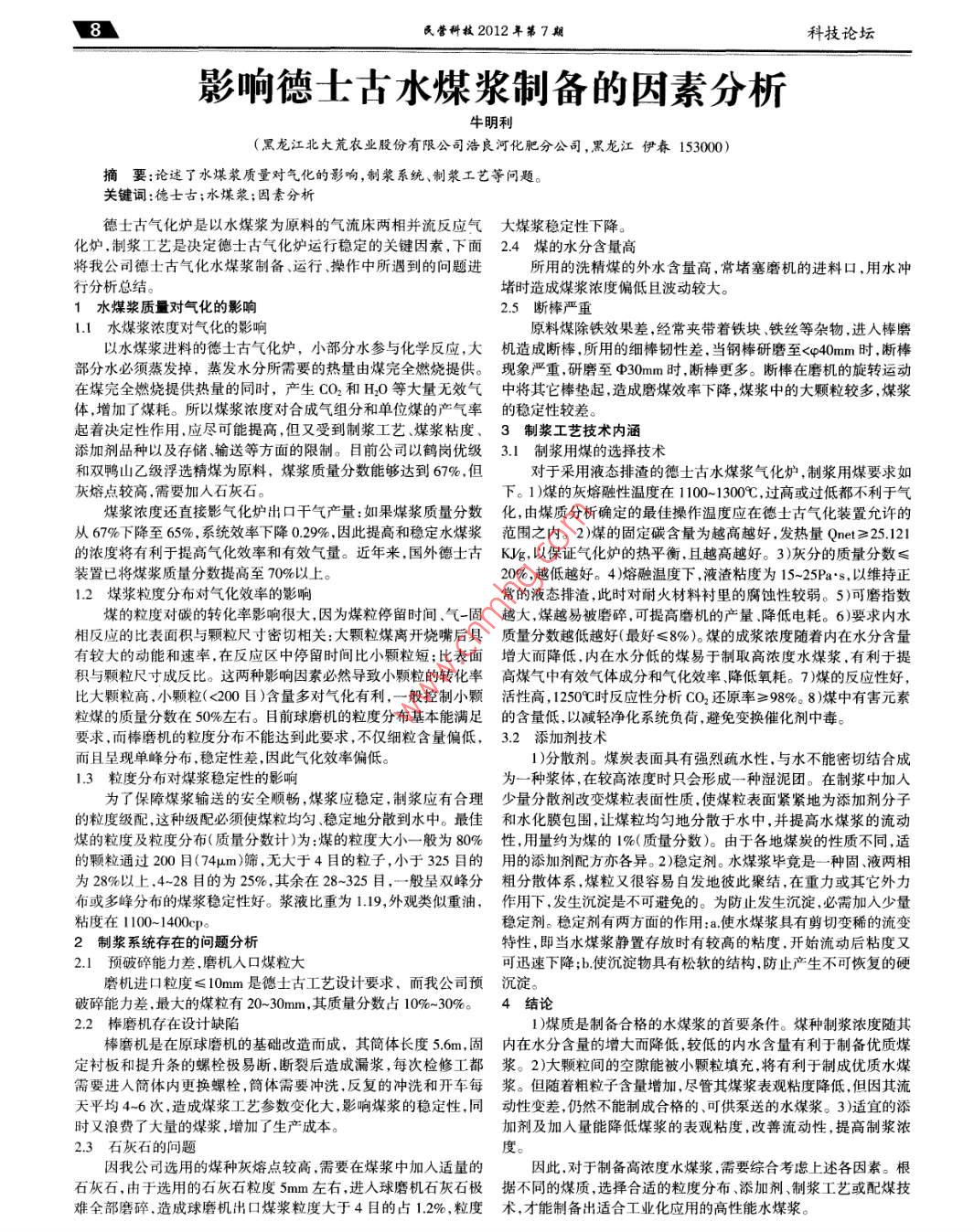 8民營軾2012年葦7期科技論壇影響德士古水煤漿制備的因素分析牛明利黑龍江北大荒農(nóng)業(yè)股份有限公司浩良河化肥分公司,黑龍江伊春153000摘要:論述了水煤漿質(zhì)量對氣化的影響,制漿系統(tǒng)、制漿工藝等問題。關鍵詞:德士古;水煤漿;因素分析德士古氣化爐是以水煤漿為原料的氣流床兩相并流反應氣大煤漿穩(wěn)定性下降?;癄t,制漿工藝是決定德士古氣化爐運行穩(wěn)定的關鍵因素,下面2.4煤的水分含量高將我公司德士古氣化水煤漿制備、運行操作中所遇到的問題進所用的洗精煤的外水含量高,常堵塞磨機的進料口,用水沖行分析總結(jié)。堵時造成煤漿濃度偏低且波動較大。1水煤漿質(zhì)量對氣化的影響25斷棒嚴重L.1水煤漿濃度對氣化的影響原料煤除鐵效果差,經(jīng)常夾帶著鐵塊、鐵絲等雜物,進人棒磨以水煤漿進料的德士古氣化爐,小部分水參與化學反應,大機造成斷棒所用的細棒韌性差,當鋼棒研磨至<φ40m時斷棒部分水必須蒸發(fā)掉,燕發(fā)水分所需要的熱量由煤完全燃燒提供?,F(xiàn)象嚴重研磨至φ30mm時,斷棒更多。斷棒在磨機的旋轉(zhuǎn)運動在煤完全燃燒提供熱量的同時,產(chǎn)生CO2和H等大量無效氣中將其它棒墊起,造成磨煤效率下降,煤漿中的大顆粒較多,煤漿體,增加了煤耗。所以煤漿濃度對合成氣組分和單位煤的產(chǎn)氣率的穩(wěn)定性較差起著決定性作用,應盡可能提高,但又受到制漿工藝、煤漿粘度、3制漿工藝技術內(nèi)涵添加劑品種以及存儲、輸送等方面的限制。目前公司以鶴崗優(yōu)級3.1制漿用煤的選擇技術和雙鴨山乙級浮選精煤為原料,煤漿質(zhì)量分數(shù)能夠達到67%,但對于采用液態(tài)排渣的德士古水煤漿氣化爐,制漿用煤要求如灰熔點較高,需要加入石灰石。下。1)煤的灰熔融性溫度在1100-1300℃C,過高或過低都不利于氣煤漿濃度還直接影氣化爐出口干氣產(chǎn)量:如果煤漿質(zhì)量分數(shù)化,由煤質(zhì)分析確定的最佳操作溫度應在德士古氣化裝置允許的從6%下降至65%,系統(tǒng)效率下降θ.29%,因此提高和穩(wěn)定水煤漿范圍之內(nèi)。2)煤的固定碳含量為越高越好,發(fā)熱量Qnet≥25.121的濃度將有利于提高氣化效率和有效氣量。近年來,國外德士古Kvg,以保證氣化爐的熱平衡,且越高越好。3)灰分的質(zhì)量分數(shù)≤裝置已將煤漿質(zhì)量分數(shù)提高至70%以上。20%,越低越好。4)熔融溫度下,液渣粘度為15~25Pa·s,以維持正1.2煤漿粒度分布對氣化效率的影響常的液態(tài)排渣,此時對耐火材料襯里的腐蝕性較弱。5)可磨指數(shù)煤的粒度對碳的轉(zhuǎn)化率影響很大,因為煤粒停留時間、氣-固越大,煤越易被磨碎,可提高磨機的產(chǎn)量、降低電耗。6)要求內(nèi)水相反應的比表面積與顆粒尺寸密切相關:大顆粒煤離開燒嘴后具質(zhì)量分數(shù)越低越好(最好≤8%)。煤的成漿濃度隨著內(nèi)在水分含量有較大的動能和速率,在反應區(qū)中停留時間比小顆粒短;比表面增大而降低,內(nèi)在水分低的煤易于制取高濃度水煤漿,有利于提積與顆粒尺寸成反比。這兩種影響因素必然導致小顆粒的轉(zhuǎn)化率高煤氣中有效氣體成分和氣化效率、降低氧耗。7煤的反應性好,比大顆粒高,小顆粒(<200目)含量多對氣化有利,一般控制小顆活性高,1250℃時反應性分析CO2還原率≥98%。8)煤中有害元素粒煤的質(zhì)量分數(shù)在50%左右。目前球磨機的粒度分布基本能滿足的含量低,以減輕凈化系統(tǒng)負荷,避免變換催化劑中毒。要求,而棒磨機的粒度分布不能達到此要求,不僅細粒含量偏低,3.2添加劑技術而且呈現(xiàn)單峰分布,穩(wěn)定性差,因此氣化效率偏低。1)分散劑。煤炭表面具有強烈疏水性,與水不能密切結(jié)合成1.3粒度分布對煤漿穩(wěn)定性的影響為一種漿體,在較高濃度時只會形成一種濕泥團。在制漿中加入為了保障煤漿輸送的安全順暢,煤漿應穩(wěn)定,制漿應有合理少量分散劑改變煤粒表面性質(zhì),使煤粒表面緊緊地為添加劑分子的粒度級配,這種級配必須使煤粒均勻、穩(wěn)定地分散到水中。最佳和水化膜包圍,讓煤粒均勻地分散于水中,并提高水煤漿的流動煤的粒度及粒度分布(質(zhì)量分數(shù)計)為:煤的粒度大小一般為80%性,用量約為煤的1%(質(zhì)量分數(shù))。由于各地煤炭的性質(zhì)不同,適的顆粒通過200目(74μm)篩,無大于4目的粒子,小于325目的用的添加劑配方亦各異。2)穩(wěn)定劑。水煤漿畢竟是一種固、液兩相為28%以上,4-28目的為25%,其余在28~325目,一般呈雙峰分粗分散體系煤粒又很容易自發(fā)地彼此聚結(jié),在重力或其它外力布或多峰分布的煤漿穩(wěn)定性好。漿液比重為1.19,外觀類似重油,作用下,發(fā)生沉淀是不可避免的。為防止發(fā)生沉淀,必需加入少量粘度在1100~-1400p穩(wěn)定劑。穩(wěn)定劑有兩方面的作用:a使水煤漿具有剪切變稀的流變2制漿系統(tǒng)存在的問題分析特性,即當水煤漿靜置存放時有較高的粘度,開始流動后粘度又2預破碎能力差,磨機入口煤粒大可迅速下降;b使沉淀物具有松軟的結(jié)構,防止產(chǎn)生不可恢復的硬磨機進口粒度≤10mm是德士古工藝設計要求,而我公司預沉淀。破碎能力差,最大的煤粒有20-30mm,其質(zhì)量分數(shù)占10%-30%。4結(jié)論22棒磨機存在設計缺陷1)煤質(zhì)是制備合格的水煤漿的首要條件。煤種制漿濃度隨其棒磨機是在原