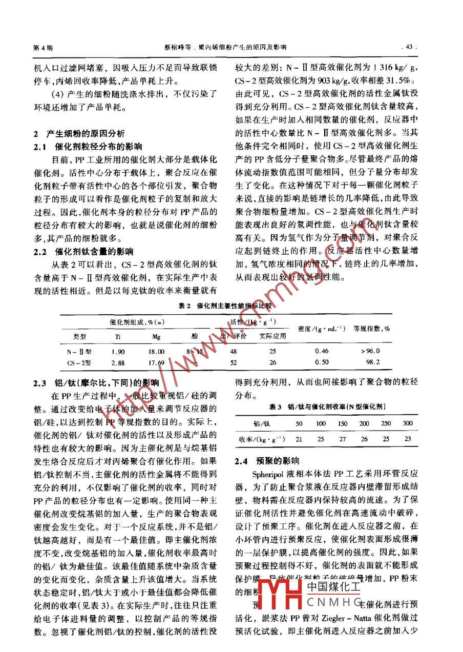 工業(yè)技術(shù)合成樹脂及塑料,2002,19(4):42CHINA SYNTHETIC RESIN AND PLASTICS聚丙烯細(xì)粉產(chǎn)生的原因及影響蔡榕峰劉彥昌福建煉油化工有限公司,泉州,362117)摘要;結(jié)合CS-2型尚效催化劑在液相本體法聚丙烯裝腎應(yīng)用的實(shí)際,分析了細(xì)粉含量增加的主要原因有:催化劑本身粒徑的分布、催化劑鈦含量、鋁做鈦(摩爾比,下同)控制情況、換粢效果以及粢合反應(yīng)條件的影響。通過對(duì)細(xì)粉增加原因的分析,提出了3條改進(jìn)措施:改進(jìn)催化劑制備,選擇粒徑分布好、強(qiáng)度高的催化劑載體,控制好制備的各個(gè)環(huán)節(jié);調(diào)整預(yù)聚操作條件,保證預(yù)聚效果減少催化劑破損;根據(jù)催化劑特性,控制好催化劑的鋁/鈦,充分利用催化劑活性是減少細(xì)粉生成的有效措施。關(guān)鍵詞:聚內(nèi)烯細(xì)粉液相本體法催化劑目前,液相本體法聚丙烯(PP)已被廣泛采表IPP粉料的粒徑分布比較用。我國(guó)在消化吸收引進(jìn)技術(shù)的基礎(chǔ)上,積極推進(jìn)企業(yè)的技術(shù)改造和技術(shù)進(jìn)步,加快“三劑”國(guó)產(chǎn)T30化的步伐。特別是在催化劑國(guó)產(chǎn)化方面取得了重3-2型N-Ⅱ型CS-2型N-Ⅱ型CS-2型N-l型大突破,先后研制出液相本體PP專用的N系列<2060.6581.1062.0273.9067.2785.53等高效催化劑。這些催化劑不僅價(jià)格低,在性能2026.5015.1919.lL.36上也達(dá)到或超過了國(guó)外同類產(chǎn)品。近年來,我國(guó)35-6013.022,2310.0510.0611.632.0160~802.601,351.090.811.501.05采用環(huán)管工藝的液相本體法技術(shù)先后建成了4套70kt/aPP裝置。投產(chǎn)后裝置運(yùn)轉(zhuǎn)平穩(wěn),并相繼進(jìn)0.010.130.020.180.行了國(guó)產(chǎn)N-Ⅱ型和CS-2型高效催化劑的試生產(chǎn)。試生產(chǎn)結(jié)果表明:國(guó)產(chǎn)催化劑氫調(diào)性能和收氣過濾和洗滌系統(tǒng),造成循環(huán)氣過濾器的濾袋堵率優(yōu)于國(guó)外同類產(chǎn)品,能滿足液相本體法PP工藝塞。嚴(yán)重時(shí)還導(dǎo)致安全過濾器濾芯堵塞,縮短了的要求,產(chǎn)品達(dá)到要求的質(zhì)量指標(biāo)。但是,在試生過濾器的使用周期和濾袋的使用壽命,影響裝置產(chǎn)期間也出現(xiàn)∫聚合物粒徑分布不均勻和細(xì)粉含的長(zhǎng)周期運(yùn)轉(zhuǎn)。量高的現(xiàn)象,給生產(chǎn)帶來一定影響。本文結(jié)合生(2)P細(xì)粉還對(duì)聚合物干燥工序有較大影產(chǎn)實(shí)際論述了PP細(xì)粉對(duì)生產(chǎn)的影響,并對(duì)形成細(xì)響,干燥器用熱氮進(jìn)行氣流干燥時(shí)細(xì)粉夾帶量增粉的原因進(jìn)行了分析。加,常引起旋風(fēng)分離器下料管堵塞。帶有細(xì)粉的氣體進(jìn)入加熱器和洗滌塔冷卻器,由于PP細(xì)粉附lPP細(xì)粉對(duì)生產(chǎn)的影響著在設(shè)備和管線的內(nèi)壁形成一層薄膜,使換冷設(shè)11PP粉料的粒徑分布比較備的能力下降從表1可以看出,用CS-2型高效催化劑生(3)細(xì)粉進(jìn)入丙烯回收系統(tǒng)引起循環(huán)氣壓縮產(chǎn)的聚合物粉末的細(xì)粉含量較高,比N-Ⅱ型高效催化劑產(chǎn)品增加1%的細(xì)粉。中國(guó)煤化工12細(xì)粉對(duì)生產(chǎn)的影響CNMHG悟厚,11年生,1995年畢業(yè)于廈門大學(xué)(1)P細(xì)粉含量增加給物料分離帶來一定化學(xué)系,從事石油化工生產(chǎn)及管理工作多年。聯(lián)系電話:困難。聚合產(chǎn)物閃蒸時(shí)細(xì)粉被氣流夾帶進(jìn)入循環(huán)(0595)7799077;E-muil;cin@263.net第4期蔡榕峰等.內(nèi)烯細(xì)粉產(chǎn)生的原閃及影響機(jī)入口過濾網(wǎng)堵塞,因吸入壓力不足而導(dǎo)致聯(lián)鎖較大的差別:N-Ⅱ型高效催化劑為1316kg/g停車,內(nèi)烯回收率降低,產(chǎn)品單耗上升。-2型高效催化劑為903kg/g,收率相差31.5(4)產(chǎn)生的細(xì)粉隨洗滌水排出,不僅污染了由此可見,CS-2型高效催化劑的活性金屬鈦沒環(huán)境還增加了產(chǎn)品單耗。得釗充分利用。CS-2型高效催化劑鈦含量較高,如果在生產(chǎn)時(shí)加入相同數(shù)量的催化劑,反應(yīng)器中2產(chǎn)生細(xì)粉的原因分析的活性中心數(shù)量比N-Ⅱ型高效催化劑多。當(dāng)其2.1催化劑粒徑分布的影響他條件完全相同時(shí),使用CS-2型高效催化劑生目前,PP工業(yè)所用的催化劑大部分是載體化產(chǎn)的PP含低分子量聚合物多。盡管最終產(chǎn)品的熔催化劑?;钚灾行姆植加谳d體上,聚合反應(yīng)在催體流動(dòng)指數(shù)值范圍可能相同,但分子量分布卻發(fā)化劑粒子帶有活性中心的各個(gè)部位引發(fā),聚合物生了變化。在這種情況下對(duì)于每一顆催化劑粒子粒子的形成可以看作是催化劑粒子的復(fù)制和放大來說,直接的影響是鏈增長(zhǎng)的幾率降低,由此導(dǎo)致過程。因此,催化劑本身的粒徑分布對(duì)PP產(chǎn)品的聚合物細(xì)粉量增加。CS-2型高效催化劑生產(chǎn)時(shí)粒徑分布有較大的影響,也就是說催化劑的細(xì)粉能表現(xiàn)出良好的氫調(diào)性能,也與催化劑鈦含量較多,其產(chǎn)品的細(xì)粉就多。高有關(guān)。因?yàn)闅錃庾鳛榉肿恿空{(diào)節(jié)劑,對(duì)聚合反22催化劑鈦含量的影響應(yīng)起到鏈終止的作用。反應(yīng)器活性中心數(shù)量增從表2可以看出,CS-2型高效催化劑的鈦加,氫氣濃度相同的情況下,鏈終止的幾率增加含量高于N-Ⅱ型高效催化劑,在實(shí)際生產(chǎn)