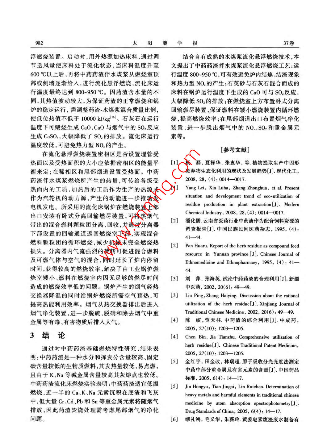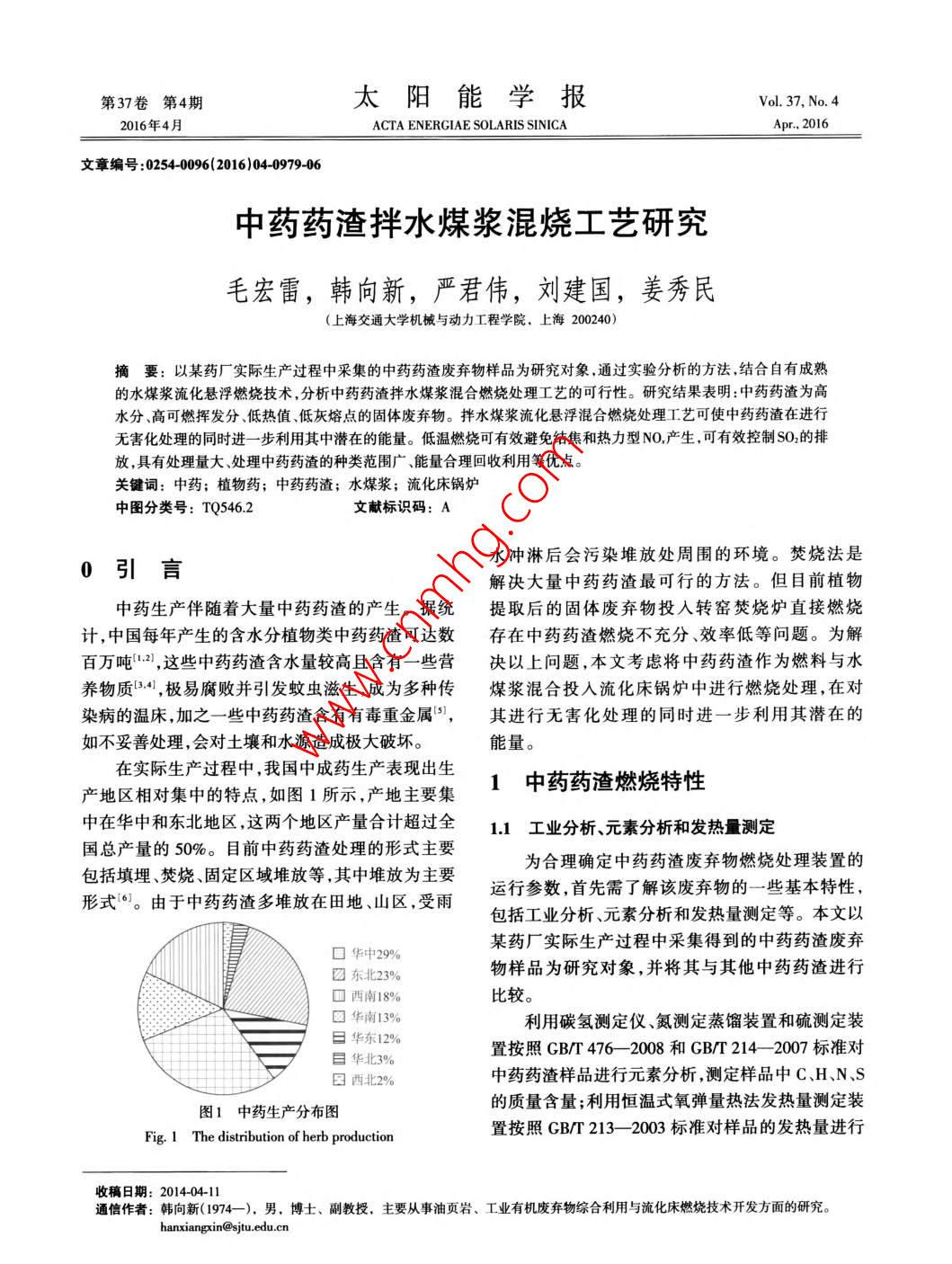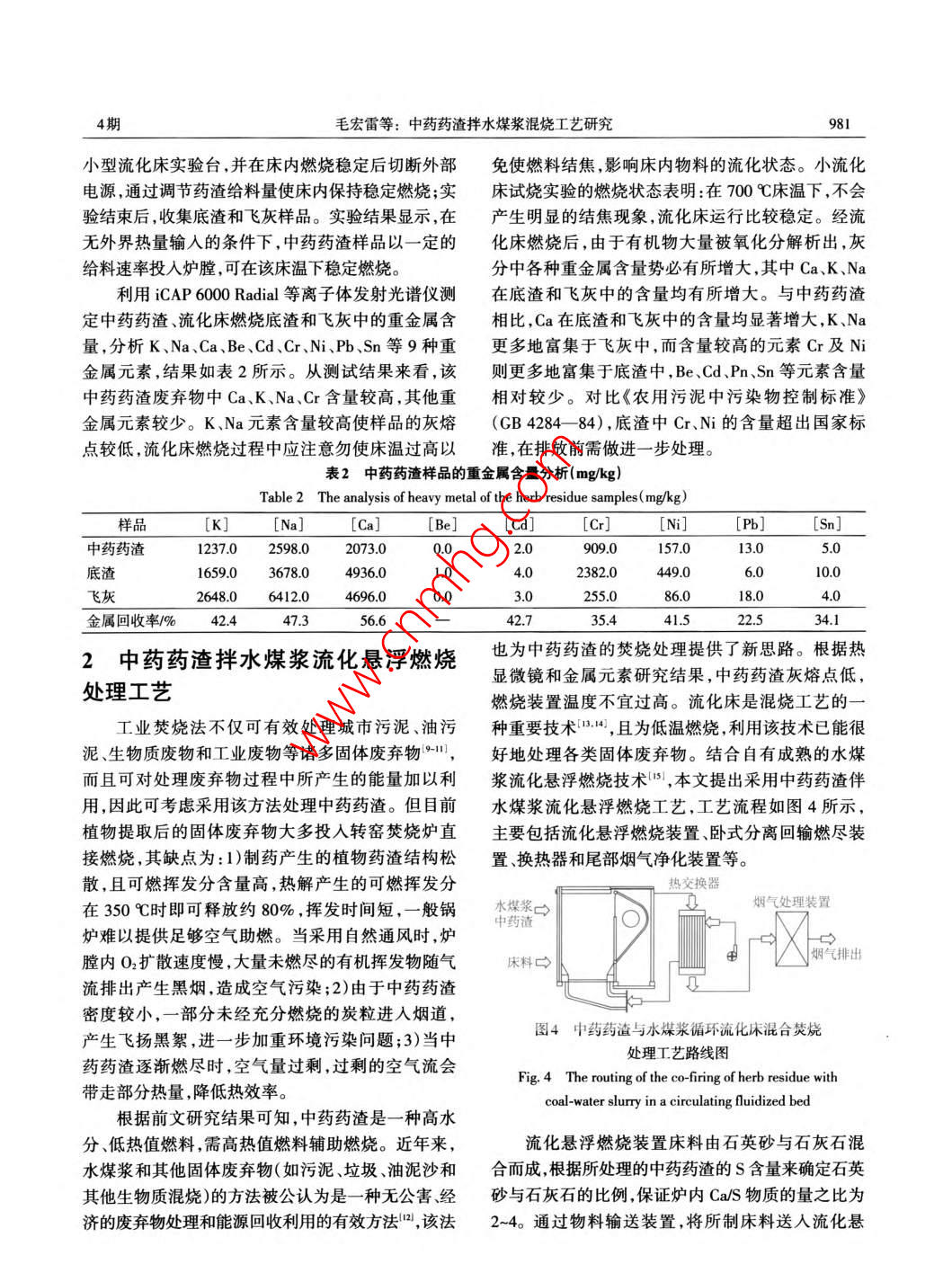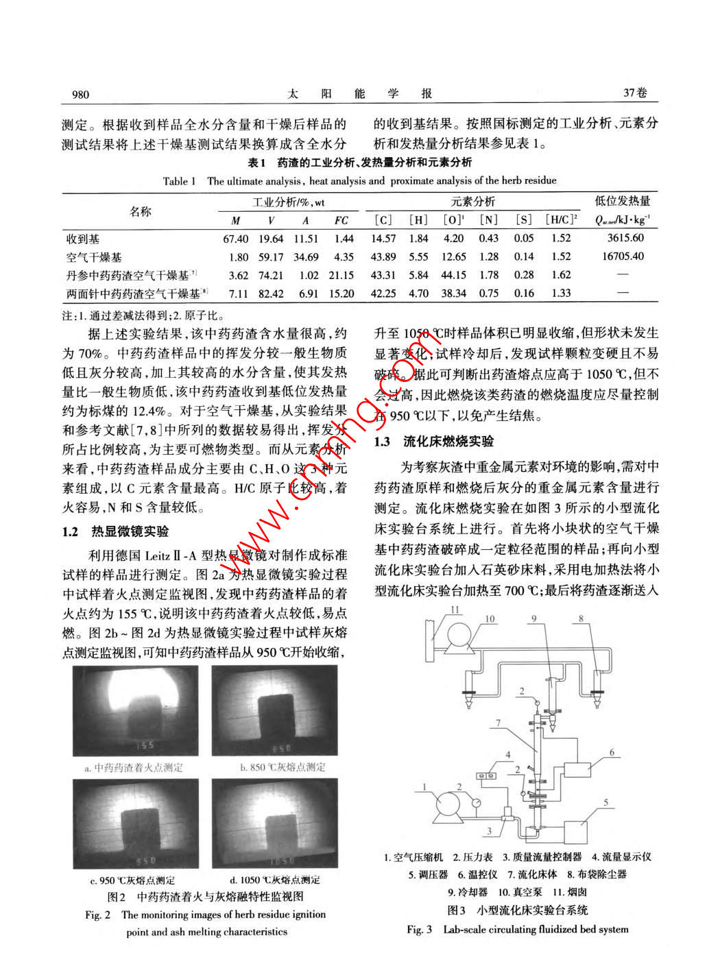 第37卷第4期太陽能學報Vol. 37, No. 42016年4月ACTA ENERGIAE SOLARIS SINICAApr.,2016文章編號:02540096(2016)040979-06中藥藥渣拌水煤漿混燒工藝研究毛宏雷,韓向新,嚴君偉,劉建國,姜秀民(上海交通大學機械與動力工程學院,上海200240)摘要:以某藥廠實際生產過程中采集的中藥藥渣廢棄物樣品為研究對象,通過實驗分析的方法,結合自有成熟的水煤漿流化懸浮燃燒技術,分析中藥藥渣拌水煤漿混合燃燒處理工藝的可行性。研究結果表明:中藥藥渣為高水分、高可燃揮發(fā)分、低熱值、低灰熔點的固體廢棄物。拌水煤漿流化懸浮混合燃燒處理工藝可使中藥藥渣在進行無害化處理的同時進一步利用其中潛在的能量。低溫燃燒可有效避免結焦和熱力型NO,產生,可有效控制SO2的排放,具有處理量大、處理中藥藥渣的種類范圍廣、能量合理回收利用等優(yōu)點。關鍵詞:中藥;植物藥;中藥藥渣;水煤漿;流化床鍋爐中圖分類號:TQ5462文獻標識碼:A0引言水沖淋后會污染堆放處周圍的環(huán)境。焚燒法是解決大量中藥藥渣最可行的方法。但目前植物中藥生產伴隨著大量中藥藥渣的產生。據統(tǒng)提取后的固體廢棄物投入轉窯焚燒爐直接燃燒計,中國每年產生的含水分植物類中藥藥渣可達數存在中藥藥渣燃燒不充分、效率低等問題。為解百萬噸2),這些中藥藥渣含水量較高且含有一些營決以上問題,本文考慮將中藥藥渣作為燃料與水養(yǎng)物質3,極易腐敗并引發(fā)蚊蟲滋生,成為多種傳煤漿混合投入流化床鍋爐中進行燃燒處理,在對染病的溫床,加之一些中藥藥渣含有有毒重金屬,其進行無害化處理的同時進一步利用其潛在的如不妥善處理,會對土壤和水源造成極大破壞。能量。在實際生產過程中,我國中成藥生產表現出生產地區(qū)相對集中的特點,如圖1所示,產地主要集1中藥藥渣燃燒特性中在華中和東北地區(qū),這兩個地區(qū)產量合計超過全11工業(yè)分析、元素分析和發(fā)熱量測定國總產量的50%。目前中藥藥渣處理的形式主要包括填埋、焚燒、固定區(qū)域堆放等,其中堆放為主要為合理確定中藥藥渣廢棄物燃燒處理裝置的形式6。由于中藥藥渣多堆放在田地、山區(qū),受雨行參數,首先需了解該廢棄物的一些基本特性包括工業(yè)分析、元素分析和發(fā)熱量測定等。本文以某藥廠實際生產過程中采集得到的中藥藥渣廢棄口華中29%團東北239物樣品為研究對象,并將其與其他中藥藥渣進行□西南18%比較。E華南13%利用碳氫測定儀、氮測定蒸餾裝置和硫測定裝曰華東12%目華北3%置按照GBT476-2008和GB/T2142007標準對西北2%中藥藥渣樣品進行元素分析,測定樣品中C、HN、S圖1中藥生產分布圖的質量含量;利用恒溫式氧彈量熱法發(fā)熱量測定裝Fig. I The distribution of herb production置按照GBT213-2003標準對樣品的發(fā)熱量進行通信作者:韓向新(1974—),男,博士、副教授,主要從事油頁巖、工業(yè)有機廢棄物綜合利用與流化床燃燒技術開發(fā)方面的研究。hanxiangxin@sjtu.edu.cn980太陽能學報37卷測定。根據收到樣品全水分含量和干燥后樣品的的收到基結果。按照國標測定的工業(yè)分析、元素分測試結果將上述干燥基測試結果換算成含全水分析和發(fā)熱量分析結果參見表1。表1藥渣的工業(yè)分析發(fā)熱量分析和元素分析Table 1 The ultimate analysis, heat analysis and proximate analysis of the herb residue工業(yè)分析%元素分析低位發(fā)熱量名稱M V A FC [C] [H] [O] [N] [S] [H/C]2 Q, ne/kJ.kg"收到基674019.6411.5114414.571.844.200.430.051.52361560空氣干燥基18059.1734.694.3543.8955512.651.280.141.516705.40丹參中藥藥渣空氣干燥基”36274211.0221.1543.3158444151.780.28162兩面針中藥藥渣空氣干燥基”711242691152042254703430501613注:1.通過差減法得到;2.原子比據上述實驗結果,該中藥藥渣含水量很高,約升至1050℃時樣品體積已明顯收縮,但形狀未發(fā)生為70%。中藥藥渣樣品中的揮發(fā)分較一般生物質顯著變化;試樣冷卻后,發(fā)現試樣顆粒變硬且不易低且灰分較高,加上其較高的水分含量,使其發(fā)熱破碎。據此可判斷出藥渣熔點應高于1050℃,但不量比一般生物質低,該中藥藥渣收到基低位發(fā)熱量會過高,因此燃燒該類藥渣的燃燒溫度應盡量控制約為標煤的124%。對于空氣干燥基,從實驗結果在950℃以下,以免產生結焦。和參考文獻[7,8]中所列的數據較易得出,揮發(fā)分所占比例較高,為主要可燃物類型。而從元素分析1.3流化床燃燒實驗來看,中藥藥渣樣品成分主要由C、H、O這3種元為考察灰渣中重金屬元素對環(huán)境的影響需對中素組成,以C元素含量最高。HC原子比較高,著藥藥渣原樣和燃燒后灰分的重金屬元素含量進行火容易,N和S含量較低。測定。流化床燃燒實驗在如圖3所示的小型流化1.2熱顯微鏡實驗床實驗臺系統(tǒng)上進行。首先將小塊狀的空氣干燥利用德國 Leitz l-A型熱顯微鏡對制作成標準基中藥藥渣破碎成一定粒徑范圍的樣品;再向小型試樣的樣品進行測定。圖2a為熱顯微鏡實驗過程流化床實驗臺加人石英砂床料采用電加熱法將小中試樣著火點測定監(jiān)視圖,發(fā)現中藥藥渣樣品的著型流化床實驗臺加熱至700℃;最后將藥渣逐漸送入火點約為155℃,說明該中藥藥渣著火點較低,易點燃。圖2b~圖2d為熱顯微鏡實驗過程中試樣灰熔點測定監(jiān)視圖,可知中藥藥渣樣品從950℃開始收縮a.中藥藥渣著火點測定b.850℃灰熔點測定1.空氣壓縮機2壓