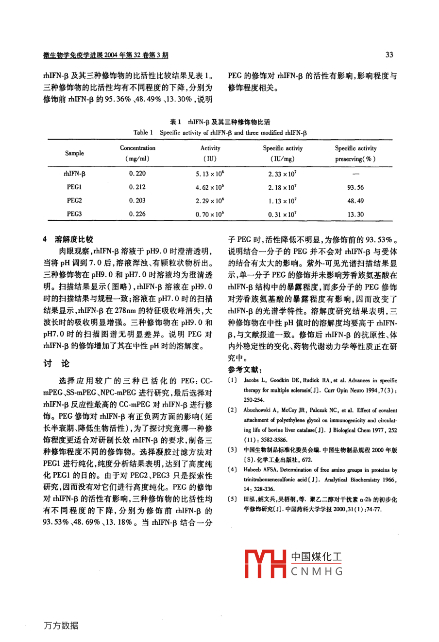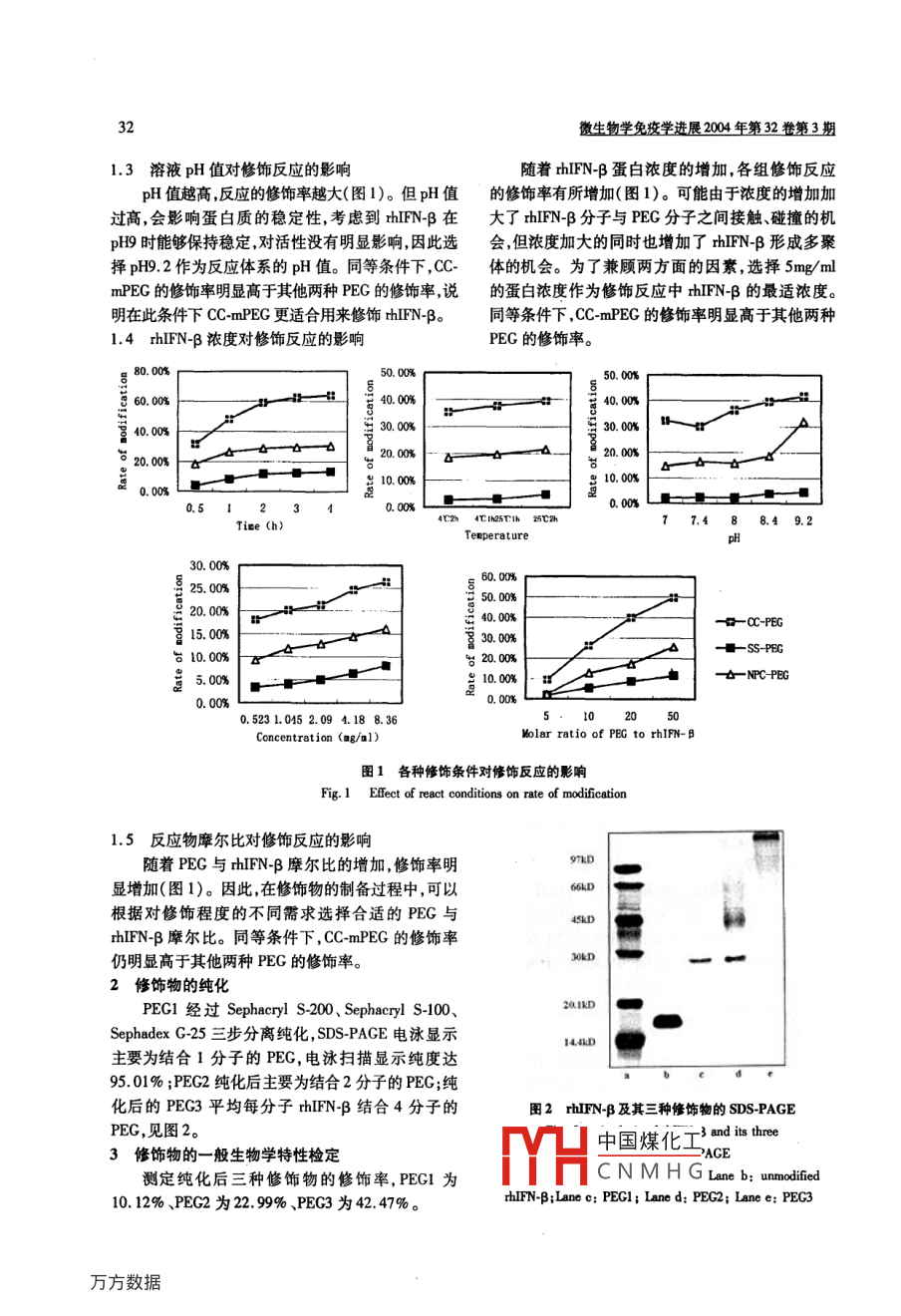 微生物學(xué)免疫學(xué)進(jìn)展2004年第32卷第3期聚乙二醇修飾β千擾素的研究徐靜,倪道明,張振龍(北京生物制品研究所,北京100024)摘要采用平均分子量為5kD的已活化的單甲氧基聚乙二醇(mPEC)對(duì)重組人β干擾素(hFNB)進(jìn)行化學(xué)修飾。優(yōu)化修飾條件,選擇對(duì)hFNβ反應(yīng)性高的修飾劑制備三種不同修飾程度的修飾物,并對(duì)修飾物進(jìn)行初步檢定。三種修飾物的修飾率分別為10.12%、22.99%、42.47%;比活性分別保留為原來的93.53%、48.69%、13.18%;PEG修飾后的thINβ在pH7時(shí)的溶解度增加關(guān)鍵詞:重組人β-干擾素;聚乙二醇;化學(xué)修飾中圖分類號(hào):R392.11文獻(xiàn)標(biāo)識(shí)碼:A文章編號(hào):10055673(2004)03003004Preliminary study on chemical modification of interferon-p by polyethylene glycol XU Jing, NI Dao-ming, ZHANGZhen-Long( National Vaccine and Serum Institute, Beiing 100024, ChinaAbstract: rhIFN-B was modified by activated methoxypolyethylene glycol mPEG). with the optimization of modifying con-ditions, CC-mPEG was chosed to modify rhIFN-B and three peglated rhIFN-B were prepared, the extents of modification are10. 12%, 22.99%, and 42. 47% respectively. Specific activity of three peglated rhIFN-B is 93. 53%,48.69%, 13.18%of original rhIFN-B respectively. Polypeglation had effect on the configuration of rhIFN-B. The peglation increased the solubility of rhIFN-B at neutral pHKey words: rhIFN-B: Polyethylene glycol; Chemical modificationhFNB是一種多功能細(xì)胞因子,它可以在細(xì)胞大腸桿菌表達(dá)的 rhIFN-Bserl7為北京生物制品表面與特殊的受體結(jié)合而發(fā)揮抗病毒、抗細(xì)胞增殖和研究所中試一室提供(純度為95%以上),氰尿酰氯免疫調(diào)節(jié)作用。1993年,hFNB獲美國FDA批準(zhǔn)用活化的單甲氧基聚乙二醇(mPEG)、琥珀酸琥珀酰于多發(fā)性硬化癥(MS)的治療。另外hFNB也可亞胺酯活化的mPEG、對(duì)硝基苯碳酸酯活化的以用于上皮癌、腎癌、基底細(xì)胞癌、乙型肝炎、丙型肝mPEG、2,4,6-三硝基苯磺酸均購自 SIGMA公司,水炎等疾病的治療。與其它基因工程類藥物一樣,由于合茚三酮購自北京化學(xué)試劑公司,水皰性口腔炎病缺乏天然蛋白質(zhì)所具有的糖基,hFNB的半衰期短毒(VSV)、人羊膜細(xì)胞均為北京生物制品研究所中并具有一定的免疫原性、疏水性較強(qiáng)等特點(diǎn)因此存試一室保存, rhIFN-B ser7國際標(biāo)準(zhǔn)品購自英國在著進(jìn)一步改善hNB的臨床治療效果的需求。NBSC1977年 Abuchowski等證明:作為治療藥物聚乙二醇2透析 rhIFN-B(PEG, polyethylene glycol)修飾的蛋白質(zhì)比未修飾的透析液為含有0.1%SDs的0.1mo/L的四硼蛋白質(zhì)更有效。目前,國內(nèi)外已經(jīng)嘗試用PG對(duì)酸鈉溶液pH值為92。透析后取樣,Lowy法測(cè)多種蛋白質(zhì)類藥物進(jìn)行修飾并取得了一定的進(jìn)展,定 rhIFN-B蛋白濃度。如腺苷脫氨酶、天冬酰胺酶、粒細(xì)胞集落刺激因子、以3修飾條件的優(yōu)化及修飾劑的選擇及兩種亞型a-千擾素的PEG修飾物已獲美國FDA3.1反應(yīng)時(shí)間對(duì)修飾反應(yīng)的影響批準(zhǔn)上市。作者用PEG對(duì)研制的 rhIFN-B serl7進(jìn)行取透析后的 rhIFN-B(1.18lmg/ml)3ml,按了化學(xué)修飾優(yōu)化修飾條件,并對(duì)修飾物的一般生物50:1的比例加入氰尿酰氯活化的mPEG(CC學(xué)特性進(jìn)行檢定mPEG),25℃振蕩反應(yīng)。分別于0.5、12、3、4h取出材料與方法0.5ml,用三硝基苯磺酸(TNBS)法(測(cè)修飾率。琥珀酸琥珀酰亞胺酯活化的mPEG(SS-mPEG)、對(duì)硝1材料基苯碳酸酯活化的mPEG( NPC-mPEG)以相同的方中國煤化工收稿日期:2003-12-15;修回日期:20040202作者簡介:徐靜(1974),女,碩士,主要從事基因工程產(chǎn)品CNMHG的研究開發(fā)工作微生物學(xué)免疫學(xué)進(jìn)展2004年第32卷第3期法進(jìn)行測(cè)定,用三硝基苯磺酸法(TNBS)測(cè)定S將pH值調(diào)到8.0,以 Sephadex G25為層析介質(zhì),上mPEG的修飾率,茚三酮法測(cè)定 NPC-mPEG的修樣后,用pH8.0的20mmo/L的磷酸鹽緩沖液洗脫。飾率52PEG2、PEG3的純化3.2反應(yīng)溫度對(duì)修飾反應(yīng)的影響將修飾后樣品pH值調(diào)到5.5,以 Sephacryl S-取透析后的thIN-B(1.18lmg/ml)3ml,按100為層析介質(zhì),上樣后,用含0.1% SDS pH5.5的20:1的比例加入C-mPEG混勻,分裝于3支試管50mmo/L的醋酸緩沖液洗脫。將 Sephacryl S100中,每管lml,于4℃反應(yīng)2h4℃反應(yīng)Ih再25℃反凝膠過濾后樣品濃縮,調(diào)pH值到8.0,以 Sephade應(yīng)1h25℃反應(yīng)2h,測(cè)定修飾率。 SS-mPEG和NPCC25為層析介質(zhì),上樣后,用pH8.0的20mmo/LPEG以相同的方法進(jìn)行測(cè)定的磷酸鹽緩沖液洗脫33溶液pH值對(duì)修飾反應(yīng)的影響6修飾物的一般生物學(xué)特性檢定取透析后 rhIFN-p(1.18lmg/ml)5ml,分別取用TNBS法測(cè)定三種修飾物的修飾率。做非還lml置于5支試管中,調(diào)節(jié)pH值分別為7.0、7.4、原 SDS-PAGE,用 TotalLab1 D Gel analysis vI,0軟件8.0、8.49.2。每支試管分別加入 CC-mPEG6mg,對(duì)PEG1膠帶進(jìn)行掃描,分析純度。在 WISH-VSV4℃振蕩反應(yīng)2h,用5 mol/L NaOH將各樣品pH調(diào)系統(tǒng)上按細(xì)胞病變抑制法測(cè)定hFNβ及其三種修至92,測(cè)修飾率。 SS-mPEG和 NPC-mPEG以相同飾物的生物學(xué)效價(jià),用Lowy法測(cè)定蛋白含量3),計(jì)的方法進(jìn)行測(cè)定。算每種樣品的比活性,比較hFNB及其三種修飾34 rhIFN-B濃度對(duì)修飾反應(yīng)的影響物的比活性取0.6ml透析后的hFN-B(8.36mg/ml),按7rhIN
