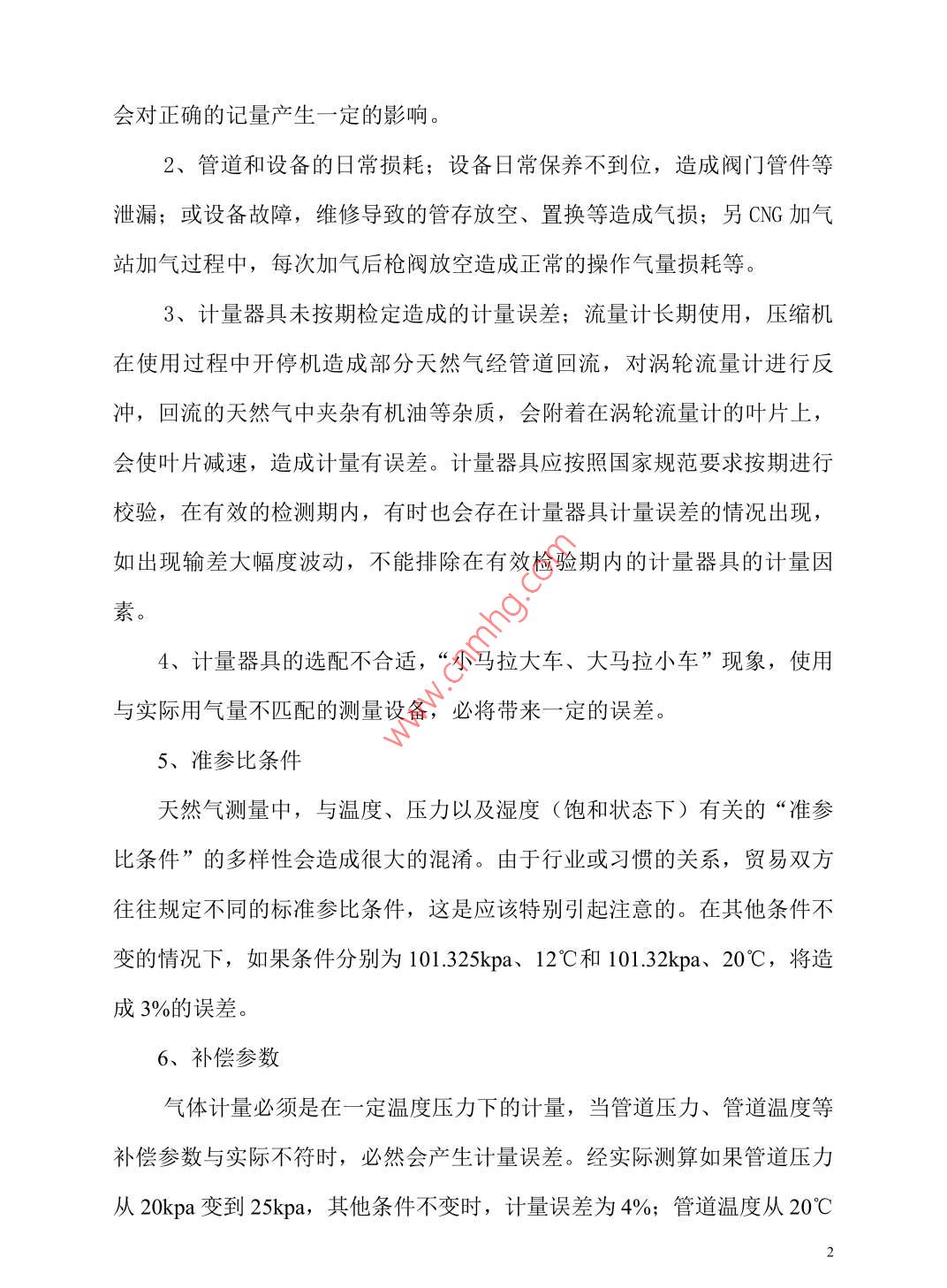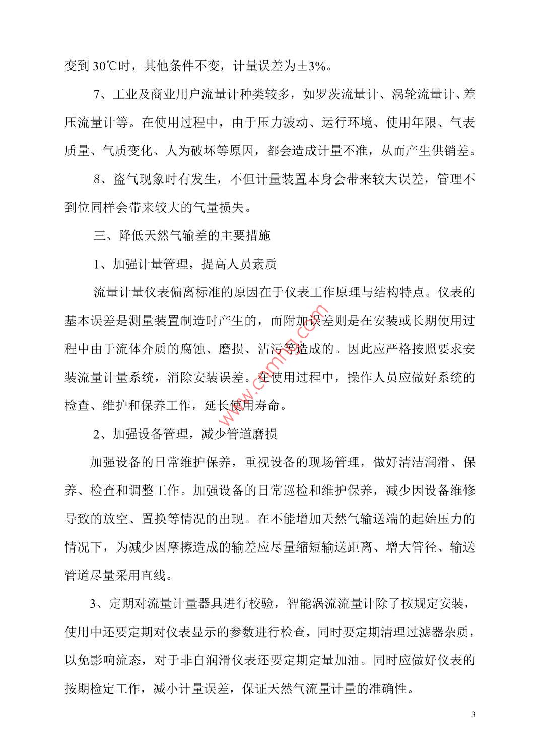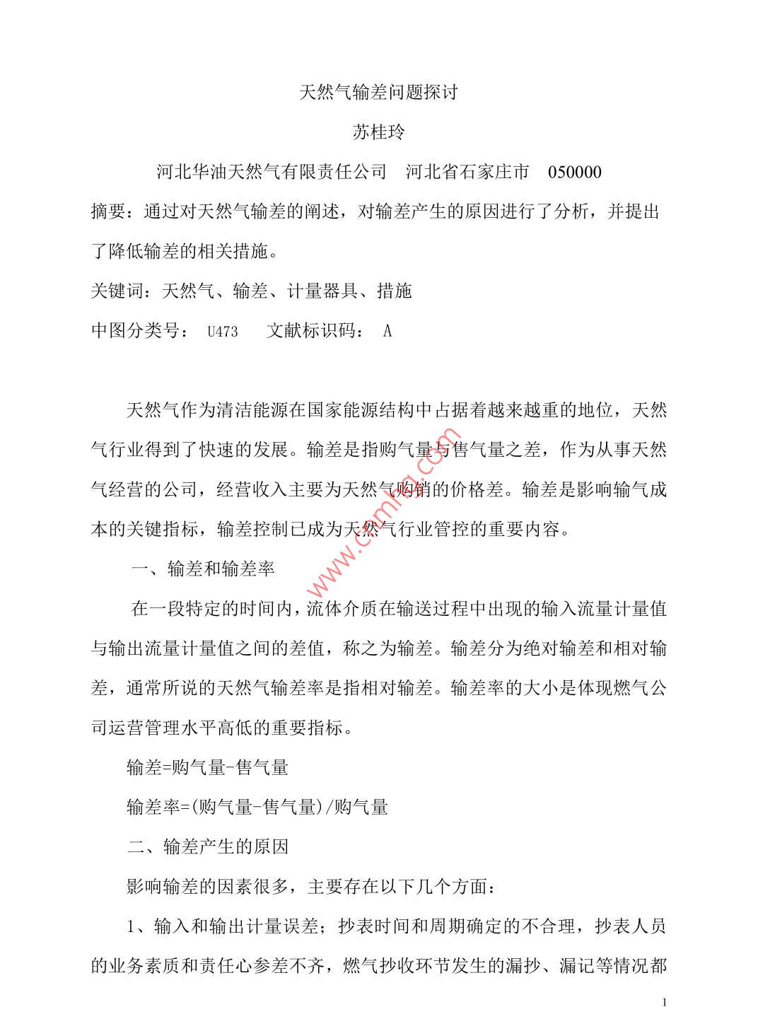 天然氣輸差問(wèn)題探討蘇桂玲河北華油天然氣有限責(zé)任公司河北 省石家莊市050000摘要:通過(guò)對(duì)天然氣輸差的闡述,對(duì)輸差產(chǎn)生的原因進(jìn)行了分析,并提出了降低輸差的相關(guān)措施。關(guān)鍵詞:天然氣、輸差、計(jì)量器具、措施中圖分類號(hào): U473 文 獻(xiàn)標(biāo)識(shí)碼: A天然氣作為清潔能源在國(guó)家能源結(jié)構(gòu)中占據(jù)著越來(lái)越重的地位,天然氣行業(yè)得到了快速的發(fā)展。輸差是指購(gòu)氣量與售氣量之差,作為從事天然氣經(jīng)營(yíng)的公司,經(jīng)營(yíng)收入主要為天然氣購(gòu)銷的價(jià)格差。輸差是影響輸氣成本的關(guān)鍵指標(biāo),輸差控制已成為天然氣行業(yè)管控的重要內(nèi)容。一、 輸差和輸差率在一段特定的時(shí)間內(nèi),流體介質(zhì)在輸送過(guò)程中出現(xiàn)的輸入流量計(jì)量值與輸出流量計(jì)量值之間的差值,稱之為輸差。輸差分為絕對(duì)輸差和相對(duì)輸差,通常所說(shuō)的天然氣輸差率是指相對(duì)輸差。輸差率的大小是體現(xiàn)燃?xì)夤具\(yùn)營(yíng)管理水平高低的重要指標(biāo)。輸差=購(gòu)氣量-售氣量輸差率=(購(gòu)氣量-售氣量) /購(gòu)氣量輸差產(chǎn)生的原因影響輸差的因素很多,主要存在以下幾個(gè)方面:1、輸入和輸出計(jì)量誤差;抄表時(shí)間和周期確定的不合理,抄表人員的業(yè)務(wù)素質(zhì)和責(zé)任心參差不齊,燃?xì)獬窄h(huán)節(jié)發(fā)生的漏抄、漏記等情況都會(huì)對(duì)正確的記量產(chǎn)生--定的影響。2、管道和設(shè)備的日常損耗;設(shè)備日常保養(yǎng)不到位,造成閥門管件等泄漏;或設(shè)備故障,維修導(dǎo)致的管存放空、置換等造成氣損;另CNG加氣站加氣過(guò)程中,每次加氣后槍閥放空造成正常的操作氣量損耗等。3、計(jì)量器具未按期檢定造成的計(jì)量誤差;流量計(jì)長(zhǎng)期使用,壓縮機(jī)在使用過(guò)程中開停機(jī)造成部分天然氣經(jīng)管道回流,對(duì)渦輪流量計(jì)進(jìn)行反沖,回流的天然氣中夾雜有機(jī)油等雜質(zhì),會(huì)附著在渦輪流量計(jì)的葉片,上,會(huì)使葉片減速,造成計(jì)量有誤差。計(jì)量器具應(yīng)按照國(guó)家規(guī)范要求按期進(jìn)行校驗(yàn),在有效的檢測(cè)期內(nèi),有時(shí)也會(huì)存在計(jì)量器具計(jì)量誤差的情況出現(xiàn),如出現(xiàn)輸差大幅度波動(dòng),不能排除在有效檢驗(yàn)期內(nèi)的計(jì)量器具的計(jì)量因素。4、計(jì)量器具的選配不合適,“小馬拉大車、大馬拉小車”現(xiàn)象,使用與實(shí)際用氣量不匹配的測(cè)量設(shè)備,必將帶來(lái)一定的誤差。5、準(zhǔn)參比條件天然氣測(cè)量中,與溫度、壓力以及濕度(飽和狀態(tài)下)有關(guān)的“準(zhǔn)參比條件”的多樣性會(huì)造成很大的混淆。由于行業(yè)或習(xí)慣的關(guān)系,貿(mào)易雙方往往規(guī)定不同的標(biāo)準(zhǔn)參比條件,這是應(yīng)該特別引起注意的。在其他條件不變的情況下,如果條件分別為101.325kpa、12C和101.32kpa、20°C, 將造成3%的誤差。6、補(bǔ)償參數(shù)氣體計(jì)量必須是在一定溫度壓力下的計(jì)量,當(dāng)管道壓力、管道溫度等補(bǔ)償參數(shù)與實(shí)際不符時(shí),必然會(huì)產(chǎn)生計(jì)量誤差。經(jīng)實(shí)際測(cè)算如果管道壓力從20kpa變到25kpa,其他條件不變時(shí),計(jì)量誤差為4%;管道溫度從20°C2變到30C時(shí),其他條件不變,計(jì)量誤差為土3%。7、工業(yè)及商業(yè)用戶流量計(jì)種類較多,如羅茨流量計(jì)、渦輪流量計(jì)、差壓流量計(jì)等。在使用過(guò)程中,由于壓力波動(dòng)、運(yùn)行環(huán)境、使用年限、氣表質(zhì)量、氣質(zhì)變化、人為破壞等原因,都會(huì)造成計(jì)量不準(zhǔn),從而產(chǎn)生供銷差。8、盜氣現(xiàn)象時(shí)有發(fā)生,不但計(jì)量裝置本身會(huì)帶來(lái)較大誤差,管理不到位同樣會(huì)帶來(lái)較大的氣量損失。三、降低天然氣輸差的主要措施1、加強(qiáng)計(jì)量管理,提高人員素質(zhì)流量計(jì)量?jī)x表偏離標(biāo)準(zhǔn)的原因在于儀表工作原理與結(jié)構(gòu)特點(diǎn)。儀表的基本誤差是測(cè)量裝置制造時(shí)產(chǎn)生的,而附加誤差則是在安裝或長(zhǎng)期使用過(guò)程中由于流體介質(zhì)的腐蝕、磨損、沾污等造成的。因此應(yīng)嚴(yán)格按照要求安裝流量計(jì)量系統(tǒng),消除安裝誤差。在使用過(guò)程中,操作人員應(yīng)做好系統(tǒng)的檢查、維護(hù)和保養(yǎng)工作,延長(zhǎng)使用壽命。2、加強(qiáng)設(shè)備管理,減少管道磨損.加強(qiáng)設(shè)備的日常維護(hù)保養(yǎng),重視設(shè)備的現(xiàn)場(chǎng)管理,做好清潔潤(rùn)滑、保養(yǎng)、檢查和調(diào)整工作。加強(qiáng)設(shè)備的日常巡檢和維護(hù)保養(yǎng),減少因設(shè)備維修導(dǎo)致的放空、置換等情況的出現(xiàn)。在不能增加天然氣輸送端的起始?jí)毫Φ那闆r下,為減少因摩擦造成的輸差應(yīng)盡量縮短輸送距離、增大管徑、輸送管道盡量采用直線。3、定期對(duì)流量計(jì)量器具進(jìn)行校驗(yàn),智能渦流流量計(jì)除了按規(guī)定安裝,使用中還要定期對(duì)儀表顯示的參數(shù)進(jìn)行檢查,同時(shí)要定期清理過(guò)濾器雜質(zhì),以免影響流