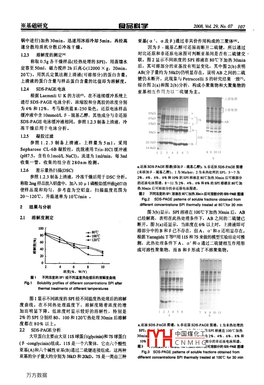 1062008W29,No.07段品利寫※基礎研究熱變性和熱聚集對大豆分離蛋白溶解性的影響葉榮飛,楊曉泉*,鄭田要,鄭恒光,朱建華,劉翀,司華靜(華南理工大學輕工與食品學院食物蛋白工程研究中心,廣東廣州510640)摘要:研究了溫度和濃度對大豆分離蛋白(SP)溶解性的影響,并用 SDS-PAGE電泳分析了其可溶部分中亞基的組成及聚集方式。結果表明,熱誘導大豆蛋白聚集生成了可溶聚集體,使得低濃度熱處理后完全變性的SPI具有良好的溶解性。關鍵詞:大豆分離蛋白;熱處理:溶解性;變性:聚集Effects of Thermal Denaturation and Aggregation on Solubility of Soy Protein IsolatesYE Rong-fei, YANG Xiao-quan, ZHENG Tian-yao, ZHENG Heng- guang, ZHU Jian-hua, LIU Chong, SI Huajing(Research and Development Center of Food Proteins, College of Light Industry and Food,South China University of Technology, Guangzhou 510640, China)Abstract: The effects of temperature and concentration on the solubility of soy protein isolates(SPD) were studied, and thenthe subunit compositions and form of aggregation of soluble fractions obtained from treated SPi were analyzed by SDS-PAGE.The results showed that the totally denatured SPl after thermal treatment at low concentration have good solubility due to formationof heat -induced soluble protein aggregatesKey words: soy protein isolates(SPI); thermal treatment; solubility: denaturation; aggregation中圖分類號:TS2017文獻標識碼:A章編號:10026630200807-010603大豆分離蛋白不僅是一種蛋白含量高的大豆產品脫脂豆粕山東新嘉華有限公司。而且還因具有多種功能特性而廣泛應用于各類食品。但所用化學試劑均為分析純。是,在大豆分離蛋白的生產中,熱殺菌、高溫噴霧干ECP3000三恒電泳儀北京六一儀器廠;600E蛋白燥等生產環(huán)節(jié)都會導致大豆蛋白發(fā)生不可逆的熱變性。純化系統(tǒng)美國 Waters公司; ALPHA-4冷凍干燥機日熱變性導致蛋白質的解離,卷曲緊密結構的展開和疏水本東京理化公司;TAQ100差示量熱分析儀美國PE公基團的暴露。由于展開分子的大量聚集,蛋白質的變司:CS501超級恒溫水浴鍋上海浦東躍欣科學儀器性通常會引起溶解度的下降,從而影響其功能特性,限廠;CR2G高速冷凍離心機日本日立公司:壓力滅制其應用。但是,蛋白質的變性不一定導致溶解性下菌鍋上海博迅公司。降,國外已有研究表明21,在一定的條件下,大豆分1.2方法離蛋白即使是完全熱變性,也能具有高溶解性。121SP的制備熱處理條件下,大豆蛋白的熱變性、聚集與溶解低溫脫脂豆粕粉碎后過60目篩。豆粕粉按1:10的性之間關系的研究,對提高大豆分離蛋白的溶解性具有料液比加水攪拌,用1 mol/L NaoH調pH至75,浸提重要的理論和實用價值。本實驗研究溫度和濃度對溶解2h后離心(8000×g,20min,4℃),取上清液用1mo性及大豆蛋白亞基組成的影響,并選取2%的溶液研究HC調pH至45,靜置05h后再次離心(500×g,20min,了可溶部分的熱變性情況和聚集物的生成,以期為大豆4℃),棄去上清液,加水并用1 mol/L NaOH調蛋白凝乳分離蛋白生產中的熱加工提供一定的理論指導。的pH至70,經冷凍干燥后即得SPI。凱氏定氮法測得sPI的蛋白含量為886%。1材料與方法1.22SPI的熱處理中國煤化工w/V)分別為2%11材料、試劑與設備4%、CNMHG備三份,磁力攪拌2h,收稿日期:20071001小mw水浴)和120℃(滅菌基金項目:國家自然科學基金項目(20776050);廣東省自然科學基金項目(07006508)作者簡介:葉榮飛(1983-),男,碩士研究生,研究方向為糧食油脂及植物蛋白。E-mail:yeyunfeil1314@tom.com*通訊作者:楊曉泉(1965),男,教授,博士,研究方向為大豆蛋白的開發(fā)利用。E-mail::fengyang@scut.edu.cn※基礎研究品科寶2008,vl.29No.07107鍋中進行)加熱30min,迅速用冰浴冷卻5min,再經高亞基(a'、α及β)通過非共價作用構成的三聚體。速分散均質機分散后冷凍干燥。因為β-巰基乙醇可還原而斷開二硫鍵,所以通過123溶解度的測定對比還原和非還原電泳圖可判斷亞基間是否有二硫鍵交稱取0.5g各干燥樣品(經熱處理的sPD,用蒸餾水聯(lián)。圖2顯示不同濃度的SP溶液在80℃下加熱30min后,其可溶部分的亞基沒有明顯變化,其中圖2(b)表明20℃).用凱氏定氮法測上清液(可溶部分)的蛋白含量。AB(分子量約為58kD仍明顯存在,說明AB之間的二硫上清液的蛋白含量與樣品蛋白含量的比值即為溶解度。綜合圖2(a)和圖2(b)分析,構成小聚集物和大聚集物的124 SDS-PAGE電泳亞基相互作用力以二硫鍵為主。根據 Laemmli U K的方法,在不連續(xù)緩沖系統(tǒng)上人案集物進行 SDS-PAGE電泳分析,濃縮膠和分離膠的濃度分別為4%和12%,考馬斯亮藍R250染色。還原電泳樣品小聚坐物緩沖液中含10mmo/LB-巰基乙醇,其他成分與非還原SDS-PAGE電泳緩沖液相同。參照123制備上清液,冷43kD凍干燥后用于電泳分析sOkD s125凝膠過濾參照1.23制備上清液,上樣量為5m1。采用20.1kDSepharose CL-6B凝膠柱,洗脫液用Tris-HCl緩沖液144kD1234567891011pH75,含有01 molL Nacl)。流速為1m/min,每3ml收集一管,收集的組分在280nm檢測。盤還原 SDS-PAGE圖譜(添加B巰基乙醇)hb.非還原 SDS-PAGE圖譜1.26差示量熱掃描(DSC)(未添加β·巰基乙醇)。1為 Marker;2為未熱處理的sP:3~7為參照1.23制備上清液,冷凍千燥后用于DSC分析。2%、4%、6%、8%和10%的SP溶液在80℃加熱30mn后可溶部分稱取2mng樣品放入鋁盤中,加入10μ1磷酸鹽緩沖液(pH70)的還原電泳圖譜:8~11為2、%、6%和8%的SP溶液在80℃加使樣品混和均勻,參考盤為空鋁盤,掃描溫度范圍為熱3mn后可浴部分的非還原電泳圖20~120℃,升溫速率為10℃/min圖2不同