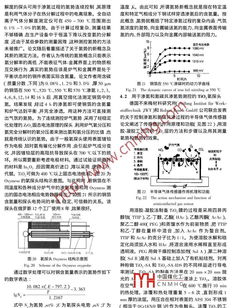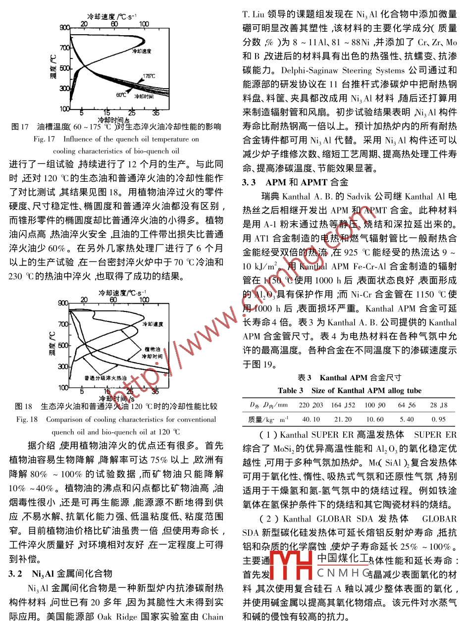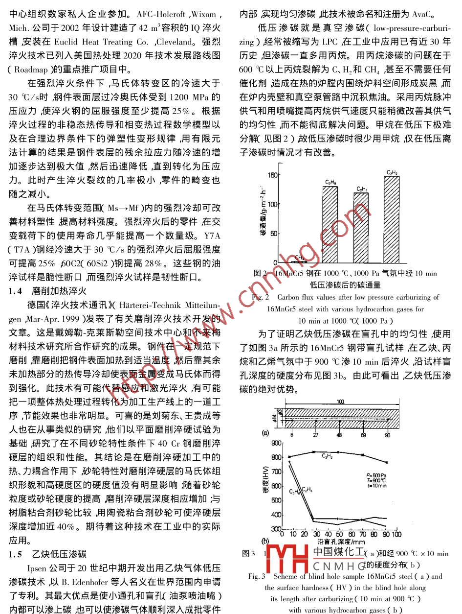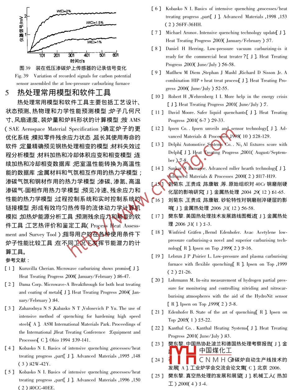 綜述熱處理技術(shù)進(jìn)展樊東黎(中國熱處理行業(yè)協(xié)會(huì)北京100101 )摘要隨著機(jī)械產(chǎn)品市場的激烈競爭熱處理生產(chǎn)技術(shù)發(fā)展神速。美國2020年熱處理技術(shù)發(fā)展路線圖的制定和實(shí)施更加速了這個(gè)進(jìn)程。作者從工藝設(shè)備、材料、傳感器、模型和軟件工具等5個(gè)方面論述了熱處理新技術(shù)發(fā)展近況,以引起國內(nèi)熱處理工作者的注意促進(jìn)我國熱處理行業(yè)十一. 五” 規(guī)劃的實(shí)現(xiàn)加速我國熱處理生產(chǎn)技術(shù)的進(jìn)步。關(guān)鍵詞熱處理新技術(shù)進(jìn)展中圖分類號:T-19 TG15文獻(xiàn)標(biāo)識碼A文章編號0254-6051( 2007 )04-0001-14Progress of Heat Treatment Technologies .FAN Dong-li ( China Heat Treatment Association ,Beijing 100101 ,China )Abstract :Along with the sharp competition in machinery market ,the practical technology of heat treatment is developingvigorously. . The formulation and implementation of" US Heat Treating Technology Roadmap" accelerates this process. Theauthor describes a recent development status of heat treatment new technologies from processes ,equipments ,materials ,sensors moulds and software tools etc. five fields in order to bring to our heat treaters attention and promote to realize11”“five years plan" of our heat treating community and accelerate progress of our heat treating production technologies.Key words heat treatment ;new technology iprogress1新工藝作開發(fā)已商品化的Atmoplas滲碳技術(shù),該技術(shù)還可以1.1微波滲碳控制殘留奧氏體量和獲得細(xì)晶粒組織。用AISI8620美國Dana Corp公司( Toledo ,Ohio )于2004年宣鋼(相當(dāng)于20CrNiMo鋼)齒輪進(jìn)行的滲碳試驗(yàn)表明,告開創(chuàng)了Atmoplas 微波大氣等離子技術(shù)其特點(diǎn)是在Atmoplas滲碳的周期和滲層深度都比真空滲碳的效果大氣壓下可以引發(fā)和保持氣體的等離子狀態(tài)。等離子好(見表1)。體是一種被部分電離的氣體,它的最大特點(diǎn)在于對微Atmoplas滲碳工藝出奇地簡單。把工件裝入加工波的高吸收率(可吸收其能量的95% )和迅速達(dá)到很室的空腔中,往其中通入氬氣,用特殊方法激發(fā)等離.高的溫度。等離子體一旦被引發(fā)并在大氣壓力下保子溫度迅速升高。當(dāng)工件溫度達(dá)到930 C時(shí)往加工持就可以用Dana專有技術(shù)在數(shù)秒鐘內(nèi)使等離子溫度室的空腔中通入乙炔氣體。調(diào)節(jié)微波功率把溫度保持達(dá)到1200 C。將其用于熱處理與常規(guī)工藝相比可大在固定水準(zhǔn)。工件經(jīng)規(guī)定時(shí)間處理后施行淬火和回大縮短達(dá)到高溫的時(shí)間,可以通過適當(dāng)放置工件來控火。乙炔在等離子體內(nèi)易裂解,Atmoplas滲碳時(shí)用乙制等離子體厚度并由用戶來策劃熱流。炔作為供碳源。調(diào)整乙炔量、微波能量和維持等離子采用Atmoplas技術(shù)可使熱處理工藝實(shí)現(xiàn)更精確體的容器尺寸可使在-定體積內(nèi)的沉積碳量得到精確地控制加熱和達(dá)到更高溫度,從而縮短工藝周期和減控制。把滲碳溫度提高到980 C可進(jìn)一步加速滲碳。少能耗。用于鋼的滲碳時(shí),工件表面硬度、表面碳濃該工藝的另一優(yōu)點(diǎn)是熱量約束在被加工工件周圍,系度、滲碳均勻度、殘留奧氏體量、顯微組織的一致性都統(tǒng)內(nèi)無需使用需要高度維護(hù)的加熱元件。Atmoplas 滲和傳統(tǒng)工藝相同或超過其相應(yīng)的力學(xué)性能(見圖1 )。碳工藝具有高度的靈活性(柔性)和可控性。Dana及其合作伙伴致力于開發(fā)微波大氣等離子加熱1.2 離子束表面改性技術(shù)的多項(xiàng)可投入實(shí)際應(yīng)用的項(xiàng)目其中之一就是和用脈沖離子束表面熱處理可以提高大面積零件或德國ALD Vacuum Technologies GmbH(漢諾威)公司合大批量小零件的表面性能。離子束表面熱處理是法國Sandia National Laboratories ,Albuquerque N. M.的專利作者簡介樊東黎( 1934. 04- - )男,山西定襄人教授級高工,技術(shù)被中國煤化工其實(shí)質(zhì)是以高速脈動(dòng)中國熱處理行業(yè)協(xié)會(huì)前副理事長,中國熱處理學(xué)會(huì)榮譽(yù)理事離子束CN M H a層幾個(gè)微米厚度內(nèi)實(shí)長北京機(jī)械工程學(xué)會(huì)熱處理分會(huì)榮譽(yù)理事長,全國熱處理標(biāo)現(xiàn)快速熔化札凝固,以提局具村磨性和耐腐蝕能力,改準(zhǔn)化技術(shù)委員會(huì)顧問,本刊編委會(huì)副主任委員。聯(lián)系電話:善金屬制件表面狀態(tài)和外觀提高表面純潔度、均勻性010-629 13079和整體連續(xù)性。其優(yōu)點(diǎn)是不改變金屬表面化學(xué)成分,收稿日期2006-12-20《金屬熱處理》2007年第32卷第4期滲層/mm0300.60_ 090121.50.180e005 0.30 0.60 090 120 1.50 180660580一的女。一齒齒項(xiàng)面足60只500剛420的42.0--節(jié)圓面思34.034.0-節(jié)線260向)滲層in滲層/in圖1 AISI 8620鋼齒輪普通氣體滲碳( 930 C x272 min )結(jié)果( a )和Atmoplas滲碳212 min )結(jié)果( b )的比較Fig.1 Comparison of case depth and uniformity and hardness profile of AISI 8620 steel gear for conventional gas-carburizedwith a total carburizing time of 272 min( a ) and Atmoplas microwave carburized gear with a total carburizing time of 212 min( b)表1 AISI 8620鋼滲碳結(jié)果比較Table 1 Characteristics of carburizing methods for processing AISI 8620 alloy steel工藝傳統(tǒng)氣體滲碳真空滲碳.Atmoplas 滲碳總滲碳時(shí)間142min強(qiáng)