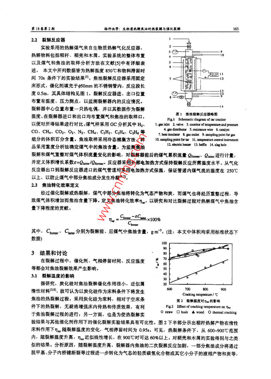 第18卷第2期高?;瘜W(xué)工程學(xué)報No.2 VolL,182004年4月Jourmal of Chemical Engineening of Chinese UniversitiesApr.2004文章編號: 1003-9015(2004)02-0162-06生物質(zhì)熱解焦油的熱裂解與催化裂解駱仲泱,張曉東,周勁松, 倪明江,岑可法(能源潔凈利用與環(huán)境工程教育部重點實驗室,浙江大學(xué)熱能工程研究所,浙江杭州,310027)摘要;生物質(zhì)氣化過程中產(chǎn)生的焦油對氣化系統(tǒng)和用氣設(shè)備都有極大的危害。為了開發(fā)適合于商業(yè)應(yīng)用的焦油縮減方法,探索達到最優(yōu)焦油脫除效果的操作條件,在固定床反應(yīng)器上,利用石灰石、白云石、高鋁磚作為催化劑研究了生物質(zhì)(稻稈、稍殼、木屑等)熱觶焦油的催化裂解反應(yīng),利用炭化硅作為熱載體研究了焦油的熱裂解反應(yīng),對熱解煤氣中焦油含量的變化以及熱解煤氣組成和熱值的變化進行了比較,并對裂解溫度、氣相停留時間等因素對裂解效果的影響進行了探討。實驗發(fā)現(xiàn), 60-90C范圍內(nèi)nw隨裂解溫度升高而升高,900時熱裂解條件下可達60%,而催化裂解條件下可達90%以上。0.5-18 范圍內(nèi),幾w隨停留時間增加而升高, 幅度約7%-10%。相比于原始煤氣,裂解后煤氣組成出現(xiàn)了較大變化,熱裂觶后煤氣熱值增加,而僧化裂解后煤氣熱值下降,且熱裂解與催化裂解處理后煤氣組成也有較大差異。關(guān)鍵詞:生物質(zhì):熊油:裂解:催化中圖分類號: TQS24; TE624.031; TB624.41文獻標(biāo)識碼: A1弓言隨著生物質(zhì)熱解氣化技術(shù)研究和應(yīng)用的深人,氣化過程中產(chǎn)生的焦油的影響也愈來愈為研究者所重視。在生物質(zhì)材料的裂解氣化過程中,焦油是作為氣態(tài)產(chǎn)物的伴隨產(chǎn)物出現(xiàn)的,含量雖小,但其危害卻是不容忽視的。在較低溫度水平下熱解煤氣中的焦油將發(fā)生冷凝,附著于煤氣管道內(nèi)壁和儲氣設(shè)備壁面上,并與煤氣中飛灰、碳等顆粒物質(zhì)相互作用,嚴(yán)重時堵塞管道,影響系統(tǒng)運行和安全,并且熱解煤氣中的焦油含過高時還會對用氣設(shè)備的安全穩(wěn)定運行產(chǎn)生影響1.21。為減少煤氣中焦油含量,國內(nèi)外研究人員進行了多方面的探索,其中催化裂解被認為是最具潛力的方式1.3. 41。在適當(dāng)?shù)拇呋瘎┳饔孟拢姑簹庵械慕褂统煞职l(fā)生深度裂解,將具有較大分子量的焦油組分轉(zhuǎn)化為小分子的氣態(tài)產(chǎn)物或者它種可凝焦油組分,從而減小總體焦油含量,同時增加氣態(tài)產(chǎn)物的產(chǎn)量。2實驗部分2.1催化劑材料實驗中采用了目前較為常見的幾種材料作為催化劑,原因是其價格低廉,容易獲得,適于大規(guī)模實際應(yīng)用。各催化劑材料的工業(yè)分析數(shù)據(jù)見表1, 其中炭化硅作為-種惰性催化劑而一-并列出。采用的催化劑材料事先均經(jīng)過研磨,采用2~4mm粒徑范圍作為試驗材料。表1催化劑材料工業(yè)分析Table 1 Analysis dats of catalyst materlalsCtalyst rmateriali021%AlO31%Fe031%Ca0/%MgO/%Loss1%Dolomite2.210.970.5420.245.00Limestone0.590.2554.680.3243.30Alumina brick18.175.881.4(0.890.62Silicon carbide73.211.600.760.360.900.21收稿日期,20207.161 修訂日期: 203-01-08.0苗金項目:國家杰出青年基金項目(50025618)浙江省院士基金項(2002300501),)莢國SHELL基金項目,作者簡介:駱神關(guān)(1962-), 男,斷江網(wǎng)必人。浙江大學(xué)教授,通訊聯(lián)系人: 圃勁松,Emal!: zouj@j.cdo.co第18卷第2期駱仲決等:生物質(zhì)熱解焦油的熱裂解與催化聚解1632.2裂解反應(yīng)器實驗采用的熱解煤氣來自生物質(zhì)熱解氣化反應(yīng)器,熱解物料包括稻桿、稻殼和木屑。實驗系統(tǒng)的整體布置i%以及煤氣和焦油的取樣分析方法在文獻[5]中有詳細表述。本文中所列數(shù)據(jù)皆為熱解溫度850C和物料滯留時間70s條件下的實驗結(jié)果)。焦油裂解反應(yīng)器采用固定床形式,催化劑填充于φ50mm的不銹鋼管內(nèi),反應(yīng)段長度0.5m,其具體結(jié)構(gòu)見圖1.裂解反應(yīng)器進、出口位置布置有溫度、壓力測點,以監(jiān)測裂解器內(nèi)的反應(yīng)情況。-14裂解器中心位置布置- -只熱電偶,并以其數(shù)據(jù)作為裂解圈1焦油裂解反應(yīng)器略圖溫度。在裂解器進口和出口均布置煤氣和焦油的取樣口,F(xiàn)lg.1 Schematic diagram of ar cracker以便對所得結(jié)果進行對比。煤氣樣采用GC分析其中H2、1. gasinlet 2. valve 3. monitar of temperature and pressureCO、CH、CO2、 02、 N2、CH、C2H、C2H、C2H6 等4. 8as dstibutor 5. resistance wire 6. calyst7. beat insulataor 8 gas outle 9. sampling point for gas組分的體積百分含量。焦油取樣采用冷態(tài)捕集方法,樣10. sampling pointfortar II. tempararure canrol insrument品采用重度分析法確定煤氣中的焦油含量。為監(jiān)測焦油12. eacticheater 13. befl 14. slag hoale裂解和煤氣重整對煤氣體積流量變化的影響,對裂解器前后的煤氣累積流量Qroror Qnu進行計量,并定義體積增長系數(shù)e=Qme/Qomee反應(yīng)器采用外部電加熱方式保持裂解反應(yīng)所需溫度水平。從氣化反應(yīng)器出口到裂解反應(yīng)器進口的煤氣管道均采用電加熱方式保溫,保證管道內(nèi)煤氣流的溫度在250C以上,以防止煤氣中部分焦油成分發(fā)生冷凝(.7]。2.3焦油轉(zhuǎn)化效率定義經(jīng)過催化裂解或熱裂解,煤氣中部分焦油將轉(zhuǎn)化為氣態(tài)產(chǎn)物和炭,而煤氣也將經(jīng)歷重整過程,導(dǎo)